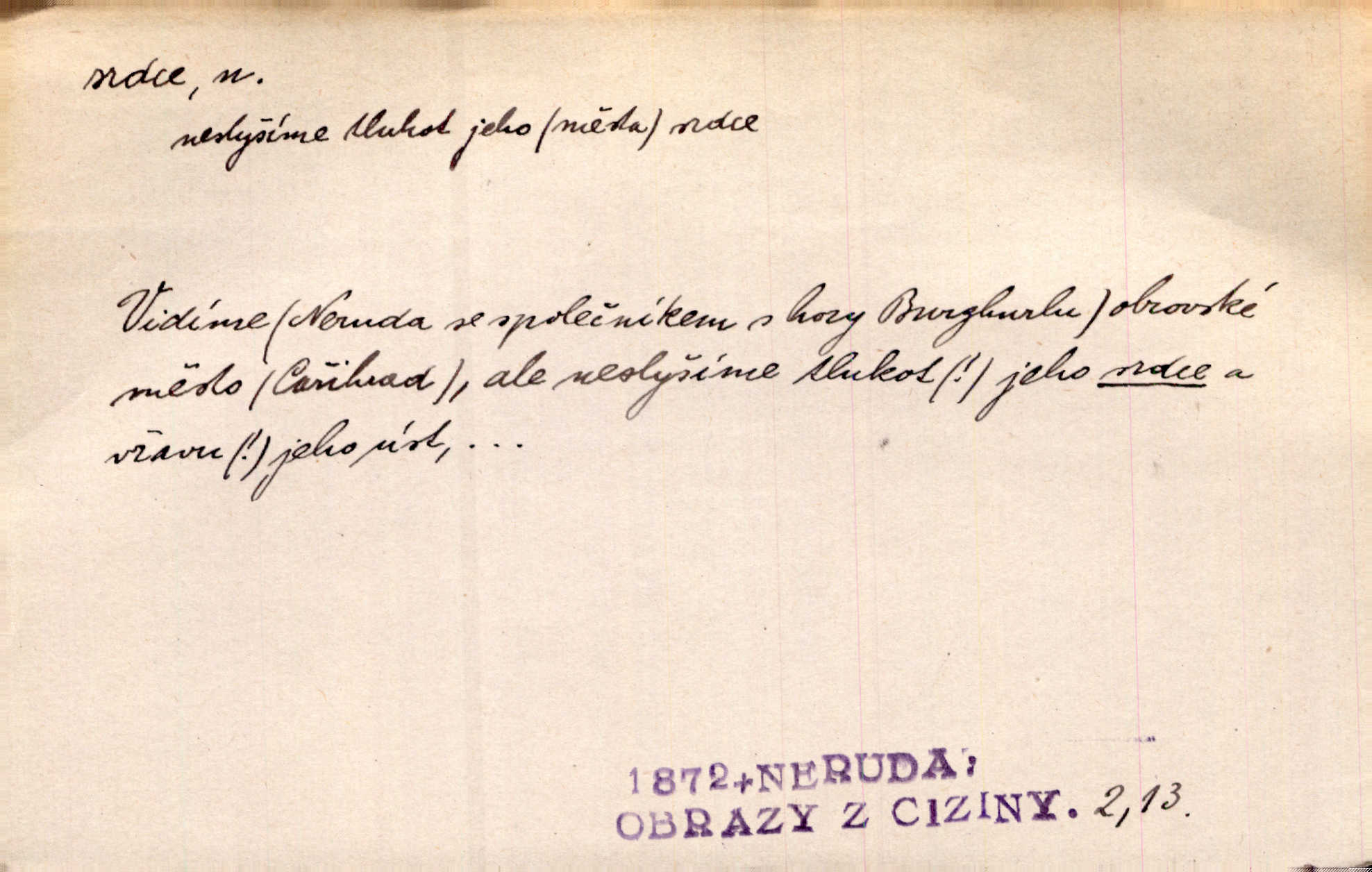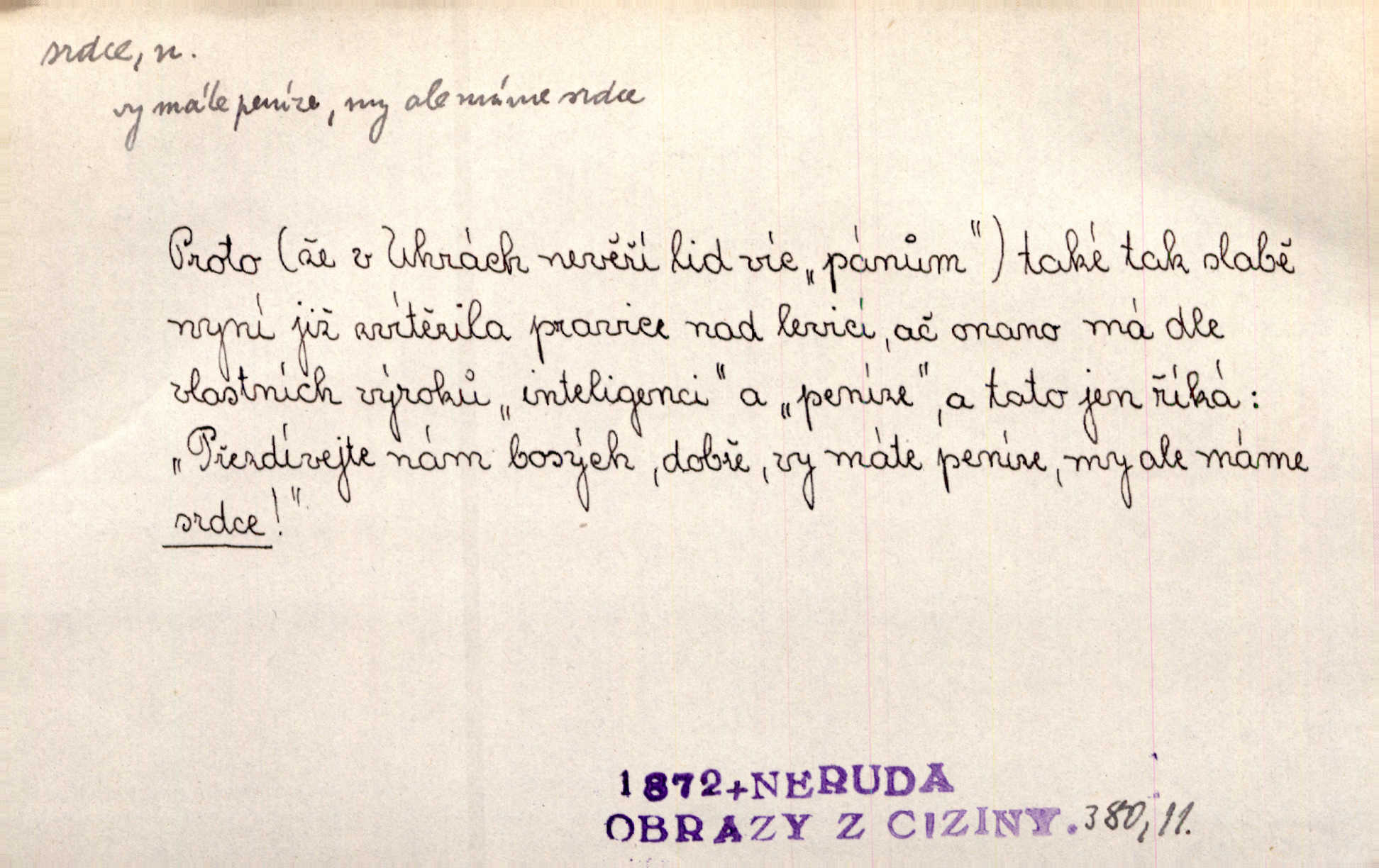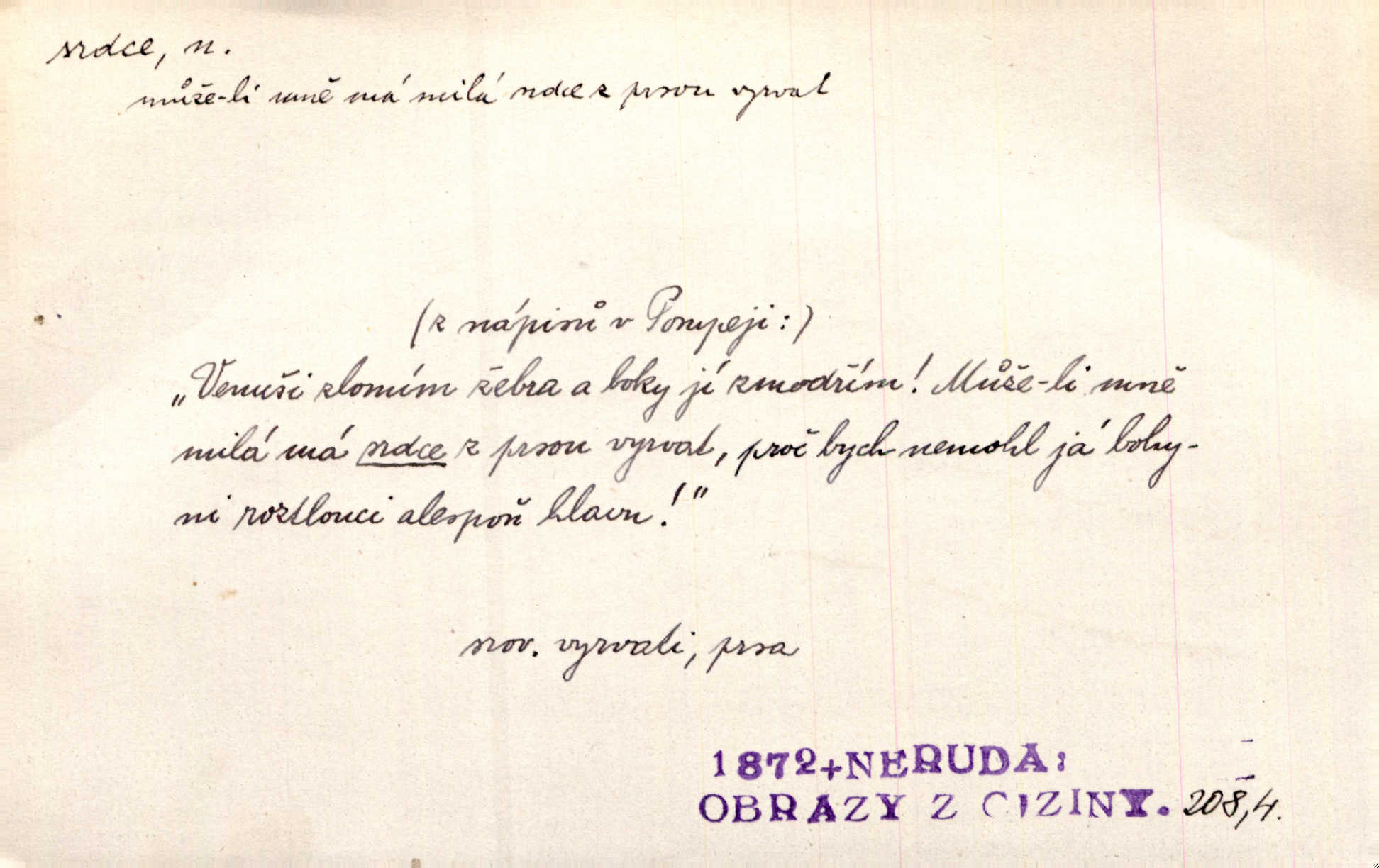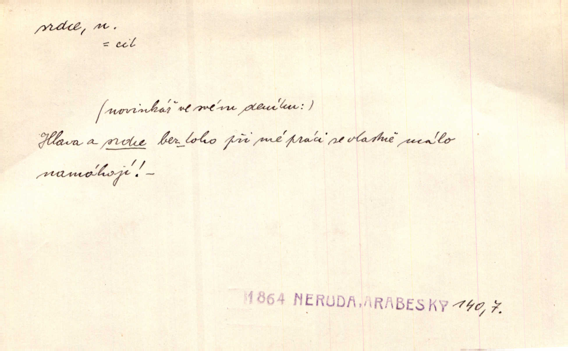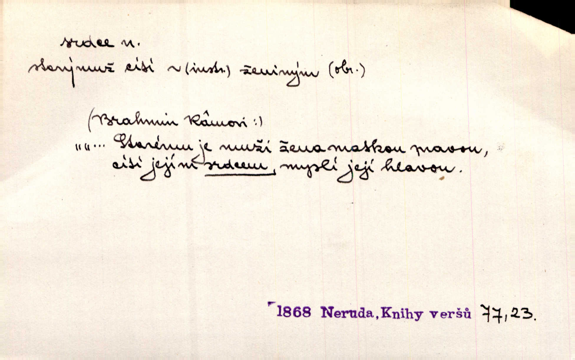 - srdce, -e n. orgán charakteristického tvaru uložený v prsou a uvádějící krev do oběhu. Srdce mi prudce bušilo. Šim. Jaro se ozvalo ve prsou, srdce tak buší a tepe. Ner. Včera [mu] zase „srdce vynechávalo“ nepravidelně tlouklo. Čap. Ch. Všecka krev vehnala se mu k srdci. Šmil. Pocítíte bolest, jakoby dýkou projel vaše srdce. Kar. Svině křičela, jakoby jí nůž do srdce vráželi hrozně. Hol. Okolo srdce mi bylo tak ouzko. Rub. V Hanušovi se při těch slovích srdce stáhlo. Šmil. Takové usmání v lících rozpučilo, že by bolestí se srdce rozskočilo. Ner. Pak bylo Jírovi, jako by se mu mělo srdce utrhnout. Hál. Já nejsem zlá, jak o mně povídají, já bych srdce rozdělila. Klost. Srdce z prsou by si za Antoše vyřízla — jen kdyby mu pomohla udělala by všechno možné. A. Mrš. Žloutly se tu ryzce, až se srdce smálo. Třeb. A srdce zrovna zmíralo v sladké té dřímotě V. Mrš. Ta dítky má — div mne to nezmučí! Pod srdcem jedno, druhé v náručí je těhotná. Vrch. Je [Bělehrad] jakoby srdcem dunajských kralů středem, jádrem. Ner. Přen. Tam, tam na Východě začalo srdce lidstva bít začal kulturní život! Ner. Černá země hýbala se pod povrchem, jakoby i srdce země už zabušilo jaru na uvítanou. Herb. Ba zdá se mi, že duše hájů nepustí ptáky z náruče, až slavíček, to srdce lesa, si při mém srdci zatluče. Hál. [V rolnictvu] vidím srdce národa. Svět. A mezi ním a plání leží Betar, to srdce vzpoury. Vrch. Byla tu Kutná Hora, stříbrné srdce království. Šus. Srdce vlasti, Praho, zdráva buď! Heyd. Výmluvný ten protest proti porobě a násilí nemohl jinak než otřásti srdcem Anglie. Krás. Círk. kongregace Srdce Ježíšova a Mariina několik řeholních společností katolické církve. Lék. dutý sval příčně pruhovaný, tvaru nepravidelně zploštělého kužele působící pohyb krve v cévách. Kuch. dušené hovězí srdce. D symbol, sídlo citu (lásky, nenávisti, radosti, bolesti). Brzy k srdci, brzy k rozumu klonila se. Šmil. Jsou [Kosmické písně] básněny více mozkem, než srdcem. Kar. Ruka vykonává vše, co jí srdce a hlava poroučí. Ner. Srdce se musí umlčeti a třeba i vyrvati. Jir. Srdce ji táhlo k dceři a k vnoučátkům. Něm. Probůh! což nemáš srdce? Krás. Jsou mezi vámi ještě lidé bez kusa srdce. Hol. Hledám lidi, v mém jak ve snu žili; bez srdce však larvy najdu jen. Mácha. Měl už tenkrát tvrdé srdce jako kámen byl nemilosrdný, necitelný. Šmil. Ženy mají srdce příliš blízko u mozku milují s rozvahou. Maj. Má [Františka] někoho již v srdci? miluje ho. Prav. Hoj, já mladá dívčina, srdce nezadané. Erb. Kterak se tedy nazývá vyvolená tvého srdce? Just. Vyznával upřímně, že po ní celým srdcem toužil. Prav. Milá dcero, co mohu říci, když si už podle srdce svého zvolila lásky. Něm. Jdi si, Alberte, kam tě srdce pudí. Jir. Rozdělil své srdce mezi Verunku a Teklu. Herb. Pravda-li, strýčku, že máte srdce pro naši vlast? Gabler. Nejpevněji však přilnulo srdce Jungmannovo k horoucímu vlastenci Vydrovi. Zel. Cítím, že tento člověk přirůstá mi k srdci. Mah. Stárkovi padla hned první den do srdce. Svět. Můj milý český jinochu, já v srdci svém tě nosím. Ner. Od přítele srdce odvrátil přestal ho mít rád. Svět. Nenáviděl od srdce křivdu opravdově. Šmil. Nenávidí z gruntu srdce směr, jakým se nese nynější lékařská literatura. Čech. Bylo jim velmi těžko u srdce byli zarmouceni. Šmil. Přece někdy to srdce stáhne zabolí to. Šim. Měl srdce v kleštích byl v úzkostech. Šmil. Jen mi teď nedělej těžké srdce nedělej starost, lítost. Něm. Musí ho srdce bolet, že pro několik hrstí obilí udělal nebožáka nešťastného musí trpět. Svět. A zas plakala, až jí srdce usedalo velmi lítostivě. Svět. Srdce ve mně radostí poskočilo. Rub. Odejde-li ona, dětem se srdce utrhne budou v těžkém žalu. Hol. Nevěsta jej odmítla a on si to vzal k srdci trápil se. Poláč. Vzal jste si k srdci mé napomenutí řídil jste se jím? Hlad. Mladá paní nebrala si příliš k srdci všechny zlomyslnosti a urážky nedbala jich. Her. Nepřeneseš přes srdce, abys jim zničil celou budoucnost nesneseš lhostejně. K. Čap. Nemohouc mužovo jednání přenésti přes srdce, podstrkovala synovi sem tam groš strpěti. Herb. Co srdce ráčilo, to se vítězným nedojedům vydati musilo vše, čeho žádali. Herb. Bylo mi tatínka z toho srdce líto upřímně. Kos. Pláče ze srdce lítostivě, upřímně. Vrch. S jak těžkým srdcem vytahoval své zlaťáky velmi nerad! Dyk. Umíral s lehkým srdcem lehce. Kun. S lehčím srdcem vrátil jsem se k Pavlovi Lum. D základ povahové stránky, sídlo duševního života, nitro. Lidé se umějí přetvařovati, kdo jim vidí do srdce? Šmil. Nemajíce v srdci žádné náboženství, před světem největší nábožnůstkářství provozují. Havl. Čekal s nápadným neklidem v srdci. Vach. Teď ukázal srdce i ledví objevil se v pravé podobě. Baar. Lidí dost, však srdcí, srdcí málo dobrých lidí. Heyd. Antonín má dobré srdce. Jir. Oni nemají zlé srdce. Šim. Kdo má kus poctivého srdce, raduje se s Vámi. Herb. Měl měkké srdce a tvrdou hlavu. Rub. Měla od jakživa srdce z másla byla jemná, citlivá. Tyl. Obr s srdcem dítěte dobrácký, citlivý. Mach. Zlatý skví se na prsou mu háv, ale pod ním bije srdce zrádné je zrádcem. Kamen. Měl štíra v srdci nasazeného byl neklidný. Baar. Co byl ženat, otevřel jí srdce vyznal se ze všeho. Svět. A dnes po letech vím, že Aleš každému srdce neotevře. Rais. Otevřel knězi hříšné své srdce. Šrám. Po ty tři roky s nikým od srdce nepromluvil upřímně. K. Čap. Vylívá srdce své mluví důvěrně. Ner. Vypravovati upřímně a nelíčeně, od srdce k srdci, dovede člověk toliko řečí jednou. K