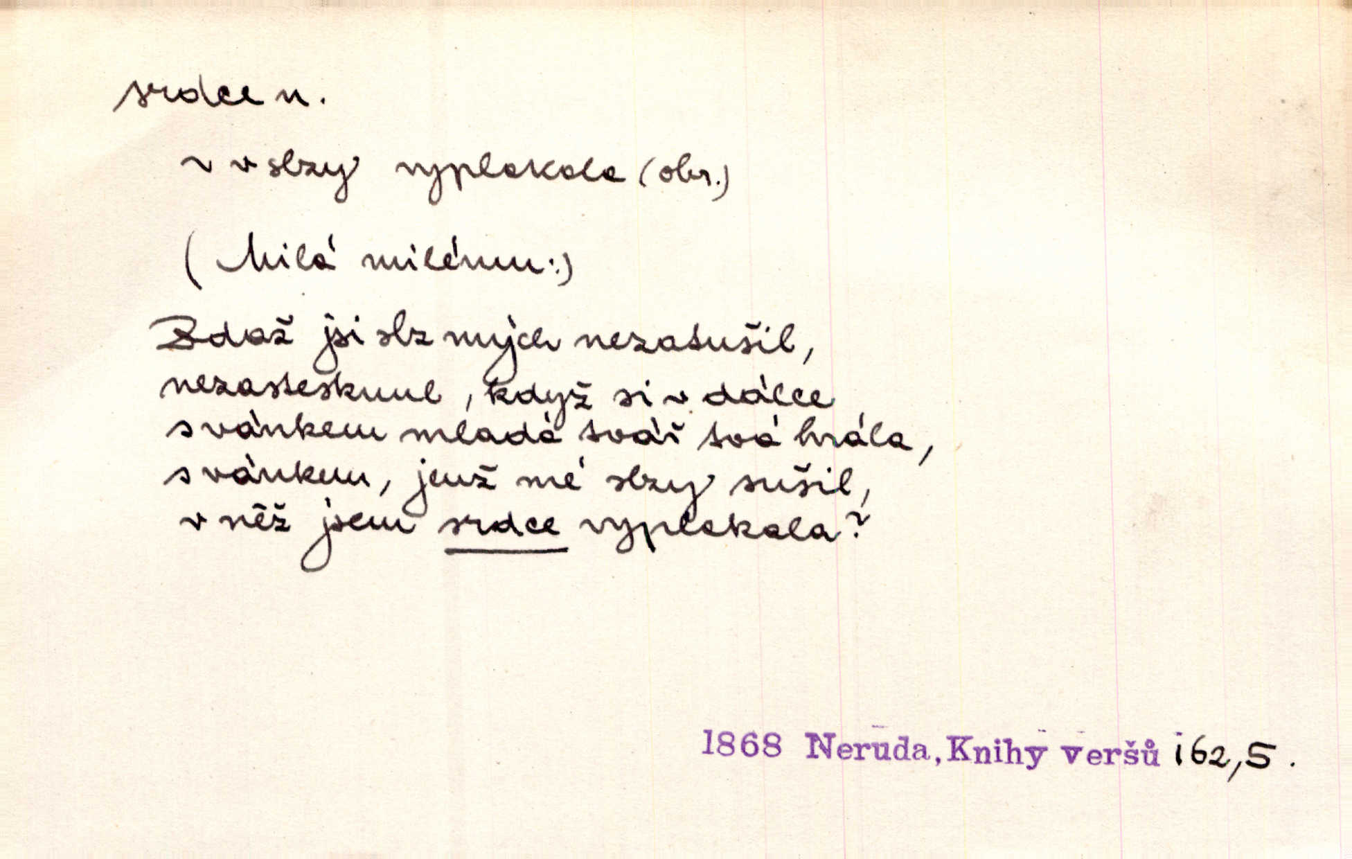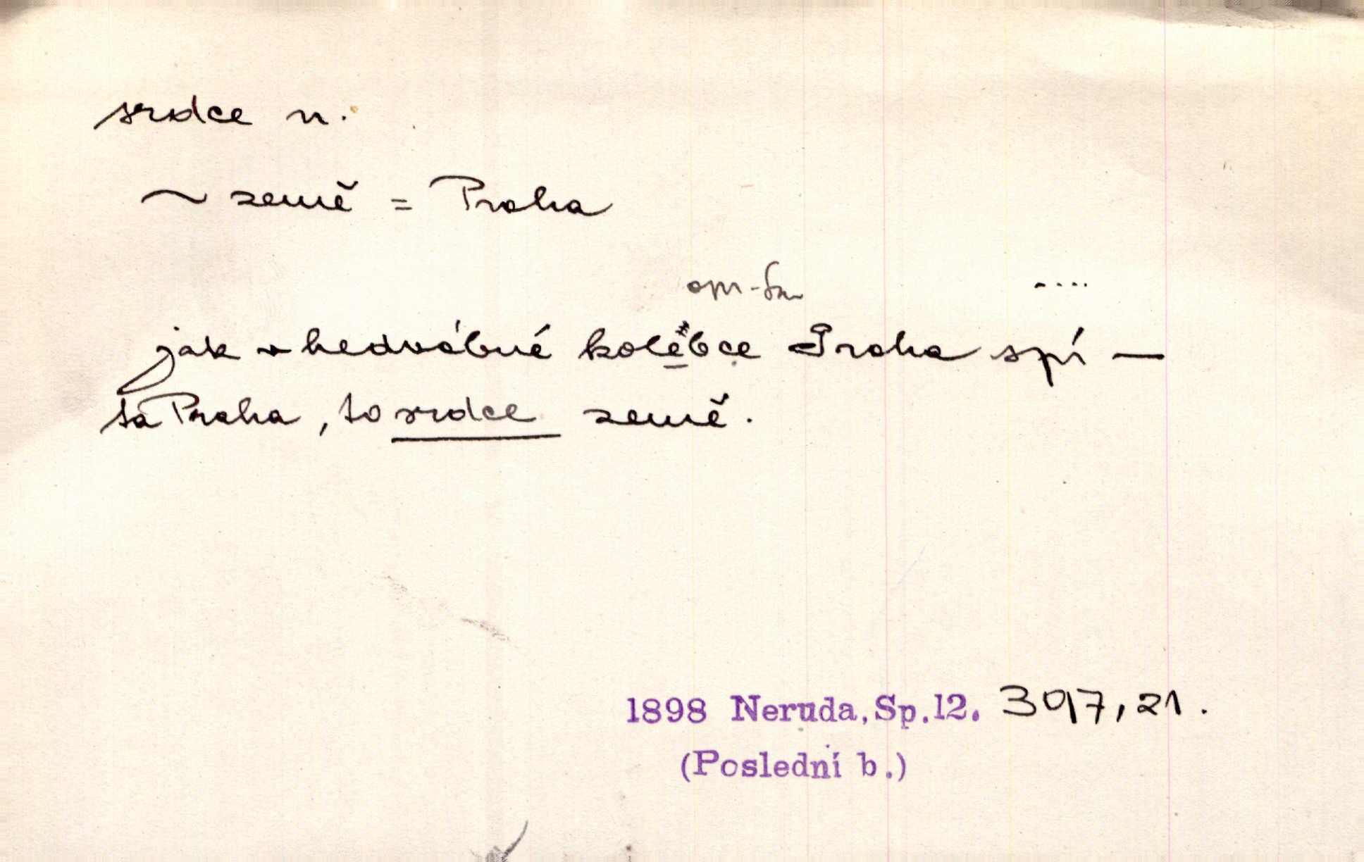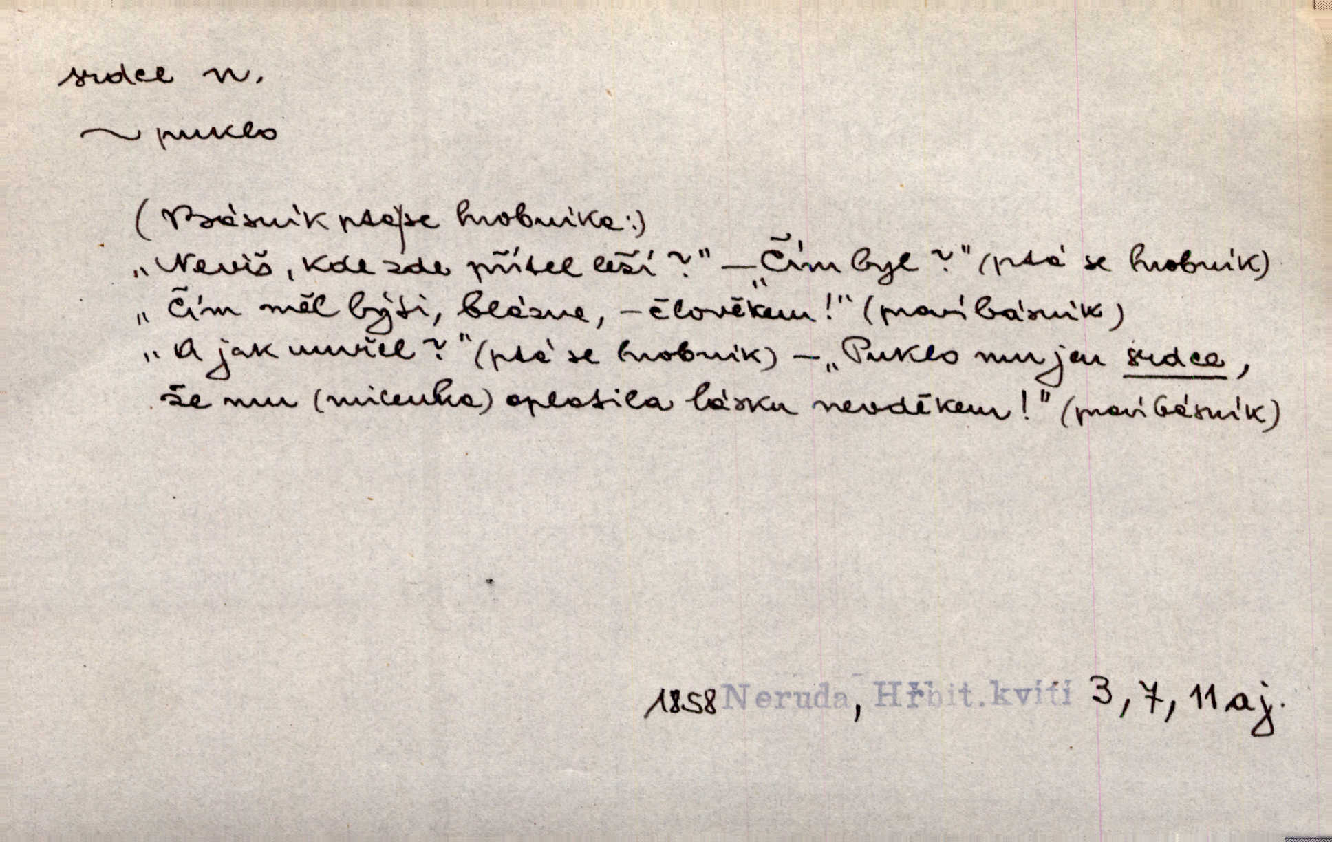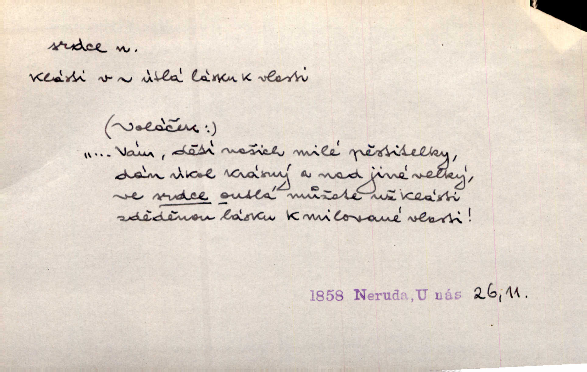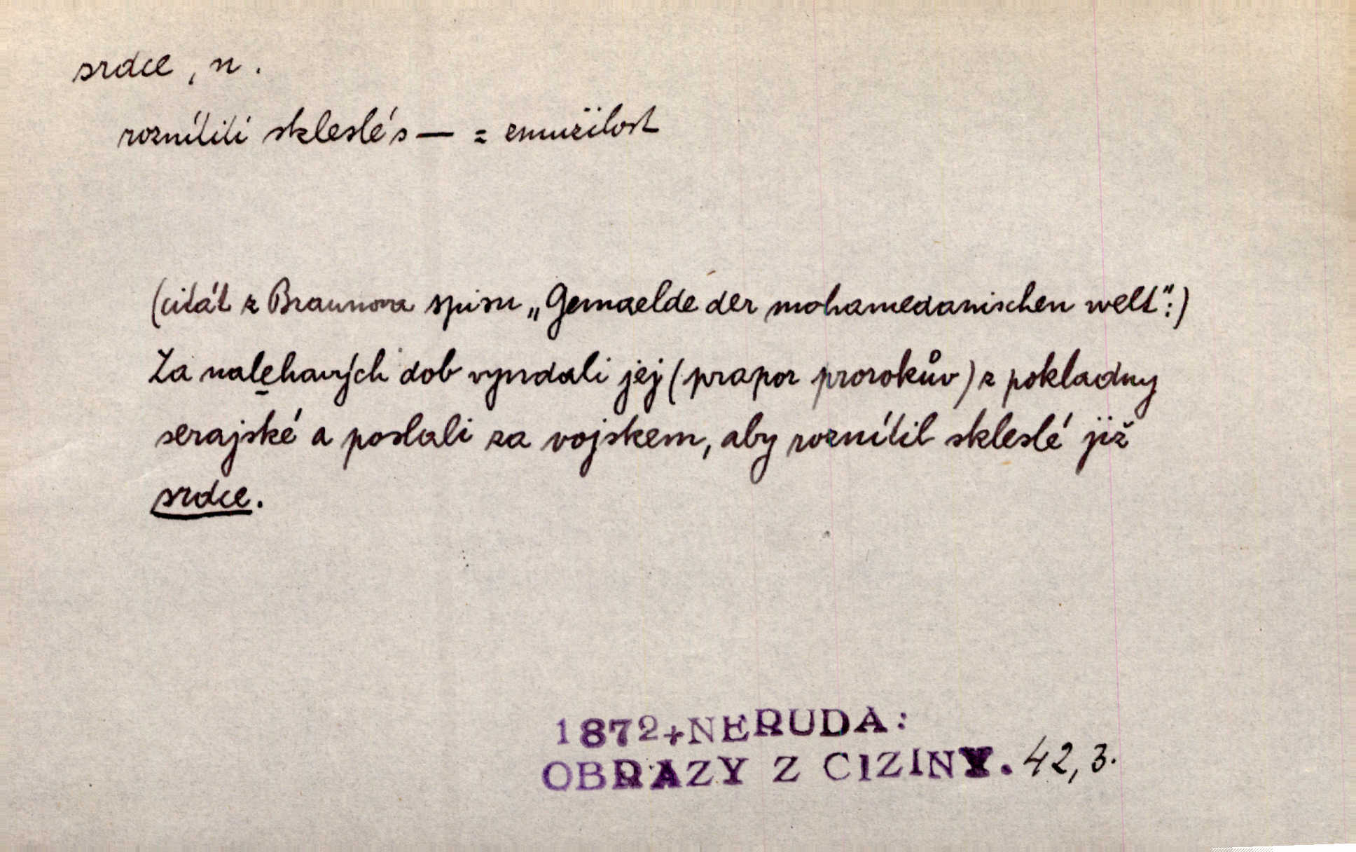 - srdce, -e n. orgán charakteristického tvaru uložený v prsou a uvádějící krev do oběhu. Srdce mi prudce bušilo. Šim. Jaro se ozvalo ve prsou, srdce tak buší a tepe. Ner. Včera [mu] zase „srdce vynechávalo“ nepravidelně tlouklo. Čap. Ch. Všecka krev vehnala se mu k srdci. Šmil. Pocítíte bolest, jakoby dýkou projel vaše srdce. Kar. Svině křičela, jakoby jí nůž do srdce vráželi hrozně. Hol. Okolo srdce mi bylo tak ouzko. Rub. V Hanušovi se při těch slovích srdce stáhlo. Šmil. Takové usmání v lících rozpučilo, že by bolestí se srdce rozskočilo. Ner. Pak bylo Jírovi, jako by se mu mělo srdce utrhnout. Hál. Já nejsem zlá, jak o mně povídají, já bych srdce rozdělila. Klost. Srdce z prsou by si za Antoše vyřízla — jen kdyby mu pomohla udělala by všechno možné. A. Mrš. Žloutly se tu ryzce, až se srdce smálo. Třeb. A srdce zrovna zmíralo v sladké té dřímotě V. Mrš. Ta dítky má — div mne to nezmučí! Pod srdcem jedno, druhé v náručí je těhotná. Vrch. Je [Bělehrad] jakoby srdcem dunajských kralů středem, jádrem. Ner. Přen. Tam, tam na Východě začalo srdce lidstva bít začal kulturní život! Ner. Černá země hýbala se pod povrchem, jakoby i srdce země už zabušilo jaru na uvítanou. Herb. Ba zdá se mi, že duše hájů nepustí ptáky z náruče, až slavíček, to srdce lesa, si při mém srdci zatluče. Hál. [V rolnictvu] vidím srdce národa. Svět. A mezi ním a plání leží Betar, to srdce vzpoury. Vrch. Byla tu Kutná Hora, stříbrné srdce království. Šus. Srdce vlasti, Praho, zdráva buď! Heyd. Výmluvný ten protest proti porobě a násilí nemohl jinak než otřásti srdcem Anglie. Krás. Círk. kongregace Srdce Ježíšova a Mariina několik řeholních společností katolické církve. Lék. dutý sval příčně pruhovaný, tvaru nepravidelně zploštělého kužele působící pohyb krve v cévách. Kuch. dušené hovězí srdce. D symbol, sídlo citu (lásky, nenávisti, radosti, bolesti). Brzy k srdci, brzy k rozumu klonila se. Šmil. Jsou [Kosmické písně] básněny více mozkem, než srdcem. Kar. Ruka vykonává vše, co jí srdce a hlava poroučí. Ner. Srdce se musí umlčeti a třeba i vyrvati. Jir. Srdce ji táhlo k dceři a k vnoučátkům. Něm. Probůh! což nemáš srdce? Krás. Jsou mezi vámi ještě lidé bez kusa srdce. Hol. Hledám lidi, v mém jak ve snu žili; bez srdce však larvy najdu jen. Mácha. Měl už tenkrát tvrdé srdce jako kámen byl nemilosrdný, necitelný. Šmil. Ženy mají srdce příliš blízko u mozku milují s rozvahou. Maj. Má [Františka] někoho již v srdci? miluje ho. Prav. Hoj, já mladá dívčina, srdce nezadané. Erb. Kterak se tedy nazývá vyvolená tvého srdce? Just. Vyznával upřímně, že po ní celým srdcem toužil. Prav. Milá dcero, co mohu říci, když si už podle srdce svého zvolila lásky. Něm. Jdi si, Alberte, kam tě srdce pudí. Jir. Rozdělil své srdce mezi Verunku a Teklu. Herb. Pravda-li, strýčku, že máte srdce pro naši vlast? Gabler. Nejpevněji však přilnulo srdce Jungmannovo k horoucímu vlastenci Vydrovi. Zel. Cítím, že tento člověk přirůstá mi k srdci. Mah. Stárkovi padla hned první den do srdce. Svět. Můj milý český jinochu, já v srdci svém tě nosím. Ner. Od přítele srdce odvrátil přestal ho mít rád. Svět. Nenáviděl od srdce křivdu opravdově. Šmil. Nenávidí z gruntu srdce směr, jakým se nese nynější lékařská literatura. Čech. Bylo jim velmi těžko u srdce byli zarmouceni. Šmil. Přece někdy to srdce stáhne zabolí to. Šim. Měl srdce v kleštích byl v úzkostech. Šmil. Jen mi teď nedělej těžké srdce nedělej starost, lítost. Něm. Musí ho srdce bolet, že pro několik hrstí obilí udělal nebožáka nešťastného musí trpět. Svět. A zas plakala, až jí srdce usedalo velmi lítostivě. Svět. Srdce ve mně radostí poskočilo. Rub. Odejde-li ona, dětem se srdce utrhne budou v těžkém žalu. Hol. Nevěsta jej odmítla a on si to vzal k srdci trápil se. Poláč. Vzal jste si k srdci mé napomenutí řídil jste se jím? Hlad. Mladá paní nebrala si příliš k srdci všechny zlomyslnosti a urážky nedbala jich. Her. Nepřeneseš přes srdce, abys jim zničil celou budoucnost nesneseš lhostejně. K. Čap. Nemohouc mužovo jednání přenésti přes srdce, podstrkovala synovi sem tam groš strpěti. Herb. Co srdce ráčilo, to se vítězným nedojedům vydati musilo vše, čeho žádali. Herb. Bylo mi tatínka z toho srdce líto upřímně. Kos. Pláče ze srdce lítostivě, upřímně. Vrch. S jak těžkým srdcem vytahoval své zlaťáky velmi nerad! Dyk. Umíral s lehkým srdcem lehce. Kun. S lehčím srdcem vrátil jsem se k Pavlovi Lum. D základ povahové stránky, sídlo duševního života, nitro. Lidé se umějí přetvařovati, kdo jim vidí do srdce? Šmil. Nemajíce v srdci žádné náboženství, před světem největší nábožnůstkářství provozují. Havl. Čekal s nápadným neklidem v srdci. Vach. Teď ukázal srdce i ledví objevil se v pravé podobě. Baar. Lidí dost, však srdcí, srdcí málo dobrých lidí. Heyd. Antonín má dobré srdce. Jir. Oni nemají zlé srdce. Šim. Kdo má kus poctivého srdce, raduje se s Vámi. Herb. Měl měkké srdce a tvrdou hlavu. Rub. Měla od jakživa srdce z másla byla jemná, citlivá. Tyl. Obr s srdcem dítěte dobrácký, citlivý. Mach. Zlatý skví se na prsou mu háv, ale pod ním bije srdce zrádné je zrádcem. Kamen. Měl štíra v srdci nasazeného byl neklidný. Baar. Co byl ženat, otevřel jí srdce vyznal se ze všeho. Svět. A dnes po letech vím, že Aleš každému srdce neotevře. Rais. Otevřel knězi hříšné své srdce. Šrám. Po ty tři roky s nikým od srdce nepromluvil upřímně. K. Čap. Vylívá srdce své mluví důvěrně. Ner. Vypravovati upřímně a nelíčeně, od srdce k srdci, dovede člověk toliko řečí jednou. K