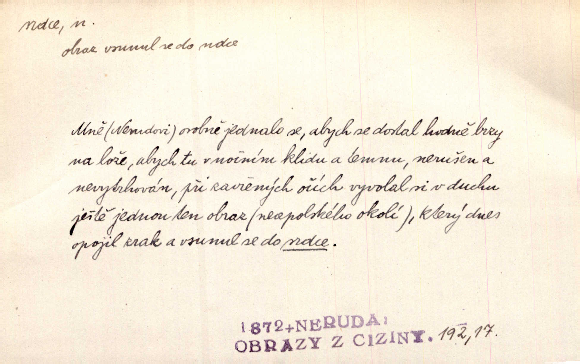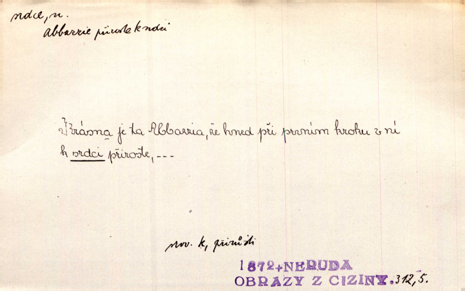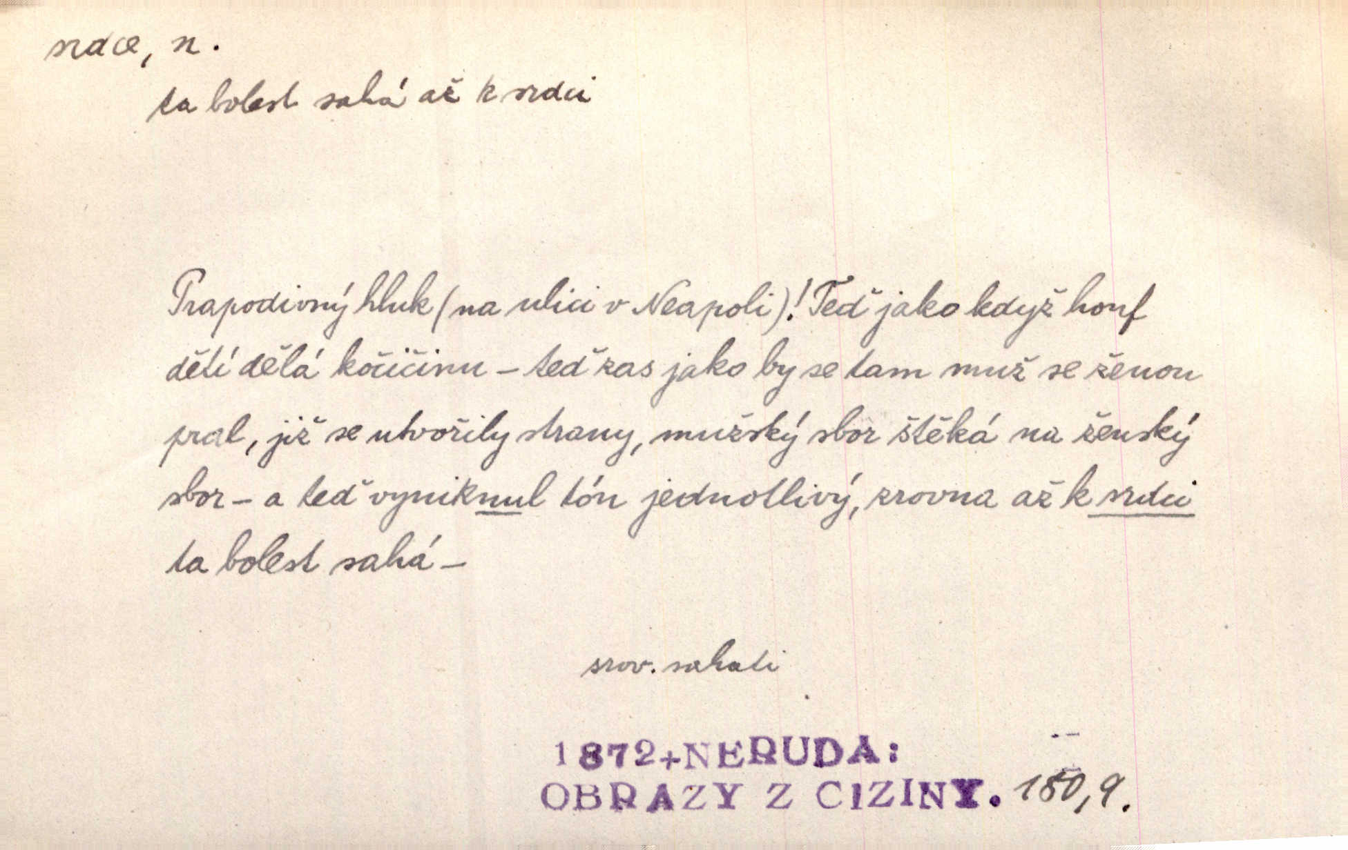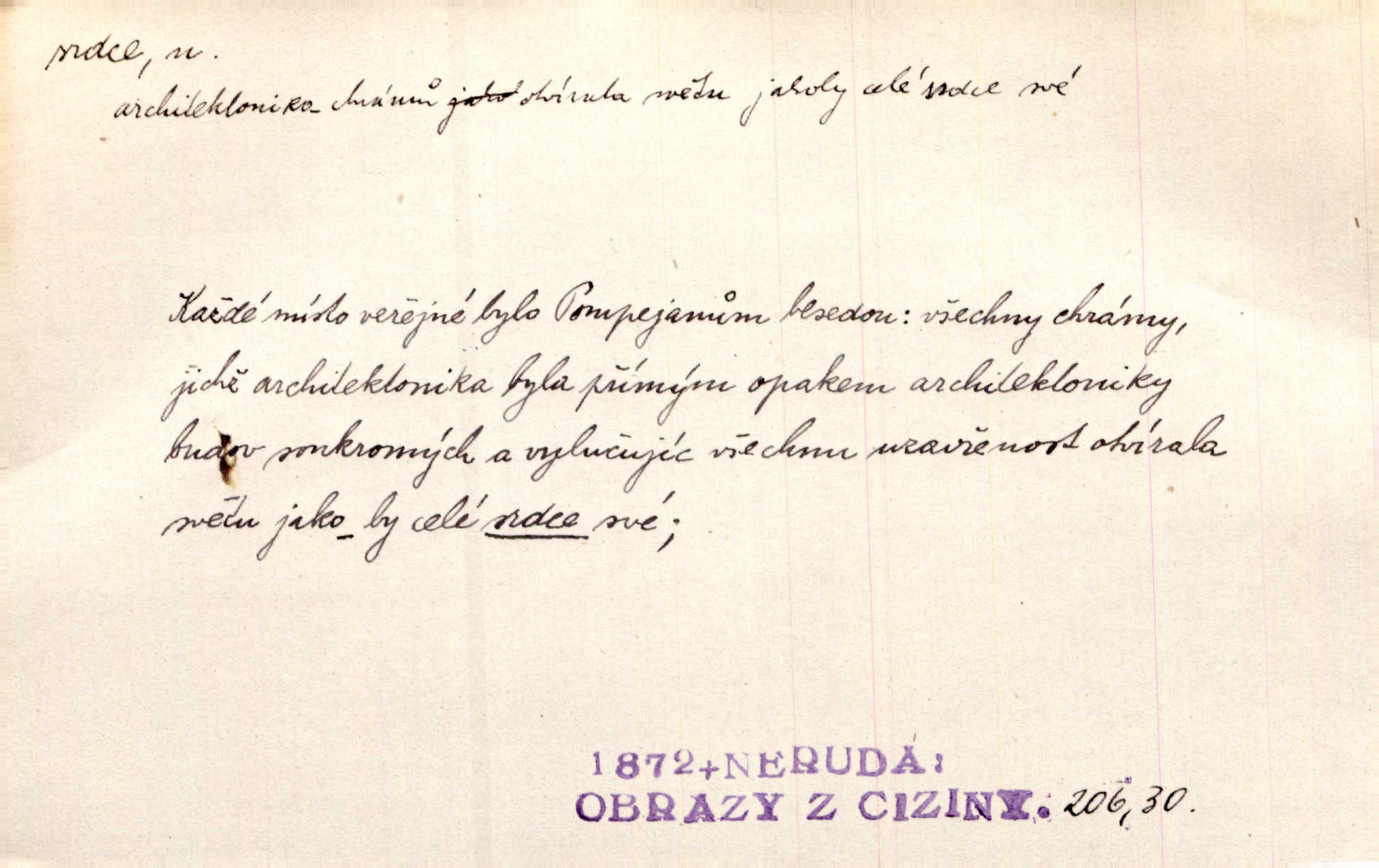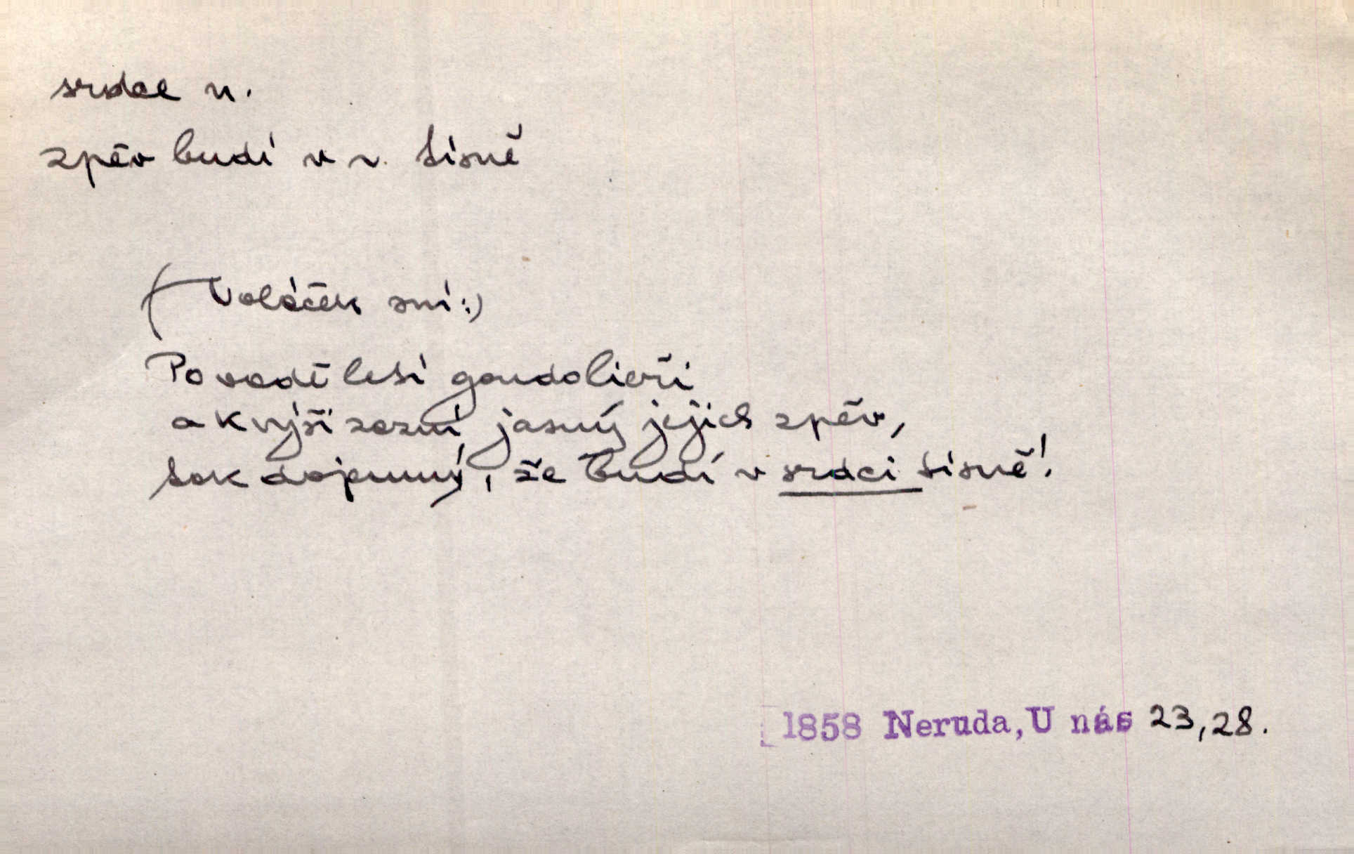 - srdce, -e n. orgán charakteristického tvaru uložený v prsou a uvádějící krev do oběhu. Srdce mi prudce bušilo. Šim. Jaro se ozvalo ve prsou, srdce tak buší a tepe. Ner. Včera [mu] zase „srdce vynechávalo“ nepravidelně tlouklo. Čap. Ch. Všecka krev vehnala se mu k srdci. Šmil. Pocítíte bolest, jakoby dýkou projel vaše srdce. Kar. Svině křičela, jakoby jí nůž do srdce vráželi hrozně. Hol. Okolo srdce mi bylo tak ouzko. Rub. V Hanušovi se při těch slovích srdce stáhlo. Šmil. Takové usmání v lících rozpučilo, že by bolestí se srdce rozskočilo. Ner. Pak bylo Jírovi, jako by se mu mělo srdce utrhnout. Hál. Já nejsem zlá, jak o mně povídají, já bych srdce rozdělila. Klost. Srdce z prsou by si za Antoše vyřízla — jen kdyby mu pomohla udělala by všechno možné. A. Mrš. Žloutly se tu ryzce, až se srdce smálo. Třeb. A srdce zrovna zmíralo v sladké té dřímotě V. Mrš. Ta dítky má — div mne to nezmučí! Pod srdcem jedno, druhé v náručí je těhotná. Vrch. Je [Bělehrad] jakoby srdcem dunajských kralů středem, jádrem. Ner. Přen. Tam, tam na Východě začalo srdce lidstva bít začal kulturní život! Ner. Černá země hýbala se pod povrchem, jakoby i srdce země už zabušilo jaru na uvítanou. Herb. Ba zdá se mi, že duše hájů nepustí ptáky z náruče, až slavíček, to srdce lesa, si při mém srdci zatluče. Hál. [V rolnictvu] vidím srdce národa. Svět. A mezi ním a plání leží Betar, to srdce vzpoury. Vrch. Byla tu Kutná Hora, stříbrné srdce království. Šus. Srdce vlasti, Praho, zdráva buď! Heyd. Výmluvný ten protest proti porobě a násilí nemohl jinak než otřásti srdcem Anglie. Krás. Círk. kongregace Srdce Ježíšova a Mariina několik řeholních společností katolické církve. Lék. dutý sval příčně pruhovaný, tvaru nepravidelně zploštělého kužele působící pohyb krve v cévách. Kuch. dušené hovězí srdce. D symbol, sídlo citu (lásky, nenávisti, radosti, bolesti). Brzy k srdci, brzy k rozumu klonila se. Šmil. Jsou [Kosmické písně] básněny více mozkem, než srdcem. Kar. Ruka vykonává vše, co jí srdce a hlava poroučí. Ner. Srdce se musí umlčeti a třeba i vyrvati. Jir. Srdce ji táhlo k dceři a k vnoučátkům. Něm. Probůh! což nemáš srdce? Krás. Jsou mezi vámi ještě lidé bez kusa srdce. Hol. Hledám lidi, v mém jak ve snu žili; bez srdce však larvy najdu jen. Mácha. Měl už tenkrát tvrdé srdce jako kámen byl nemilosrdný, necitelný. Šmil. Ženy mají srdce příliš blízko u mozku milují s rozvahou. Maj. Má [Františka] někoho již v srdci? miluje ho. Prav. Hoj, já mladá dívčina, srdce nezadané. Erb. Kterak se tedy nazývá vyvolená tvého srdce? Just. Vyznával upřímně, že po ní celým srdcem toužil. Prav. Milá dcero, co mohu říci, když si už podle srdce svého zvolila lásky. Něm. Jdi si, Alberte, kam tě srdce pudí. Jir. Rozdělil své srdce mezi Verunku a Teklu. Herb. Pravda-li, strýčku, že máte srdce pro naši vlast? Gabler. Nejpevněji však přilnulo srdce Jungmannovo k horoucímu vlastenci Vydrovi. Zel. Cítím, že tento člověk přirůstá mi k srdci. Mah. Stárkovi padla hned první den do srdce. Svět. Můj milý český jinochu, já v srdci svém tě nosím. Ner. Od přítele srdce odvrátil přestal ho mít rád. Svět. Nenáviděl od srdce křivdu opravdově. Šmil. Nenávidí z gruntu srdce směr, jakým se nese nynější lékařská literatura. Čech. Bylo jim velmi těžko u srdce byli zarmouceni. Šmil. Přece někdy to srdce stáhne zabolí to. Šim. Měl srdce v kleštích byl v úzkostech. Šmil. Jen mi teď nedělej těžké srdce nedělej starost, lítost. Něm. Musí ho srdce bolet, že pro několik hrstí obilí udělal nebožáka nešťastného musí trpět. Svět. A zas plakala, až jí srdce usedalo velmi lítostivě. Svět. Srdce ve mně radostí poskočilo. Rub. Odejde-li ona, dětem se srdce utrhne budou v těžkém žalu. Hol. Nevěsta jej odmítla a on si to vzal k srdci trápil se. Poláč. Vzal jste si k srdci mé napomenutí řídil jste se jím? Hlad. Mladá paní nebrala si příliš k srdci všechny zlomyslnosti a urážky nedbala jich. Her. Nepřeneseš přes srdce, abys jim zničil celou budoucnost nesneseš lhostejně. K. Čap. Nemohouc mužovo jednání přenésti přes srdce, podstrkovala synovi sem tam groš strpěti. Herb. Co srdce ráčilo, to se vítězným nedojedům vydati musilo vše, čeho žádali. Herb. Bylo mi tatínka z toho srdce líto upřímně. Kos. Pláče ze srdce lítostivě, upřímně. Vrch. S jak těžkým srdcem vytahoval své zlaťáky velmi nerad! Dyk. Umíral s lehkým srdcem lehce. Kun. S lehčím srdcem vrátil jsem se k Pavlovi Lum. D základ povahové stránky, sídlo duševního života, nitro. Lidé se umějí přetvařovati, kdo jim vidí do srdce? Šmil. Nemajíce v srdci žádné náboženství, před světem největší nábožnůstkářství provozují. Havl. Čekal s nápadným neklidem v srdci. Vach. Teď ukázal srdce i ledví objevil se v pravé podobě. Baar. Lidí dost, však srdcí, srdcí málo dobrých lidí. Heyd. Antonín má dobré srdce. Jir. Oni nemají zlé srdce. Šim. Kdo má kus poctivého srdce, raduje se s Vámi. Herb. Měl měkké srdce a tvrdou hlavu. Rub. Měla od jakživa srdce z másla byla jemná, citlivá. Tyl. Obr s srdcem dítěte dobrácký, citlivý. Mach. Zlatý skví se na prsou mu háv, ale pod ním bije srdce zrádné je zrádcem. Kamen. Měl štíra v srdci nasazeného byl neklidný. Baar. Co byl ženat, otevřel jí srdce vyznal se ze všeho. Svět. A dnes po letech vím, že Aleš každému srdce neotevře. Rais. Otevřel knězi hříšné své srdce. Šrám. Po ty tři roky s nikým od srdce nepromluvil upřímně. K. Čap. Vylívá srdce své mluví důvěrně. Ner. Vypravovati upřímně a nelíčeně, od srdce k srdci, dovede člověk toliko řečí jednou. K
