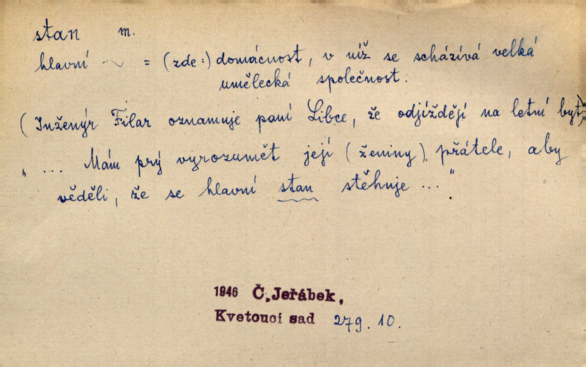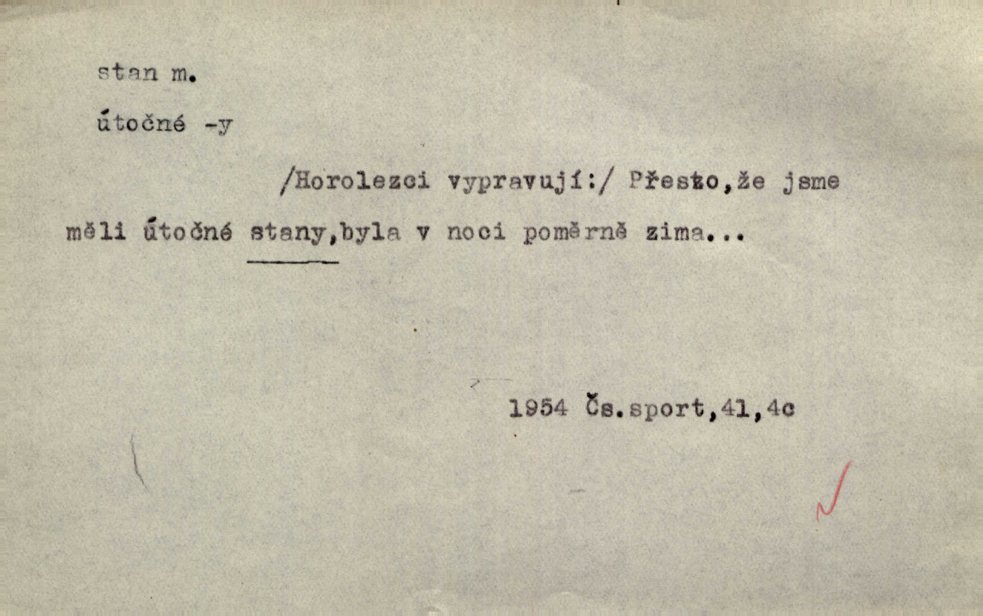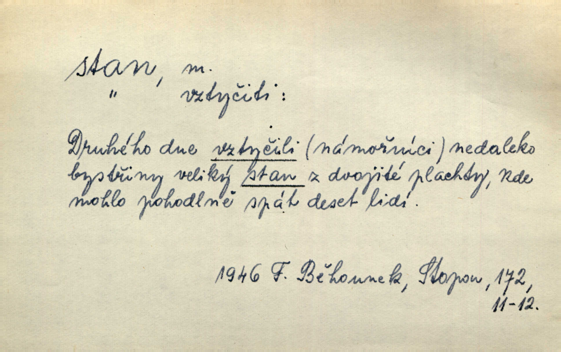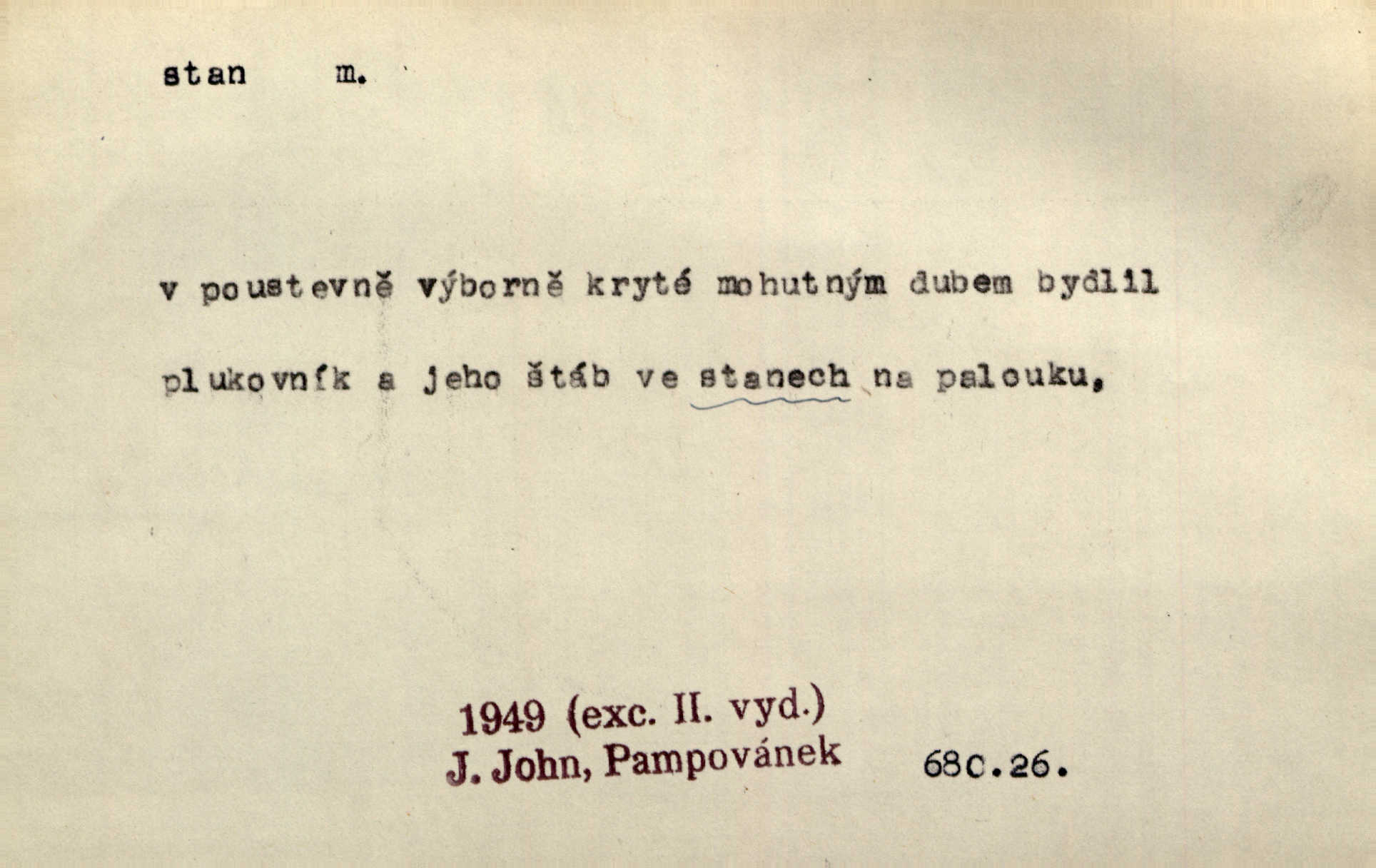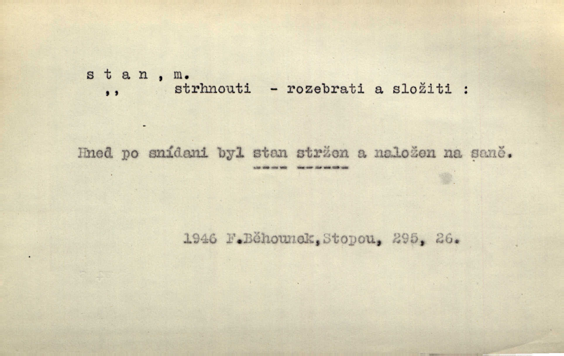 - stan, -u m. skládací přístřeší z nepromokavé látky pro přechodné nocování. Ulehl jsem v polním stanu. Arb. Zřím beduinů stany. Vrch. Přišed v ležení, rovnou cestou kráčel do knížecího stánu. Mácha. Já vychována doma ve stanech a v třesku zbraně, drsnou vedu řeč. Vrch. A bez konce ty voje zdály se, jež kolem města stany rozbily. Zey. Nazejtří v neděli ráno hradby opuštěny, stanové strženi a ležení všecko v požeh dáno. Pal. Schylovalo se k tomu, že strhneme stan svůj a poputujeme dále připravíme se na cestu. Herrm. Ve vsi kaplička čtyřboká, s šindelovým stanem a lucernou střechou v podobě stanu. Kamper-Wirth. Voj. stan na zboží, stan na obvaziště, štábní stan a j. D Zř. pouťový stánek. Plátěných stanů s pernikářským a jiným zbožím veliký tu byl postaven počet. Dou. Šťastným byl jsem teprv před kostelem mezi řadami stanů, kde se prodávaly nejrozmanitější věci. Podl. D Kniž. sídlo, bydliště. Přišel k jedné hoře, na které mocný král země svůj stan měl. Něm. Slabý, křehký, bídný stan jsem ducha jeho [Boha]. Vrch. V duši mé tvůj věčný stán. Heyd. Vyhledal jsem města část, kde bída má svůj stan. Zey. D Zast. stanoviště. Stará naložila jí nůši hrnců, dovedla ji na stan a pověděla jí, jak má s lidmi kupčit. Něm. Lesní muž pod dubem s vysokého stanu škaredě pohlíží v západní stranu. Erb. Ty [ženy] chtěly uskočit, kde bezpečnější stan. Ner. Přen. Strašně dlouhé interregnum [v divadle] neblíží se ještě k svému konci, ba nezasvitá ani odnikud vůdčí hvězdička, jež by nás ze truchlého toho stánu vyvedla. Ner. Loď. zařízení na břehu pro přistání lodí a vorů na kratší čas. D Voj. velitel se štábem u vyšší jednotky v poli. Hlavní stan hlavní velitelství.