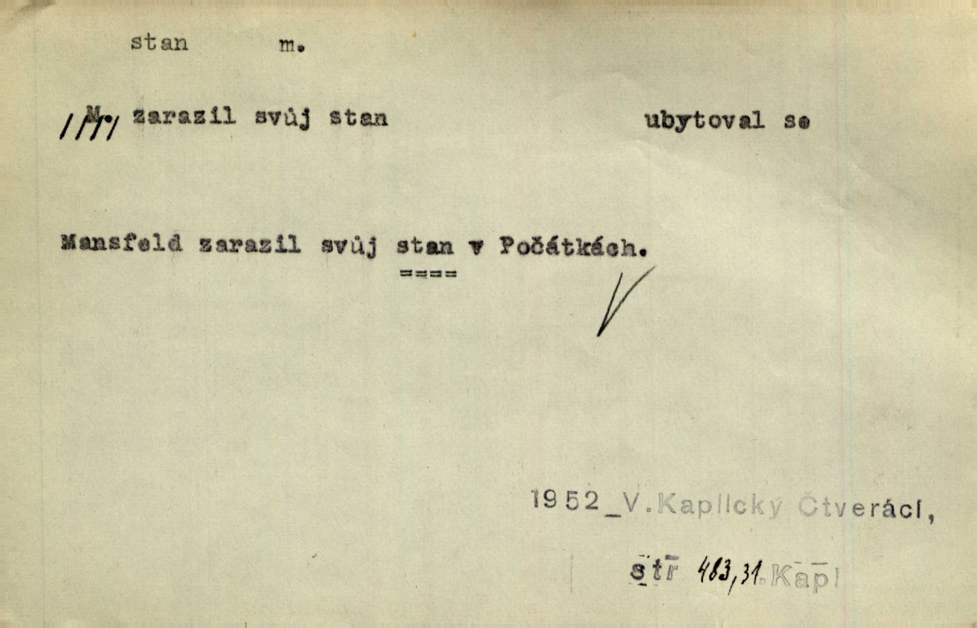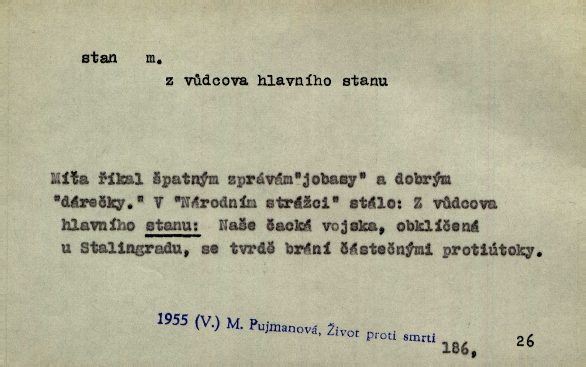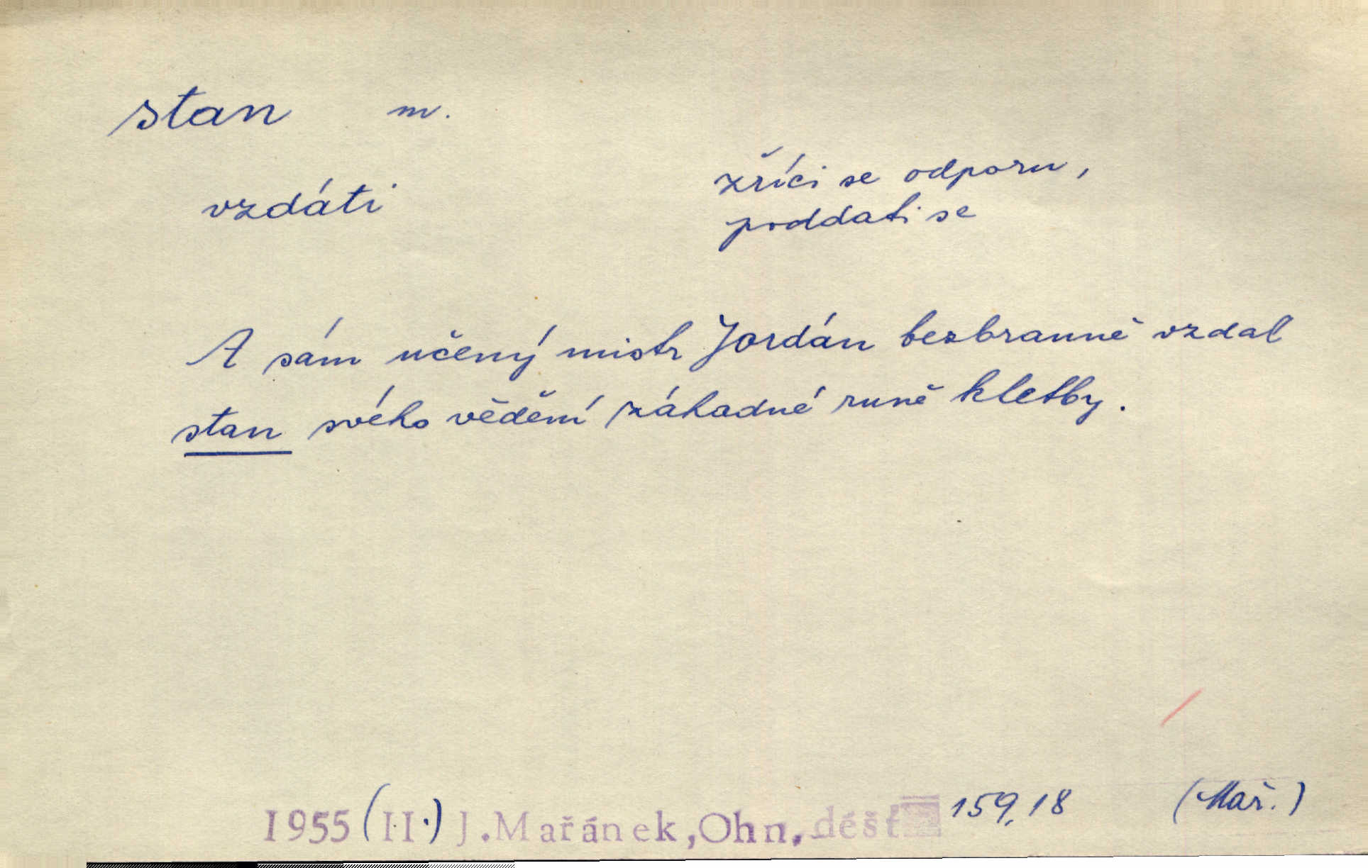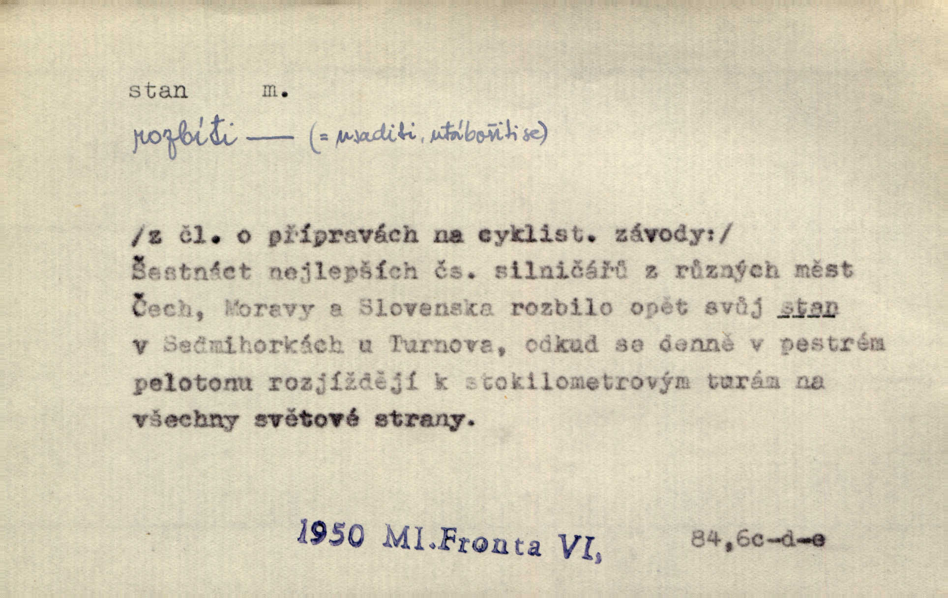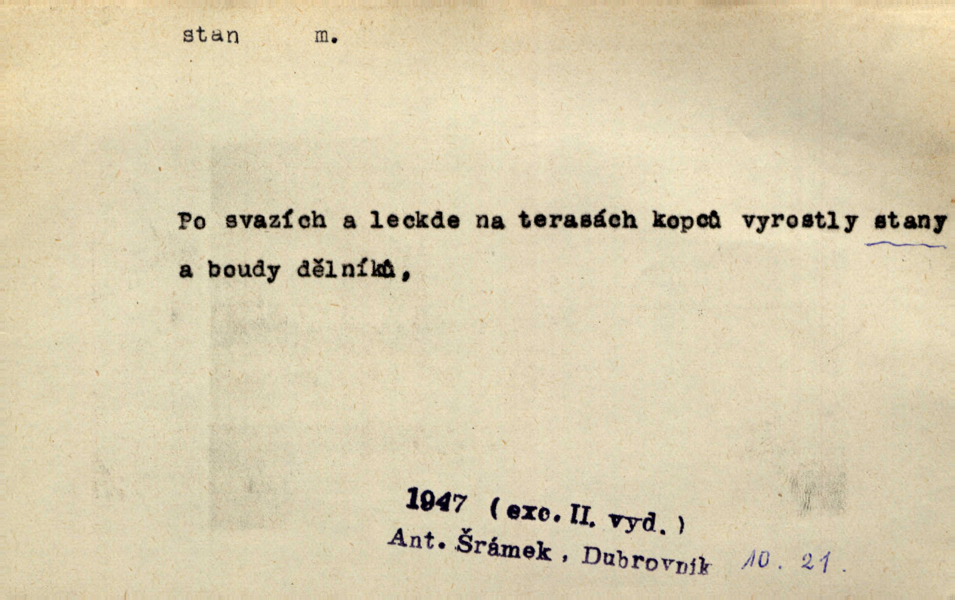- stan, -u m. skládací přístřeší z nepromokavé látky pro přechodné nocování. Ulehl jsem v polním stanu. Arb. Zřím beduinů stany. Vrch. Přišed v ležení, rovnou cestou kráčel do knížecího stánu. Mácha. Já vychována doma ve stanech a v třesku zbraně, drsnou vedu řeč. Vrch. A bez konce ty voje zdály se, jež kolem města stany rozbily. Zey. Nazejtří v neděli ráno hradby opuštěny, stanové strženi a ležení všecko v požeh dáno. Pal. Schylovalo se k tomu, že strhneme stan svůj a poputujeme dále připravíme se na cestu. Herrm. Ve vsi kaplička čtyřboká, s šindelovým stanem a lucernou střechou v podobě stanu. Kamper-Wirth. Voj. stan na zboží, stan na obvaziště, štábní stan a j. D Zř. pouťový stánek. Plátěných stanů s pernikářským a jiným zbožím veliký tu byl postaven počet. Dou. Šťastným byl jsem teprv před kostelem mezi řadami stanů, kde se prodávaly nejrozmanitější věci. Podl. D Kniž. sídlo, bydliště. Přišel k jedné hoře, na které mocný král země svůj stan měl. Něm. Slabý, křehký, bídný stan jsem ducha jeho [Boha]. Vrch. V duši mé tvůj věčný stán. Heyd. Vyhledal jsem města část, kde bída má svůj stan. Zey. D Zast. stanoviště. Stará naložila jí nůši hrnců, dovedla ji na stan a pověděla jí, jak má s lidmi kupčit. Něm. Lesní muž pod dubem s vysokého stanu škaredě pohlíží v západní stranu. Erb. Ty [ženy] chtěly uskočit, kde bezpečnější stan. Ner. Přen. Strašně dlouhé interregnum [v divadle] neblíží se ještě k svému konci, ba nezasvitá ani odnikud vůdčí hvězdička, jež by nás ze truchlého toho stánu vyvedla. Ner. Loď. zařízení na břehu pro přistání lodí a vorů na kratší čas. D Voj. velitel se štábem u vyšší jednotky v poli. Hlavní stan hlavní velitelství.