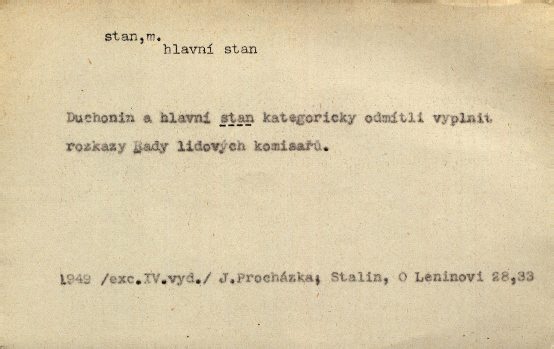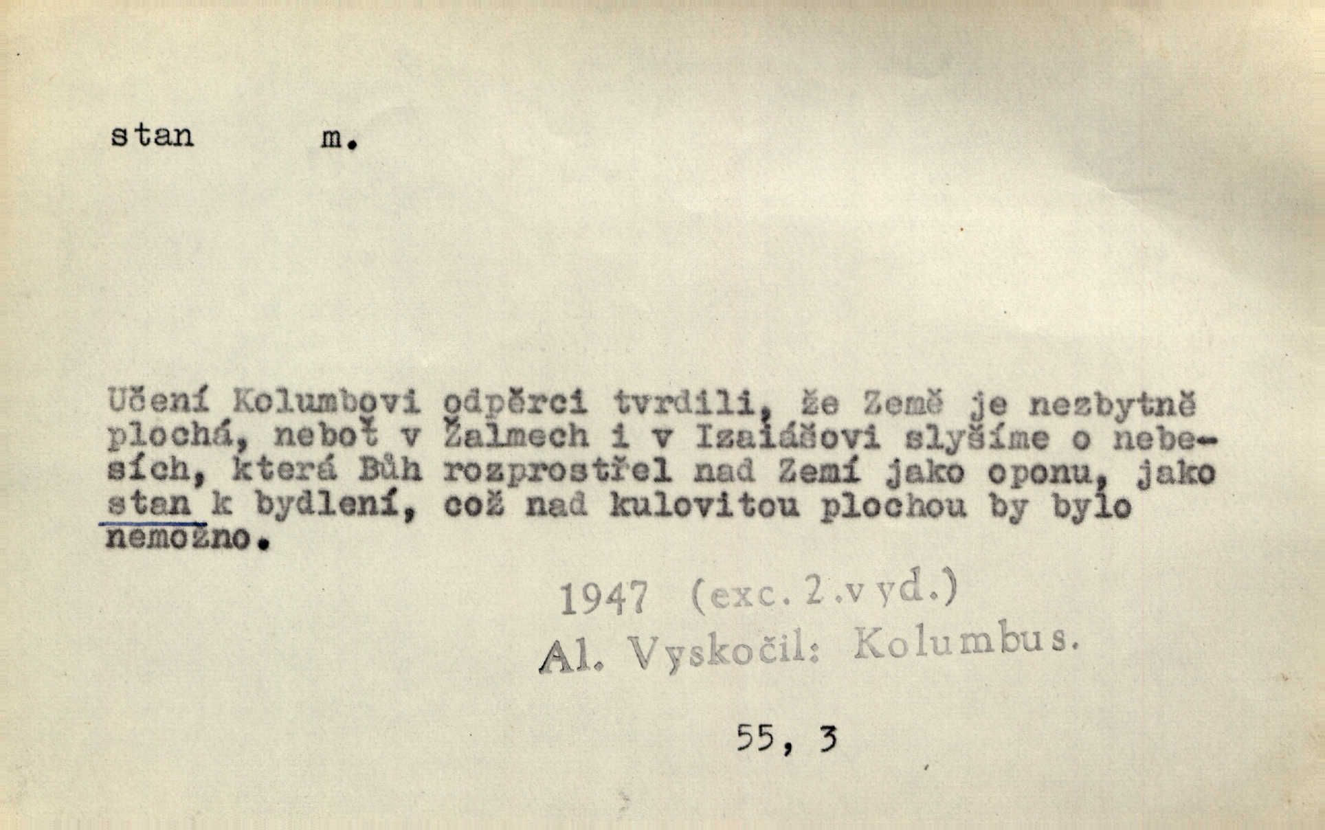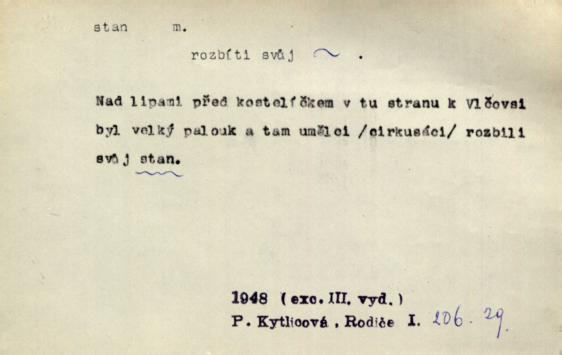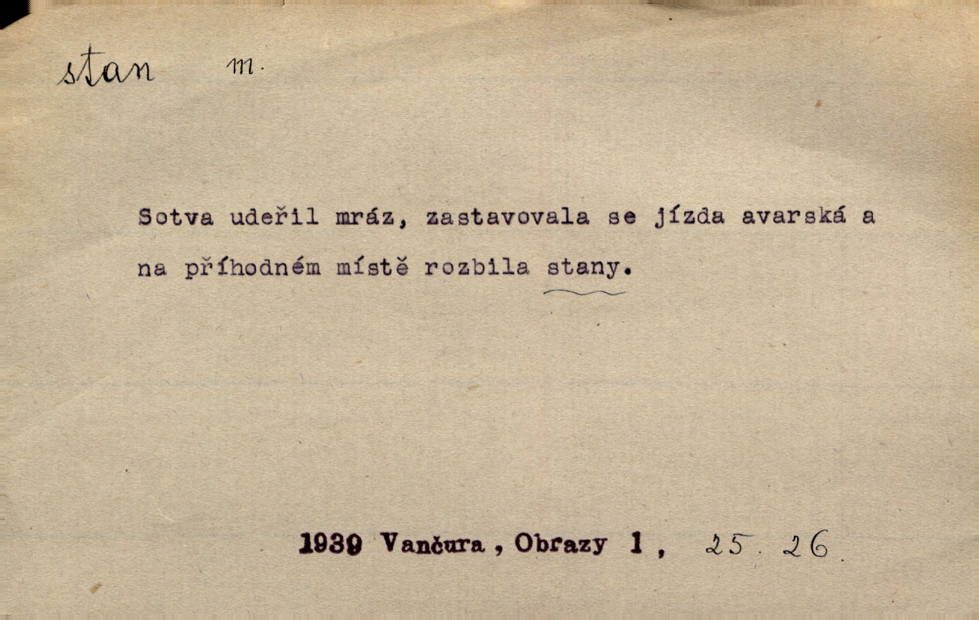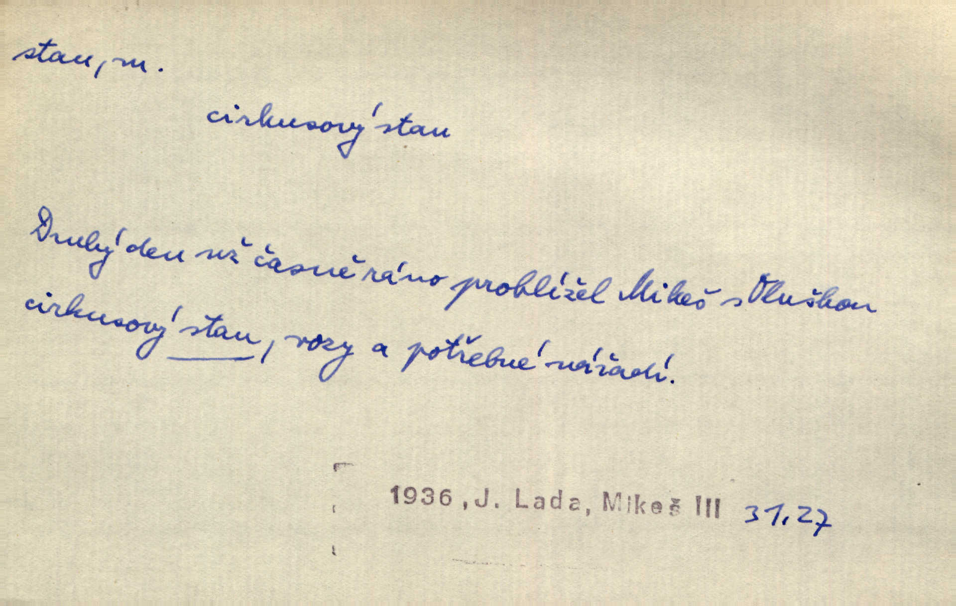 - stan, -u m. skládací přístřeší z nepromokavé látky pro přechodné nocování. Ulehl jsem v polním stanu. Arb. Zřím beduinů stany. Vrch. Přišed v ležení, rovnou cestou kráčel do knížecího stánu. Mácha. Já vychována doma ve stanech a v třesku zbraně, drsnou vedu řeč. Vrch. A bez konce ty voje zdály se, jež kolem města stany rozbily. Zey. Nazejtří v neděli ráno hradby opuštěny, stanové strženi a ležení všecko v požeh dáno. Pal. Schylovalo se k tomu, že strhneme stan svůj a poputujeme dále připravíme se na cestu. Herrm. Ve vsi kaplička čtyřboká, s šindelovým stanem a lucernou střechou v podobě stanu. Kamper-Wirth. Voj. stan na zboží, stan na obvaziště, štábní stan a j. D Zř. pouťový stánek. Plátěných stanů s pernikářským a jiným zbožím veliký tu byl postaven počet. Dou. Šťastným byl jsem teprv před kostelem mezi řadami stanů, kde se prodávaly nejrozmanitější věci. Podl. D Kniž. sídlo, bydliště. Přišel k jedné hoře, na které mocný král země svůj stan měl. Něm. Slabý, křehký, bídný stan jsem ducha jeho [Boha]. Vrch. V duši mé tvůj věčný stán. Heyd. Vyhledal jsem města část, kde bída má svůj stan. Zey. D Zast. stanoviště. Stará naložila jí nůši hrnců, dovedla ji na stan a pověděla jí, jak má s lidmi kupčit. Něm. Lesní muž pod dubem s vysokého stanu škaredě pohlíží v západní stranu. Erb. Ty [ženy] chtěly uskočit, kde bezpečnější stan. Ner. Přen. Strašně dlouhé interregnum [v divadle] neblíží se ještě k svému konci, ba nezasvitá ani odnikud vůdčí hvězdička, jež by nás ze truchlého toho stánu vyvedla. Ner. Loď. zařízení na břehu pro přistání lodí a vorů na kratší čas. D Voj. velitel se štábem u vyšší jednotky v poli. Hlavní stan hlavní velitelství.