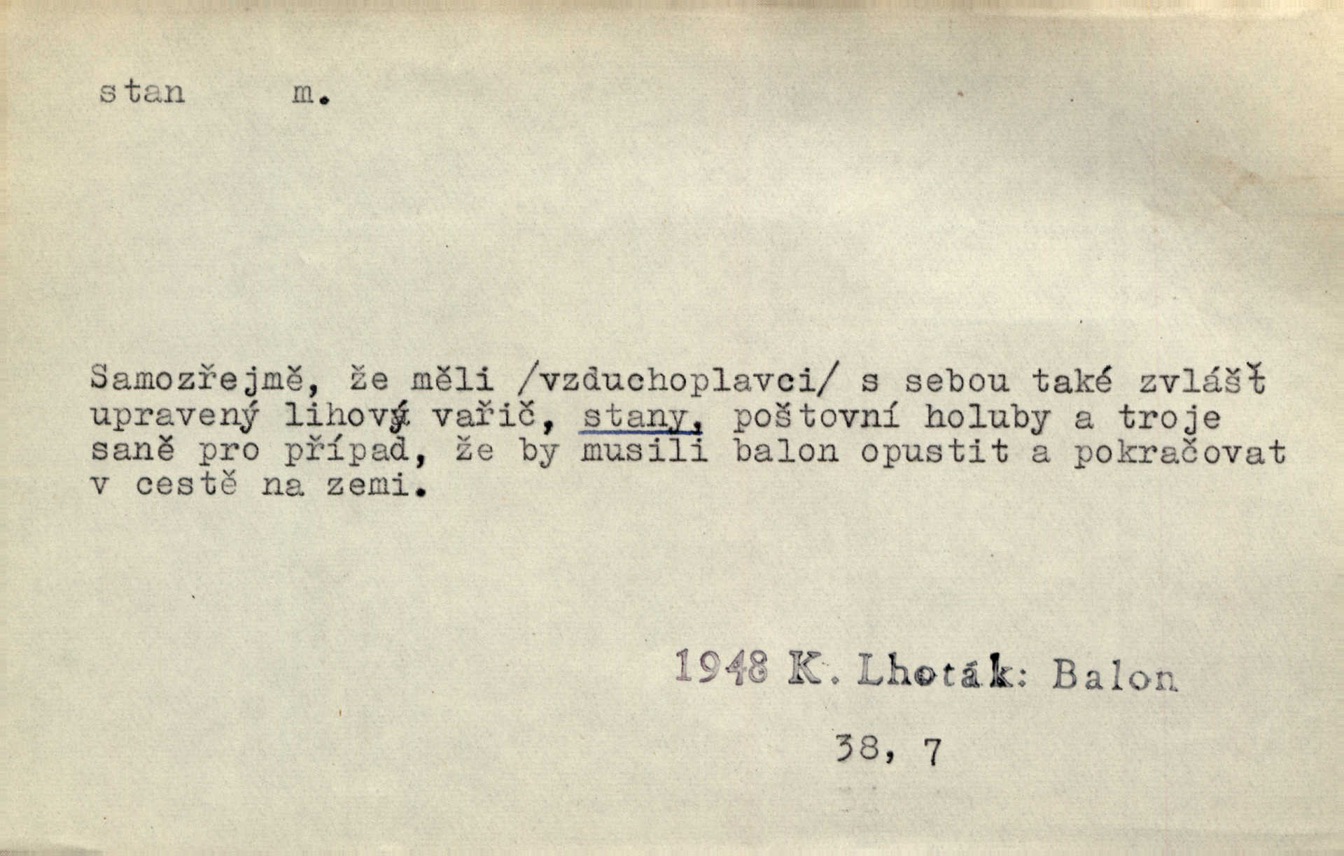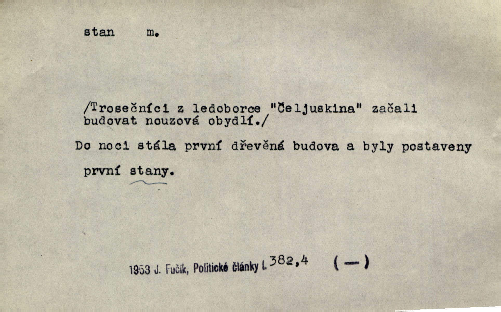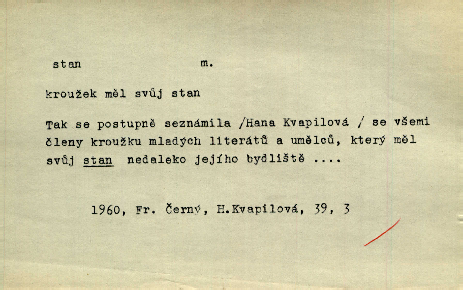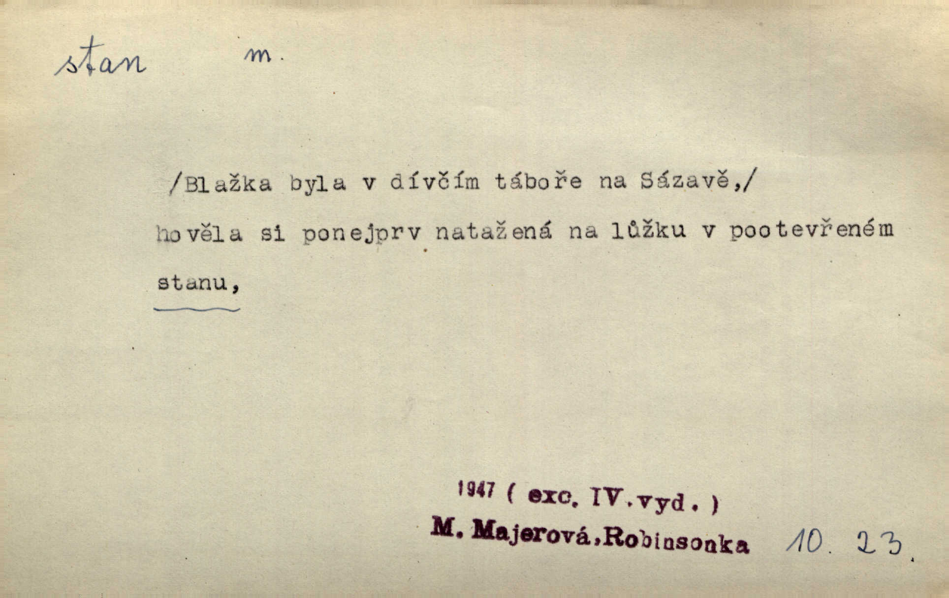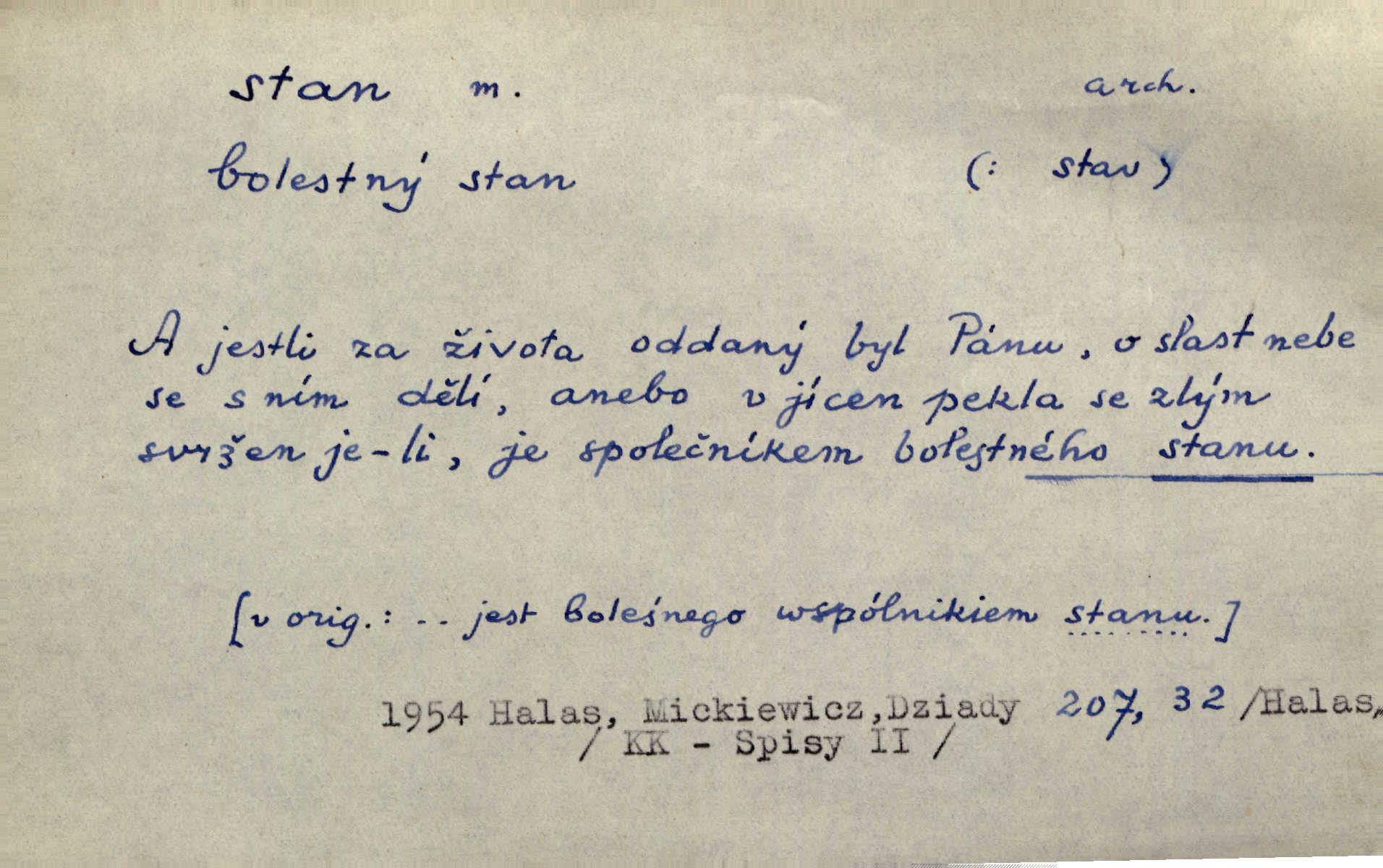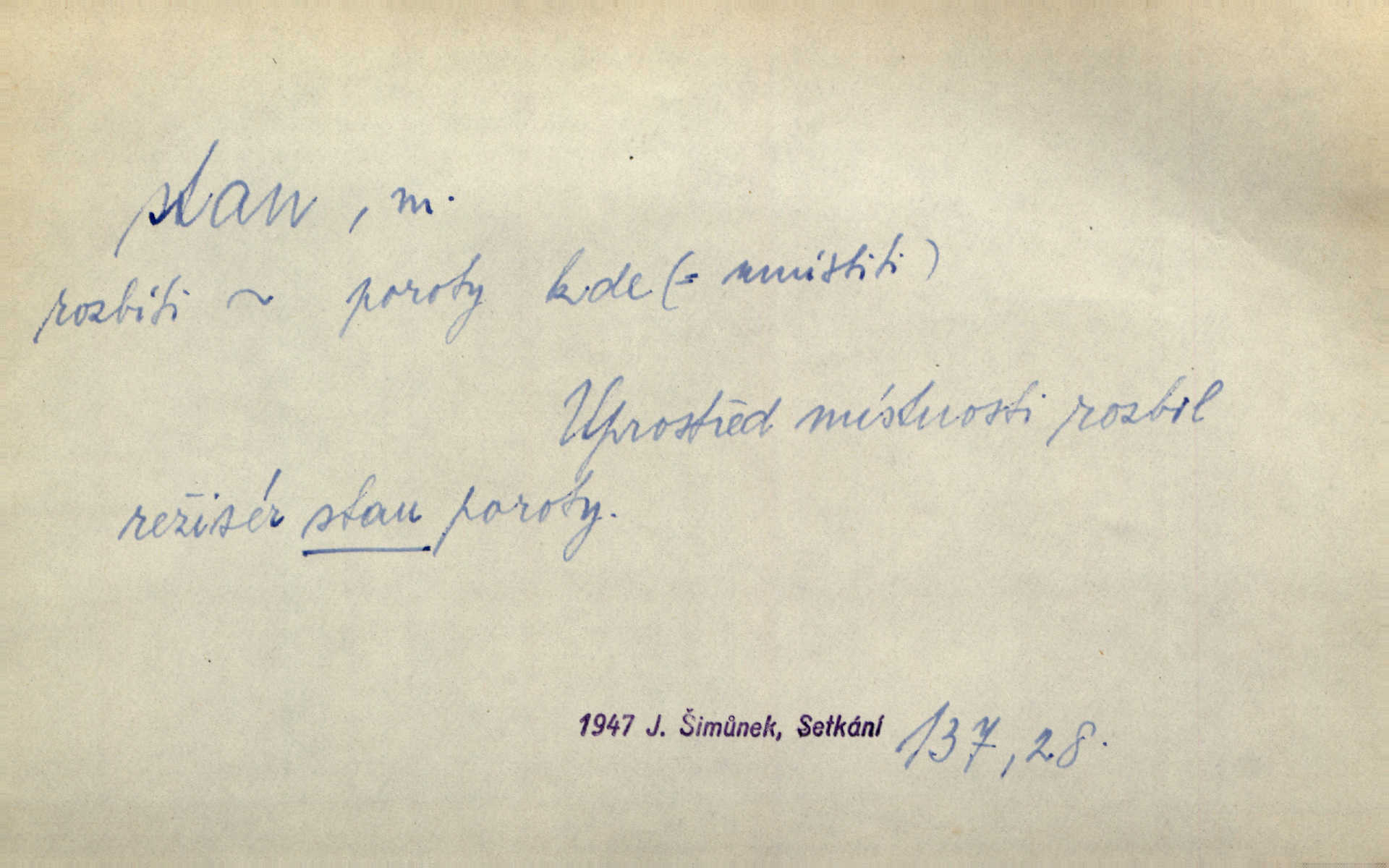 - stan, -u m. skládací přístřeší z nepromokavé látky pro přechodné nocování. Ulehl jsem v polním stanu. Arb. Zřím beduinů stany. Vrch. Přišed v ležení, rovnou cestou kráčel do knížecího stánu. Mácha. Já vychována doma ve stanech a v třesku zbraně, drsnou vedu řeč. Vrch. A bez konce ty voje zdály se, jež kolem města stany rozbily. Zey. Nazejtří v neděli ráno hradby opuštěny, stanové strženi a ležení všecko v požeh dáno. Pal. Schylovalo se k tomu, že strhneme stan svůj a poputujeme dále připravíme se na cestu. Herrm. Ve vsi kaplička čtyřboká, s šindelovým stanem a lucernou střechou v podobě stanu. Kamper-Wirth. Voj. stan na zboží, stan na obvaziště, štábní stan a j. D Zř. pouťový stánek. Plátěných stanů s pernikářským a jiným zbožím veliký tu byl postaven počet. Dou. Šťastným byl jsem teprv před kostelem mezi řadami stanů, kde se prodávaly nejrozmanitější věci. Podl. D Kniž. sídlo, bydliště. Přišel k jedné hoře, na které mocný král země svůj stan měl. Něm. Slabý, křehký, bídný stan jsem ducha jeho [Boha]. Vrch. V duši mé tvůj věčný stán. Heyd. Vyhledal jsem města část, kde bída má svůj stan. Zey. D Zast. stanoviště. Stará naložila jí nůši hrnců, dovedla ji na stan a pověděla jí, jak má s lidmi kupčit. Něm. Lesní muž pod dubem s vysokého stanu škaredě pohlíží v západní stranu. Erb. Ty [ženy] chtěly uskočit, kde bezpečnější stan. Ner. Přen. Strašně dlouhé interregnum [v divadle] neblíží se ještě k svému konci, ba nezasvitá ani odnikud vůdčí hvězdička, jež by nás ze truchlého toho stánu vyvedla. Ner. Loď. zařízení na břehu pro přistání lodí a vorů na kratší čas. D Voj. velitel se štábem u vyšší jednotky v poli. Hlavní stan hlavní velitelství.