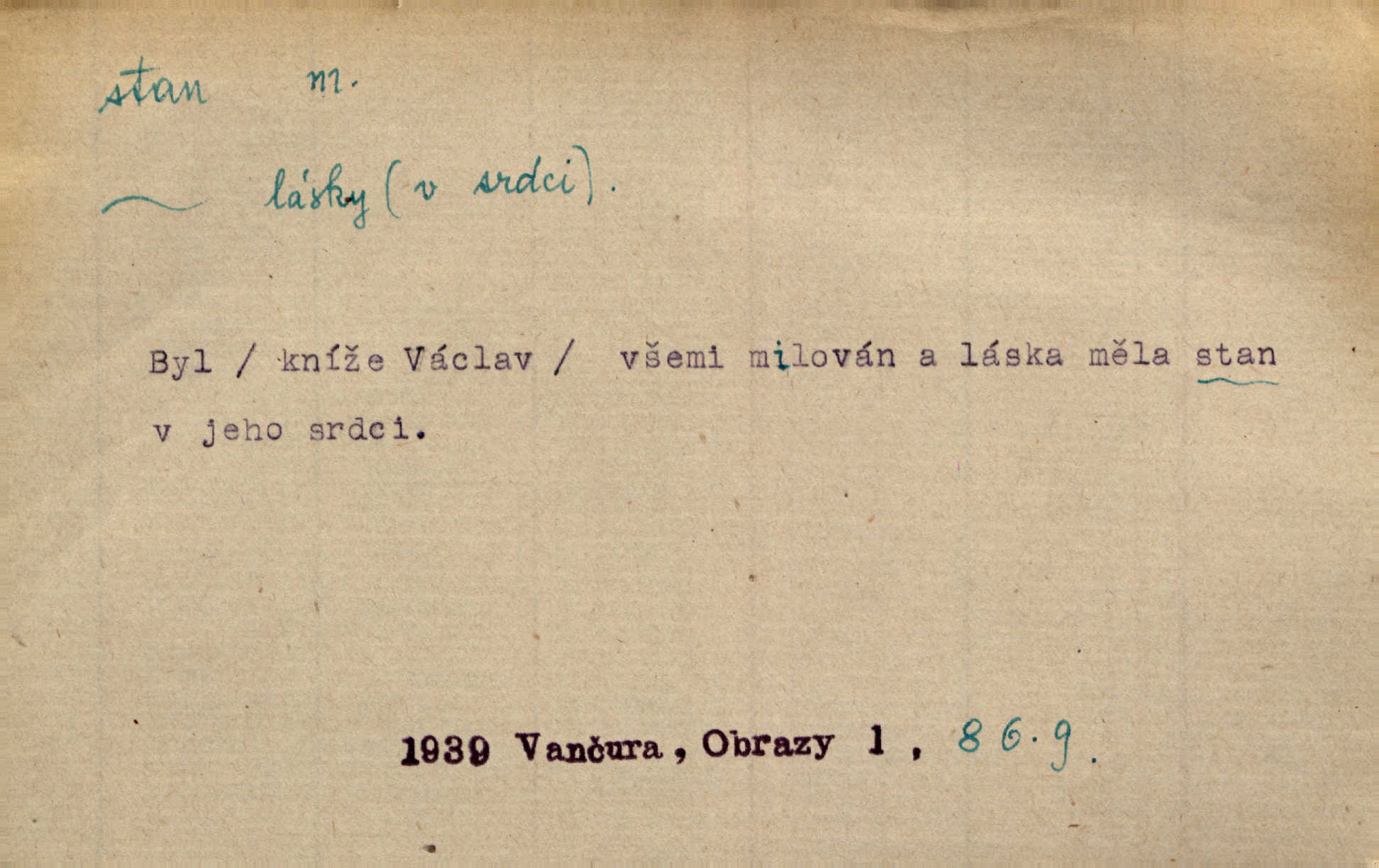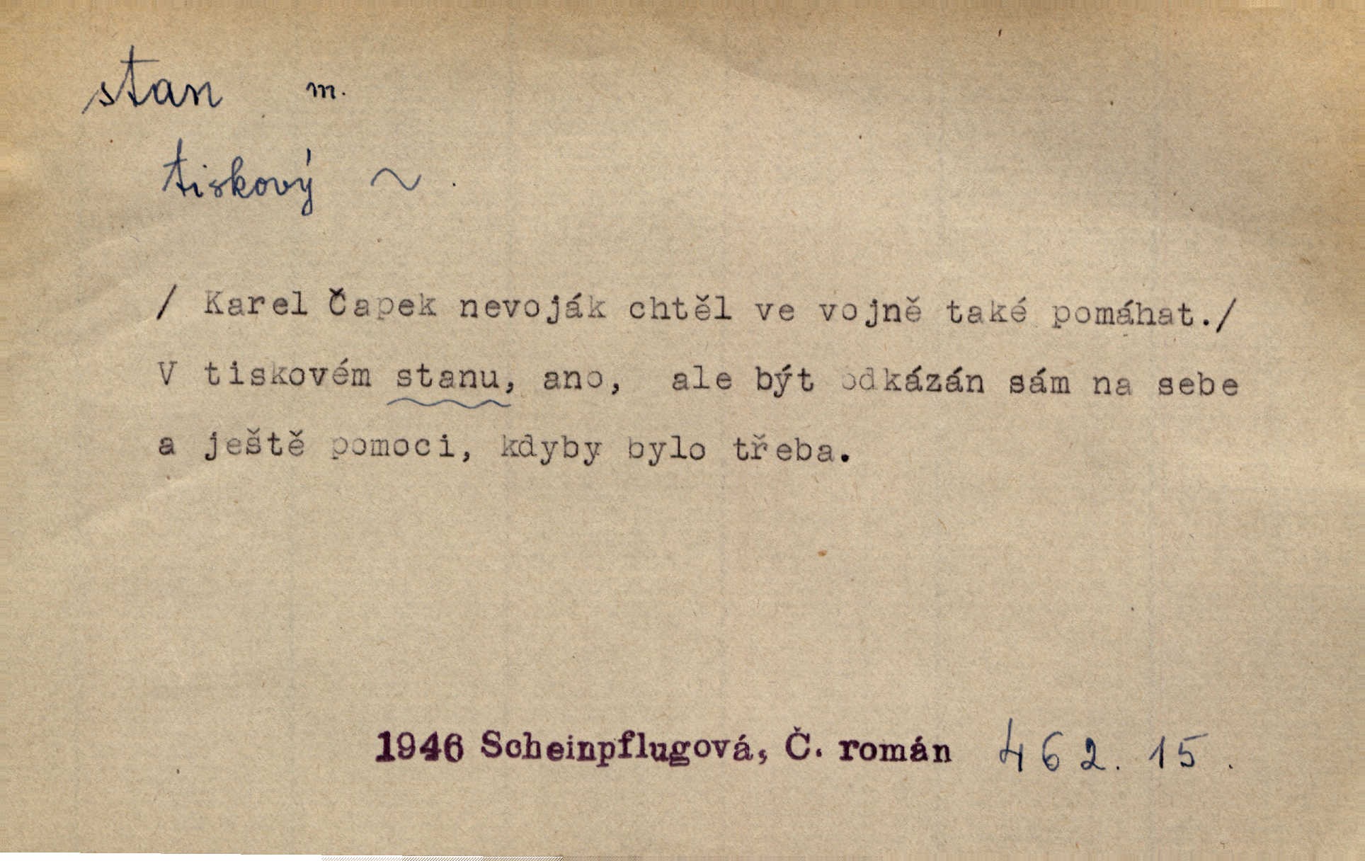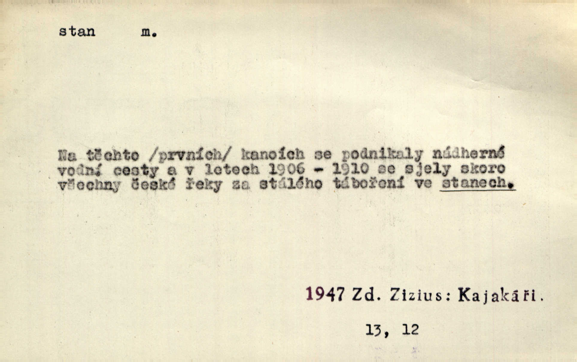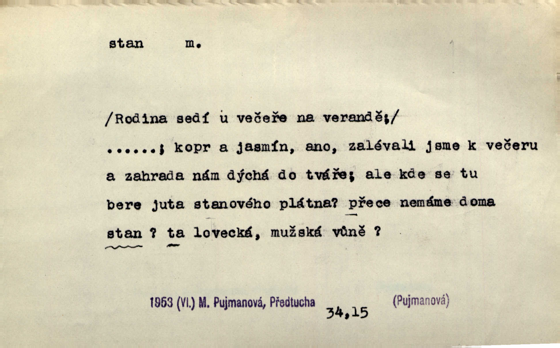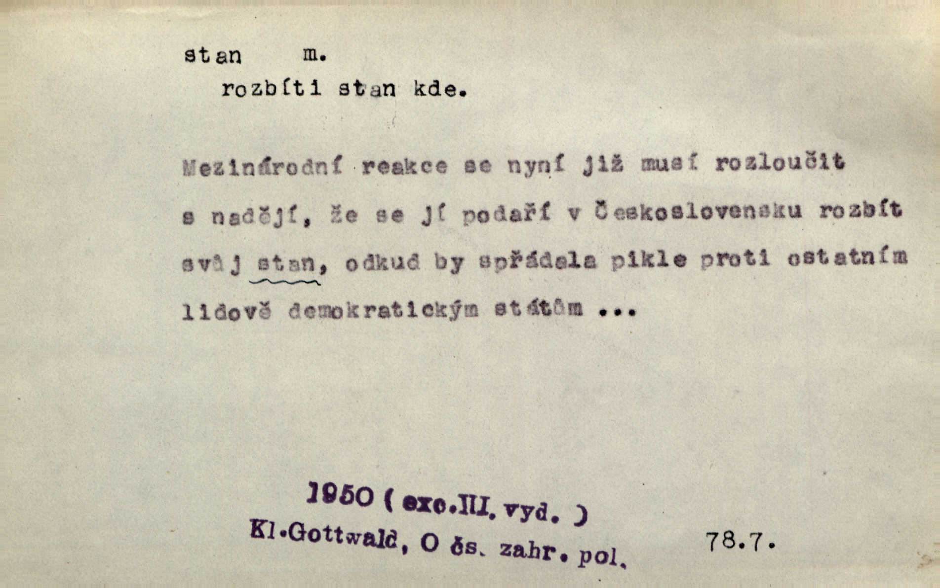 - stan, -u m. skládací přístřeší z nepromokavé látky pro přechodné nocování. Ulehl jsem v polním stanu. Arb. Zřím beduinů stany. Vrch. Přišed v ležení, rovnou cestou kráčel do knížecího stánu. Mácha. Já vychována doma ve stanech a v třesku zbraně, drsnou vedu řeč. Vrch. A bez konce ty voje zdály se, jež kolem města stany rozbily. Zey. Nazejtří v neděli ráno hradby opuštěny, stanové strženi a ležení všecko v požeh dáno. Pal. Schylovalo se k tomu, že strhneme stan svůj a poputujeme dále připravíme se na cestu. Herrm. Ve vsi kaplička čtyřboká, s šindelovým stanem a lucernou střechou v podobě stanu. Kamper-Wirth. Voj. stan na zboží, stan na obvaziště, štábní stan a j. D Zř. pouťový stánek. Plátěných stanů s pernikářským a jiným zbožím veliký tu byl postaven počet. Dou. Šťastným byl jsem teprv před kostelem mezi řadami stanů, kde se prodávaly nejrozmanitější věci. Podl. D Kniž. sídlo, bydliště. Přišel k jedné hoře, na které mocný král země svůj stan měl. Něm. Slabý, křehký, bídný stan jsem ducha jeho [Boha]. Vrch. V duši mé tvůj věčný stán. Heyd. Vyhledal jsem města část, kde bída má svůj stan. Zey. D Zast. stanoviště. Stará naložila jí nůši hrnců, dovedla ji na stan a pověděla jí, jak má s lidmi kupčit. Něm. Lesní muž pod dubem s vysokého stanu škaredě pohlíží v západní stranu. Erb. Ty [ženy] chtěly uskočit, kde bezpečnější stan. Ner. Přen. Strašně dlouhé interregnum [v divadle] neblíží se ještě k svému konci, ba nezasvitá ani odnikud vůdčí hvězdička, jež by nás ze truchlého toho stánu vyvedla. Ner. Loď. zařízení na břehu pro přistání lodí a vorů na kratší čas. D Voj. velitel se štábem u vyšší jednotky v poli. Hlavní stan hlavní velitelství.
