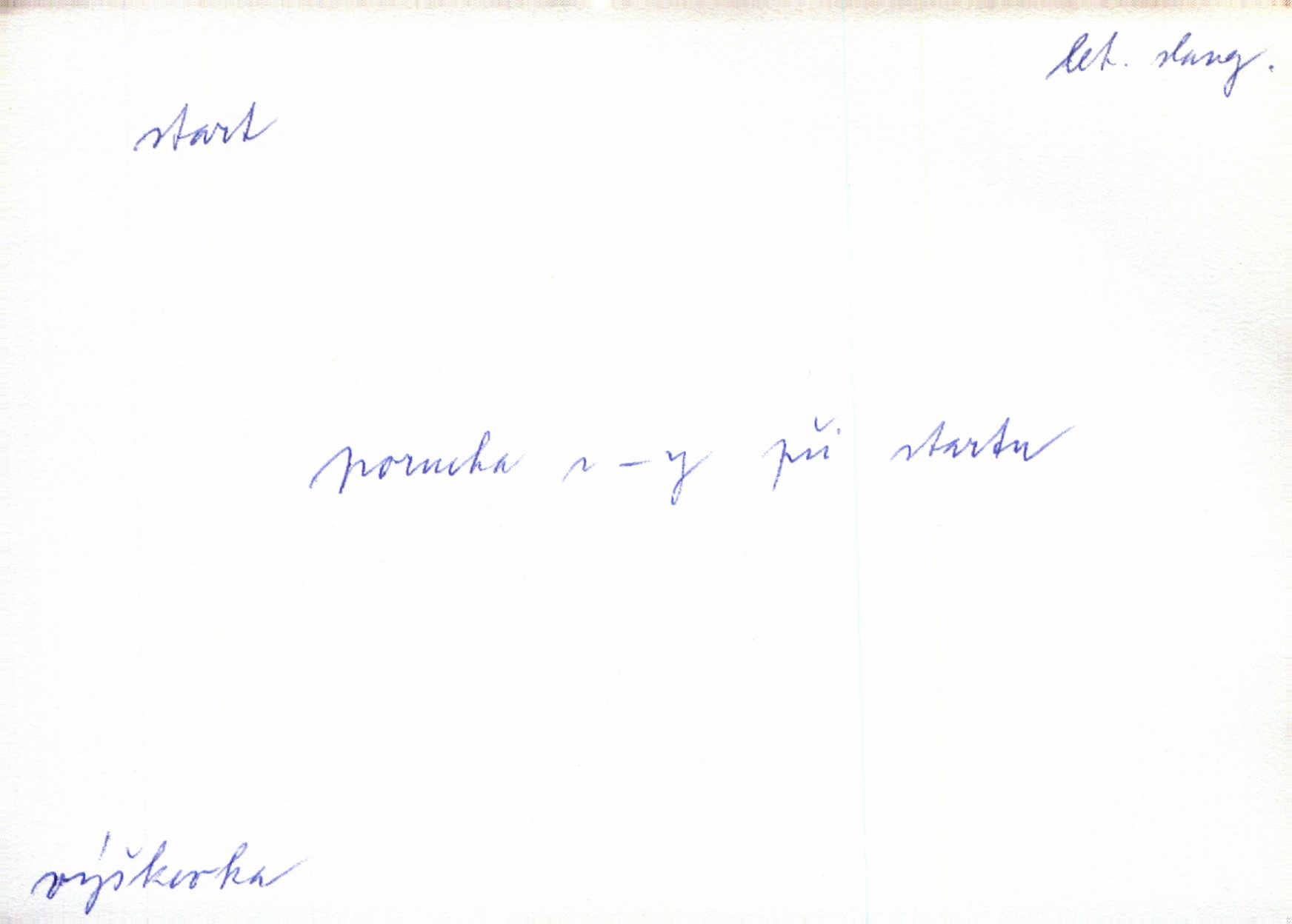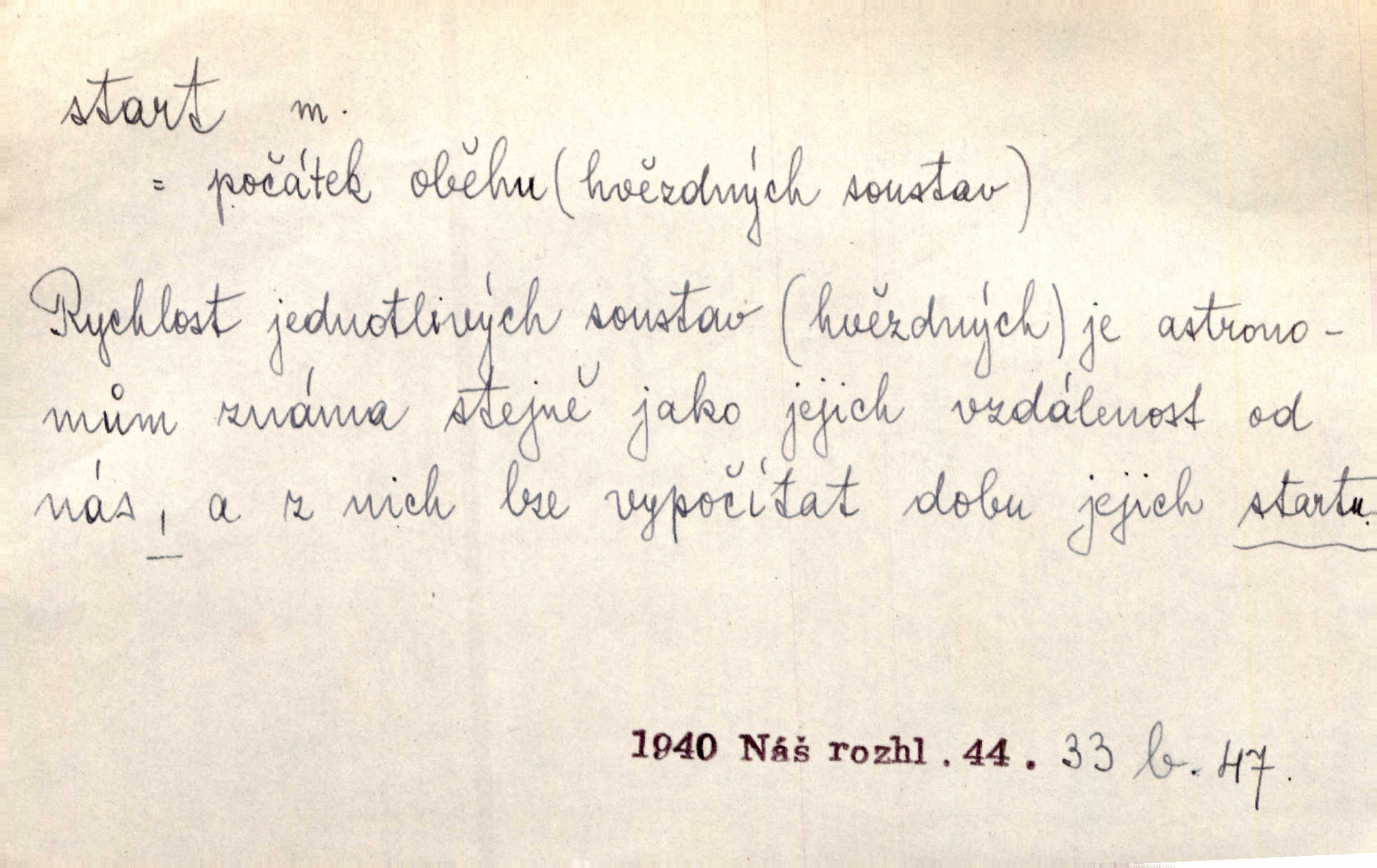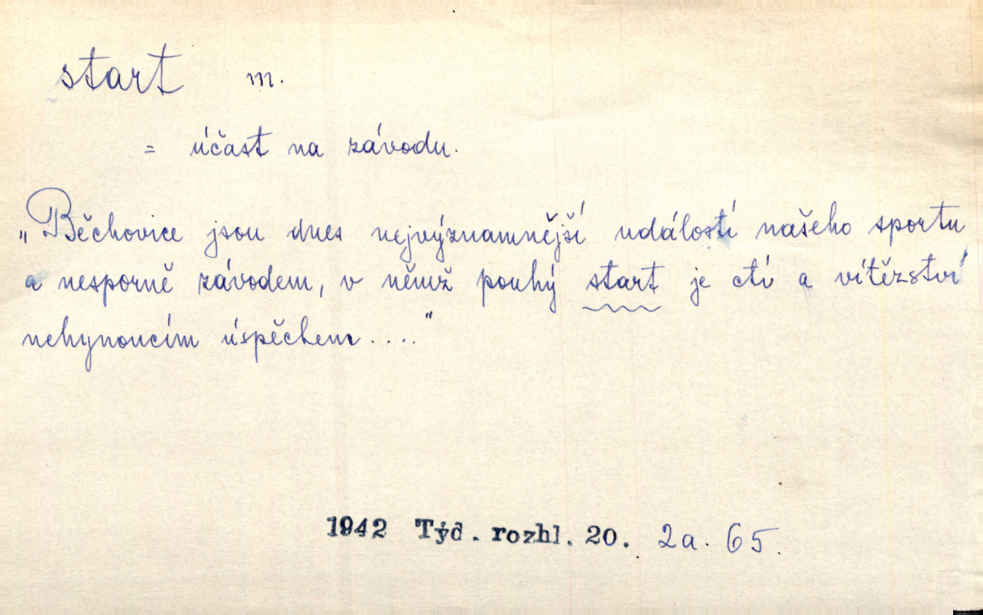 - start, -u m. sport. počáteční výběhová poloha běžce; počátek závodního n. dostihového běhu n. jízdy; místo, s kterého závodníci začínají běh. Let. start letadla rozjezd od okamžiku, kdy se letadlo dá do pohybu, až k vzletu. Přen. [Rozhlas zachytil] zvuk kroků píďalky, bzučení tesaříků, start slunečka k letu a pod. Rozhlas. Měl [hráč] též příliš pomalý start na míč a také mu chyběly odkopy rozběh po míči. Lid. nov. Nový kabinet Hanssenův má v celku hladký start, jenž odpovídá jeho široké parlamentní základně. Lid. nov. Nejmladistvěji se projevoval malíř F. H. Herink, který si odbyl start s nejmladšími již před desítkami let. Čes. sl.