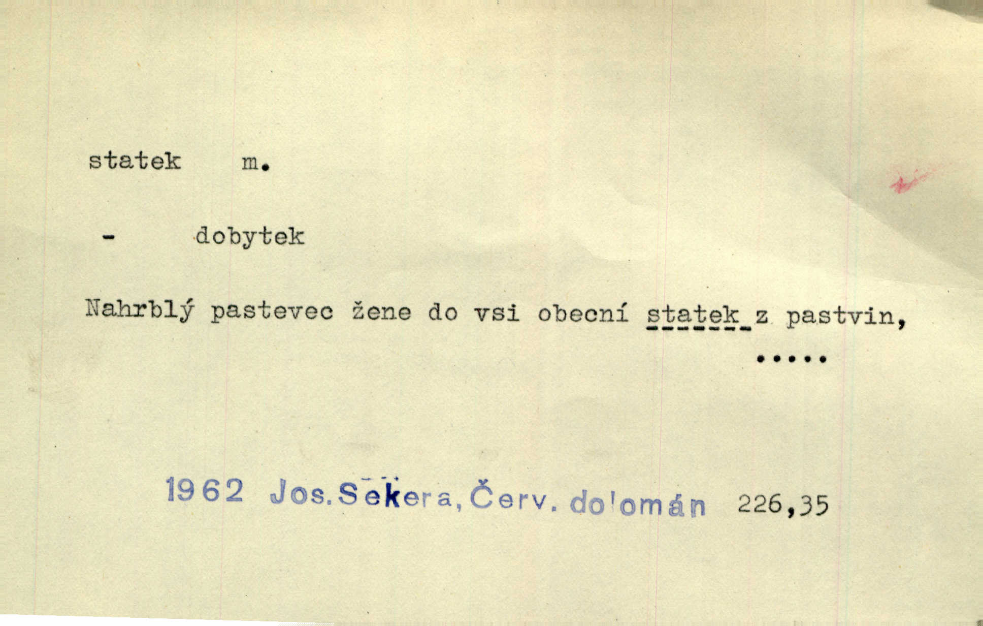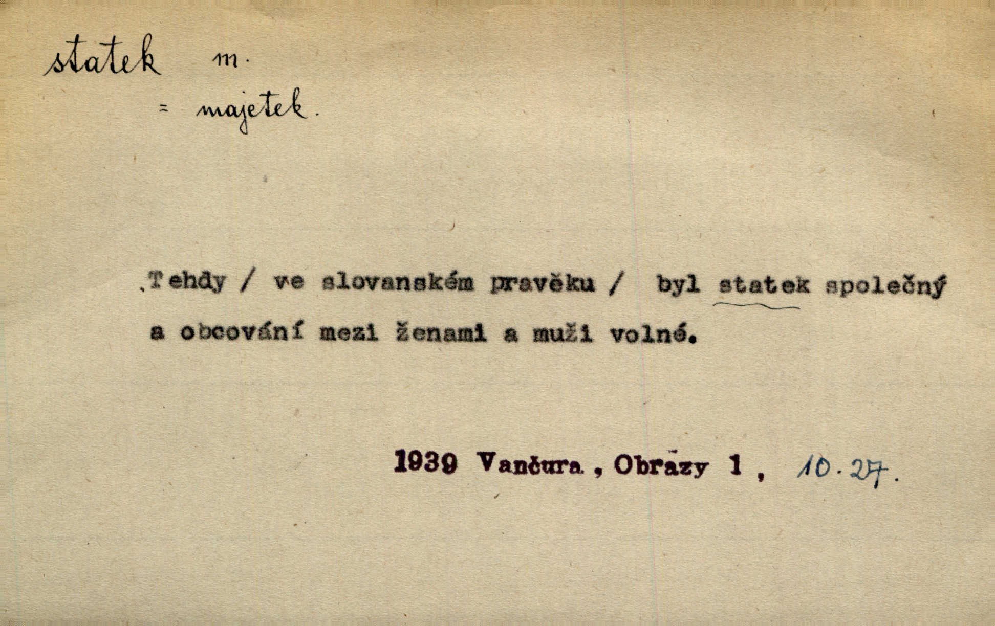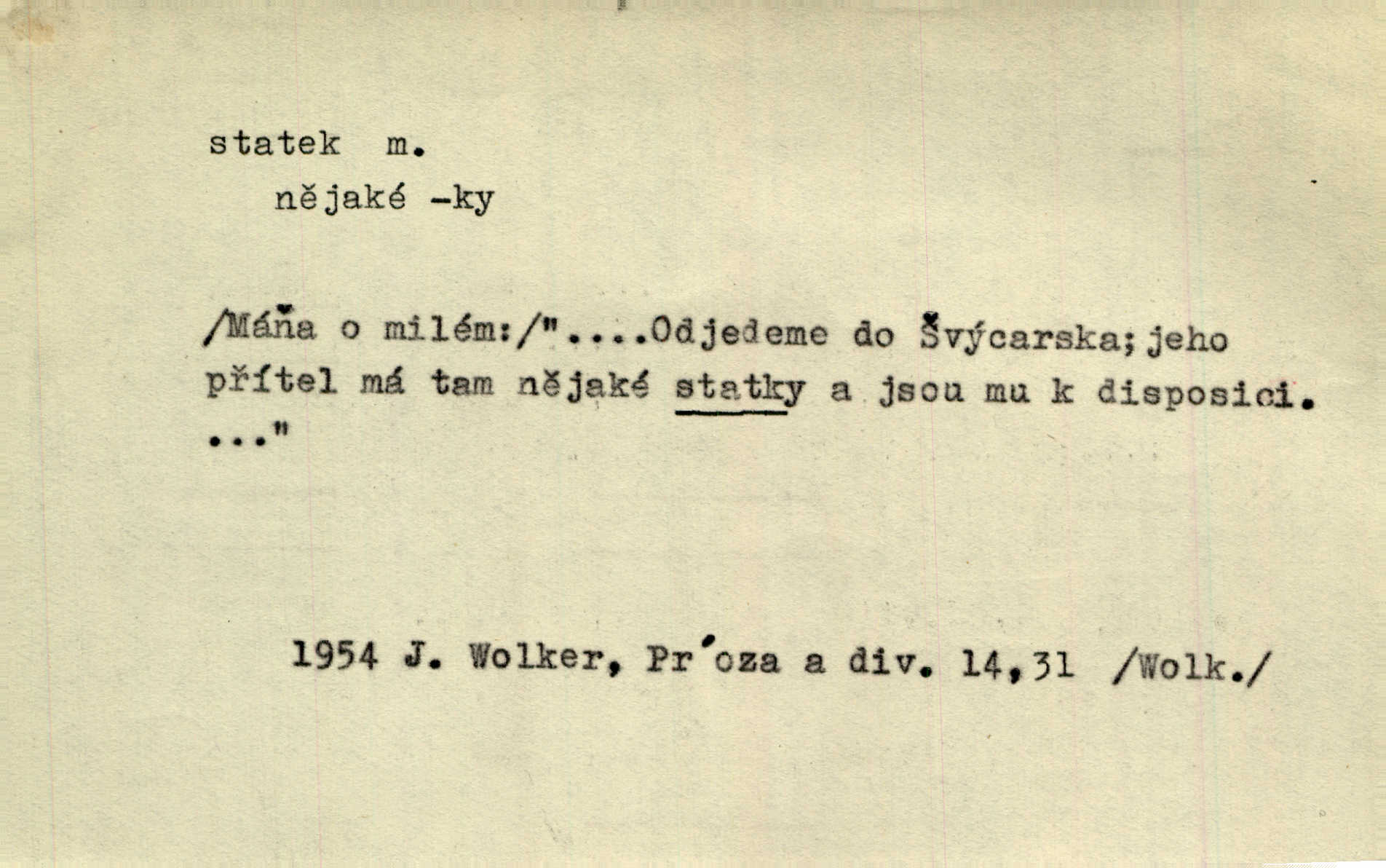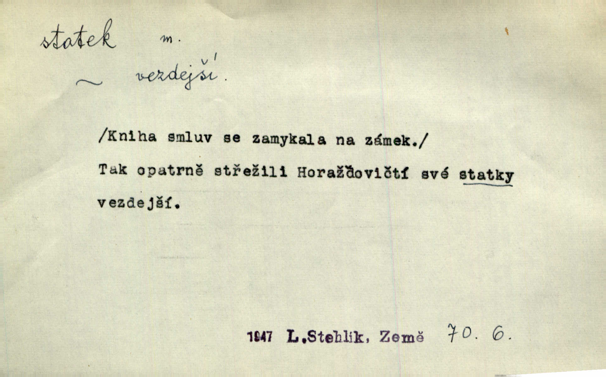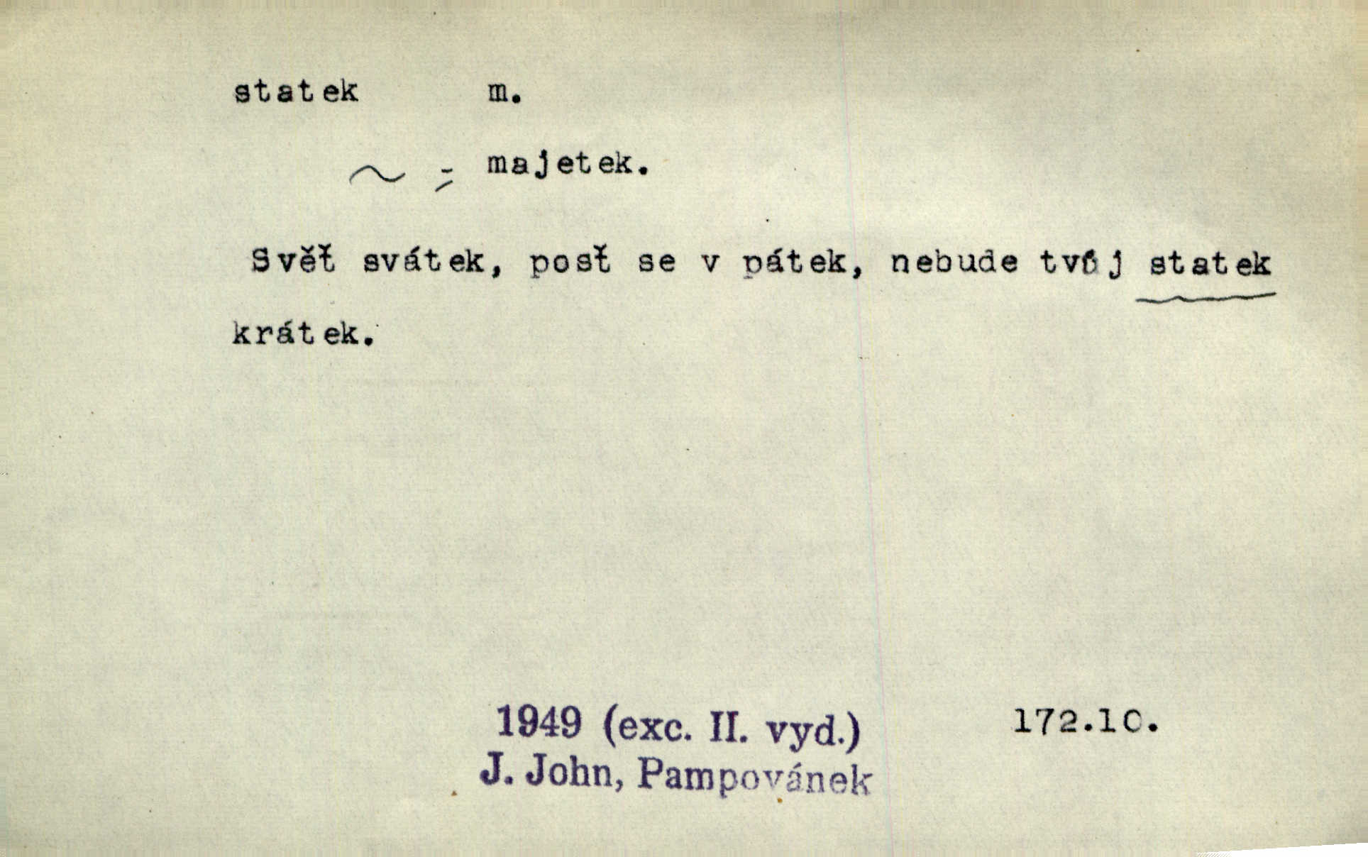 - statek, -tku m. poněk. zast. jmění, majetek (movitý i nemovitý). Od pradávných dob byl Kostelec statkem koruny české. Jan. [Panstvo] zboží vdov a sirotkův za svatý, sobě od boha svěřený statek považuje. Stroup. Zakládá si na statcích Prav. Čapkovi pobráno prý toho dne statku za pět tisíc zlatých. Pal. Do rvanic se pouští a cizí statek si přivlastňuje. Prav. V outerý měli jsme svatbu, včera nám přivezli můj [nevěstin] statek výbavu. Zákr. Dostal jsem za květiny dvě zlatky, to je můj statek. Kosm. Byliť jsme vítězi, a život i statky jsme prohráli. Tyl. Rozjímal o pomíjejícnosti pozemských statků. Dibl. Mnoho statků vezdejších kromě cihličky a jehel neměl. Jir. Byl vždy hotov, odvážiti se za svobodu všeho až do těch hrdel a statků. Lier. Práv., nár. hosp. prostředek, kterým můžeme ukojovati lidské potřeby; statek hmotný, veřejný a j. D větší selská usedlost, větší hospodářství; selské stavení; (obyč. pl.) statky pozemkový majetek velké rozlohy. Zemanův „grunt“ byl tak zpola dvorec a zpola statek. Třeb. Bývalý zdejší pomocník přiženil se do selského statku. Tyl. Moje maminka byla ze statku. R. Svob. Oliva seděl dvorem na jednom z nejlepších statkův. Šmil. [U Trenčína] měl bratrovce na rodinném, zemanském statku. Jir. Vedle našeho statku bydlela vdova Novotná, v malé chaloupce. Něm. Ode dneška jsi paní mého statku Liběnic. Tyl. Svlekl vojenskou uniformu a zajel na své statky. Jir. po rozsáhlých statcích Opočenských a Smiřických vytloukli [prušáci] každý kout. Ehrenb. Leží tam i jeho rodové statky Benešov a Kamenice nad Lipou. Šus. Hosp. usedlost, hospodářství ve výměře asi 5—20 ha. Veř. spr. školní statek. D statky, -tků pl. (duševní, kulturní a p.) hodnoty. Boje národův za statky duševní (svobodu a volnosť u vývinu národním) jsou zde pojmuty co souvislý celek. Špind. Jediný G. Pfleger Moravský patří z těchto tehdy módních spisovatelů, kteří většinou přežili svůj význam, k živým statkům literárním. Arne N. V politice vizme jejich [Angličanů] snahu, důsledně a přirozeně domáhati se politických statkův. Durd. Ženské vnady a panská přízeň jsou statky nestálé. Olb. D statek, -tku dial. dobytek. Těžko mne Pánbůh navštěvuje — statek mi béře. Preis. To pastýř žene statek domů! Mah. Všechen domácí statek žral mu z ruky. Herb.