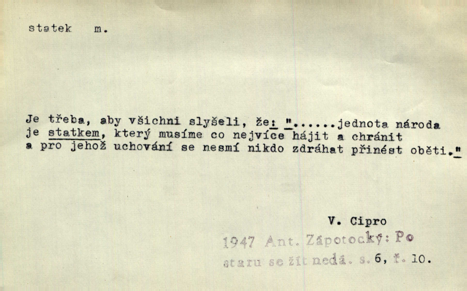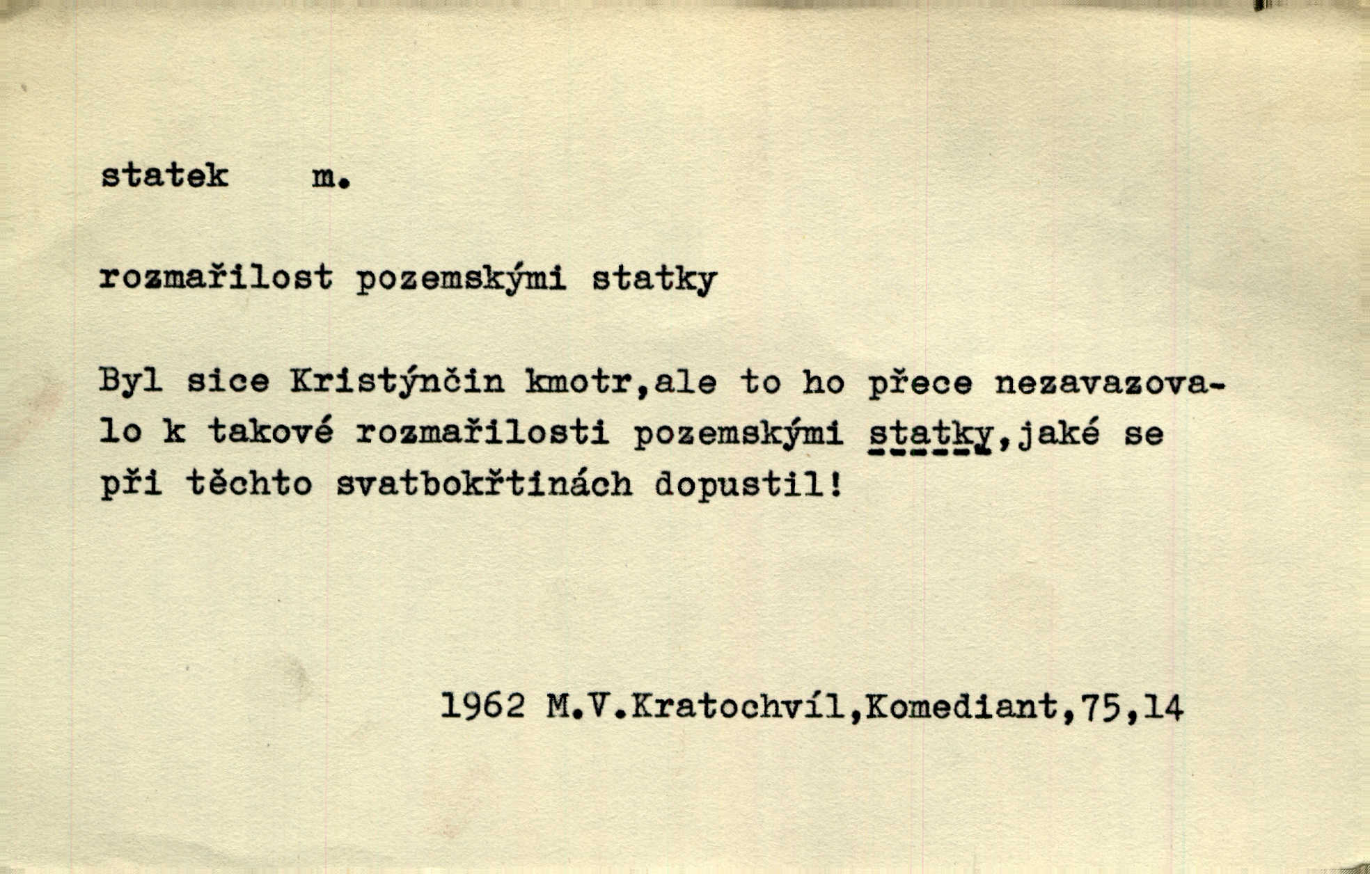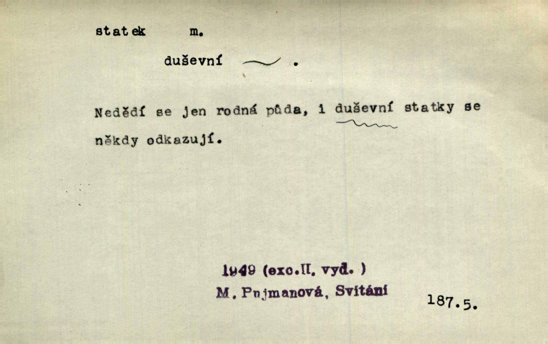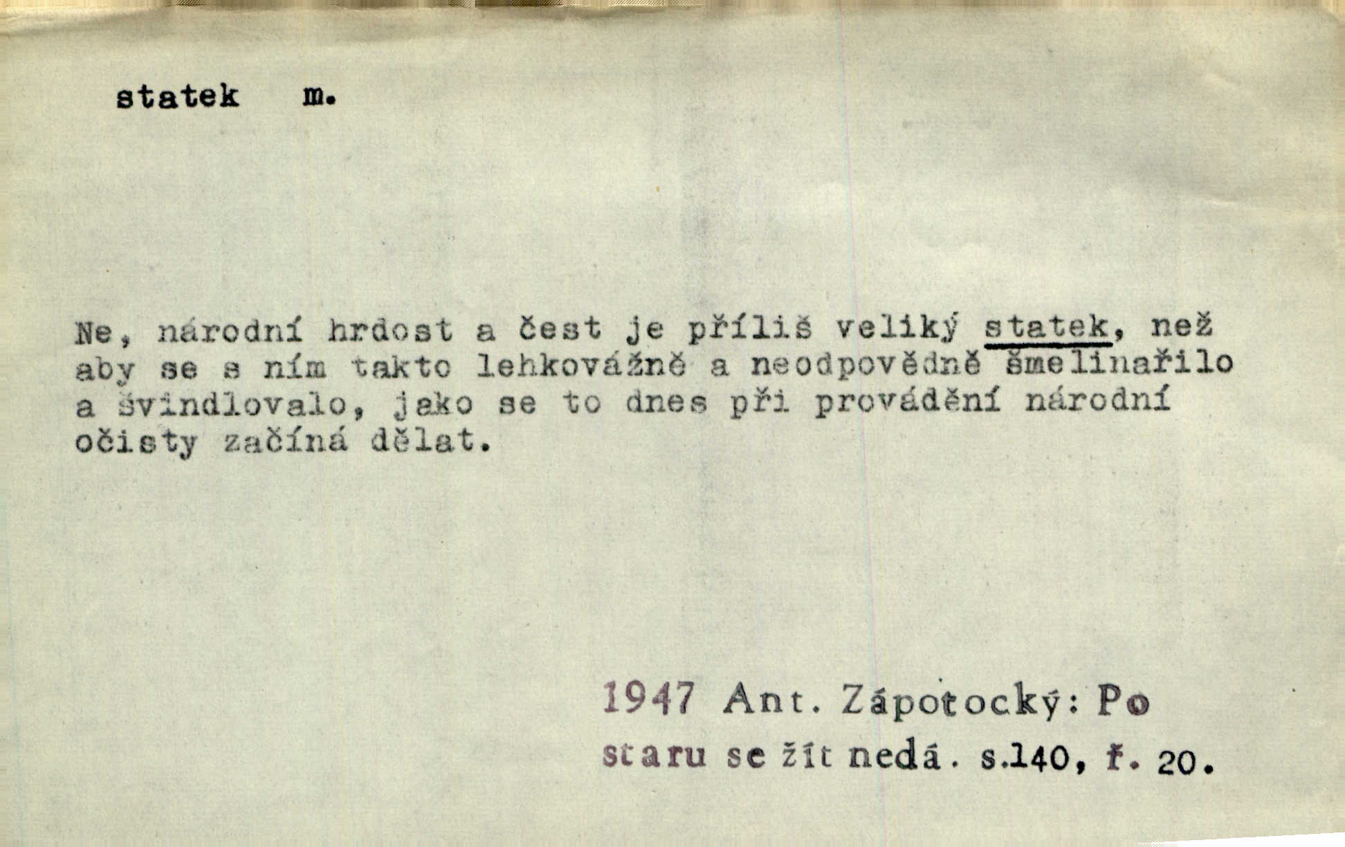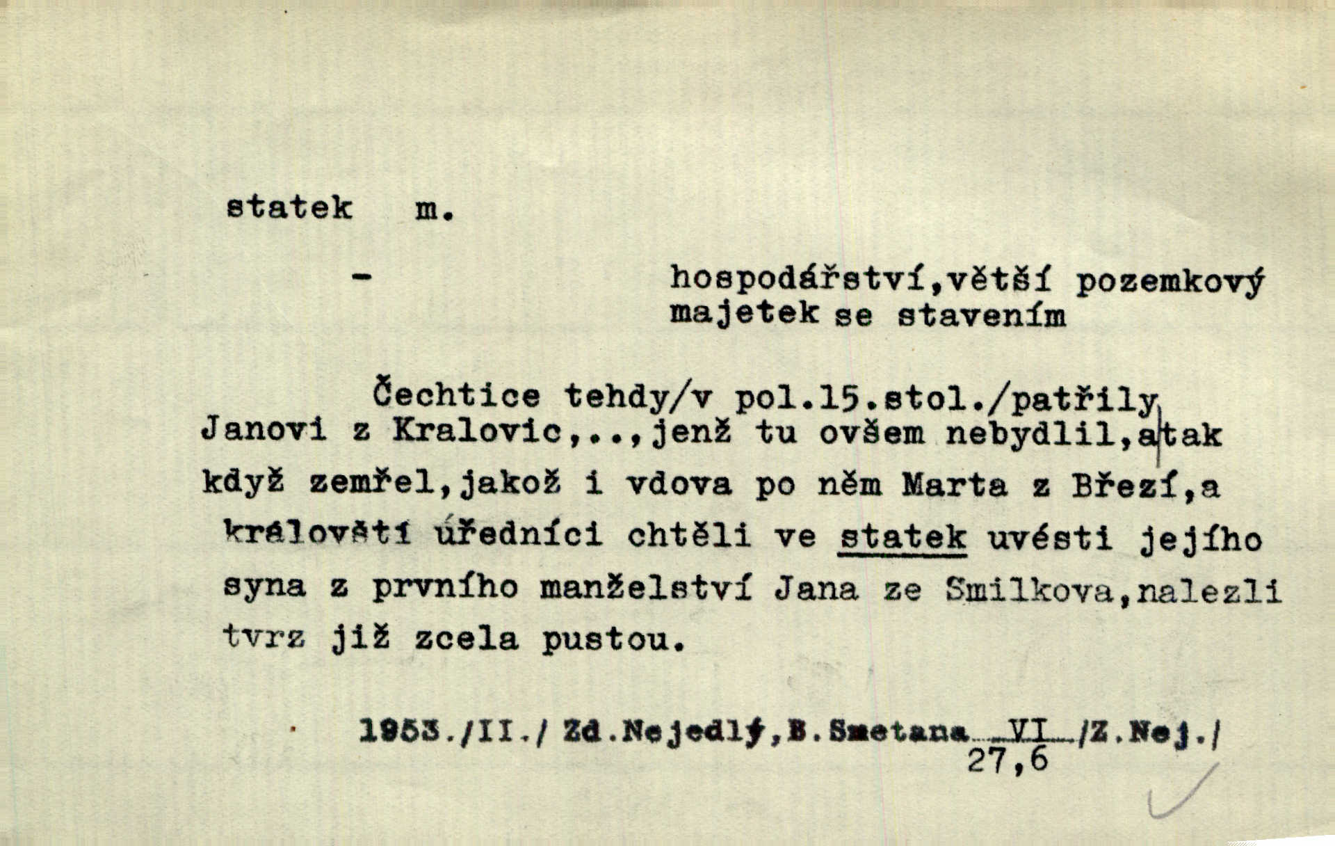 - statek, -tku m. poněk. zast. jmění, majetek (movitý i nemovitý). Od pradávných dob byl Kostelec statkem koruny české. Jan. [Panstvo] zboží vdov a sirotkův za svatý, sobě od boha svěřený statek považuje. Stroup. Zakládá si na statcích Prav. Čapkovi pobráno prý toho dne statku za pět tisíc zlatých. Pal. Do rvanic se pouští a cizí statek si přivlastňuje. Prav. V outerý měli jsme svatbu, včera nám přivezli můj [nevěstin] statek výbavu. Zákr. Dostal jsem za květiny dvě zlatky, to je můj statek. Kosm. Byliť jsme vítězi, a život i statky jsme prohráli. Tyl. Rozjímal o pomíjejícnosti pozemských statků. Dibl. Mnoho statků vezdejších kromě cihličky a jehel neměl. Jir. Byl vždy hotov, odvážiti se za svobodu všeho až do těch hrdel a statků. Lier. Práv., nár. hosp. prostředek, kterým můžeme ukojovati lidské potřeby; statek hmotný, veřejný a j. D větší selská usedlost, větší hospodářství; selské stavení; (obyč. pl.) statky pozemkový majetek velké rozlohy. Zemanův „grunt“ byl tak zpola dvorec a zpola statek. Třeb. Bývalý zdejší pomocník přiženil se do selského statku. Tyl. Moje maminka byla ze statku. R. Svob. Oliva seděl dvorem na jednom z nejlepších statkův. Šmil. [U Trenčína] měl bratrovce na rodinném, zemanském statku. Jir. Vedle našeho statku bydlela vdova Novotná, v malé chaloupce. Něm. Ode dneška jsi paní mého statku Liběnic. Tyl. Svlekl vojenskou uniformu a zajel na své statky. Jir. po rozsáhlých statcích Opočenských a Smiřických vytloukli [prušáci] každý kout. Ehrenb. Leží tam i jeho rodové statky Benešov a Kamenice nad Lipou. Šus. Hosp. usedlost, hospodářství ve výměře asi 5—20 ha. Veř. spr. školní statek. D statky, -tků pl. (duševní, kulturní a p.) hodnoty. Boje národův za statky duševní (svobodu a volnosť u vývinu národním) jsou zde pojmuty co souvislý celek. Špind. Jediný G. Pfleger Moravský patří z těchto tehdy módních spisovatelů, kteří většinou přežili svůj význam, k živým statkům literárním. Arne N. V politice vizme jejich [Angličanů] snahu, důsledně a přirozeně domáhati se politických statkův. Durd. Ženské vnady a panská přízeň jsou statky nestálé. Olb. D statek, -tku dial. dobytek. Těžko mne Pánbůh navštěvuje — statek mi béře. Preis. To pastýř žene statek domů! Mah. Všechen domácí statek žral mu z ruky. Herb.