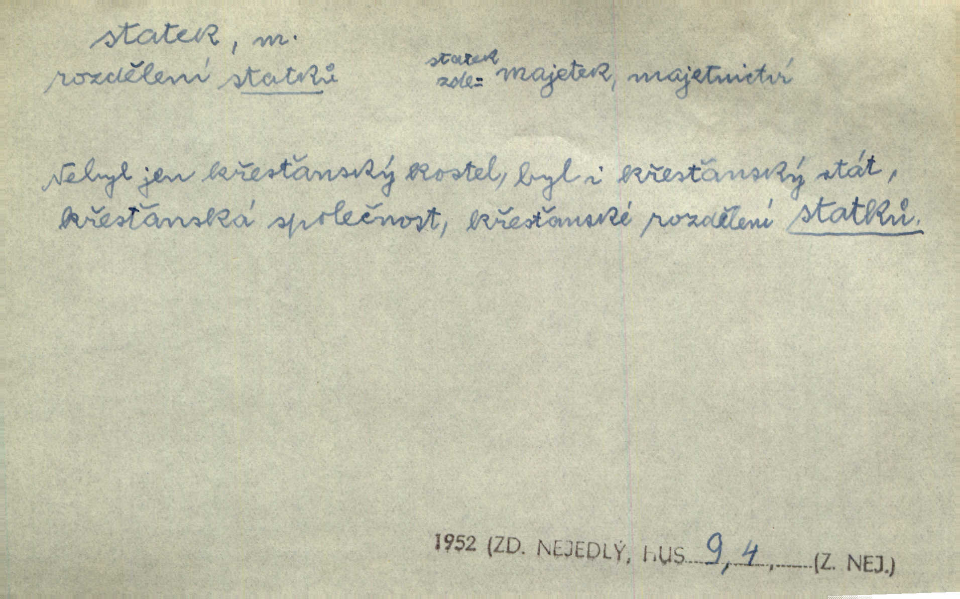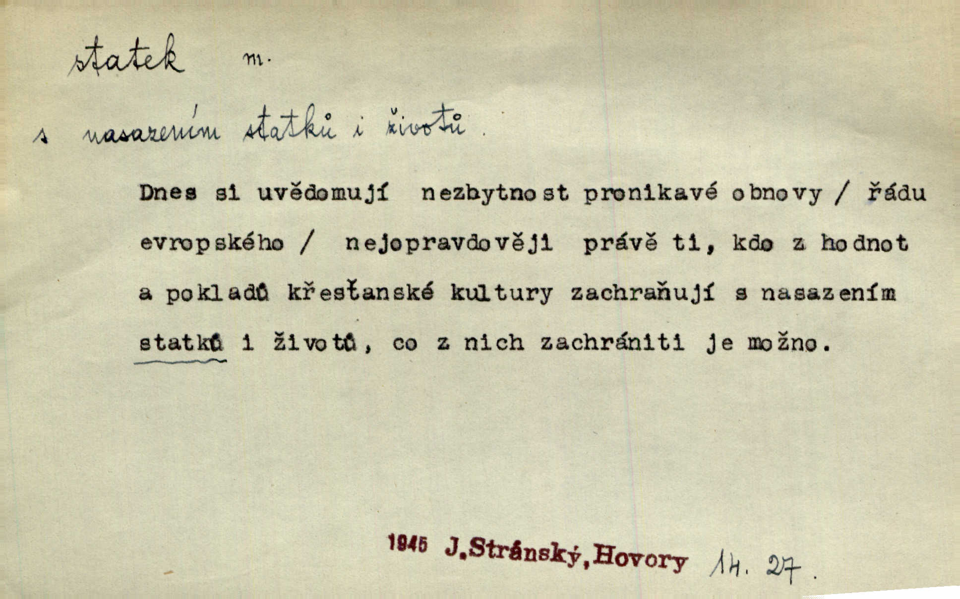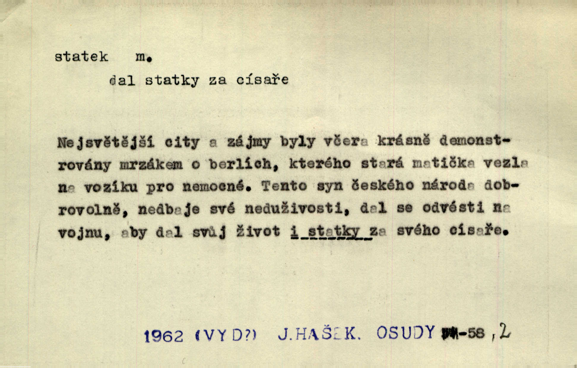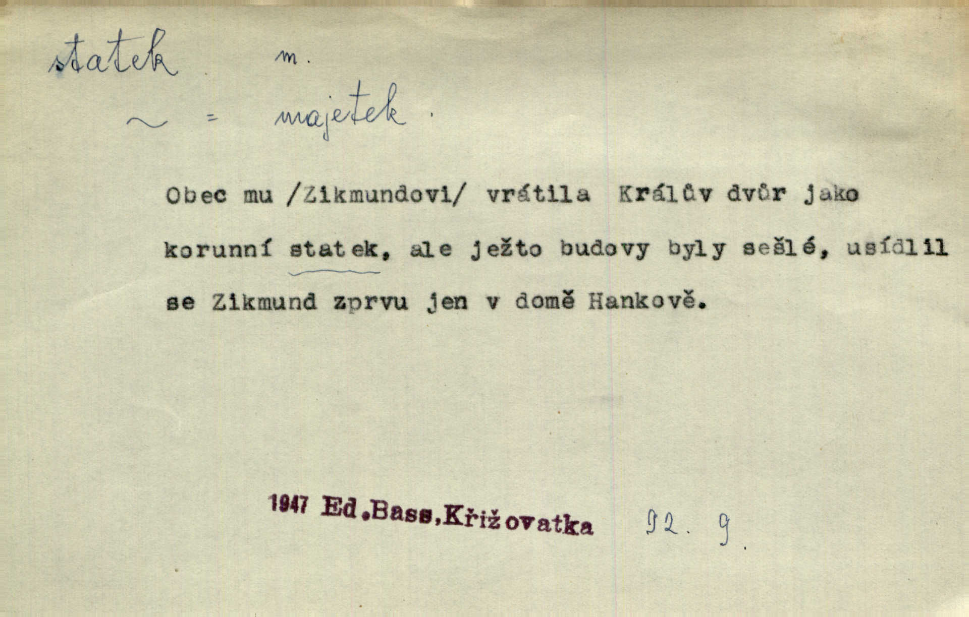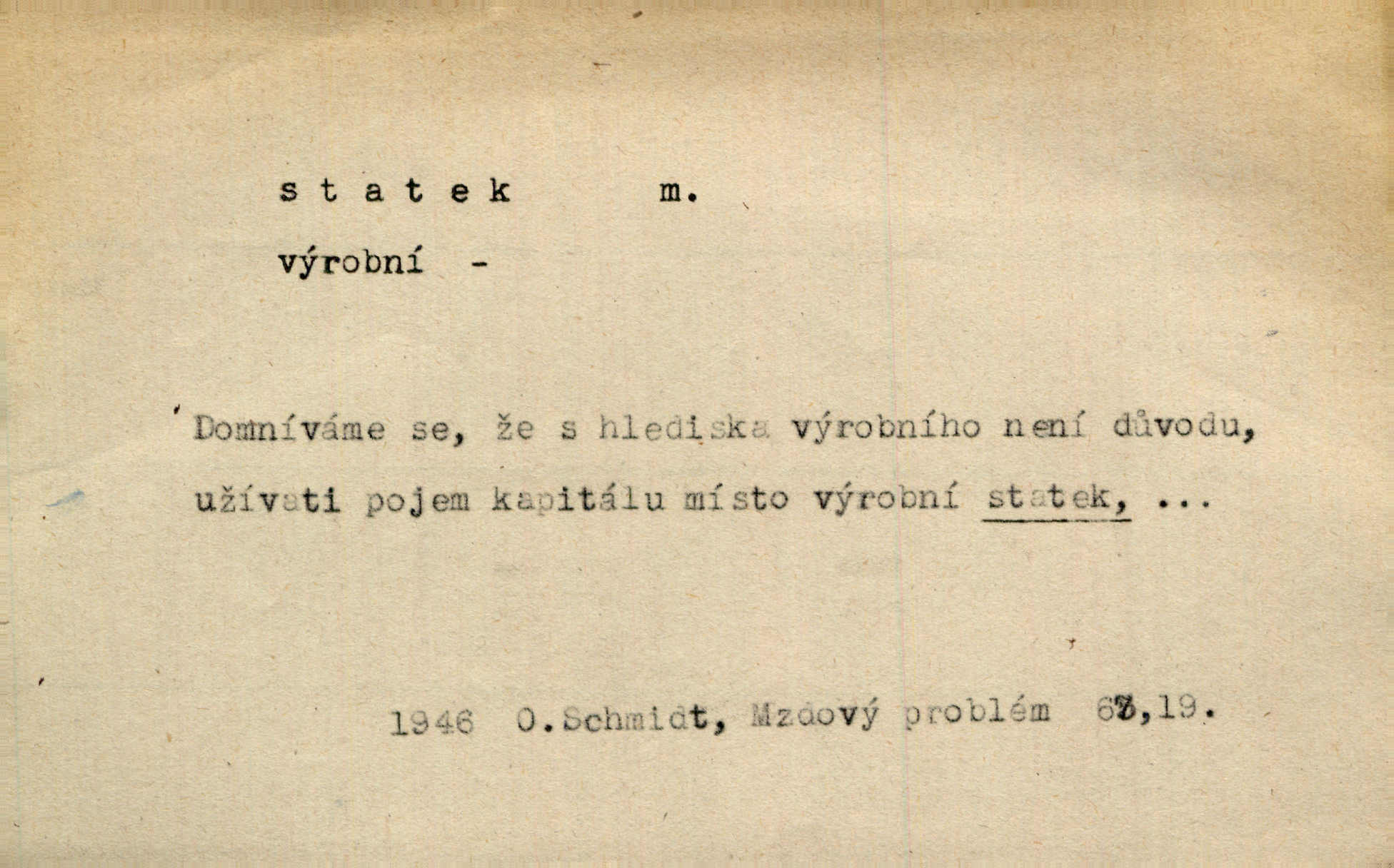 - statek, -tku m. poněk. zast. jmění, majetek (movitý i nemovitý). Od pradávných dob byl Kostelec statkem koruny české. Jan. [Panstvo] zboží vdov a sirotkův za svatý, sobě od boha svěřený statek považuje. Stroup. Zakládá si na statcích Prav. Čapkovi pobráno prý toho dne statku za pět tisíc zlatých. Pal. Do rvanic se pouští a cizí statek si přivlastňuje. Prav. V outerý měli jsme svatbu, včera nám přivezli můj [nevěstin] statek výbavu. Zákr. Dostal jsem za květiny dvě zlatky, to je můj statek. Kosm. Byliť jsme vítězi, a život i statky jsme prohráli. Tyl. Rozjímal o pomíjejícnosti pozemských statků. Dibl. Mnoho statků vezdejších kromě cihličky a jehel neměl. Jir. Byl vždy hotov, odvážiti se za svobodu všeho až do těch hrdel a statků. Lier. Práv., nár. hosp. prostředek, kterým můžeme ukojovati lidské potřeby; statek hmotný, veřejný a j. D větší selská usedlost, větší hospodářství; selské stavení; (obyč. pl.) statky pozemkový majetek velké rozlohy. Zemanův „grunt“ byl tak zpola dvorec a zpola statek. Třeb. Bývalý zdejší pomocník přiženil se do selského statku. Tyl. Moje maminka byla ze statku. R. Svob. Oliva seděl dvorem na jednom z nejlepších statkův. Šmil. [U Trenčína] měl bratrovce na rodinném, zemanském statku. Jir. Vedle našeho statku bydlela vdova Novotná, v malé chaloupce. Něm. Ode dneška jsi paní mého statku Liběnic. Tyl. Svlekl vojenskou uniformu a zajel na své statky. Jir. po rozsáhlých statcích Opočenských a Smiřických vytloukli [prušáci] každý kout. Ehrenb. Leží tam i jeho rodové statky Benešov a Kamenice nad Lipou. Šus. Hosp. usedlost, hospodářství ve výměře asi 5—20 ha. Veř. spr. školní statek. D statky, -tků pl. (duševní, kulturní a p.) hodnoty. Boje národův za statky duševní (svobodu a volnosť u vývinu národním) jsou zde pojmuty co souvislý celek. Špind. Jediný G. Pfleger Moravský patří z těchto tehdy módních spisovatelů, kteří většinou přežili svůj význam, k živým statkům literárním. Arne N. V politice vizme jejich [Angličanů] snahu, důsledně a přirozeně domáhati se politických statkův. Durd. Ženské vnady a panská přízeň jsou statky nestálé. Olb. D statek, -tku dial. dobytek. Těžko mne Pánbůh navštěvuje — statek mi béře. Preis. To pastýř žene statek domů! Mah. Všechen domácí statek žral mu z ruky. Herb.