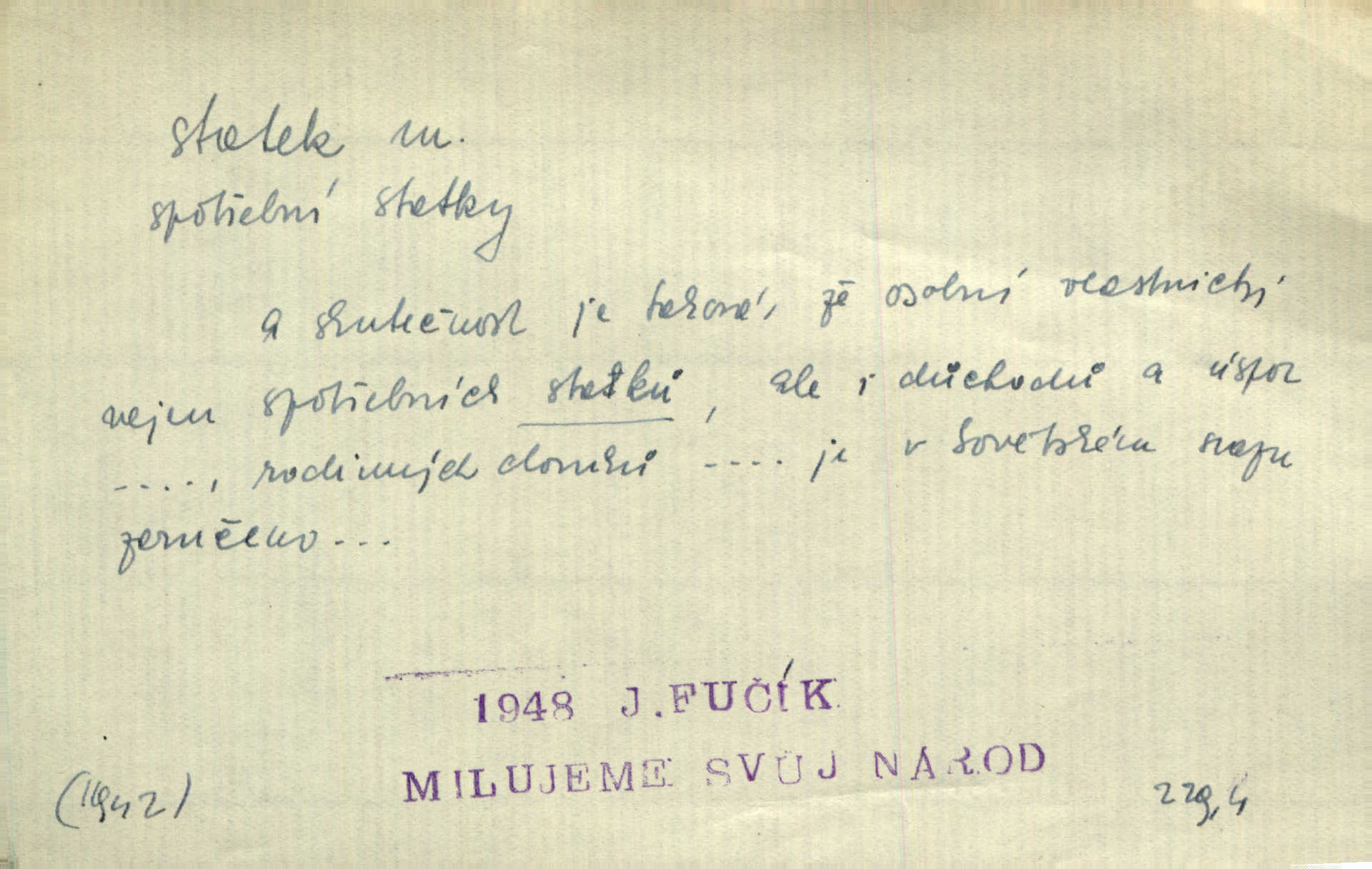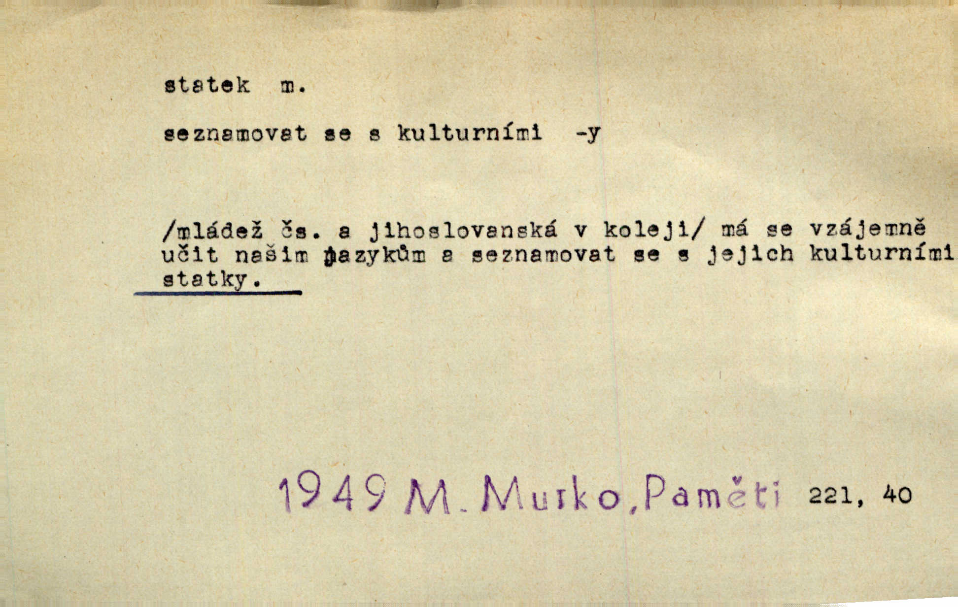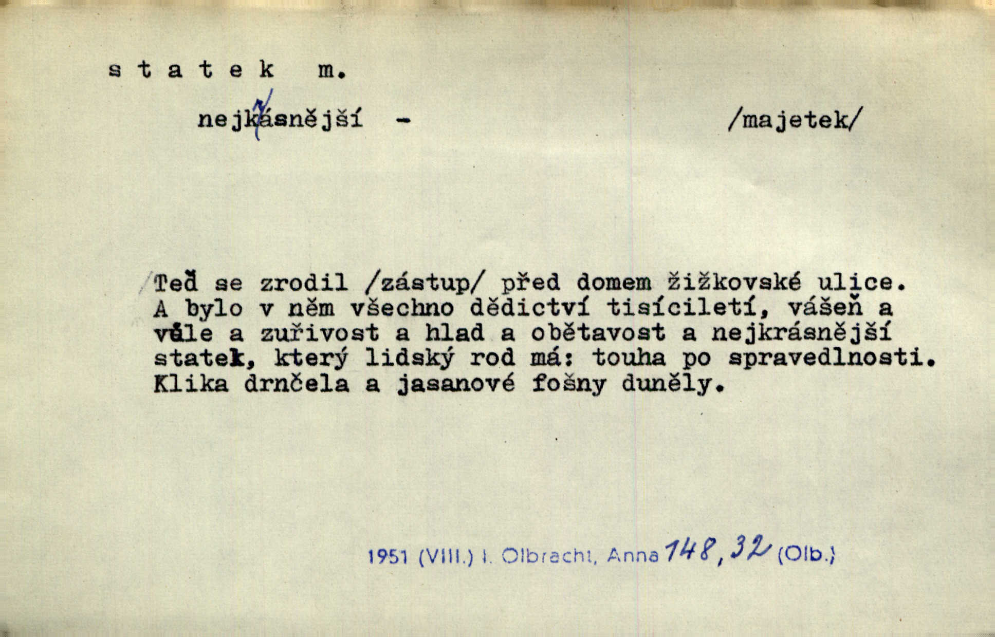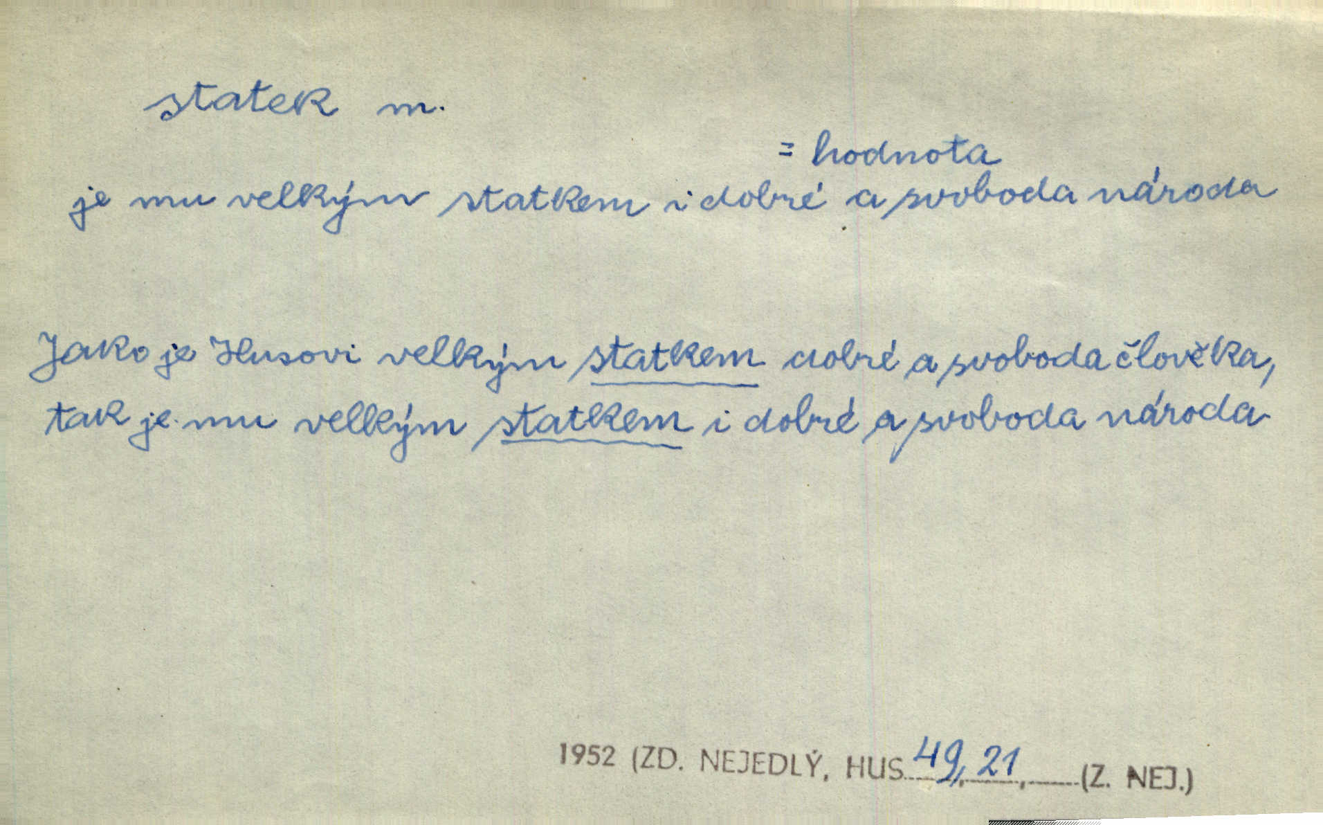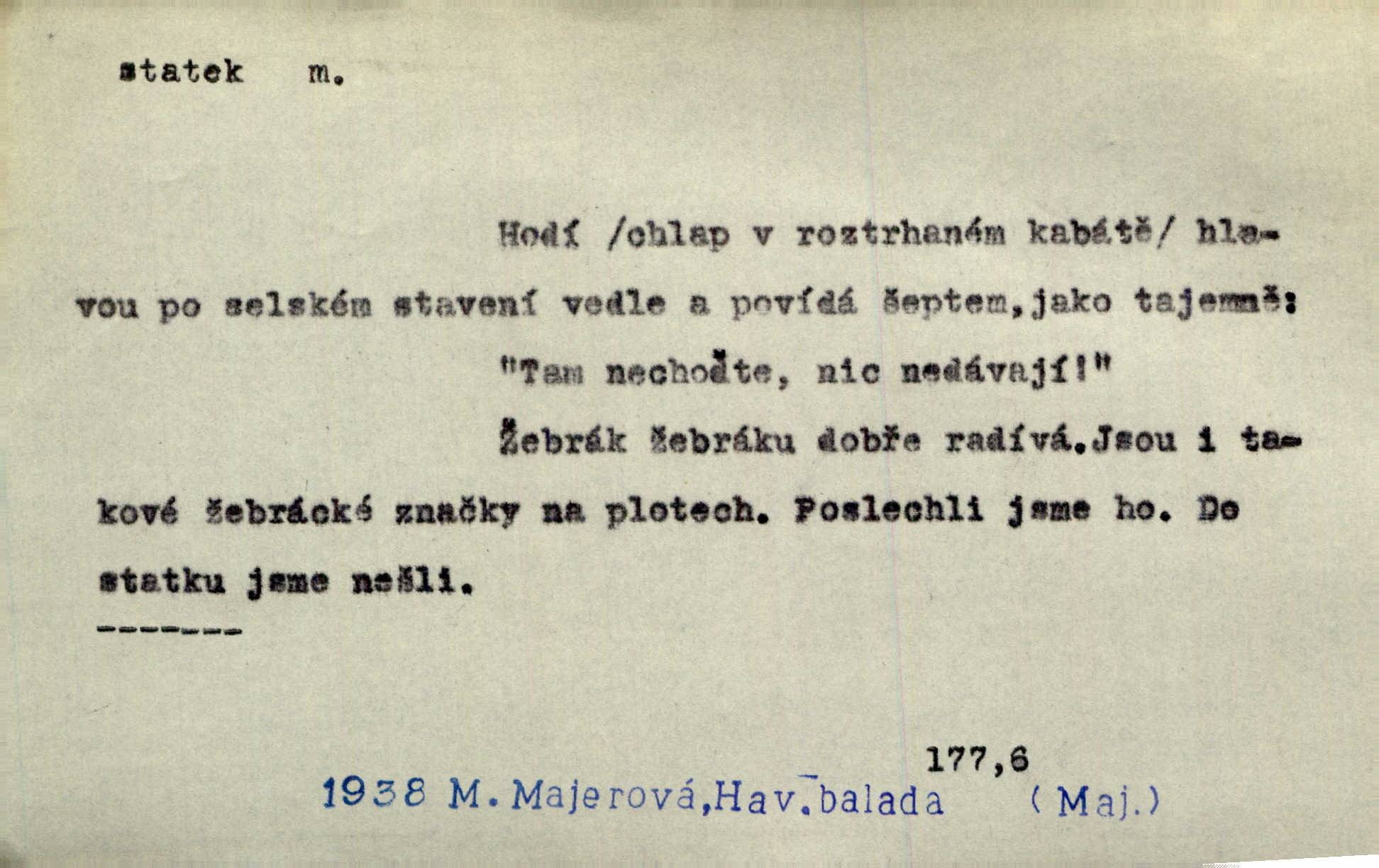 - statek, -tku m. poněk. zast. jmění, majetek (movitý i nemovitý). Od pradávných dob byl Kostelec statkem koruny české. Jan. [Panstvo] zboží vdov a sirotkův za svatý, sobě od boha svěřený statek považuje. Stroup. Zakládá si na statcích Prav. Čapkovi pobráno prý toho dne statku za pět tisíc zlatých. Pal. Do rvanic se pouští a cizí statek si přivlastňuje. Prav. V outerý měli jsme svatbu, včera nám přivezli můj [nevěstin] statek výbavu. Zákr. Dostal jsem za květiny dvě zlatky, to je můj statek. Kosm. Byliť jsme vítězi, a život i statky jsme prohráli. Tyl. Rozjímal o pomíjejícnosti pozemských statků. Dibl. Mnoho statků vezdejších kromě cihličky a jehel neměl. Jir. Byl vždy hotov, odvážiti se za svobodu všeho až do těch hrdel a statků. Lier. Práv., nár. hosp. prostředek, kterým můžeme ukojovati lidské potřeby; statek hmotný, veřejný a j. D větší selská usedlost, větší hospodářství; selské stavení; (obyč. pl.) statky pozemkový majetek velké rozlohy. Zemanův „grunt“ byl tak zpola dvorec a zpola statek. Třeb. Bývalý zdejší pomocník přiženil se do selského statku. Tyl. Moje maminka byla ze statku. R. Svob. Oliva seděl dvorem na jednom z nejlepších statkův. Šmil. [U Trenčína] měl bratrovce na rodinném, zemanském statku. Jir. Vedle našeho statku bydlela vdova Novotná, v malé chaloupce. Něm. Ode dneška jsi paní mého statku Liběnic. Tyl. Svlekl vojenskou uniformu a zajel na své statky. Jir. po rozsáhlých statcích Opočenských a Smiřických vytloukli [prušáci] každý kout. Ehrenb. Leží tam i jeho rodové statky Benešov a Kamenice nad Lipou. Šus. Hosp. usedlost, hospodářství ve výměře asi 5—20 ha. Veř. spr. školní statek. D statky, -tků pl. (duševní, kulturní a p.) hodnoty. Boje národův za statky duševní (svobodu a volnosť u vývinu národním) jsou zde pojmuty co souvislý celek. Špind. Jediný G. Pfleger Moravský patří z těchto tehdy módních spisovatelů, kteří většinou přežili svůj význam, k živým statkům literárním. Arne N. V politice vizme jejich [Angličanů] snahu, důsledně a přirozeně domáhati se politických statkův. Durd. Ženské vnady a panská přízeň jsou statky nestálé. Olb. D statek, -tku dial. dobytek. Těžko mne Pánbůh navštěvuje — statek mi béře. Preis. To pastýř žene statek domů! Mah. Všechen domácí statek žral mu z ruky. Herb.