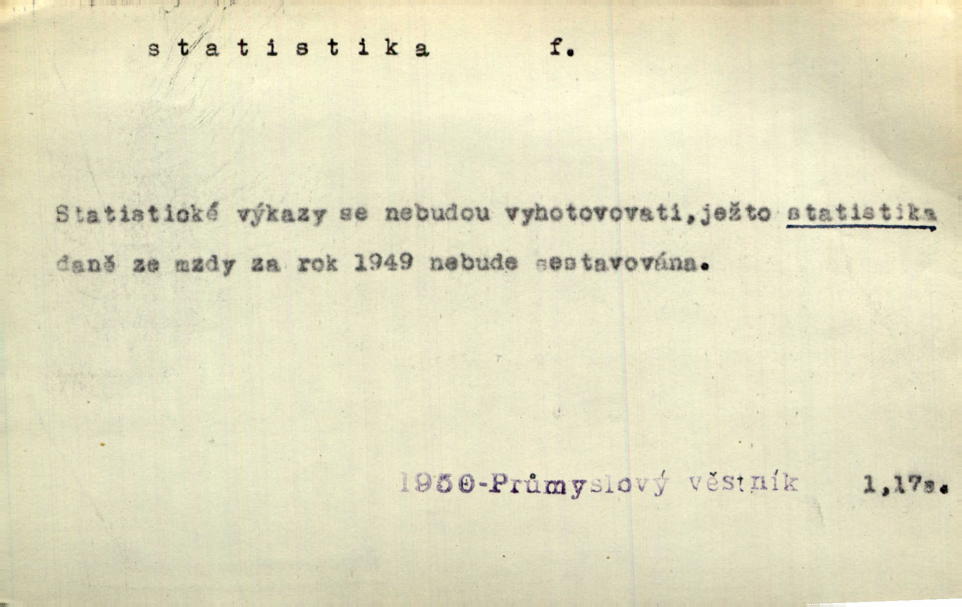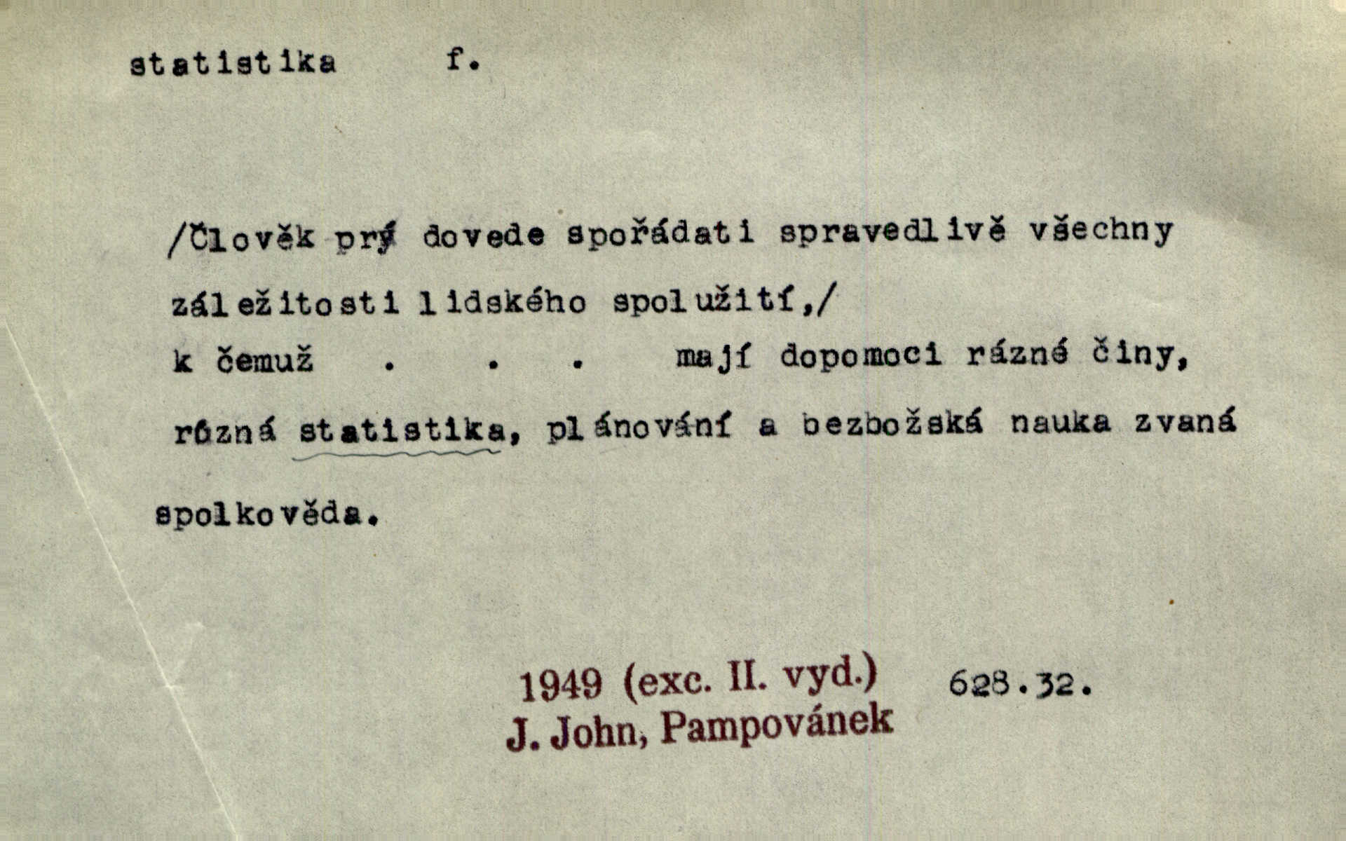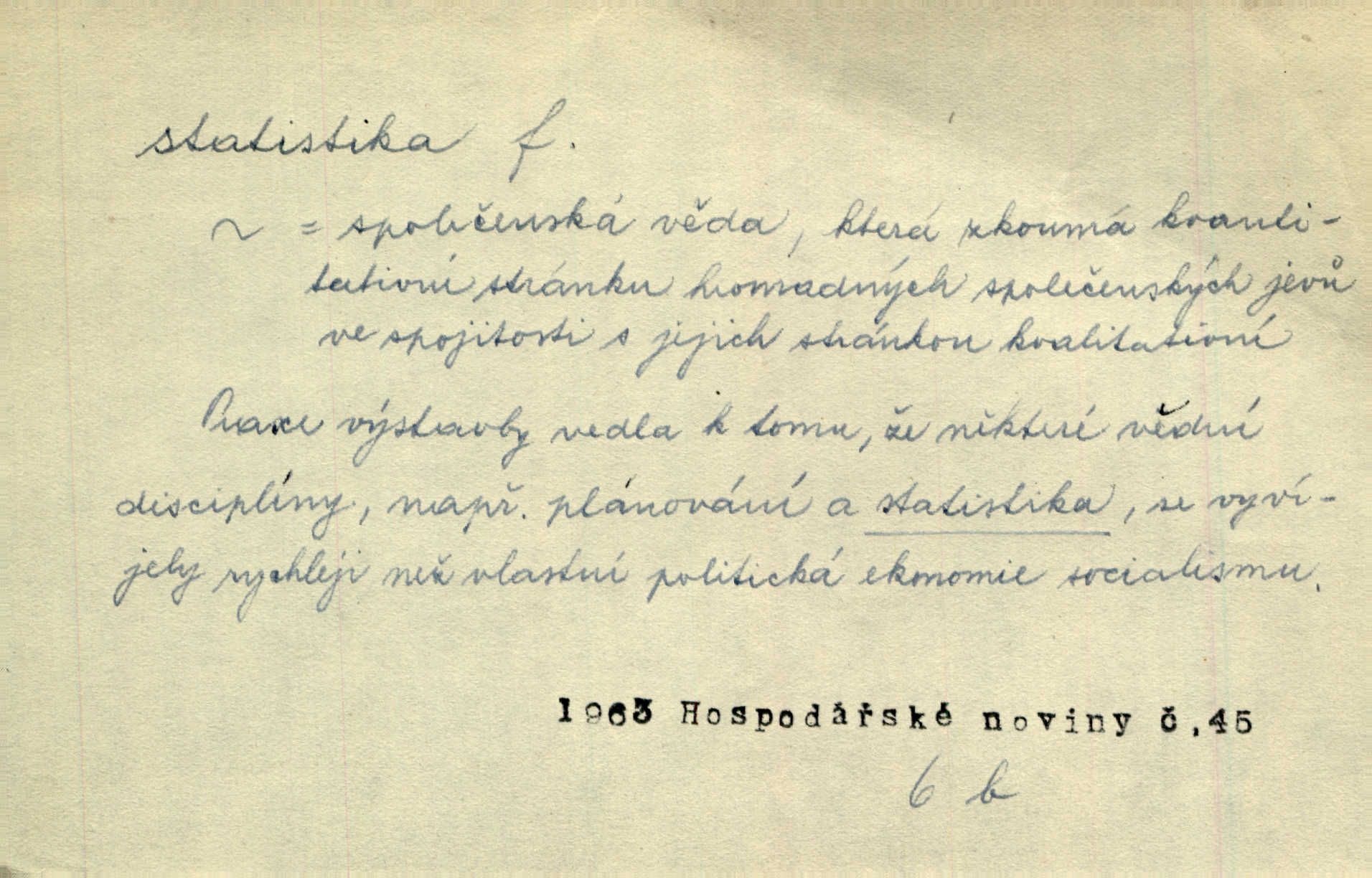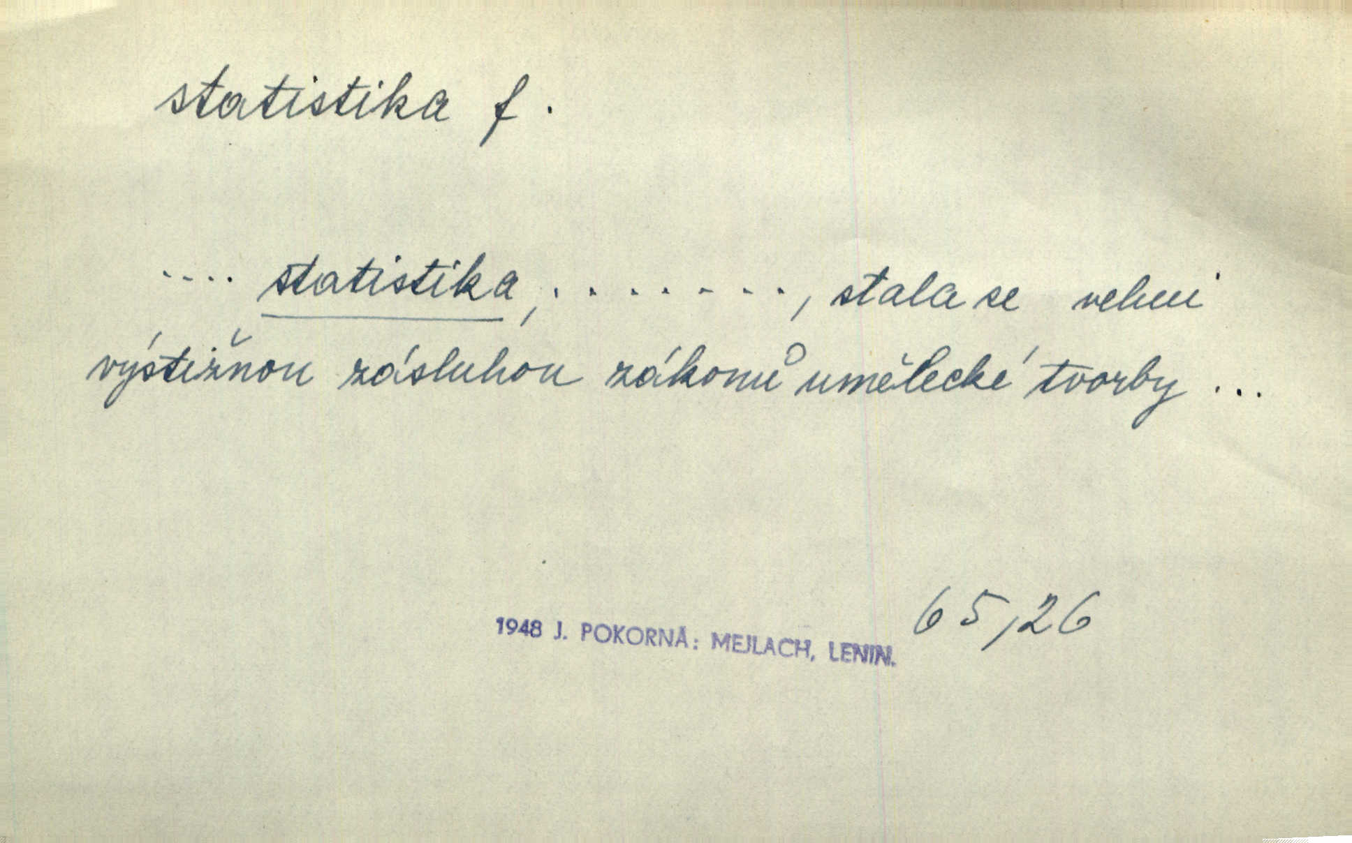 - statistika, -y f. číselné zaznamenání a zkoumání souhrnných, hromadných jevů; věda zjišťující číselně soustavným pozorováním hospodářské, sociální a j. jevy ve státě a společnosti; zkoumající jejich příčiny a stanovící důsledky. Provedl jsem jednou statistiku v řadě úřadů a institucí. Mach. Napadlo mu číslo to ze statistiky, která tvrdí, že na jednoho otce připadají čtyři potomci. Staš. Všecky ty statistiky o čtení u dětí, o oblibách, sklonech jsou hodně ilusorní. Lit. noviny. Statistika slov [ve verši Březinově] podle počtu slabik prozrazuje nadnormální počet slovních celků trojslabičných. Muk. Nákupní a prodejní statistiku má stará paní v malíčku. Sova. Studium úmrtnostní statistiky jest stíženo tím, že věkové rozvrstvení obyvatelstva jest ve městech zcela jiné než na venkově. Boh. Veř. spr. statistika hospodářská, sociální, kulturní, statistika mzdová, zemědělská, lesní, průmyslová a j. D Zast. nauka o státě a státním zřízení. Povzbuzoval ho Jungmann k sepsání statistiky české. Zel.