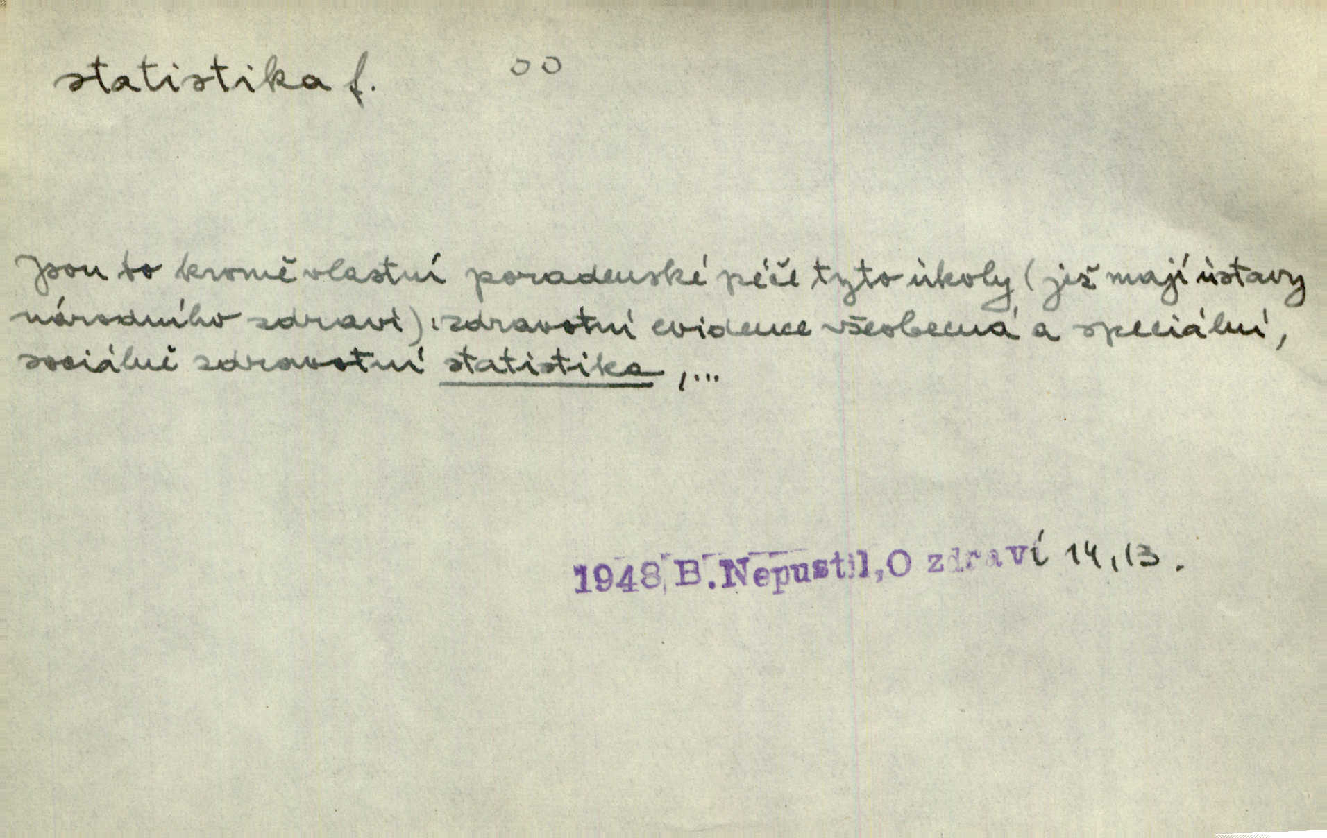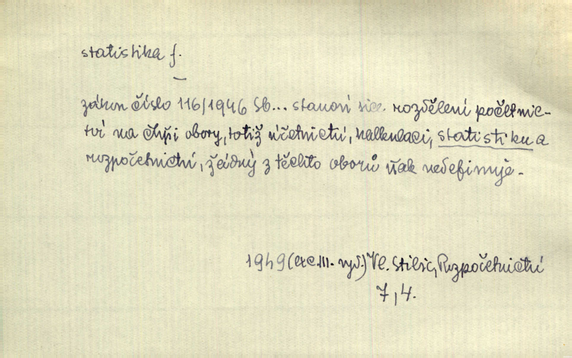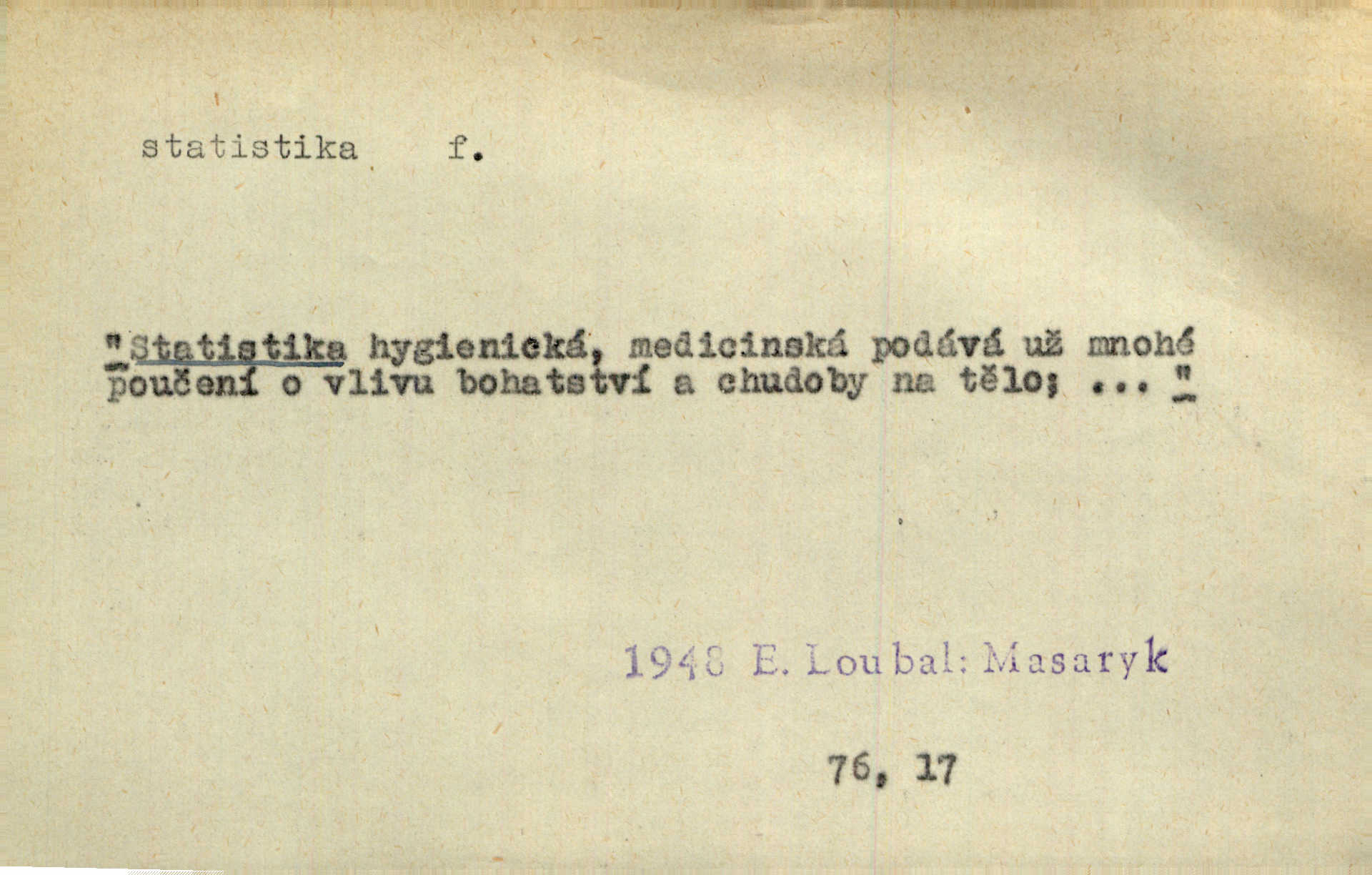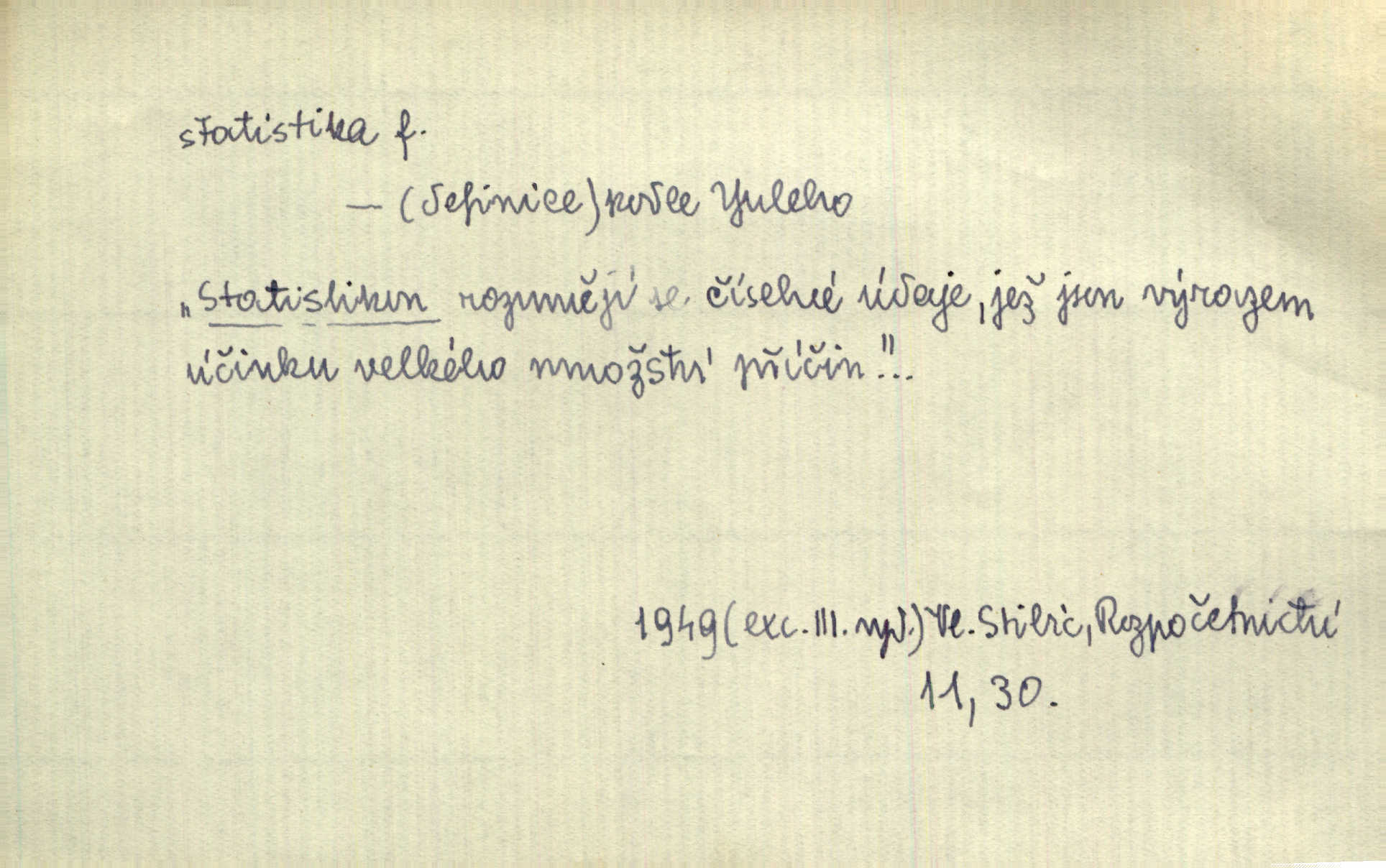- statistika, -y f. číselné zaznamenání a zkoumání souhrnných, hromadných jevů; věda zjišťující číselně soustavným pozorováním hospodářské, sociální a j. jevy ve státě a společnosti; zkoumající jejich příčiny a stanovící důsledky. Provedl jsem jednou statistiku v řadě úřadů a institucí. Mach. Napadlo mu číslo to ze statistiky, která tvrdí, že na jednoho otce připadají čtyři potomci. Staš. Všecky ty statistiky o čtení u dětí, o oblibách, sklonech jsou hodně ilusorní. Lit. noviny. Statistika slov [ve verši Březinově] podle počtu slabik prozrazuje nadnormální počet slovních celků trojslabičných. Muk. Nákupní a prodejní statistiku má stará paní v malíčku. Sova. Studium úmrtnostní statistiky jest stíženo tím, že věkové rozvrstvení obyvatelstva jest ve městech zcela jiné než na venkově. Boh. Veř. spr. statistika hospodářská, sociální, kulturní, statistika mzdová, zemědělská, lesní, průmyslová a j. D Zast. nauka o státě a státním zřízení. Povzbuzoval ho Jungmann k sepsání statistiky české. Zel.