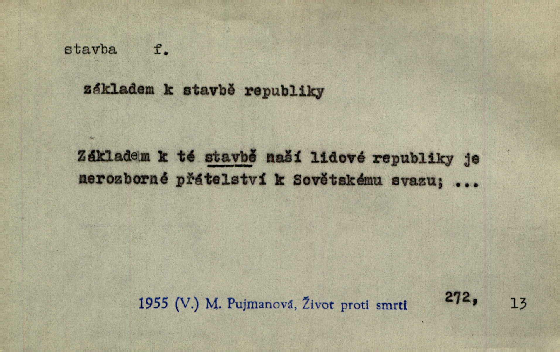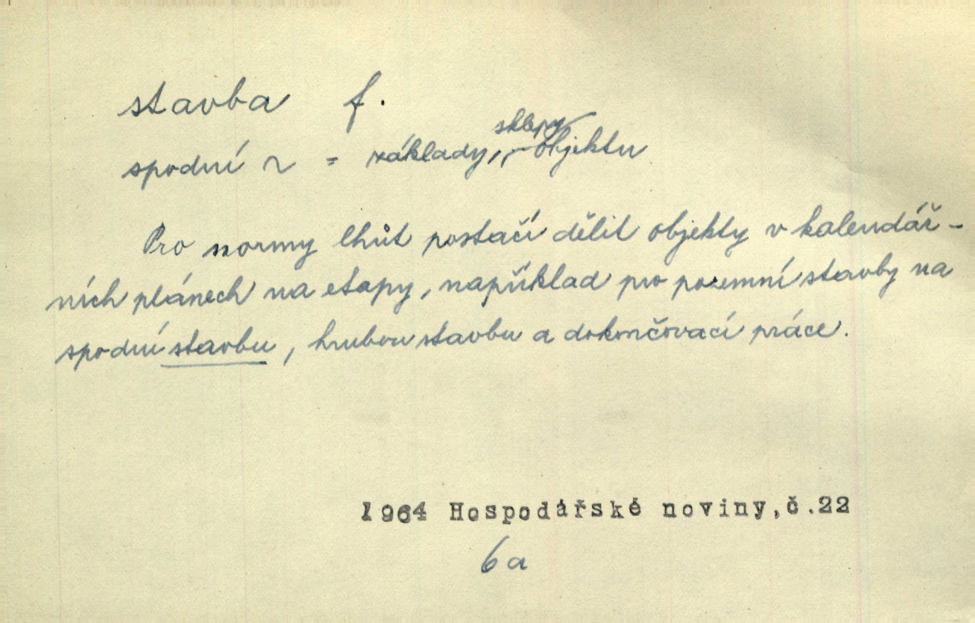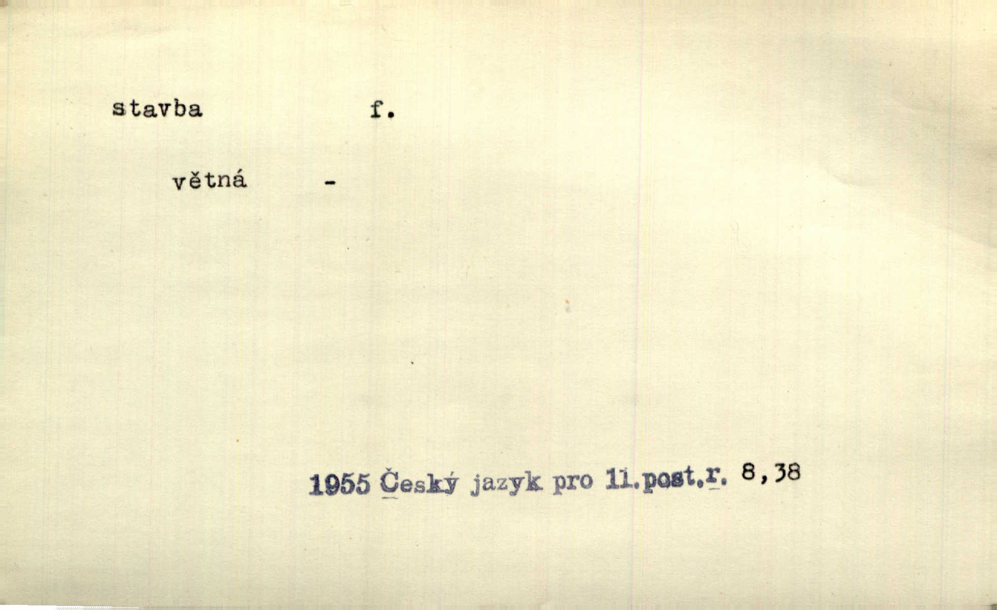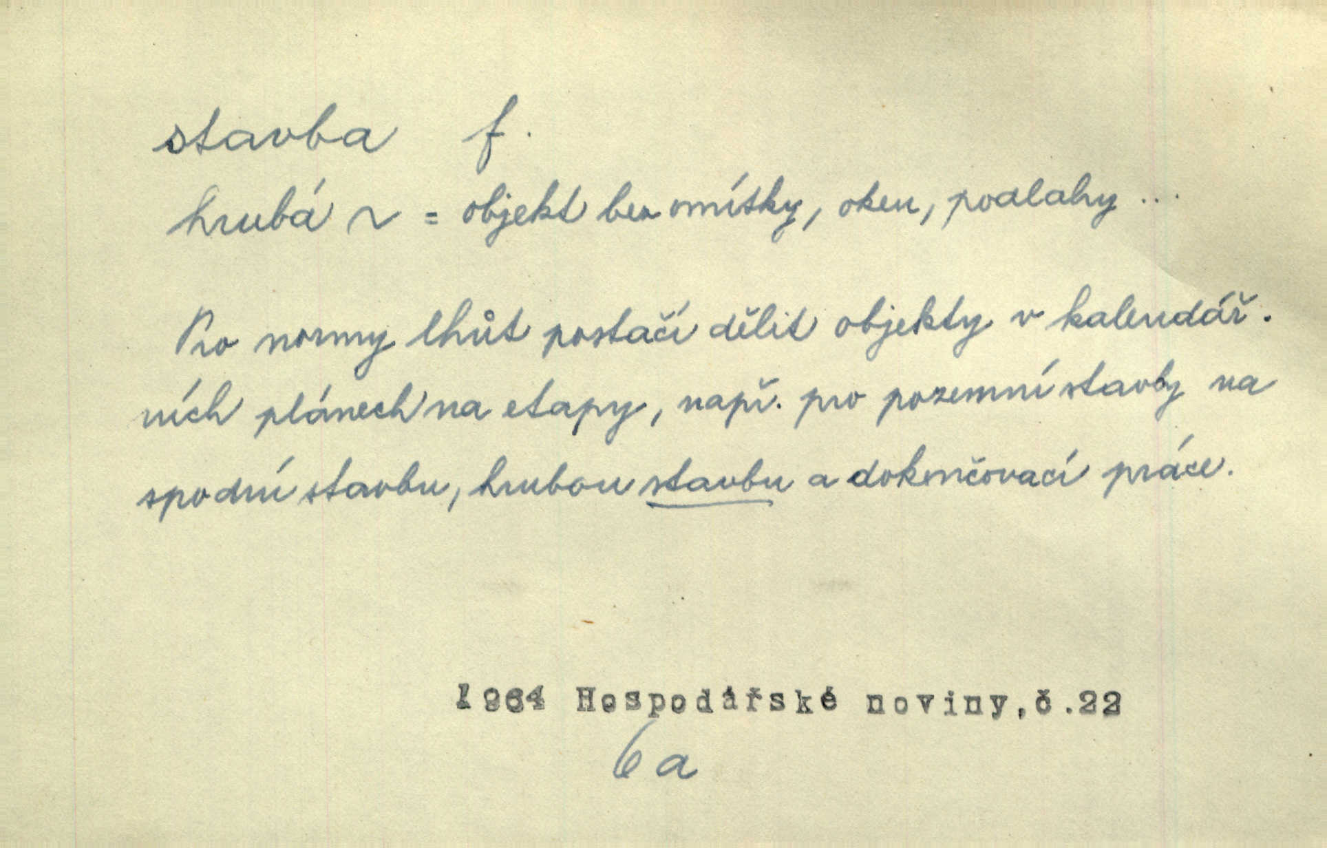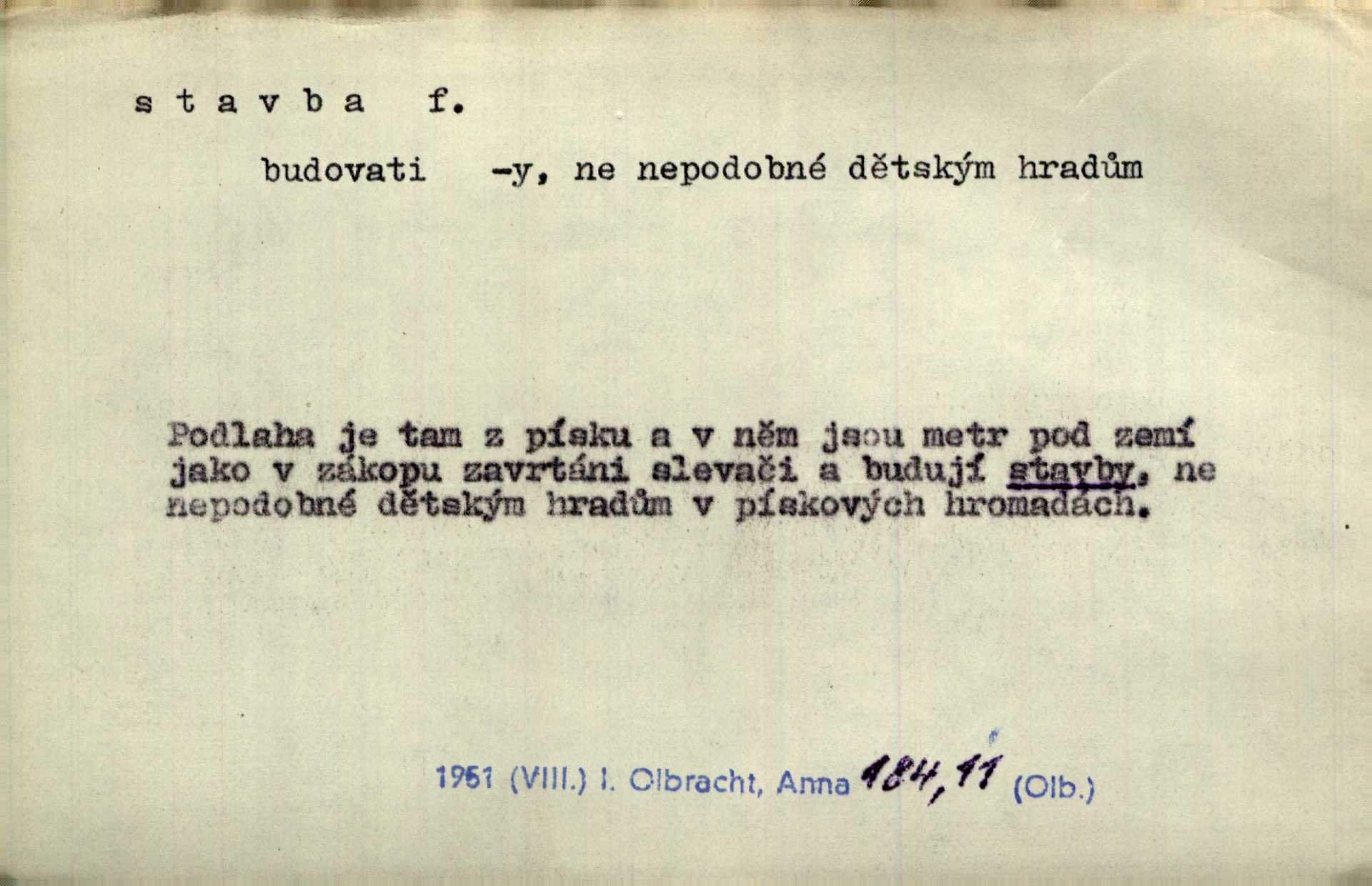 - stavba, -y f. souhrn výkonů určených k zbudování, vytvoření konstruktivního, technického díla, stavění. Mluví o stavbě nějaké továrny na Labi. Staš. Žádali vrchního o povolení ku stavbě. Jir. Opat Athanáš, jenž zvláště ve stavitelství sobě liboval, podnikl některé stavby. Jir. Za inženýry přihrnuli se různí podnikatelé stavby. Baar. On každý den ke stavbě dohlížel. Arb. Dnes pracujeme na stavbě jako ve všední den. Herrm. Za koníčka oblíbeného měl řezbu a stavbu lepenkových chrámů a hradů. Bouš. Z dříví bukového dělají se klády, též potřebuje se k vodním stavbám. Něm. Půjde prý na stavbu na železnici. Pfleg. Vyjednával s mužem zkušeným ve stavbě lodí. Zey. Kráčel v technice do sálu pro stavbu strojů. Svob. Technická věda, která se zabývá úkoly a prostředky výstavby obcí, se jmenuje stavba měst. Enc. č. ml. Přen. Základy ke stavbě mohútného státu byly již položeny. Pal. D výtvor této činnosti, něco vystavěného, zpr. budova Nádhernou stavbu tu zasvětili sv. Františku Xaverskému. Svět. Za vysokou mansardou hlavní budovy čněly ostatky pozdější gothické stavby. Zey. Dále do městečka kamenných staveb ubývalo. Rais. Patřme na veřejné stavby, na silnice, železnice. Havl. Cirkusový vůz je poctivá stavba z tvrdého dřeva. Týd. rozhl. Však oni [mravenci] pevně staví, a když jim to silnější moc nezkazí, tak snadno se jim stavba nesboří. Něm. Přen. Stavba kdysi mocné říše římské se viklá. Vaněček. Sfoukne rozmar chefův celou stavbu plánů zřízencových. Krás. Žel. vrchní stavba. Stav. vodní, břehové stavby; pozemní stavby, vodohospodářské stavby; srubové stavby. D způsob provedení, uspořádání částí tohoto výtvoru, stavební sloh. Prastarý dům divné stavby uličky běh uzavírá. Klášt. V rohu zahrady stál pavillonek lehounké stavby. Jir. Pod hradem stojí malá chaloupka zcela obyčejné chudobné stavby. Mácha. Divně vyjímal se v rozvalinách těch kostelík stavby novověké. Jir. Máchovo dílo je důmyslná stavba. Krit. měs. D záměrné, účelné sestavení, uspořádání, sestavování, pořádání částí celku. Jde [lehká atletika] cestami, které vedou k dokonalé stavbě těla. Rozhlas. Hrabě hladil bratrovy koně jemné stavby. Lang. Stavba jeho [Rekovy] lebky a slechy elegantně zavěšené vzbuzují nadšení všech lovců. Herb. Dokonalá znalost stavby květin a přesné poznatky dendrologické byly mu [malíři] cennou průpravou. Týd. rozhl. Nesčíslné zákony stavby a skladby probíhají hmotou jako tajemné matematické blesky. K. Čap. Nelze si zdravou stavbu a skladbu národa myslit bez zemědělství. Brázda. Umělecké dílo není pouhým napodobením jevové reality, ale záměrnou stavbou. Branž. Co do stavby jest první jednání [hry] nejzajímavější. Zl. Praha. Ve stavbě příběhů dosahuje autorka kouzelné poutavosti. Eva. Zajímaly mě stihající se rýmy, rytmický chod, stavby strof. Mach. Nevysvětlitelným způsobem se mu [autorovi] ztratila celá mluvnická stavba jazyka. V. Math. Jiná složka, která je již docela nepřímo spjata se zvukem, je syntaktická stavba věty. Muk. Fys. stavba hmoty. Geol. uspořádáni součástí v hornině, textura.