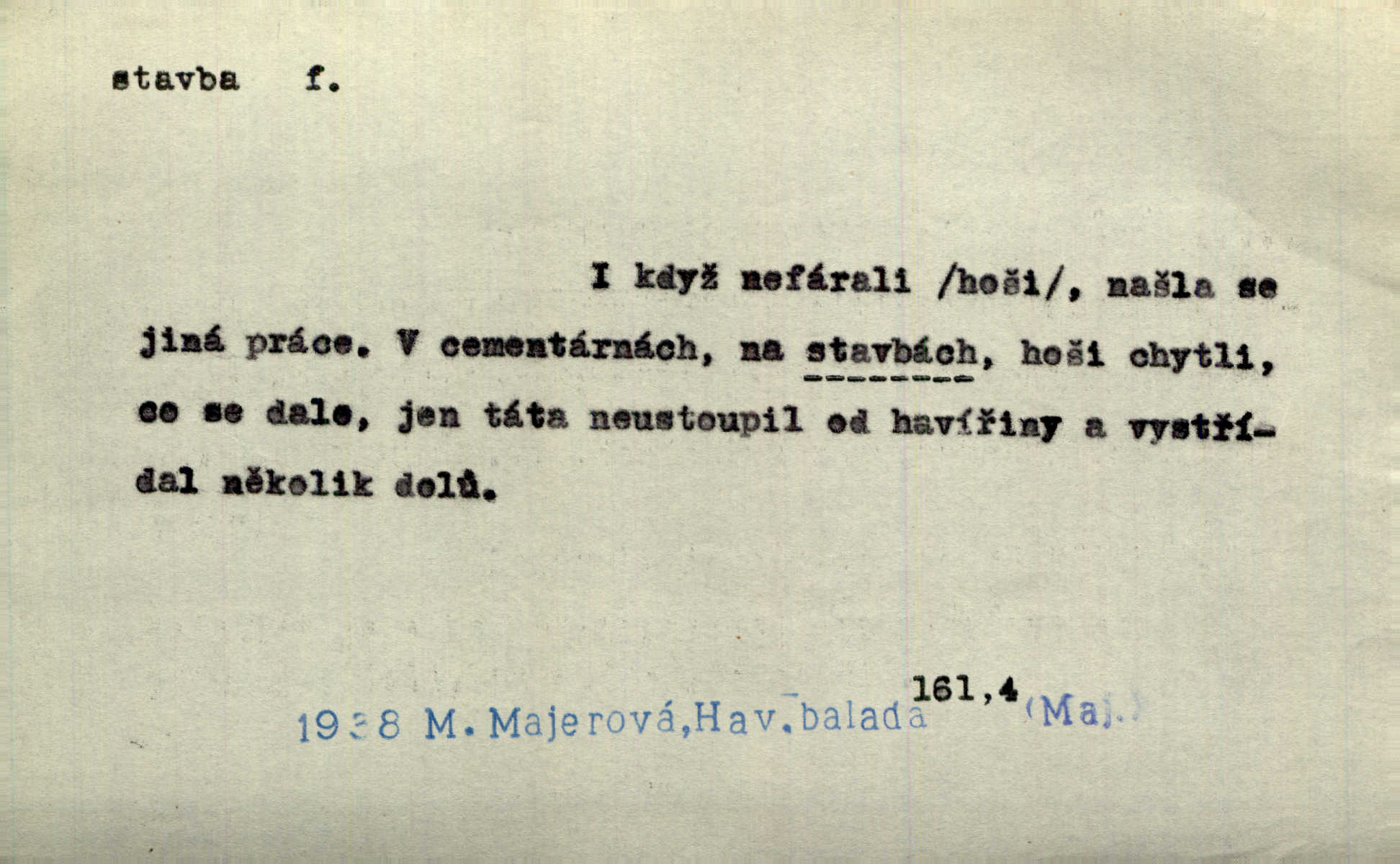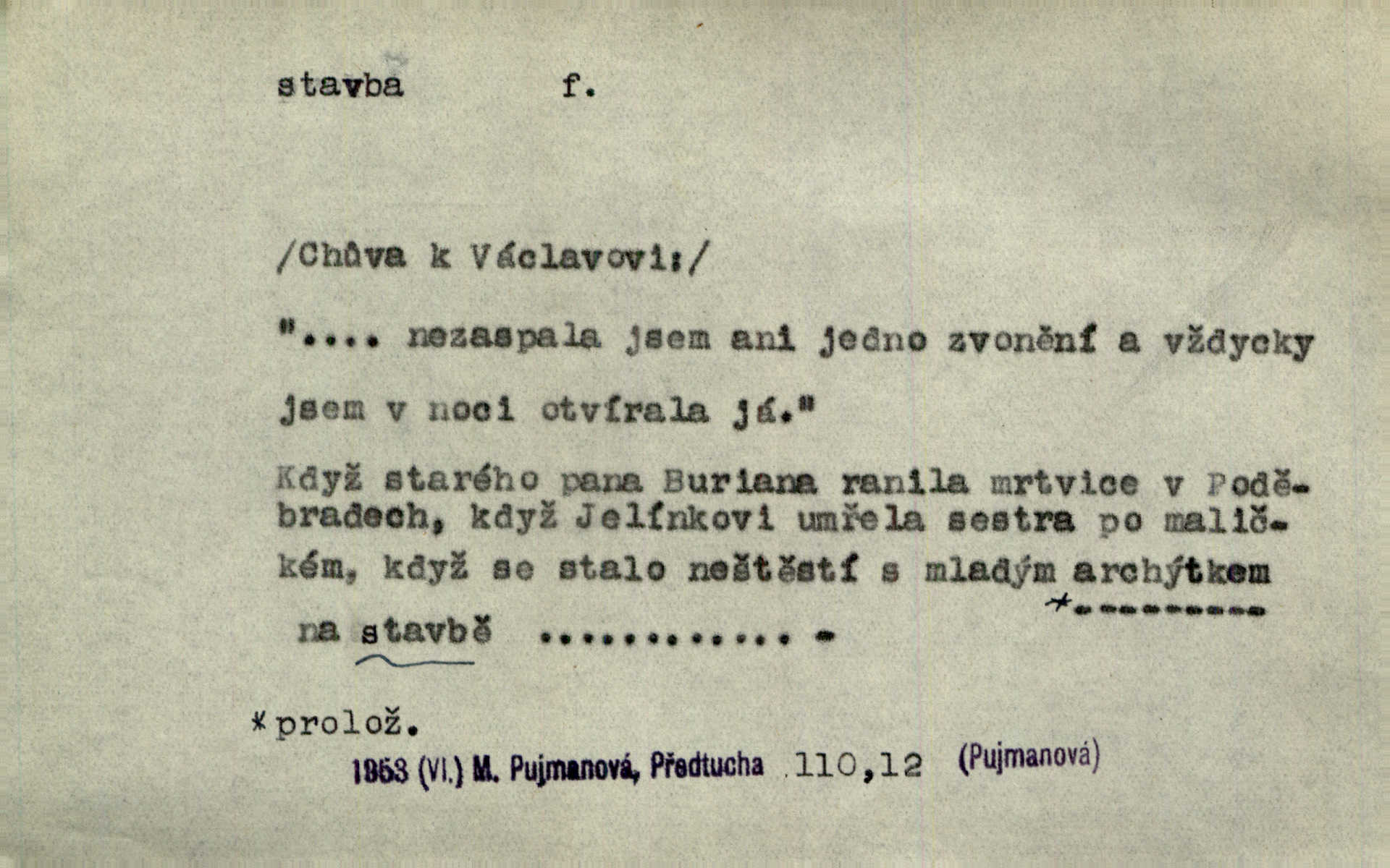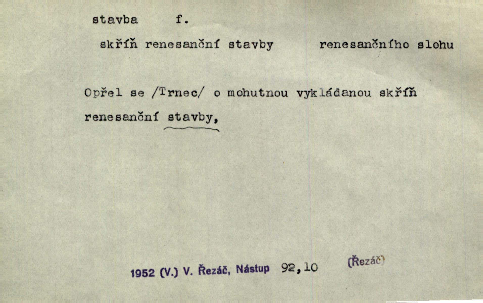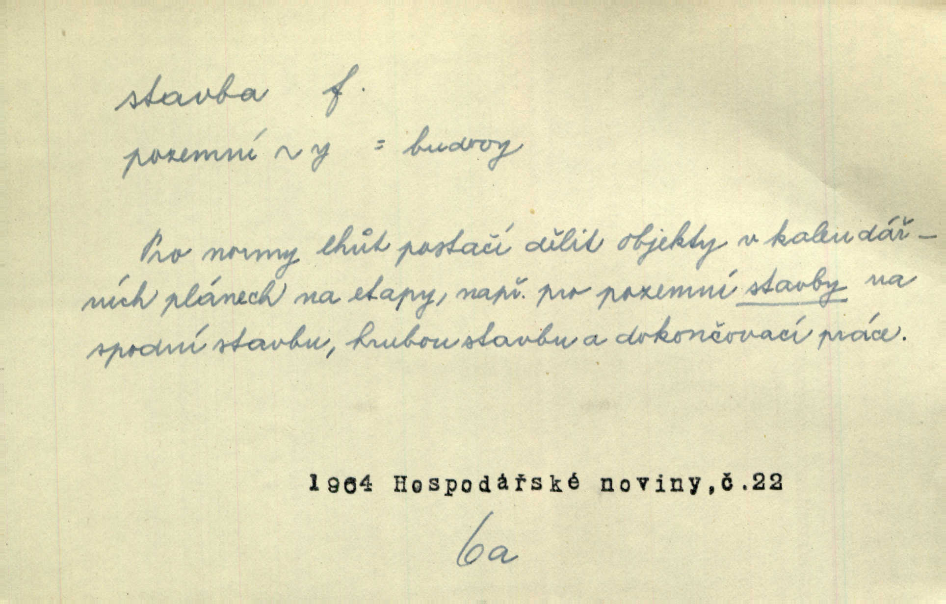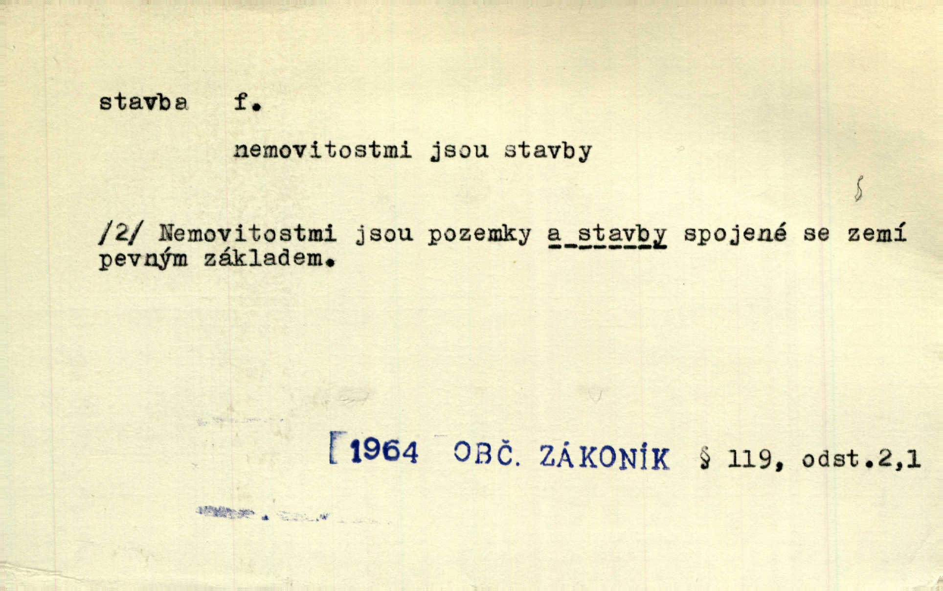 - stavba, -y f. souhrn výkonů určených k zbudování, vytvoření konstruktivního, technického díla, stavění. Mluví o stavbě nějaké továrny na Labi. Staš. Žádali vrchního o povolení ku stavbě. Jir. Opat Athanáš, jenž zvláště ve stavitelství sobě liboval, podnikl některé stavby. Jir. Za inženýry přihrnuli se různí podnikatelé stavby. Baar. On každý den ke stavbě dohlížel. Arb. Dnes pracujeme na stavbě jako ve všední den. Herrm. Za koníčka oblíbeného měl řezbu a stavbu lepenkových chrámů a hradů. Bouš. Z dříví bukového dělají se klády, též potřebuje se k vodním stavbám. Něm. Půjde prý na stavbu na železnici. Pfleg. Vyjednával s mužem zkušeným ve stavbě lodí. Zey. Kráčel v technice do sálu pro stavbu strojů. Svob. Technická věda, která se zabývá úkoly a prostředky výstavby obcí, se jmenuje stavba měst. Enc. č. ml. Přen. Základy ke stavbě mohútného státu byly již položeny. Pal. D výtvor této činnosti, něco vystavěného, zpr. budova Nádhernou stavbu tu zasvětili sv. Františku Xaverskému. Svět. Za vysokou mansardou hlavní budovy čněly ostatky pozdější gothické stavby. Zey. Dále do městečka kamenných staveb ubývalo. Rais. Patřme na veřejné stavby, na silnice, železnice. Havl. Cirkusový vůz je poctivá stavba z tvrdého dřeva. Týd. rozhl. Však oni [mravenci] pevně staví, a když jim to silnější moc nezkazí, tak snadno se jim stavba nesboří. Něm. Přen. Stavba kdysi mocné říše římské se viklá. Vaněček. Sfoukne rozmar chefův celou stavbu plánů zřízencových. Krás. Žel. vrchní stavba. Stav. vodní, břehové stavby; pozemní stavby, vodohospodářské stavby; srubové stavby. D způsob provedení, uspořádání částí tohoto výtvoru, stavební sloh. Prastarý dům divné stavby uličky běh uzavírá. Klášt. V rohu zahrady stál pavillonek lehounké stavby. Jir. Pod hradem stojí malá chaloupka zcela obyčejné chudobné stavby. Mácha. Divně vyjímal se v rozvalinách těch kostelík stavby novověké. Jir. Máchovo dílo je důmyslná stavba. Krit. měs. D záměrné, účelné sestavení, uspořádání, sestavování, pořádání částí celku. Jde [lehká atletika] cestami, které vedou k dokonalé stavbě těla. Rozhlas. Hrabě hladil bratrovy koně jemné stavby. Lang. Stavba jeho [Rekovy] lebky a slechy elegantně zavěšené vzbuzují nadšení všech lovců. Herb. Dokonalá znalost stavby květin a přesné poznatky dendrologické byly mu [malíři] cennou průpravou. Týd. rozhl. Nesčíslné zákony stavby a skladby probíhají hmotou jako tajemné matematické blesky. K. Čap. Nelze si zdravou stavbu a skladbu národa myslit bez zemědělství. Brázda. Umělecké dílo není pouhým napodobením jevové reality, ale záměrnou stavbou. Branž. Co do stavby jest první jednání [hry] nejzajímavější. Zl. Praha. Ve stavbě příběhů dosahuje autorka kouzelné poutavosti. Eva. Zajímaly mě stihající se rýmy, rytmický chod, stavby strof. Mach. Nevysvětlitelným způsobem se mu [autorovi] ztratila celá mluvnická stavba jazyka. V. Math. Jiná složka, která je již docela nepřímo spjata se zvukem, je syntaktická stavba věty. Muk. Fys. stavba hmoty. Geol. uspořádáni součástí v hornině, textura.