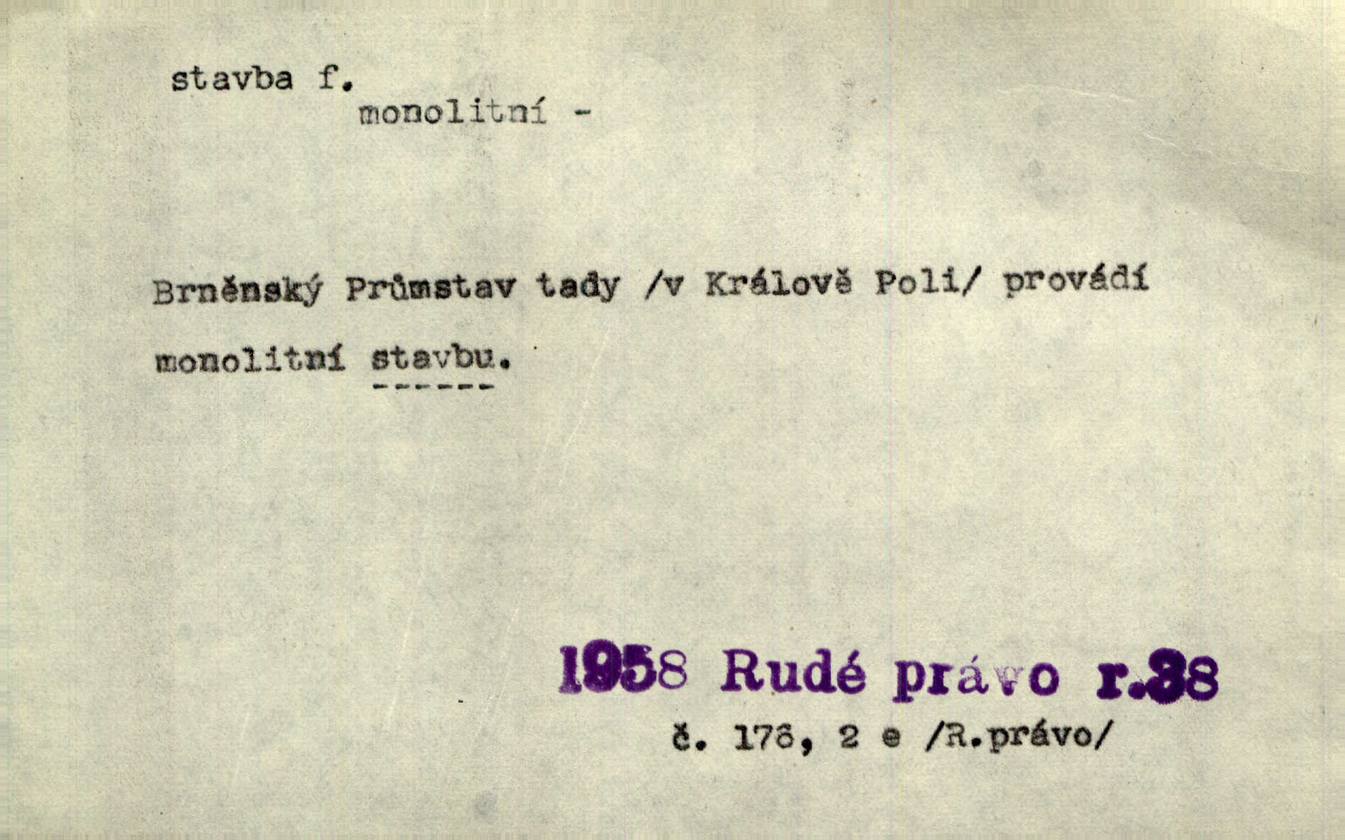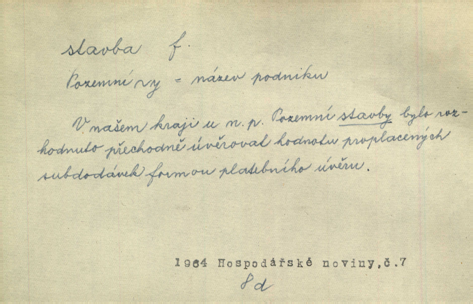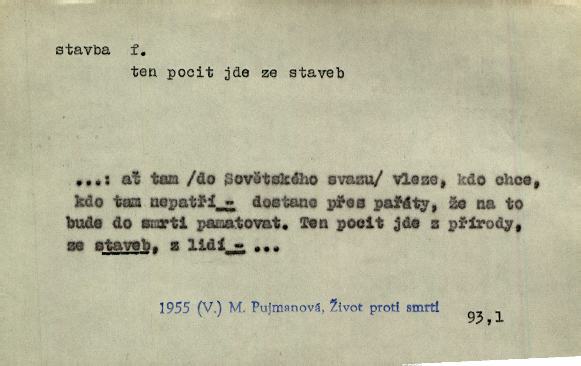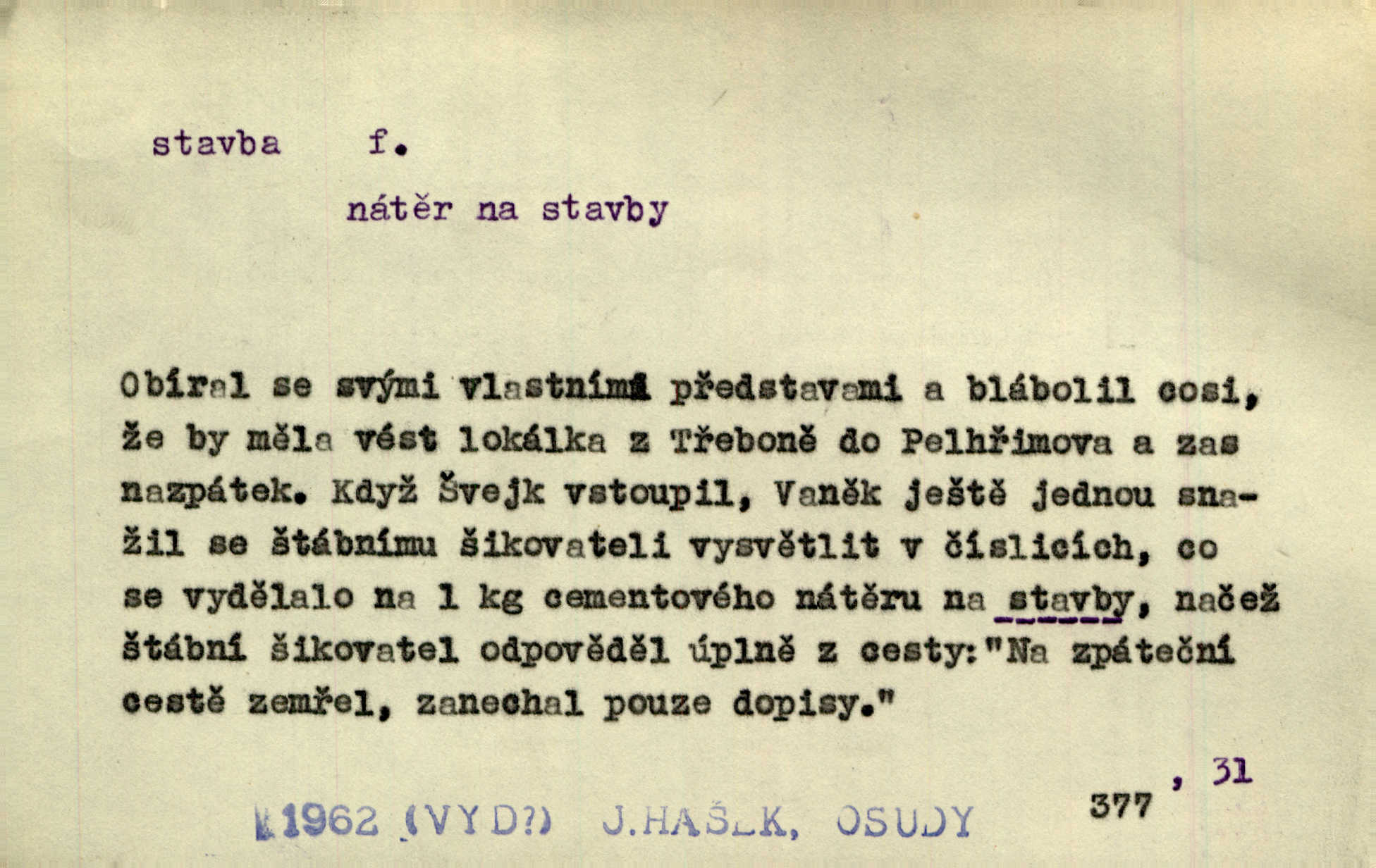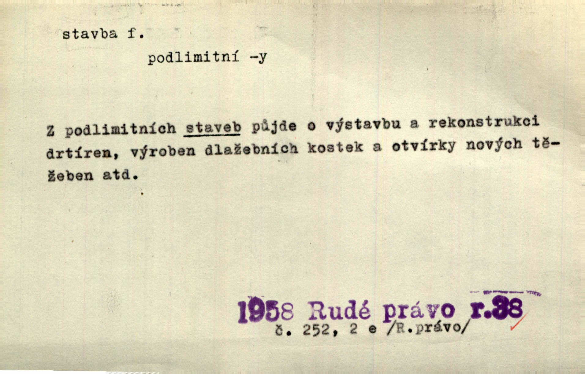 - stavba, -y f. souhrn výkonů určených k zbudování, vytvoření konstruktivního, technického díla, stavění. Mluví o stavbě nějaké továrny na Labi. Staš. Žádali vrchního o povolení ku stavbě. Jir. Opat Athanáš, jenž zvláště ve stavitelství sobě liboval, podnikl některé stavby. Jir. Za inženýry přihrnuli se různí podnikatelé stavby. Baar. On každý den ke stavbě dohlížel. Arb. Dnes pracujeme na stavbě jako ve všední den. Herrm. Za koníčka oblíbeného měl řezbu a stavbu lepenkových chrámů a hradů. Bouš. Z dříví bukového dělají se klády, též potřebuje se k vodním stavbám. Něm. Půjde prý na stavbu na železnici. Pfleg. Vyjednával s mužem zkušeným ve stavbě lodí. Zey. Kráčel v technice do sálu pro stavbu strojů. Svob. Technická věda, která se zabývá úkoly a prostředky výstavby obcí, se jmenuje stavba měst. Enc. č. ml. Přen. Základy ke stavbě mohútného státu byly již položeny. Pal. D výtvor této činnosti, něco vystavěného, zpr. budova Nádhernou stavbu tu zasvětili sv. Františku Xaverskému. Svět. Za vysokou mansardou hlavní budovy čněly ostatky pozdější gothické stavby. Zey. Dále do městečka kamenných staveb ubývalo. Rais. Patřme na veřejné stavby, na silnice, železnice. Havl. Cirkusový vůz je poctivá stavba z tvrdého dřeva. Týd. rozhl. Však oni [mravenci] pevně staví, a když jim to silnější moc nezkazí, tak snadno se jim stavba nesboří. Něm. Přen. Stavba kdysi mocné říše římské se viklá. Vaněček. Sfoukne rozmar chefův celou stavbu plánů zřízencových. Krás. Žel. vrchní stavba. Stav. vodní, břehové stavby; pozemní stavby, vodohospodářské stavby; srubové stavby. D způsob provedení, uspořádání částí tohoto výtvoru, stavební sloh. Prastarý dům divné stavby uličky běh uzavírá. Klášt. V rohu zahrady stál pavillonek lehounké stavby. Jir. Pod hradem stojí malá chaloupka zcela obyčejné chudobné stavby. Mácha. Divně vyjímal se v rozvalinách těch kostelík stavby novověké. Jir. Máchovo dílo je důmyslná stavba. Krit. měs. D záměrné, účelné sestavení, uspořádání, sestavování, pořádání částí celku. Jde [lehká atletika] cestami, které vedou k dokonalé stavbě těla. Rozhlas. Hrabě hladil bratrovy koně jemné stavby. Lang. Stavba jeho [Rekovy] lebky a slechy elegantně zavěšené vzbuzují nadšení všech lovců. Herb. Dokonalá znalost stavby květin a přesné poznatky dendrologické byly mu [malíři] cennou průpravou. Týd. rozhl. Nesčíslné zákony stavby a skladby probíhají hmotou jako tajemné matematické blesky. K. Čap. Nelze si zdravou stavbu a skladbu národa myslit bez zemědělství. Brázda. Umělecké dílo není pouhým napodobením jevové reality, ale záměrnou stavbou. Branž. Co do stavby jest první jednání [hry] nejzajímavější. Zl. Praha. Ve stavbě příběhů dosahuje autorka kouzelné poutavosti. Eva. Zajímaly mě stihající se rýmy, rytmický chod, stavby strof. Mach. Nevysvětlitelným způsobem se mu [autorovi] ztratila celá mluvnická stavba jazyka. V. Math. Jiná složka, která je již docela nepřímo spjata se zvukem, je syntaktická stavba věty. Muk. Fys. stavba hmoty. Geol. uspořádáni součástí v hornině, textura.