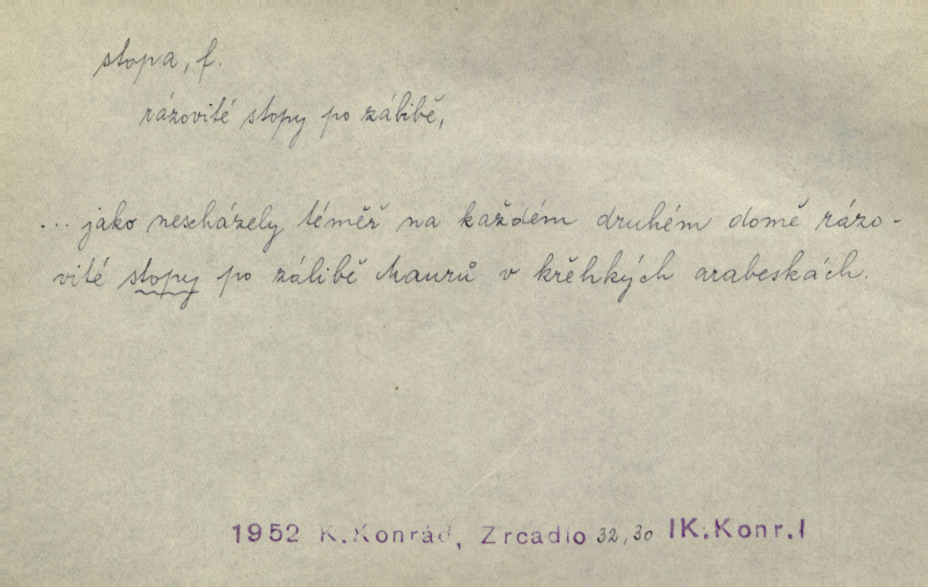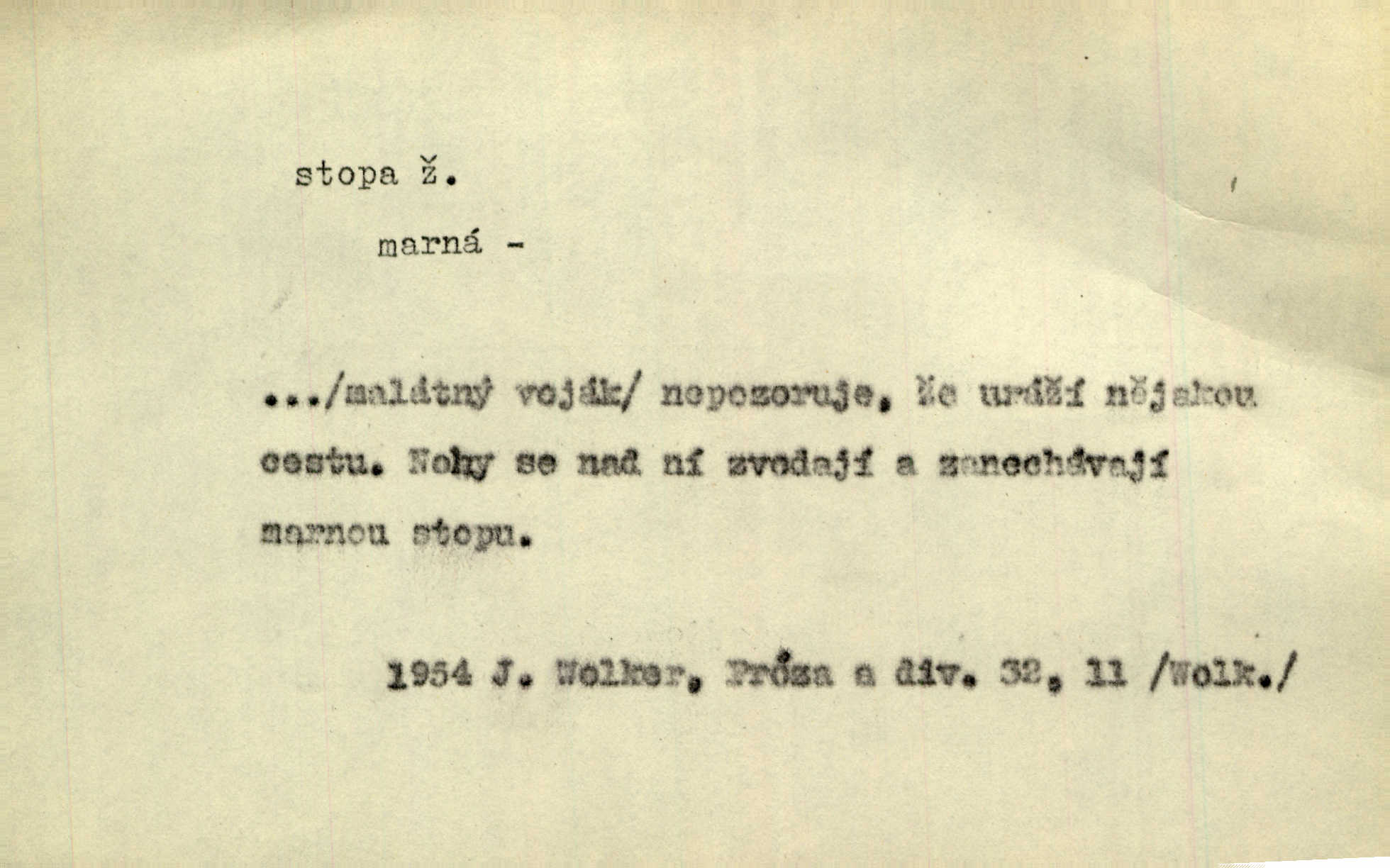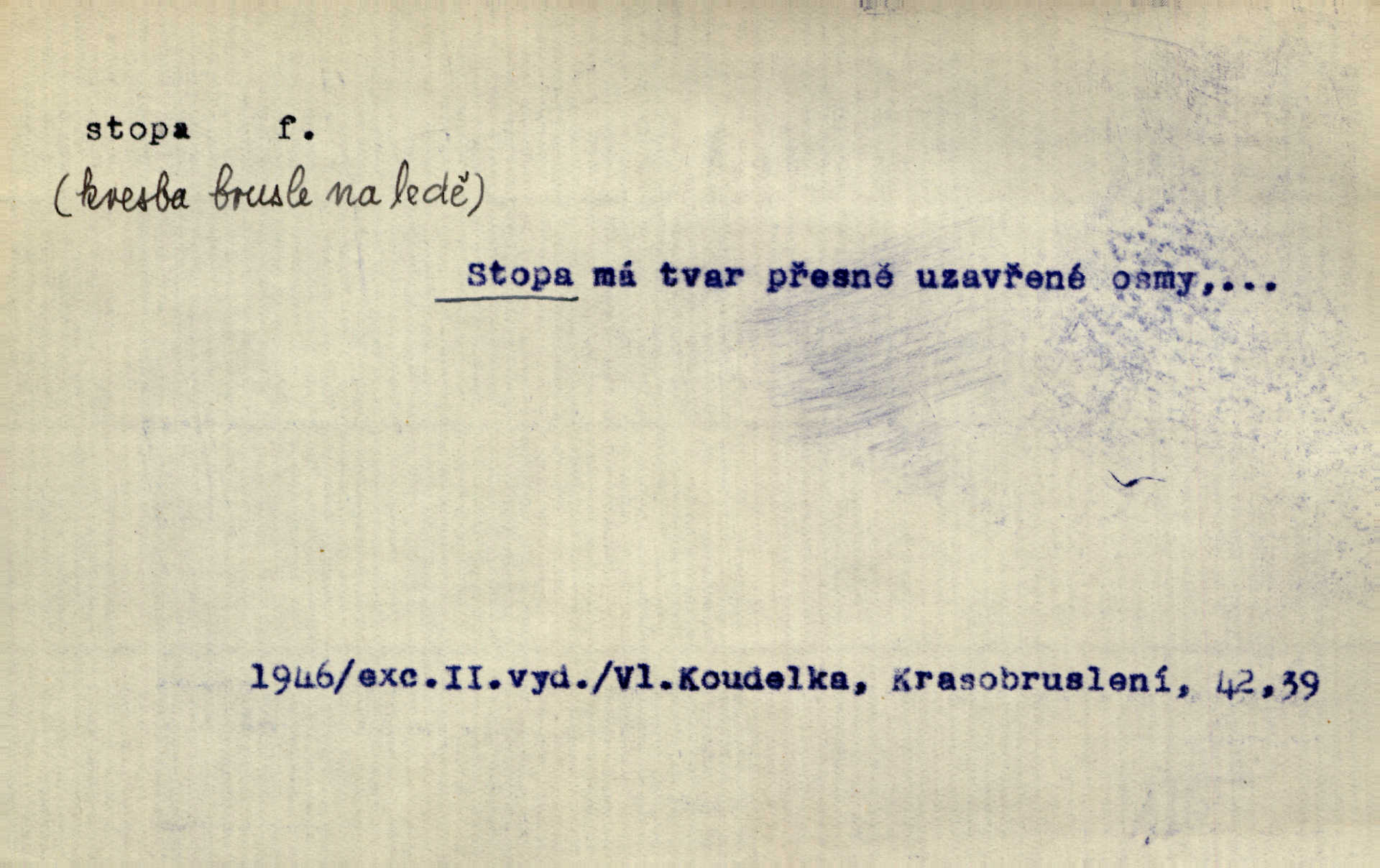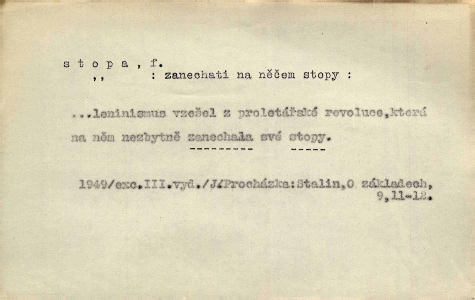 - stopa, -y f. otisk chodidla nohy na zemi, znatelný n. zjistitelný zůstatek po takovém otisku, šlépěj. „Vidíte tam tu šlépěj?“ řekl zasněžený muž a ukazoval na nějakou stopu asi šest metrů od kraje silnice. K. Čap. Spláchne déšť a setře vítr stopy kroků mých. Mácha. Scházel se schodů, vytlačuje svými mokrými botami stopy své po schodech. Havl. Jičínská pátračka nasadila do stopy služebního psa a ten sledoval stopu pachatelovu. Nár. p. Pes čenichá, má již stopu, chce štěkati. Prav. Ráno pak viděti na louce přečetné stopy koňských kopyt. Jir. A bylo vidět stopy, jak od psí nohy. Erb. Mysl. otisky spárů n. prstů lovné zvěře v měkké půdě n. na sněhu, podle nichž se určuje druh a velikost zvěře. D Dial. a zast. chodidlo. Punčochy v tetčiných botách nemají stop. Na stopy už nezbylo příze. Glaz. Kočičí stopou pohladit mladého krále, zalichotit se mu tlapou. Jir. D vůbec sled, znamení po něčí cestě, po někom n. něčem. Ohněm a krví červenaly se stopy jeho, kady byl s velikými houfy svých Němců a spojených s ním divokých Uhrů přitáhl [císař]. Tyl. Otec a matka radili se den co den, jak stopu zmizelého syna najíti. Zey. Ale věříte mi, že jsou [policisté] mi na stopě? Mach. Po pachateli nebylo stopy. Herb. Teď se půjdeme podívat po stopě zlého činu. Švan. Tatíček přišel její známosti na stopu. Preis. Slova jeho byla doopravdy míněna a vedla mne hned na stopu pravou. Zey. V treningu [krasobruslařů] má také pěkné držení a dobrou stopu Soukup. Lid. nov. Třebaže moderní vozy výborně drží stopu na silnici, přece na náledí nesmíte jezditi rychle. Lid. nov. Přen. Mladá literatura naše šla po stopách Vrchlického. Mach. D zbytek, zůstatek, znamení, památka po něčem. Viděla na cestě krvavé stopy ran Kristových. Něm. Tanečnice měly vytlačené stopy mastných ruk na zádech. Mach. Po každém soustu olízl nůž, aby na něm ani stopa mastnoty nezůstala. Lit. noviny. Důkladně omyla čelo a tváře od nejposlednější stopy pudru. Čap. Ch. Všude [na hradě] byly zřejmy stopy královské nádhery. Jir. V zářezech těch sloupů znamenal jsem stopy rudé a modré barvy. Jir. Za pět minut nebylo po párkách na talíři ani stopy. Šim. Její tvář pozbyla poslední stopy krásy. R. Svob. Ani nejmenší stopy jakési rozmrzelosti, tím méně hněvu nebylo lze spatřiti v obličeji mladého krále. Třeb. My po stopách dávné Etrurie bloudit budem. Zey. Rytířství, ač stopy jeho jsou starší než křesťanství, rozkvetlo neobyčejně krásně teprve ve středověku. Zey. Kronikář a archivář dbá, aby zůstala stopa po tom, co kladného bylo vykonáno. Rozhlas. U kněží neminul spor o monstrancí beze stopy. Jir. D Dial. cesta. Dostala se do hustého lesa, kde nebylo ani stopy ani světla. Něm. Nepouštěj se na vodu bez vesla a bez stopy do lesa. Baar. D někdejší délková míra, rovnající se přibližně délce lidského chodidla (31,6 cm). Je to Bor, téměř tři tisíce stop vysoký. Jir. Děcko pochová šest stop pod hřbitovní drn. A. Mrš. Byl muž vysoký dvanácte stop. John. Anglická stopa délka 30 48 cm. D Bot. stopy listové cevní svazky vstupující z listu do osy. Geom. stopa přímky průsečík přímky s rovinou (půdorysnou n. nárysnou). Metr. skupina slabik spojených v celek jedním přízvukem rytmickým, takt. Stopa přízvučná, časoměrná.