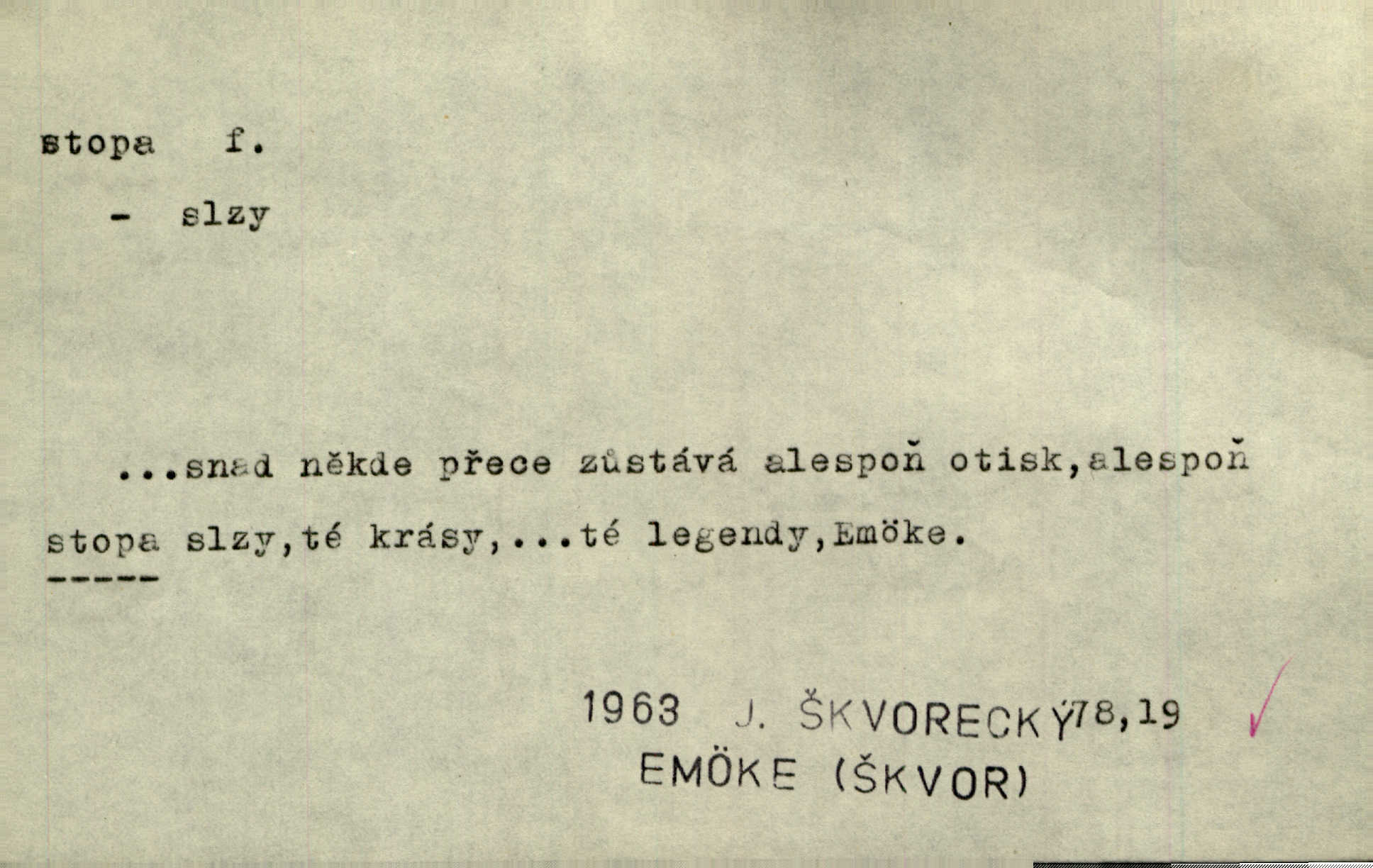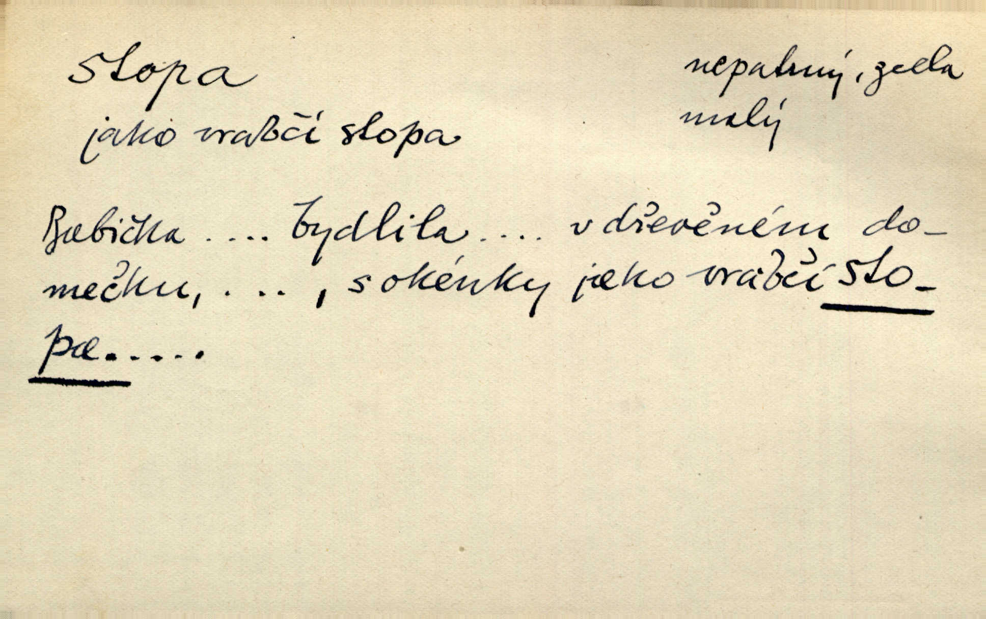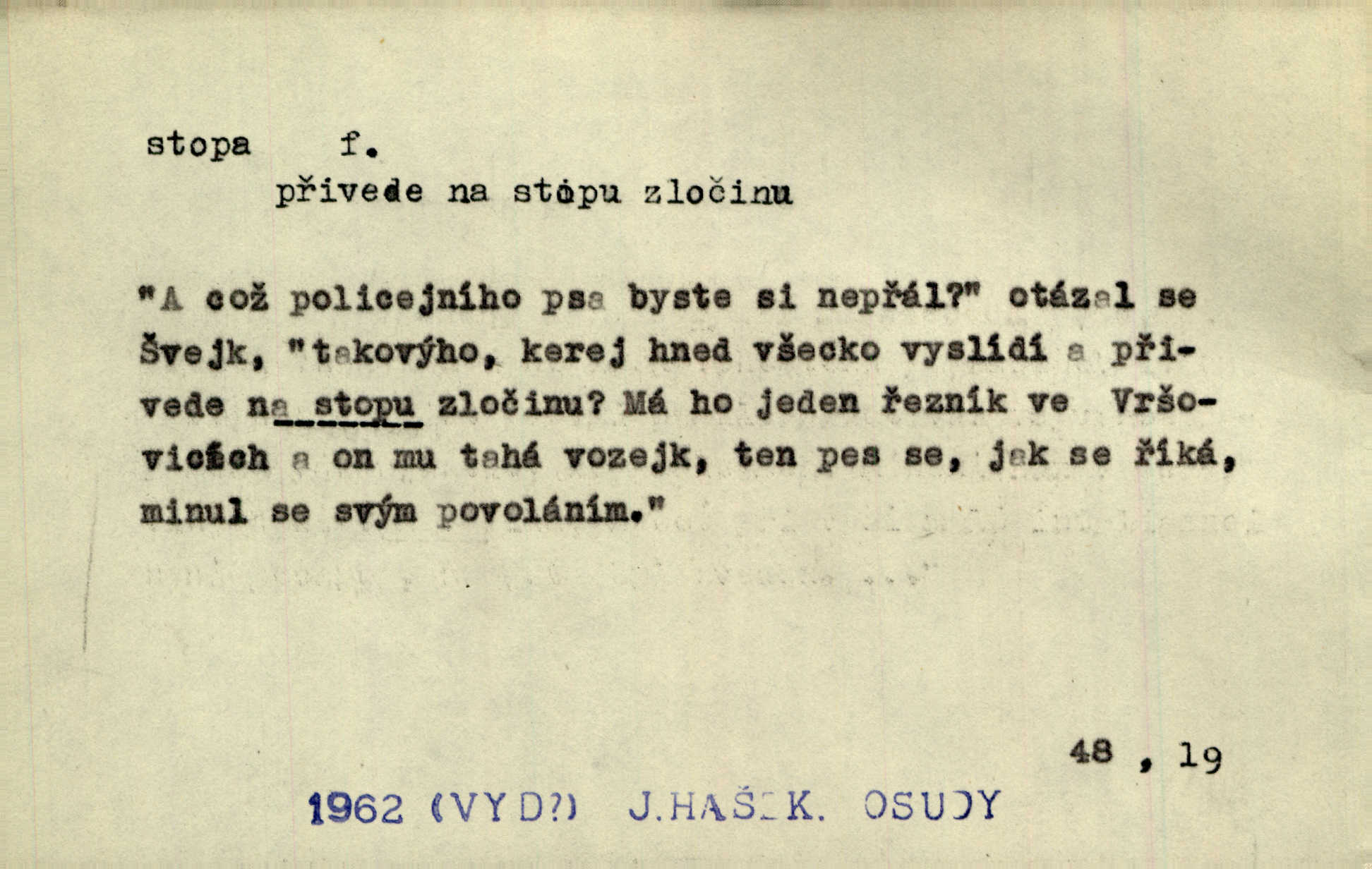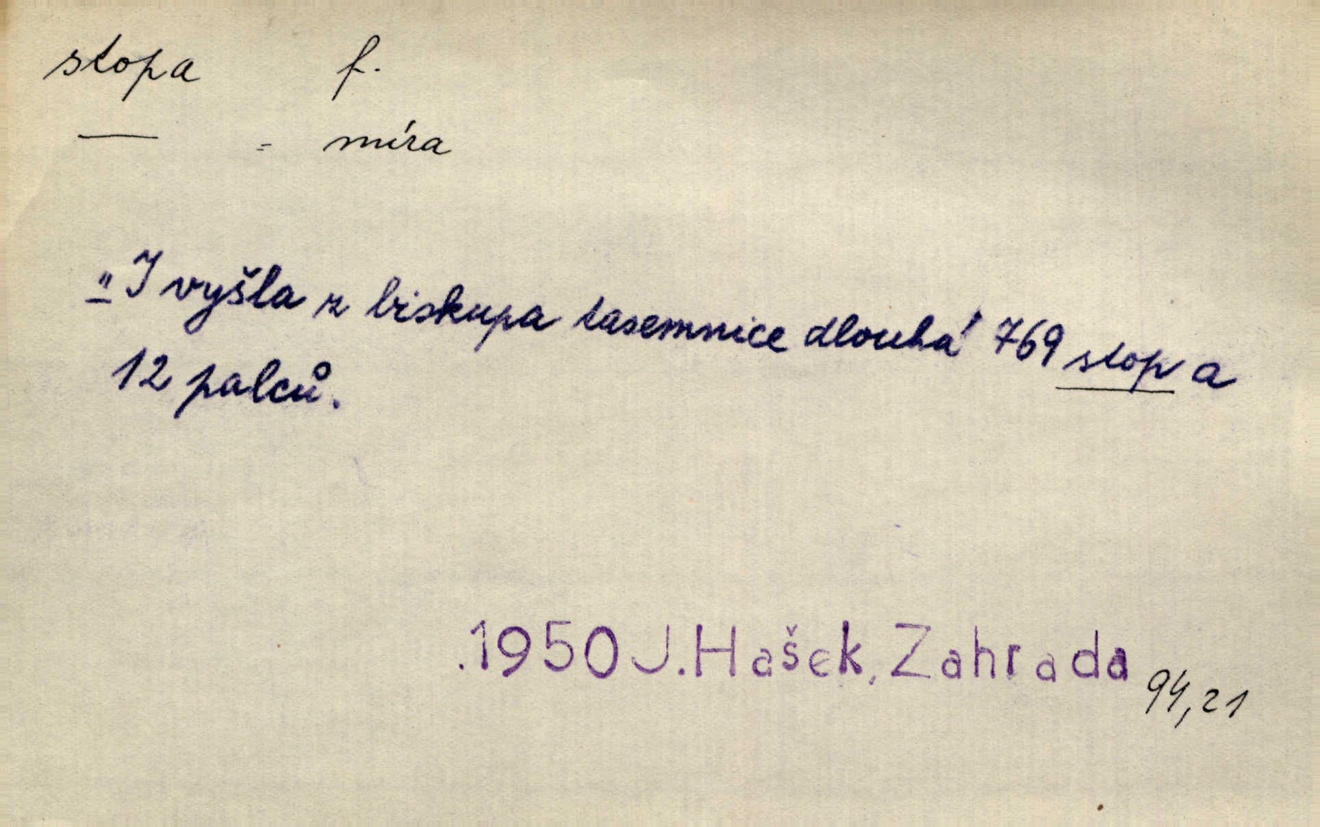 - stopa, -y f. otisk chodidla nohy na zemi, znatelný n. zjistitelný zůstatek po takovém otisku, šlépěj. „Vidíte tam tu šlépěj?“ řekl zasněžený muž a ukazoval na nějakou stopu asi šest metrů od kraje silnice. K. Čap. Spláchne déšť a setře vítr stopy kroků mých. Mácha. Scházel se schodů, vytlačuje svými mokrými botami stopy své po schodech. Havl. Jičínská pátračka nasadila do stopy služebního psa a ten sledoval stopu pachatelovu. Nár. p. Pes čenichá, má již stopu, chce štěkati. Prav. Ráno pak viděti na louce přečetné stopy koňských kopyt. Jir. A bylo vidět stopy, jak od psí nohy. Erb. Mysl. otisky spárů n. prstů lovné zvěře v měkké půdě n. na sněhu, podle nichž se určuje druh a velikost zvěře. D Dial. a zast. chodidlo. Punčochy v tetčiných botách nemají stop. Na stopy už nezbylo příze. Glaz. Kočičí stopou pohladit mladého krále, zalichotit se mu tlapou. Jir. D vůbec sled, znamení po něčí cestě, po někom n. něčem. Ohněm a krví červenaly se stopy jeho, kady byl s velikými houfy svých Němců a spojených s ním divokých Uhrů přitáhl [císař]. Tyl. Otec a matka radili se den co den, jak stopu zmizelého syna najíti. Zey. Ale věříte mi, že jsou [policisté] mi na stopě? Mach. Po pachateli nebylo stopy. Herb. Teď se půjdeme podívat po stopě zlého činu. Švan. Tatíček přišel její známosti na stopu. Preis. Slova jeho byla doopravdy míněna a vedla mne hned na stopu pravou. Zey. V treningu [krasobruslařů] má také pěkné držení a dobrou stopu Soukup. Lid. nov. Třebaže moderní vozy výborně drží stopu na silnici, přece na náledí nesmíte jezditi rychle. Lid. nov. Přen. Mladá literatura naše šla po stopách Vrchlického. Mach. D zbytek, zůstatek, znamení, památka po něčem. Viděla na cestě krvavé stopy ran Kristových. Něm. Tanečnice měly vytlačené stopy mastných ruk na zádech. Mach. Po každém soustu olízl nůž, aby na něm ani stopa mastnoty nezůstala. Lit. noviny. Důkladně omyla čelo a tváře od nejposlednější stopy pudru. Čap. Ch. Všude [na hradě] byly zřejmy stopy královské nádhery. Jir. V zářezech těch sloupů znamenal jsem stopy rudé a modré barvy. Jir. Za pět minut nebylo po párkách na talíři ani stopy. Šim. Její tvář pozbyla poslední stopy krásy. R. Svob. Ani nejmenší stopy jakési rozmrzelosti, tím méně hněvu nebylo lze spatřiti v obličeji mladého krále. Třeb. My po stopách dávné Etrurie bloudit budem. Zey. Rytířství, ač stopy jeho jsou starší než křesťanství, rozkvetlo neobyčejně krásně teprve ve středověku. Zey. Kronikář a archivář dbá, aby zůstala stopa po tom, co kladného bylo vykonáno. Rozhlas. U kněží neminul spor o monstrancí beze stopy. Jir. D Dial. cesta. Dostala se do hustého lesa, kde nebylo ani stopy ani světla. Něm. Nepouštěj se na vodu bez vesla a bez stopy do lesa. Baar. D někdejší délková míra, rovnající se přibližně délce lidského chodidla (31,6 cm). Je to Bor, téměř tři tisíce stop vysoký. Jir. Děcko pochová šest stop pod hřbitovní drn. A. Mrš. Byl muž vysoký dvanácte stop. John. Anglická stopa délka 30 48 cm. D Bot. stopy listové cevní svazky vstupující z listu do osy. Geom. stopa přímky průsečík přímky s rovinou (půdorysnou n. nárysnou). Metr. skupina slabik spojených v celek jedním přízvukem rytmickým, takt. Stopa přízvučná, časoměrná.