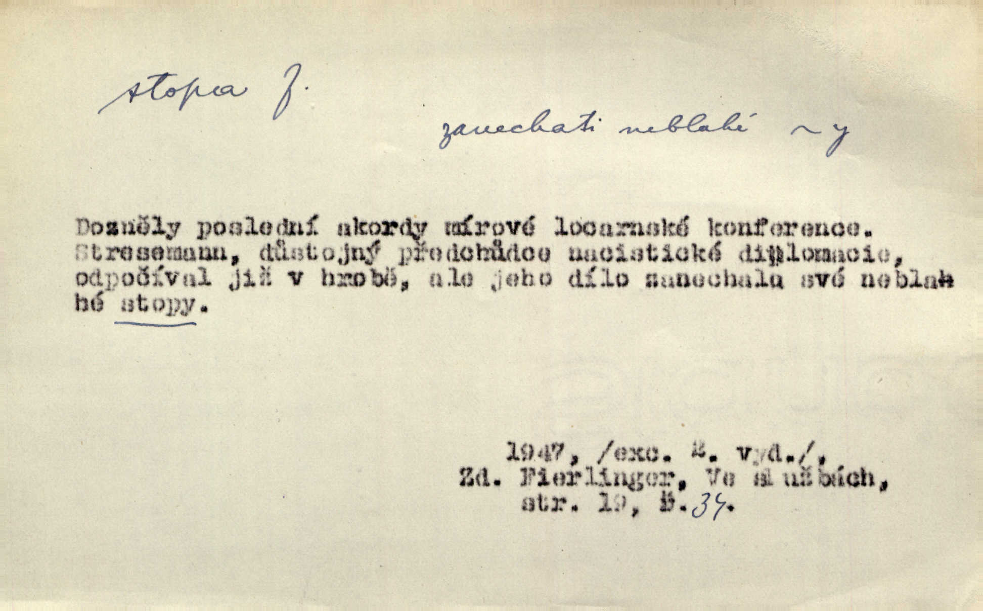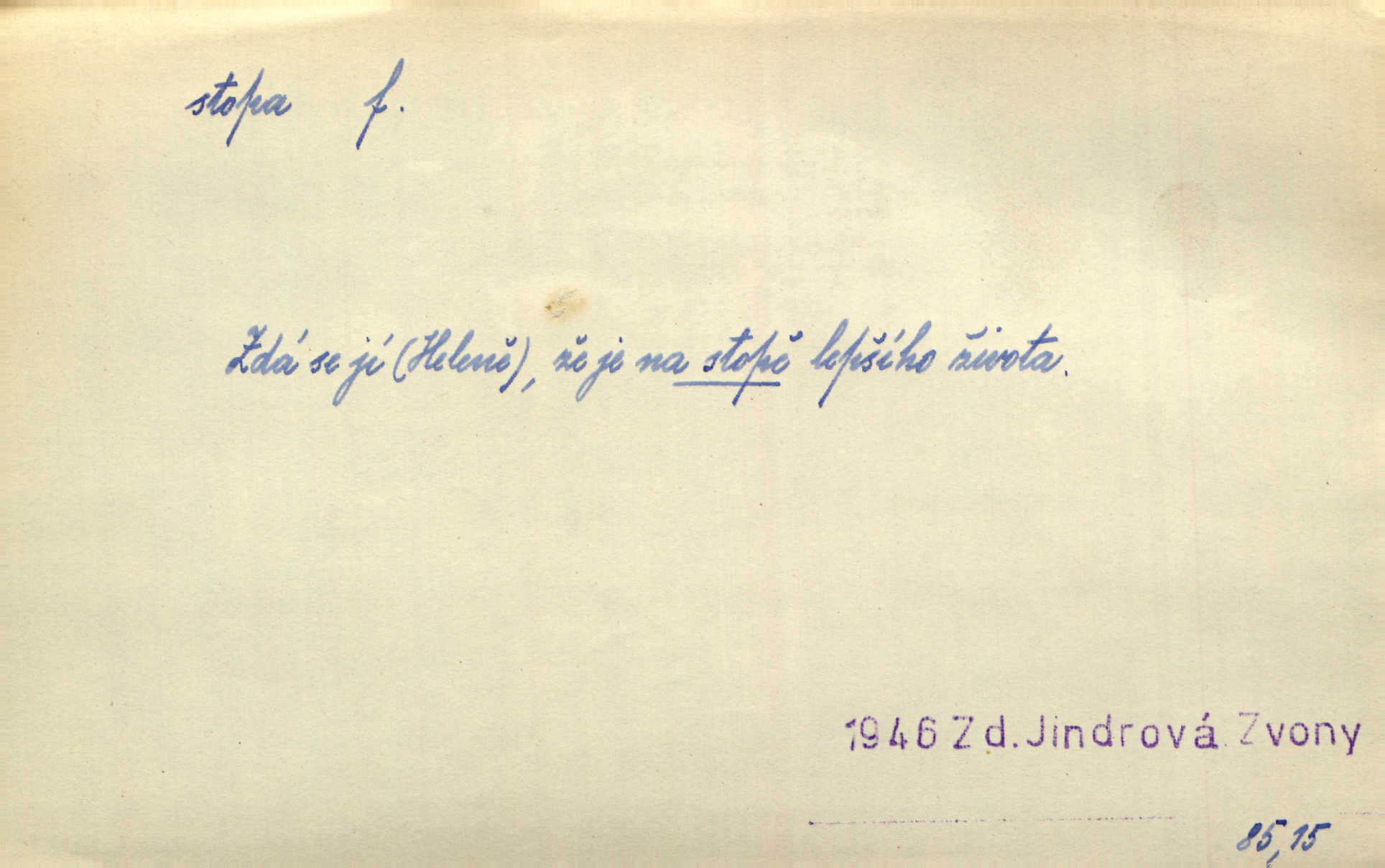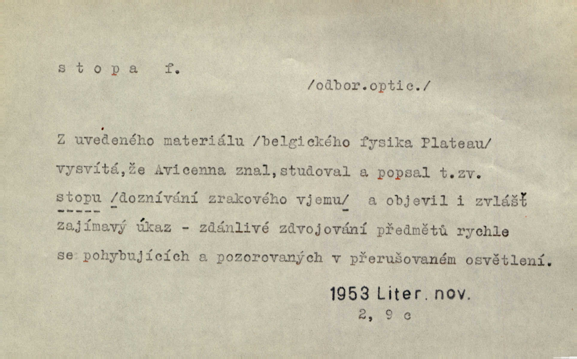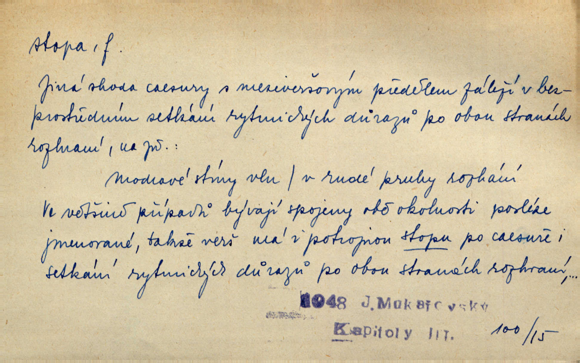 - stopa, -y f. otisk chodidla nohy na zemi, znatelný n. zjistitelný zůstatek po takovém otisku, šlépěj. „Vidíte tam tu šlépěj?“ řekl zasněžený muž a ukazoval na nějakou stopu asi šest metrů od kraje silnice. K. Čap. Spláchne déšť a setře vítr stopy kroků mých. Mácha. Scházel se schodů, vytlačuje svými mokrými botami stopy své po schodech. Havl. Jičínská pátračka nasadila do stopy služebního psa a ten sledoval stopu pachatelovu. Nár. p. Pes čenichá, má již stopu, chce štěkati. Prav. Ráno pak viděti na louce přečetné stopy koňských kopyt. Jir. A bylo vidět stopy, jak od psí nohy. Erb. Mysl. otisky spárů n. prstů lovné zvěře v měkké půdě n. na sněhu, podle nichž se určuje druh a velikost zvěře. D Dial. a zast. chodidlo. Punčochy v tetčiných botách nemají stop. Na stopy už nezbylo příze. Glaz. Kočičí stopou pohladit mladého krále, zalichotit se mu tlapou. Jir. D vůbec sled, znamení po něčí cestě, po někom n. něčem. Ohněm a krví červenaly se stopy jeho, kady byl s velikými houfy svých Němců a spojených s ním divokých Uhrů přitáhl [císař]. Tyl. Otec a matka radili se den co den, jak stopu zmizelého syna najíti. Zey. Ale věříte mi, že jsou [policisté] mi na stopě? Mach. Po pachateli nebylo stopy. Herb. Teď se půjdeme podívat po stopě zlého činu. Švan. Tatíček přišel její známosti na stopu. Preis. Slova jeho byla doopravdy míněna a vedla mne hned na stopu pravou. Zey. V treningu [krasobruslařů] má také pěkné držení a dobrou stopu Soukup. Lid. nov. Třebaže moderní vozy výborně drží stopu na silnici, přece na náledí nesmíte jezditi rychle. Lid. nov. Přen. Mladá literatura naše šla po stopách Vrchlického. Mach. D zbytek, zůstatek, znamení, památka po něčem. Viděla na cestě krvavé stopy ran Kristových. Něm. Tanečnice měly vytlačené stopy mastných ruk na zádech. Mach. Po každém soustu olízl nůž, aby na něm ani stopa mastnoty nezůstala. Lit. noviny. Důkladně omyla čelo a tváře od nejposlednější stopy pudru. Čap. Ch. Všude [na hradě] byly zřejmy stopy královské nádhery. Jir. V zářezech těch sloupů znamenal jsem stopy rudé a modré barvy. Jir. Za pět minut nebylo po párkách na talíři ani stopy. Šim. Její tvář pozbyla poslední stopy krásy. R. Svob. Ani nejmenší stopy jakési rozmrzelosti, tím méně hněvu nebylo lze spatřiti v obličeji mladého krále. Třeb. My po stopách dávné Etrurie bloudit budem. Zey. Rytířství, ač stopy jeho jsou starší než křesťanství, rozkvetlo neobyčejně krásně teprve ve středověku. Zey. Kronikář a archivář dbá, aby zůstala stopa po tom, co kladného bylo vykonáno. Rozhlas. U kněží neminul spor o monstrancí beze stopy. Jir. D Dial. cesta. Dostala se do hustého lesa, kde nebylo ani stopy ani světla. Něm. Nepouštěj se na vodu bez vesla a bez stopy do lesa. Baar. D někdejší délková míra, rovnající se přibližně délce lidského chodidla (31,6 cm). Je to Bor, téměř tři tisíce stop vysoký. Jir. Děcko pochová šest stop pod hřbitovní drn. A. Mrš. Byl muž vysoký dvanácte stop. John. Anglická stopa délka 30 48 cm. D Bot. stopy listové cevní svazky vstupující z listu do osy. Geom. stopa přímky průsečík přímky s rovinou (půdorysnou n. nárysnou). Metr. skupina slabik spojených v celek jedním přízvukem rytmickým, takt. Stopa přízvučná, časoměrná.