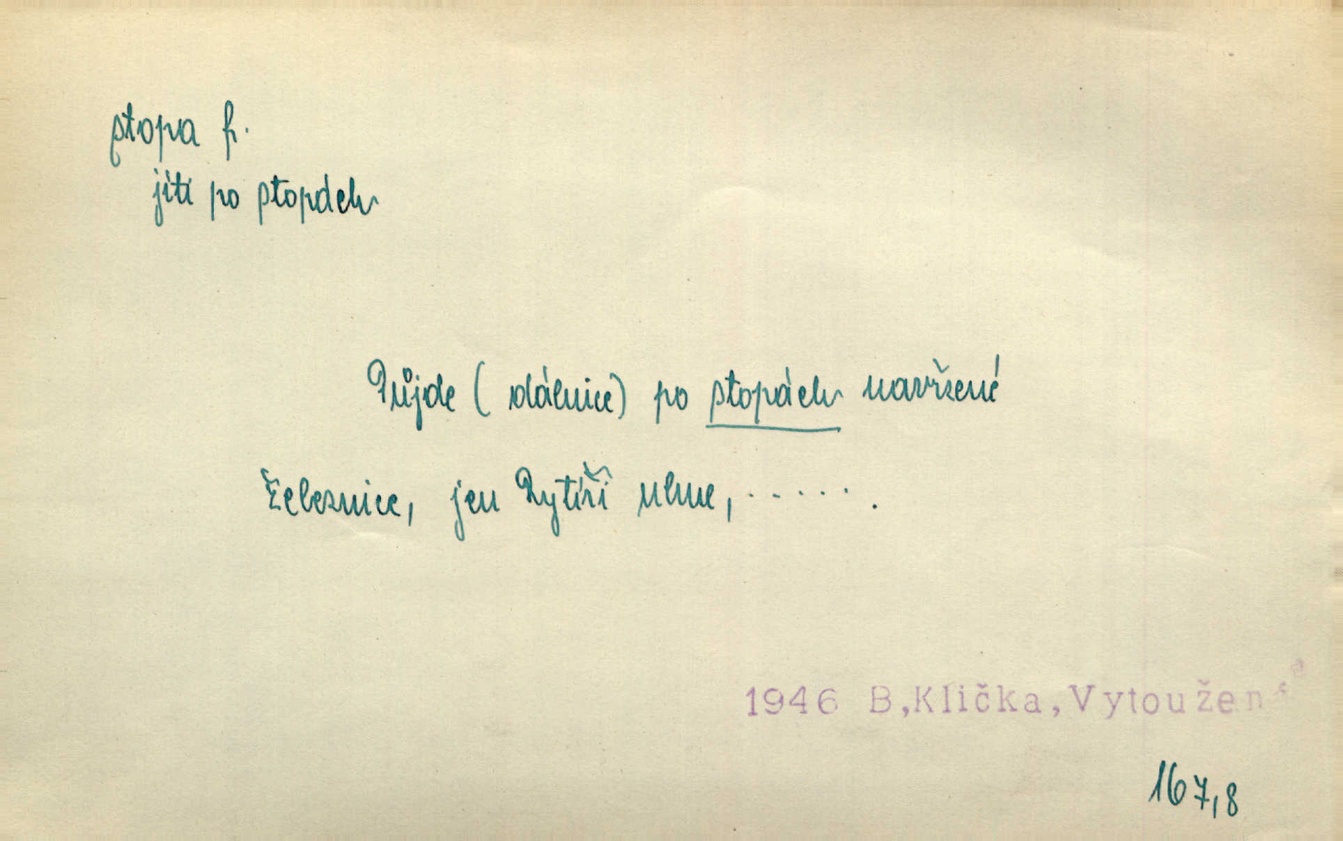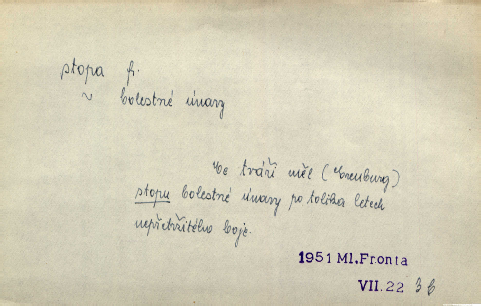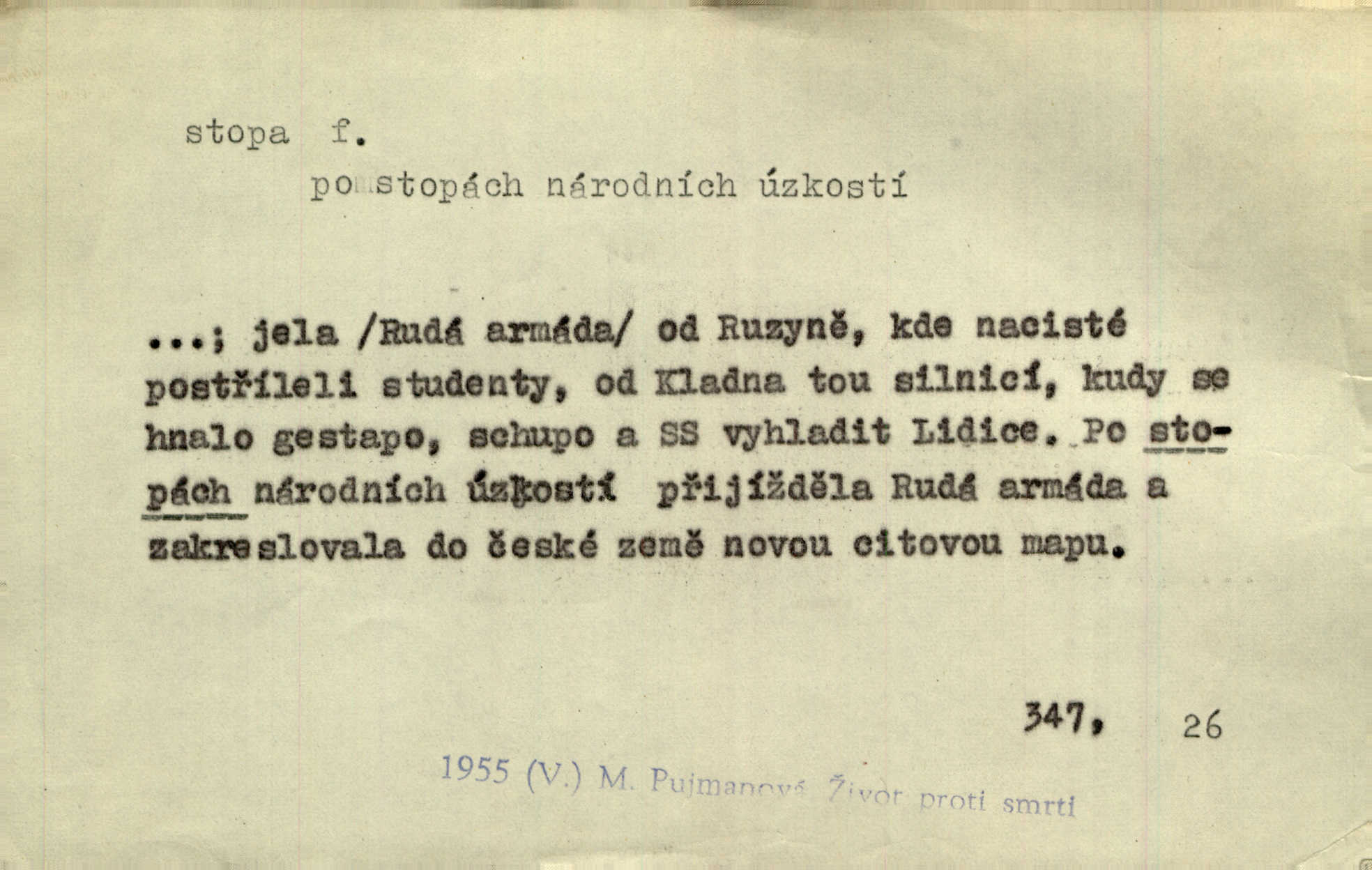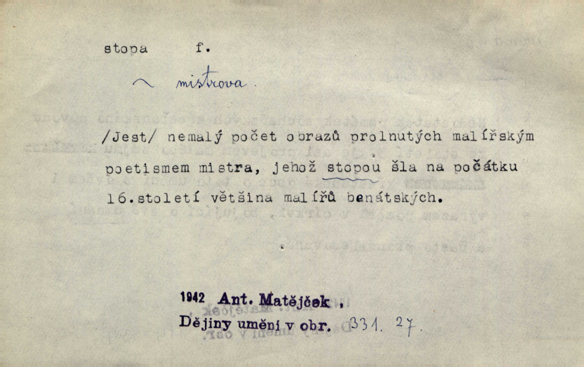 - stopa, -y f. otisk chodidla nohy na zemi, znatelný n. zjistitelný zůstatek po takovém otisku, šlépěj. „Vidíte tam tu šlépěj?“ řekl zasněžený muž a ukazoval na nějakou stopu asi šest metrů od kraje silnice. K. Čap. Spláchne déšť a setře vítr stopy kroků mých. Mácha. Scházel se schodů, vytlačuje svými mokrými botami stopy své po schodech. Havl. Jičínská pátračka nasadila do stopy služebního psa a ten sledoval stopu pachatelovu. Nár. p. Pes čenichá, má již stopu, chce štěkati. Prav. Ráno pak viděti na louce přečetné stopy koňských kopyt. Jir. A bylo vidět stopy, jak od psí nohy. Erb. Mysl. otisky spárů n. prstů lovné zvěře v měkké půdě n. na sněhu, podle nichž se určuje druh a velikost zvěře. D Dial. a zast. chodidlo. Punčochy v tetčiných botách nemají stop. Na stopy už nezbylo příze. Glaz. Kočičí stopou pohladit mladého krále, zalichotit se mu tlapou. Jir. D vůbec sled, znamení po něčí cestě, po někom n. něčem. Ohněm a krví červenaly se stopy jeho, kady byl s velikými houfy svých Němců a spojených s ním divokých Uhrů přitáhl [císař]. Tyl. Otec a matka radili se den co den, jak stopu zmizelého syna najíti. Zey. Ale věříte mi, že jsou [policisté] mi na stopě? Mach. Po pachateli nebylo stopy. Herb. Teď se půjdeme podívat po stopě zlého činu. Švan. Tatíček přišel její známosti na stopu. Preis. Slova jeho byla doopravdy míněna a vedla mne hned na stopu pravou. Zey. V treningu [krasobruslařů] má také pěkné držení a dobrou stopu Soukup. Lid. nov. Třebaže moderní vozy výborně drží stopu na silnici, přece na náledí nesmíte jezditi rychle. Lid. nov. Přen. Mladá literatura naše šla po stopách Vrchlického. Mach. D zbytek, zůstatek, znamení, památka po něčem. Viděla na cestě krvavé stopy ran Kristových. Něm. Tanečnice měly vytlačené stopy mastných ruk na zádech. Mach. Po každém soustu olízl nůž, aby na něm ani stopa mastnoty nezůstala. Lit. noviny. Důkladně omyla čelo a tváře od nejposlednější stopy pudru. Čap. Ch. Všude [na hradě] byly zřejmy stopy královské nádhery. Jir. V zářezech těch sloupů znamenal jsem stopy rudé a modré barvy. Jir. Za pět minut nebylo po párkách na talíři ani stopy. Šim. Její tvář pozbyla poslední stopy krásy. R. Svob. Ani nejmenší stopy jakési rozmrzelosti, tím méně hněvu nebylo lze spatřiti v obličeji mladého krále. Třeb. My po stopách dávné Etrurie bloudit budem. Zey. Rytířství, ač stopy jeho jsou starší než křesťanství, rozkvetlo neobyčejně krásně teprve ve středověku. Zey. Kronikář a archivář dbá, aby zůstala stopa po tom, co kladného bylo vykonáno. Rozhlas. U kněží neminul spor o monstrancí beze stopy. Jir. D Dial. cesta. Dostala se do hustého lesa, kde nebylo ani stopy ani světla. Něm. Nepouštěj se na vodu bez vesla a bez stopy do lesa. Baar. D někdejší délková míra, rovnající se přibližně délce lidského chodidla (31,6 cm). Je to Bor, téměř tři tisíce stop vysoký. Jir. Děcko pochová šest stop pod hřbitovní drn. A. Mrš. Byl muž vysoký dvanácte stop. John. Anglická stopa délka 30 48 cm. D Bot. stopy listové cevní svazky vstupující z listu do osy. Geom. stopa přímky průsečík přímky s rovinou (půdorysnou n. nárysnou). Metr. skupina slabik spojených v celek jedním přízvukem rytmickým, takt. Stopa přízvučná, časoměrná.