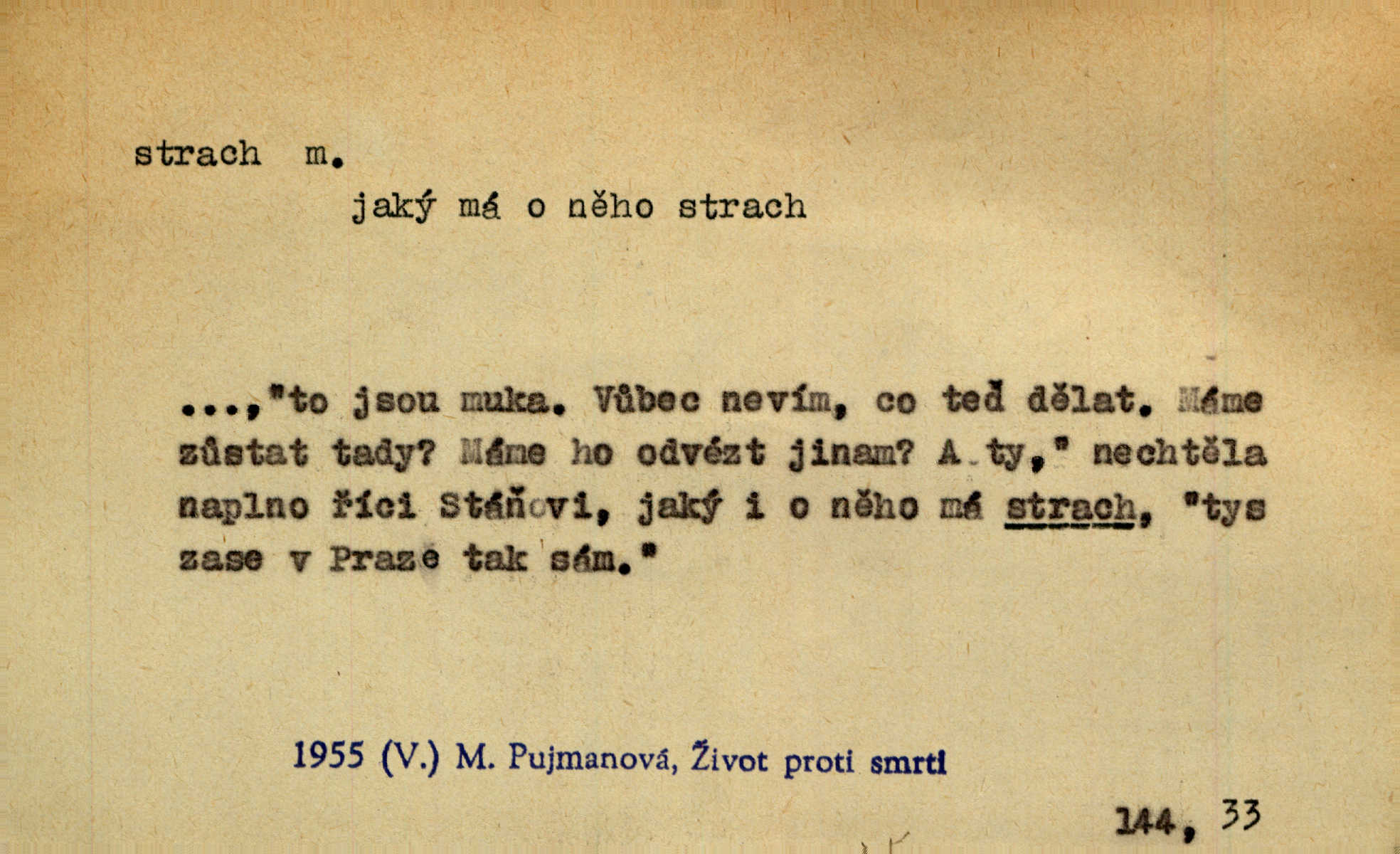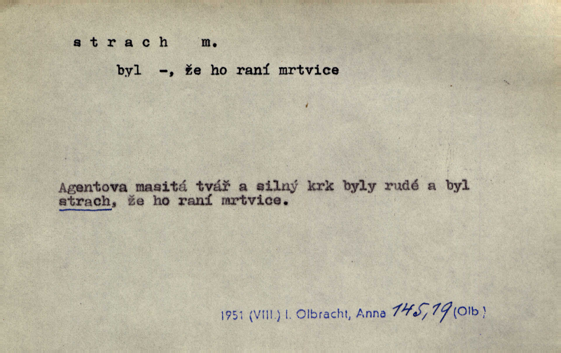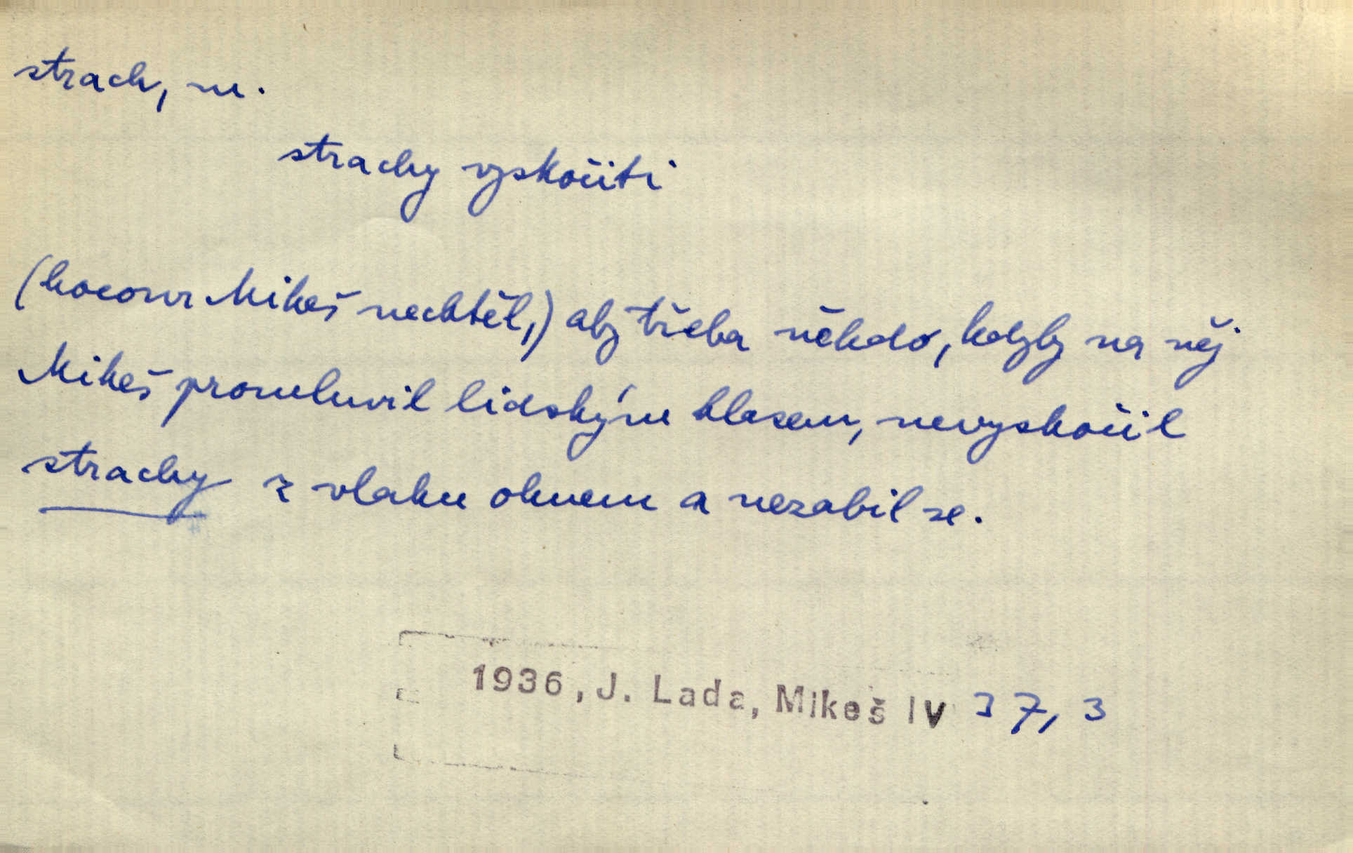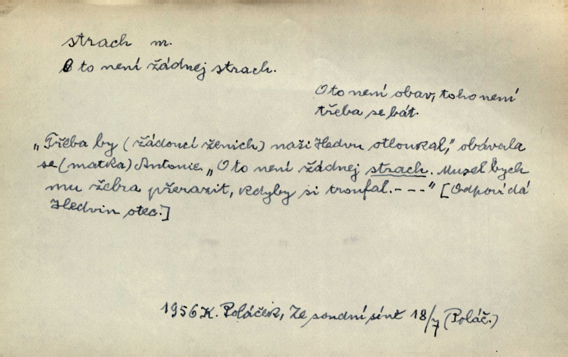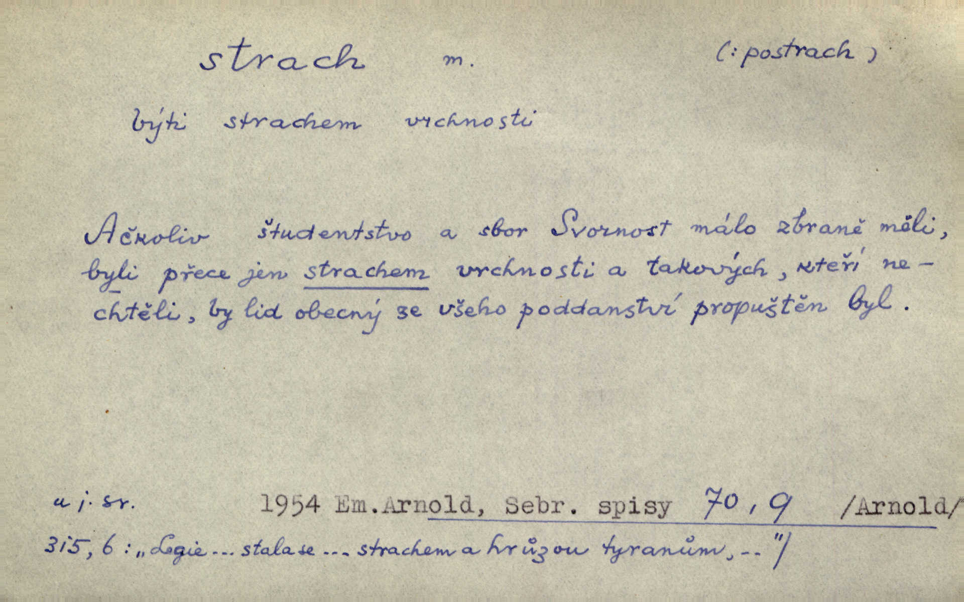 - strach, -u m. silná duševní stísněnost způsobená očekáváním něčeho nebezpečného n. nepříjemného, bázeň, obava. [Postava] náhle v děsnou příšeru se mění; strach nevýslovný z kostela mě pudí. Čech. Hrůza a strach lomcovaly jím jako nejsilnější zimnice. Herb. Dlouho stáli všickni zaraženi, děvečky se strachem třásly. Prav. Mladá dívka takořka strachy umírala. Třeb. Umřel také zcela přiměřeně charakteru svému, strachy celý bez sebe. Havl. Dvakrát přišla smrt — však jaké strachy! rabín zahrál vítězně s ní v šachy. Vrch. Strachem před husity opravovány rychle hradby městské téměř po celé říši německé. Pal. Měl panický strach před každou kritikou. Šmil. Napadá silně na nohu, ten nemusí mít strach z vojny. Jir. Má strach ze stěhování. Jir. Měla strach vytasiti se ihned zpříma s pravdou. Svět. Až strach z vás jde, jak jste se teď zamračil. Dyk. Blázen starý! To jsem mu nahnal strachu. Kam. A pro strach měli na Chodsku odjakživa uděláno, lekajíť se tam až teprve třetí den. Baar. Což já, já mám od strachu uděláno! Herb. Ale strach má velké oči, to jsem jednou zkusil nejlíp sám na sobě přehání, zveličuje skutečnost. Tůma. Po celou dobu se tam dole bál, plné kalhoty strachu měl. K. Čap. Jsou zadluženi až strach velmi. Ner. Nu tak, jaké štráchy a strachy, půjdete k nám do mlýna! Tůma. Žádné strachy na lachy zbytečné obavy! Her. D starost o někoho n. něco spojená se silnou úzkostí, obavou. Strach o budoucnost toho nenarozeného [dítěte] ji štval. Vach. Pantáta má o svého jedináčka strach. Jir. Když ho přepadl tajemný strach, že by přišel o službu, vystoupil mu až pot na čele. Herb. D Zř. kniž. osoba n. věc budící bázeň, postrach. Kníže Michajlovič Požarský, obnovitel své vlasti, strach a hrůza nepřátel Čel. Byltě to junák na slovo vzatý a strach Turkům. Něm.