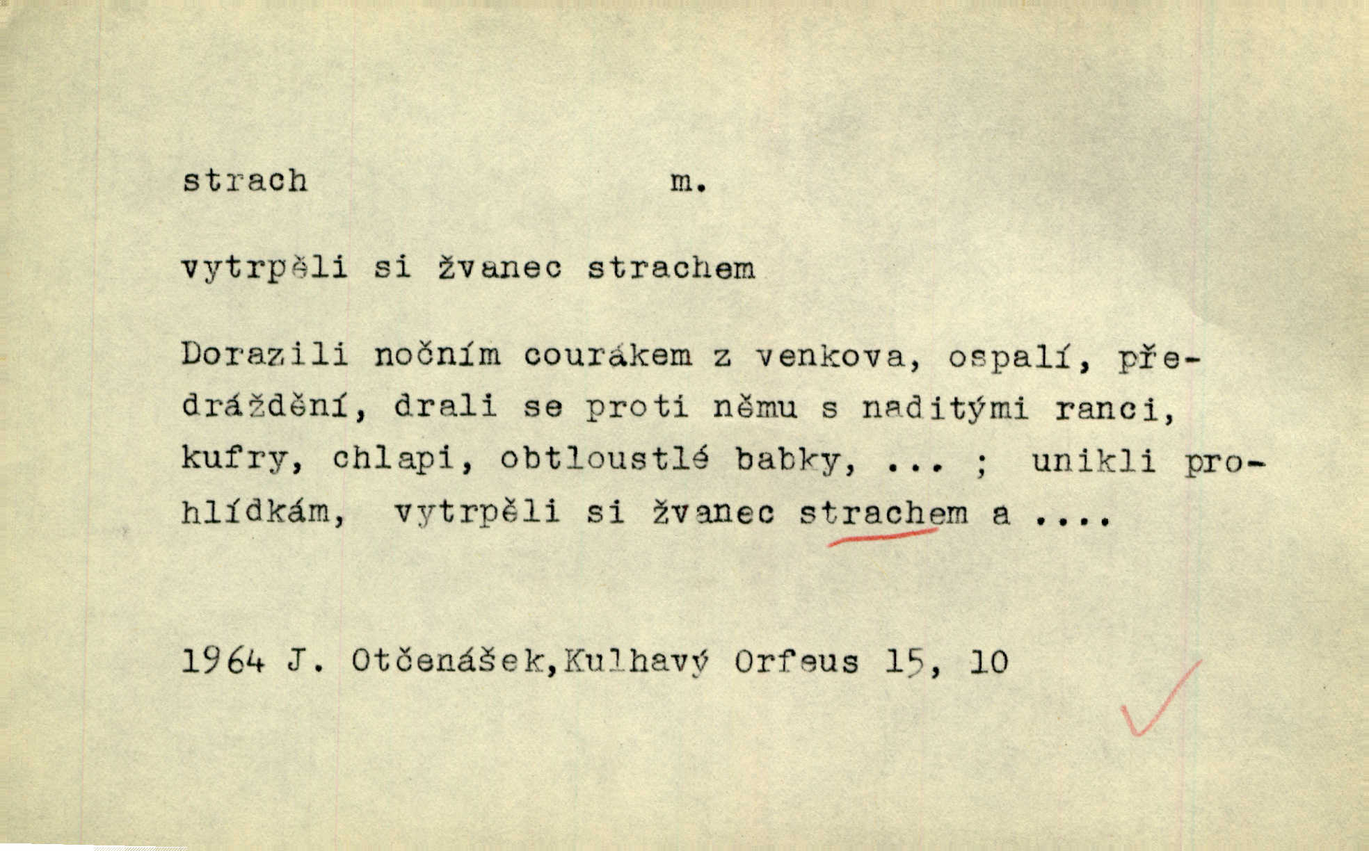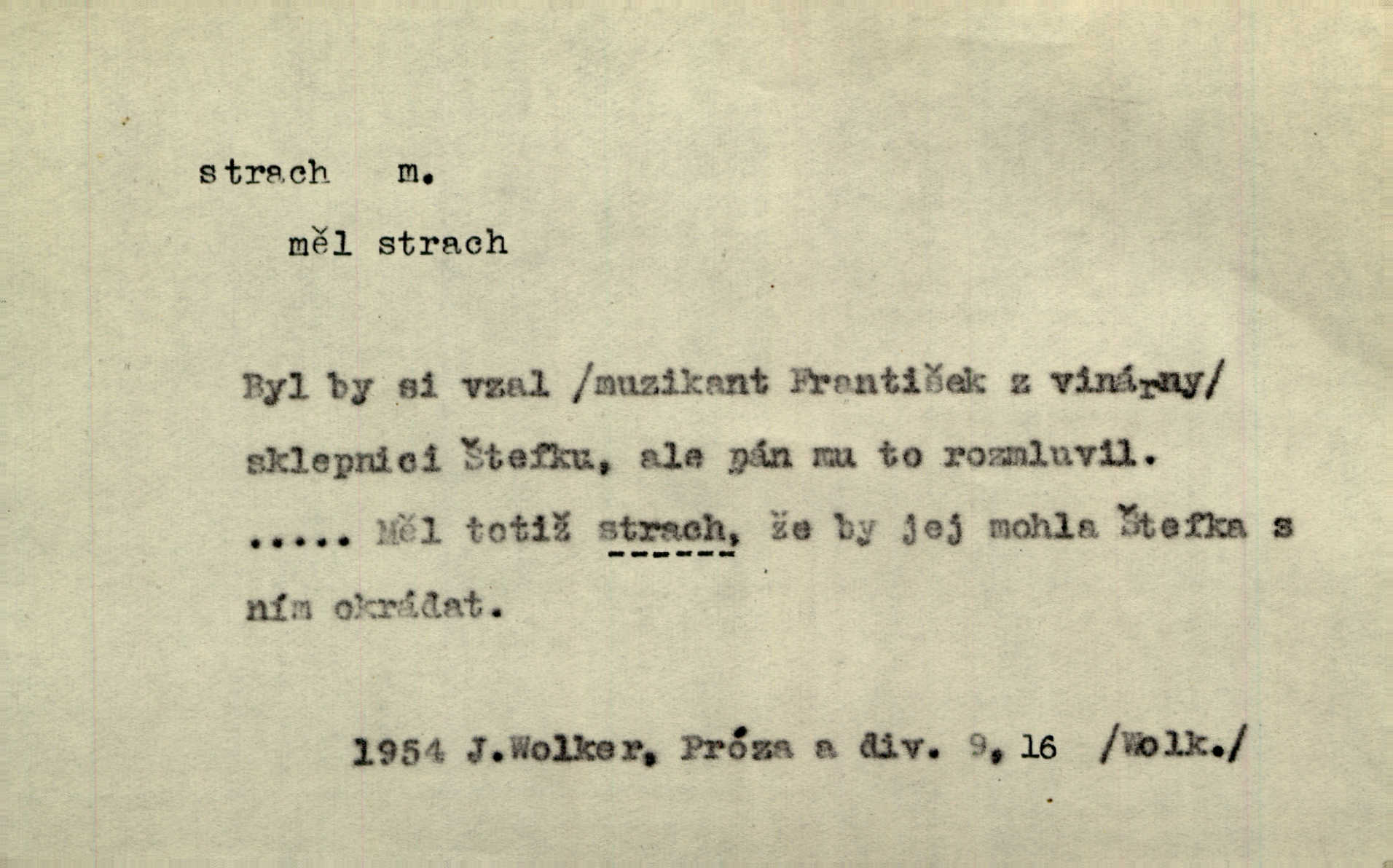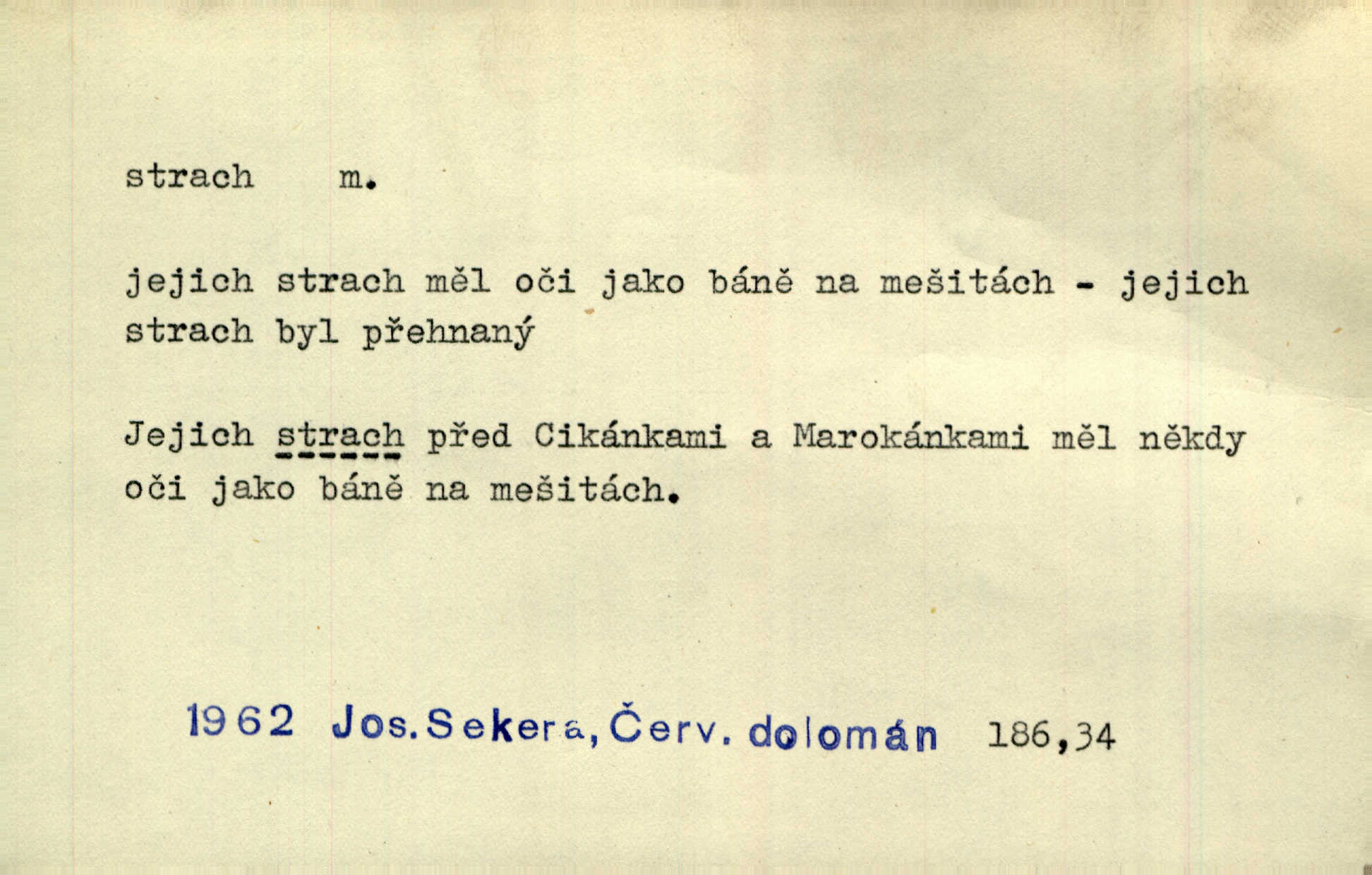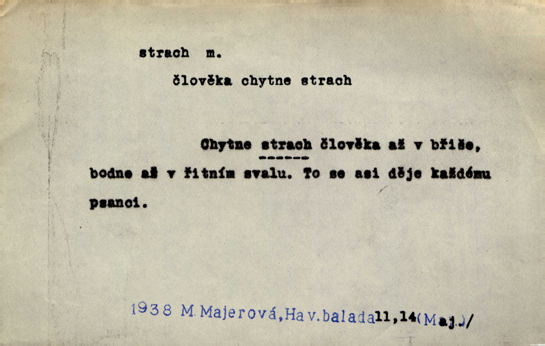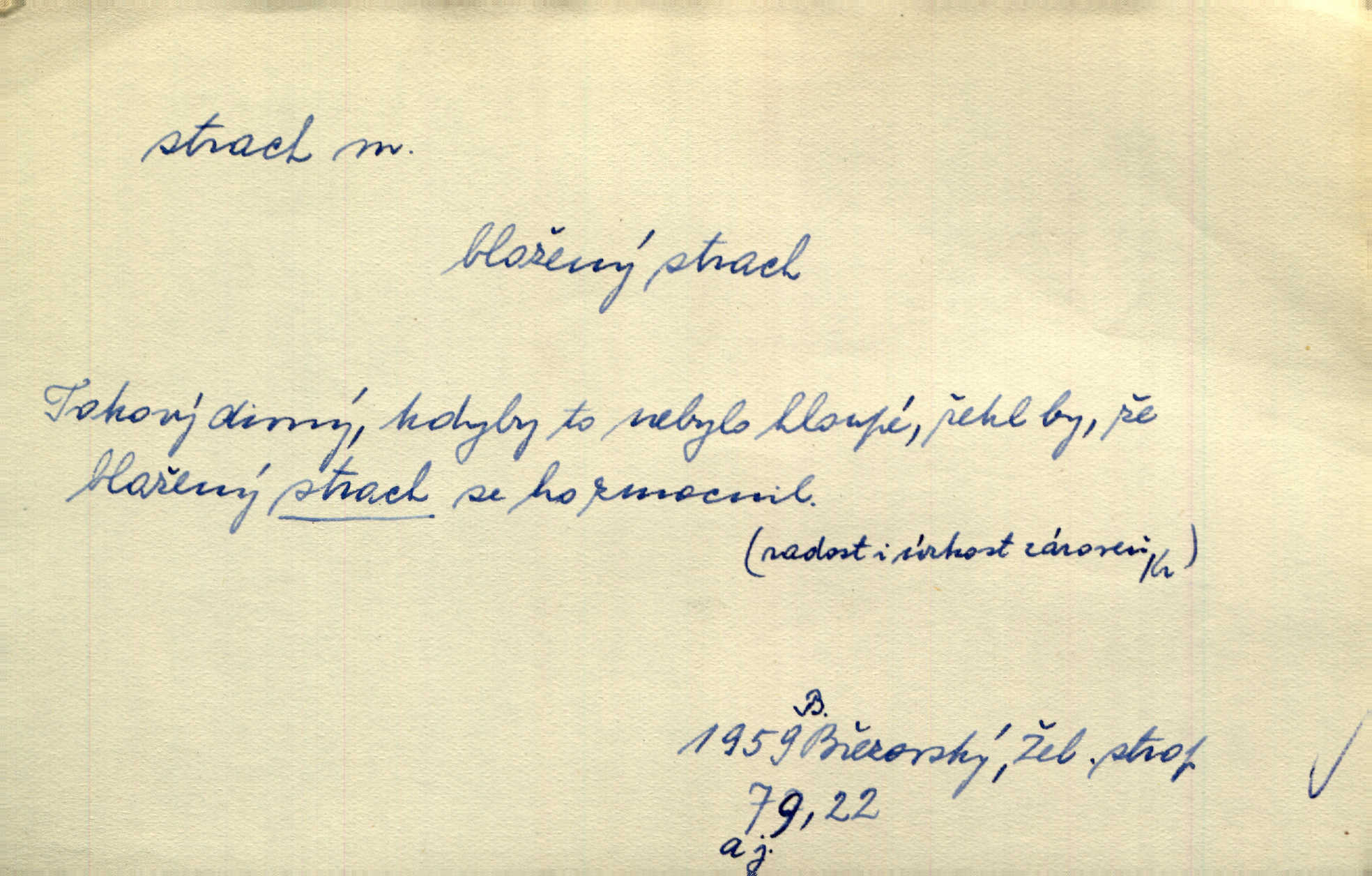 - strach, -u m. silná duševní stísněnost způsobená očekáváním něčeho nebezpečného n. nepříjemného, bázeň, obava. [Postava] náhle v děsnou příšeru se mění; strach nevýslovný z kostela mě pudí. Čech. Hrůza a strach lomcovaly jím jako nejsilnější zimnice. Herb. Dlouho stáli všickni zaraženi, děvečky se strachem třásly. Prav. Mladá dívka takořka strachy umírala. Třeb. Umřel také zcela přiměřeně charakteru svému, strachy celý bez sebe. Havl. Dvakrát přišla smrt — však jaké strachy! rabín zahrál vítězně s ní v šachy. Vrch. Strachem před husity opravovány rychle hradby městské téměř po celé říši německé. Pal. Měl panický strach před každou kritikou. Šmil. Napadá silně na nohu, ten nemusí mít strach z vojny. Jir. Má strach ze stěhování. Jir. Měla strach vytasiti se ihned zpříma s pravdou. Svět. Až strach z vás jde, jak jste se teď zamračil. Dyk. Blázen starý! To jsem mu nahnal strachu. Kam. A pro strach měli na Chodsku odjakživa uděláno, lekajíť se tam až teprve třetí den. Baar. Což já, já mám od strachu uděláno! Herb. Ale strach má velké oči, to jsem jednou zkusil nejlíp sám na sobě přehání, zveličuje skutečnost. Tůma. Po celou dobu se tam dole bál, plné kalhoty strachu měl. K. Čap. Jsou zadluženi až strach velmi. Ner. Nu tak, jaké štráchy a strachy, půjdete k nám do mlýna! Tůma. Žádné strachy na lachy zbytečné obavy! Her. D starost o někoho n. něco spojená se silnou úzkostí, obavou. Strach o budoucnost toho nenarozeného [dítěte] ji štval. Vach. Pantáta má o svého jedináčka strach. Jir. Když ho přepadl tajemný strach, že by přišel o službu, vystoupil mu až pot na čele. Herb. D Zř. kniž. osoba n. věc budící bázeň, postrach. Kníže Michajlovič Požarský, obnovitel své vlasti, strach a hrůza nepřátel Čel. Byltě to junák na slovo vzatý a strach Turkům. Něm.