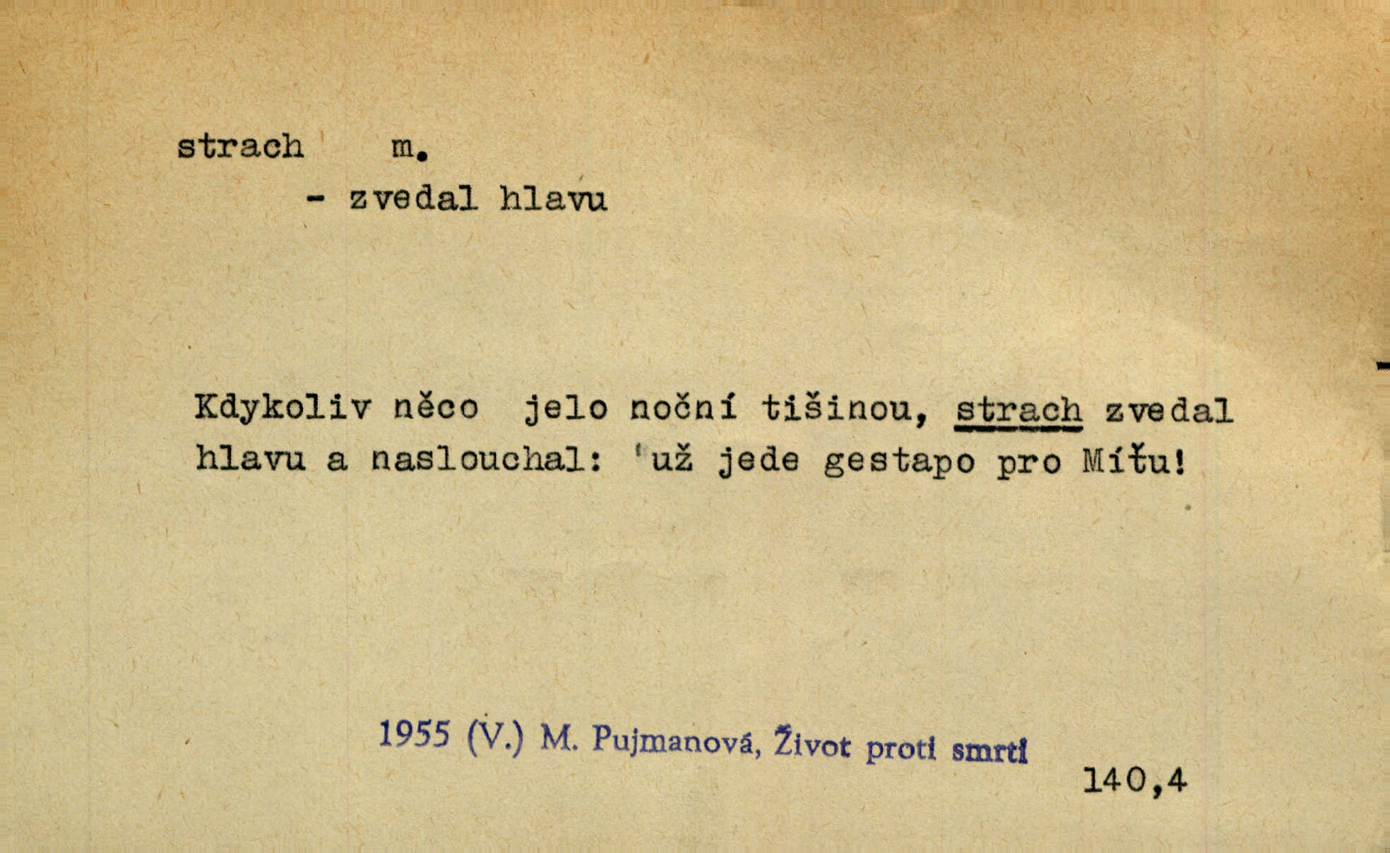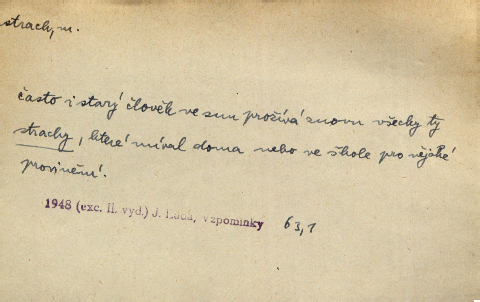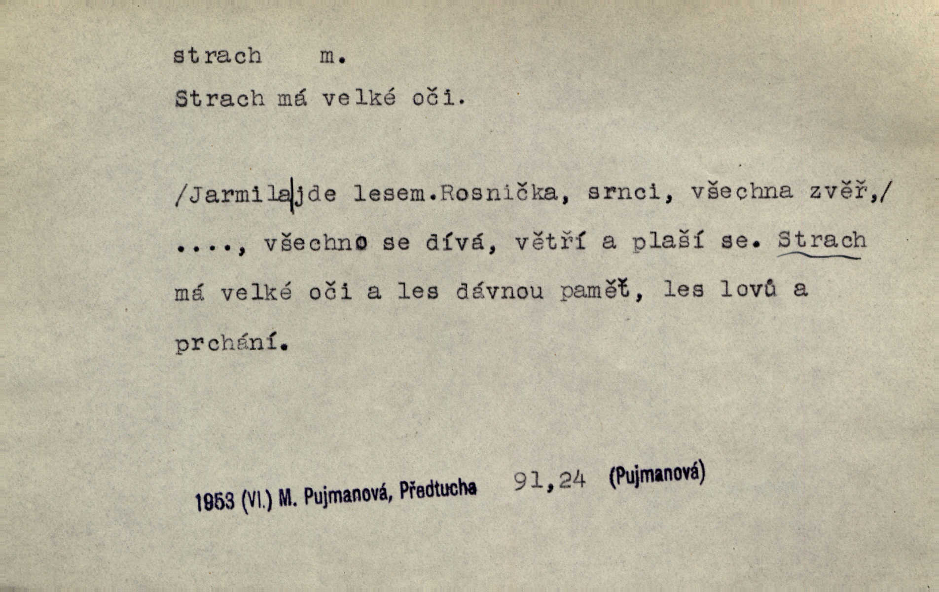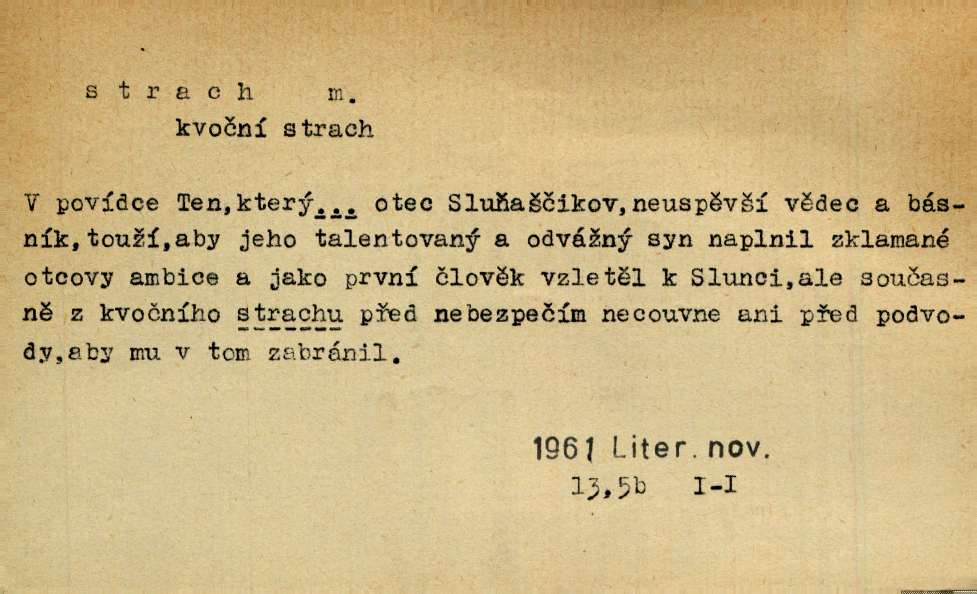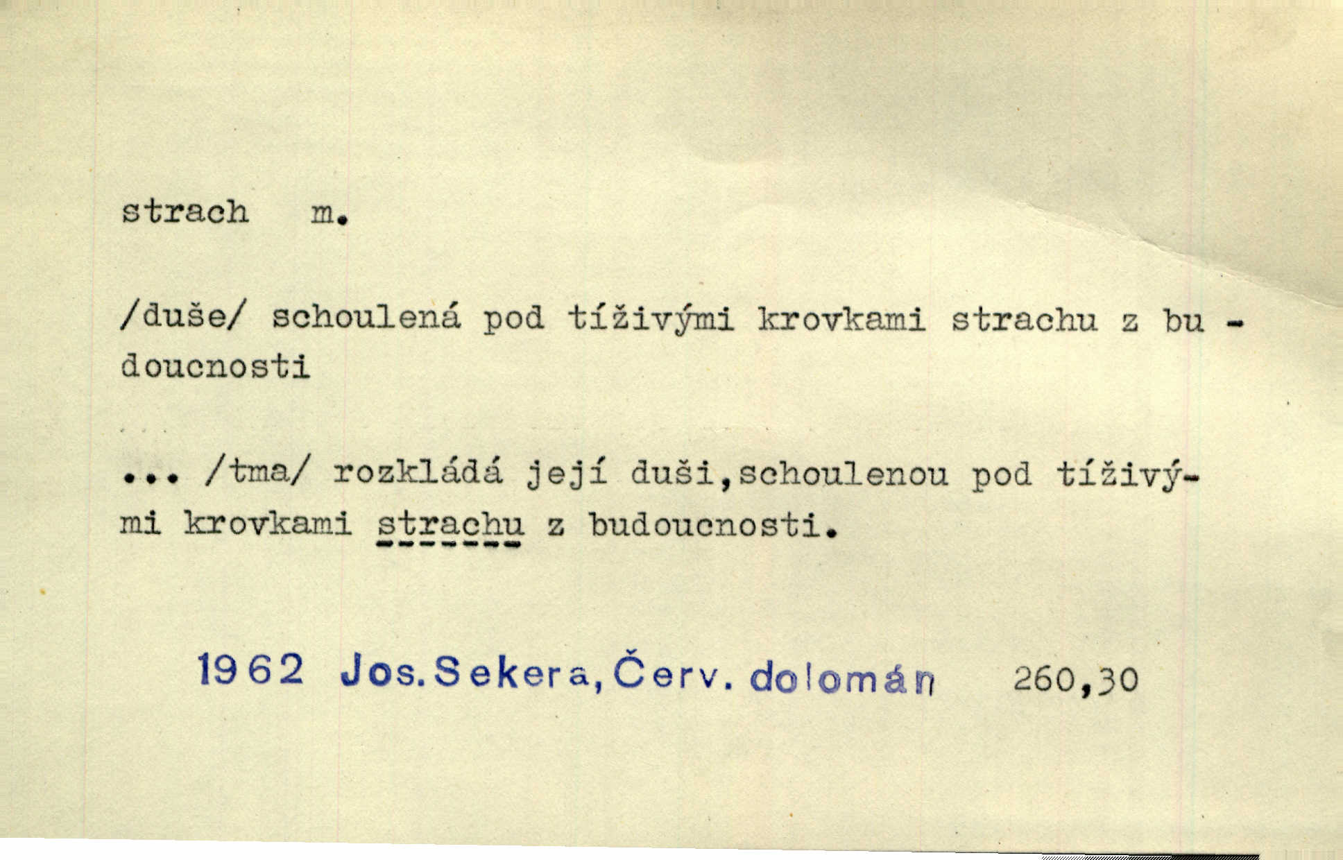 - strach, -u m. silná duševní stísněnost způsobená očekáváním něčeho nebezpečného n. nepříjemného, bázeň, obava. [Postava] náhle v děsnou příšeru se mění; strach nevýslovný z kostela mě pudí. Čech. Hrůza a strach lomcovaly jím jako nejsilnější zimnice. Herb. Dlouho stáli všickni zaraženi, děvečky se strachem třásly. Prav. Mladá dívka takořka strachy umírala. Třeb. Umřel také zcela přiměřeně charakteru svému, strachy celý bez sebe. Havl. Dvakrát přišla smrt — však jaké strachy! rabín zahrál vítězně s ní v šachy. Vrch. Strachem před husity opravovány rychle hradby městské téměř po celé říši německé. Pal. Měl panický strach před každou kritikou. Šmil. Napadá silně na nohu, ten nemusí mít strach z vojny. Jir. Má strach ze stěhování. Jir. Měla strach vytasiti se ihned zpříma s pravdou. Svět. Až strach z vás jde, jak jste se teď zamračil. Dyk. Blázen starý! To jsem mu nahnal strachu. Kam. A pro strach měli na Chodsku odjakživa uděláno, lekajíť se tam až teprve třetí den. Baar. Což já, já mám od strachu uděláno! Herb. Ale strach má velké oči, to jsem jednou zkusil nejlíp sám na sobě přehání, zveličuje skutečnost. Tůma. Po celou dobu se tam dole bál, plné kalhoty strachu měl. K. Čap. Jsou zadluženi až strach velmi. Ner. Nu tak, jaké štráchy a strachy, půjdete k nám do mlýna! Tůma. Žádné strachy na lachy zbytečné obavy! Her. D starost o někoho n. něco spojená se silnou úzkostí, obavou. Strach o budoucnost toho nenarozeného [dítěte] ji štval. Vach. Pantáta má o svého jedináčka strach. Jir. Když ho přepadl tajemný strach, že by přišel o službu, vystoupil mu až pot na čele. Herb. D Zř. kniž. osoba n. věc budící bázeň, postrach. Kníže Michajlovič Požarský, obnovitel své vlasti, strach a hrůza nepřátel Čel. Byltě to junák na slovo vzatý a strach Turkům. Něm.