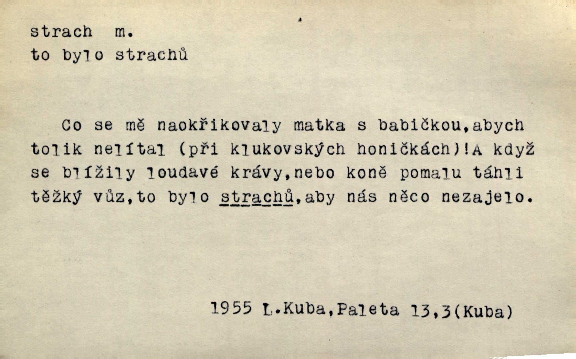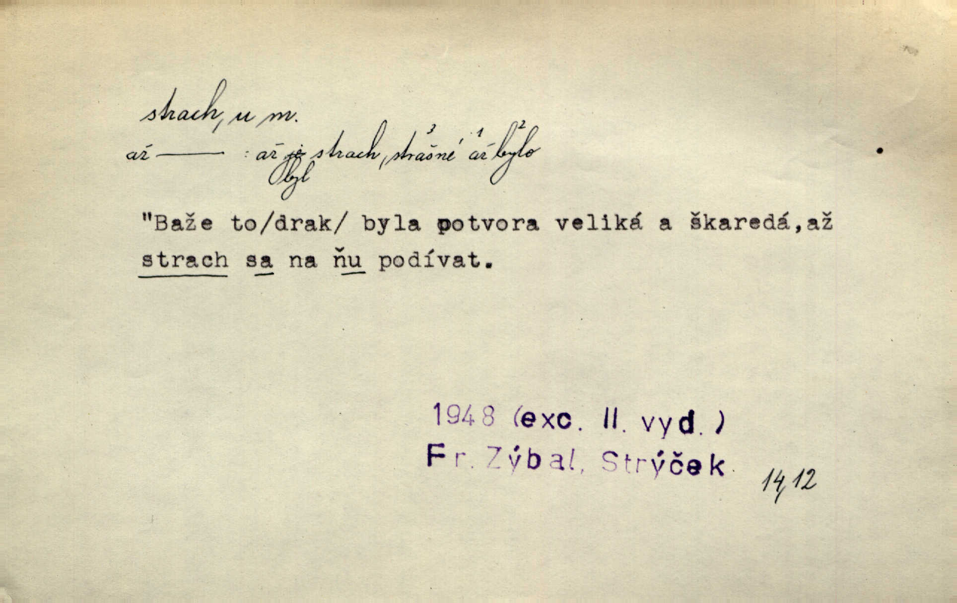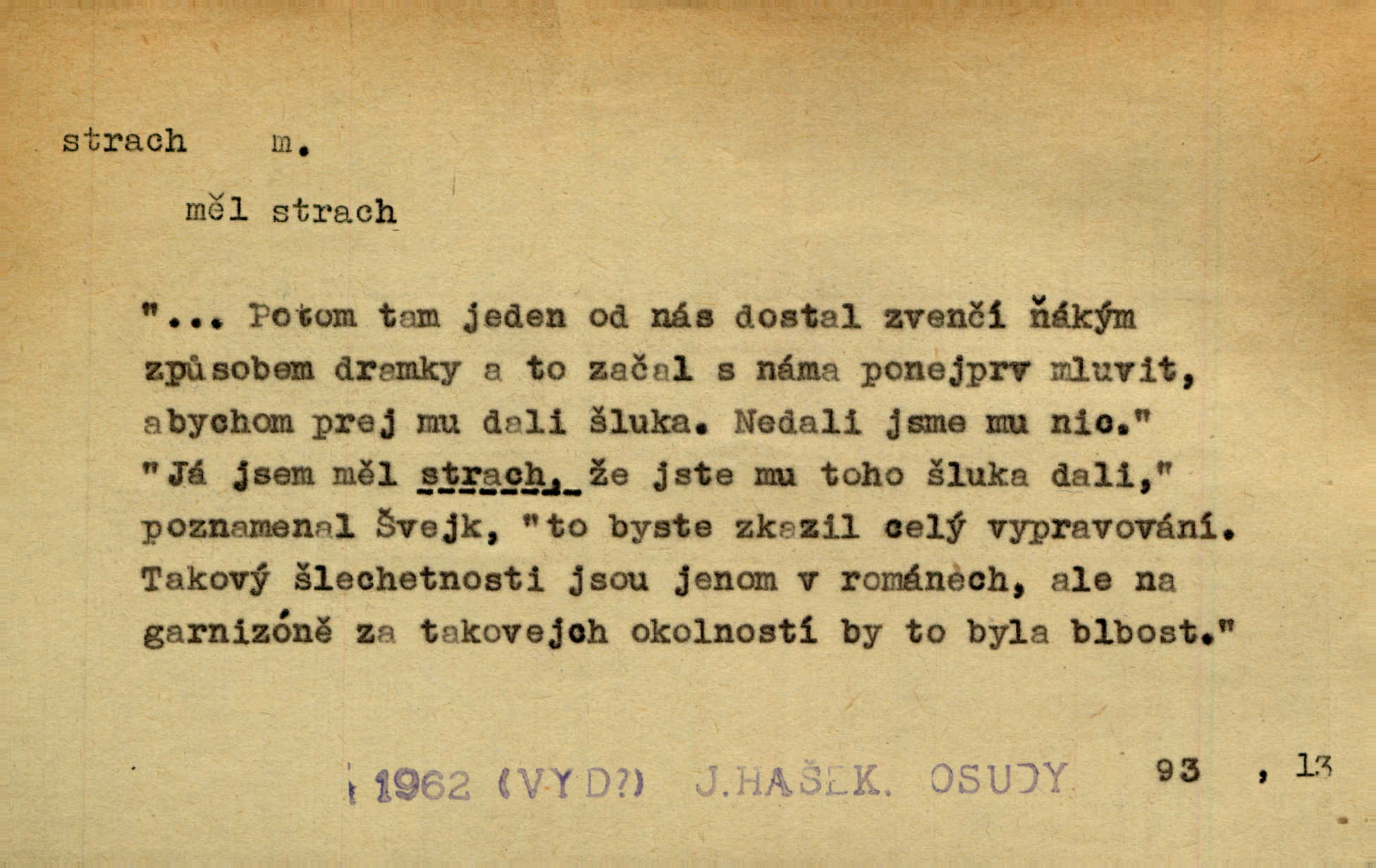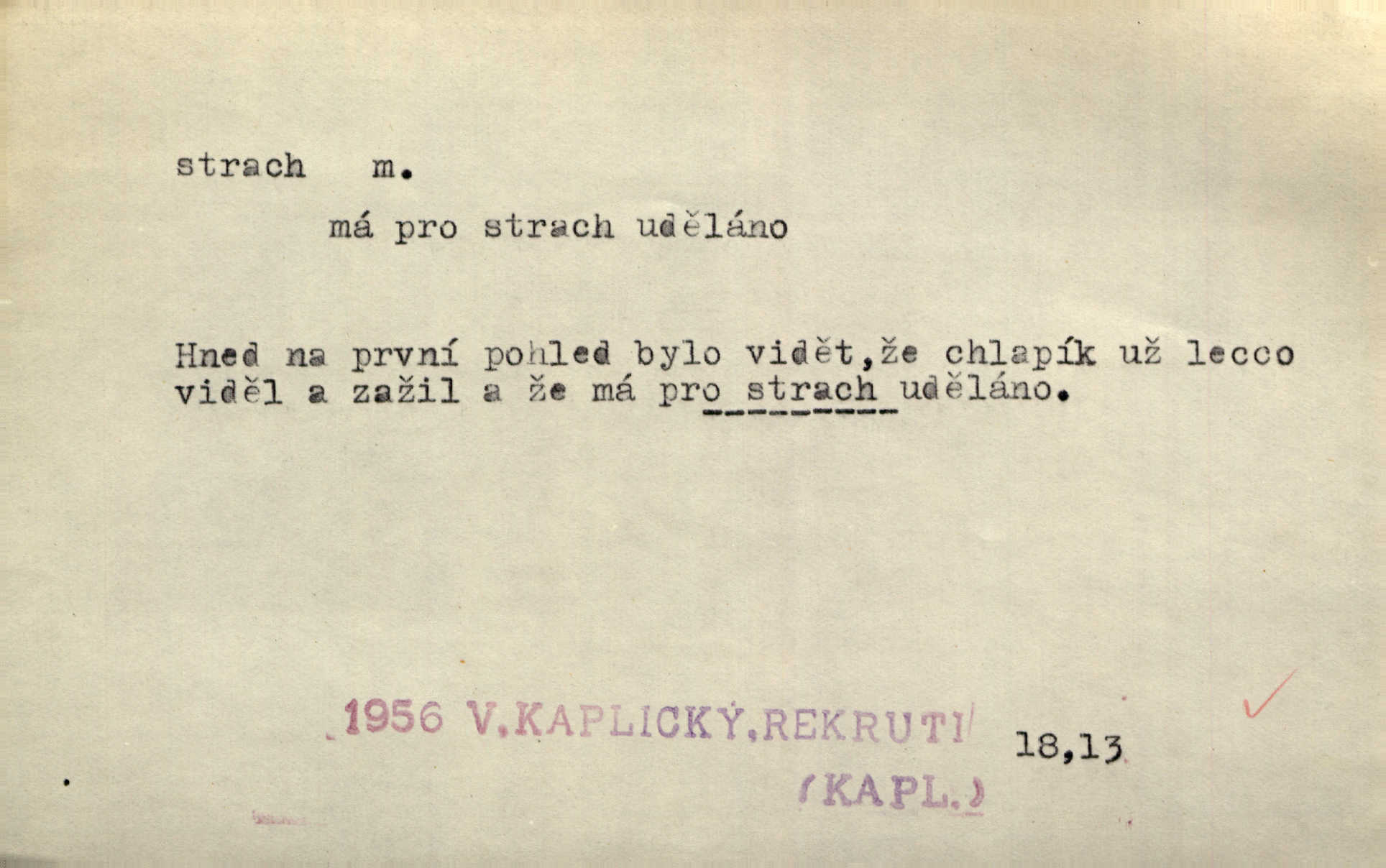 - strach, -u m. silná duševní stísněnost způsobená očekáváním něčeho nebezpečného n. nepříjemného, bázeň, obava. [Postava] náhle v děsnou příšeru se mění; strach nevýslovný z kostela mě pudí. Čech. Hrůza a strach lomcovaly jím jako nejsilnější zimnice. Herb. Dlouho stáli všickni zaraženi, děvečky se strachem třásly. Prav. Mladá dívka takořka strachy umírala. Třeb. Umřel také zcela přiměřeně charakteru svému, strachy celý bez sebe. Havl. Dvakrát přišla smrt — však jaké strachy! rabín zahrál vítězně s ní v šachy. Vrch. Strachem před husity opravovány rychle hradby městské téměř po celé říši německé. Pal. Měl panický strach před každou kritikou. Šmil. Napadá silně na nohu, ten nemusí mít strach z vojny. Jir. Má strach ze stěhování. Jir. Měla strach vytasiti se ihned zpříma s pravdou. Svět. Až strach z vás jde, jak jste se teď zamračil. Dyk. Blázen starý! To jsem mu nahnal strachu. Kam. A pro strach měli na Chodsku odjakživa uděláno, lekajíť se tam až teprve třetí den. Baar. Což já, já mám od strachu uděláno! Herb. Ale strach má velké oči, to jsem jednou zkusil nejlíp sám na sobě přehání, zveličuje skutečnost. Tůma. Po celou dobu se tam dole bál, plné kalhoty strachu měl. K. Čap. Jsou zadluženi až strach velmi. Ner. Nu tak, jaké štráchy a strachy, půjdete k nám do mlýna! Tůma. Žádné strachy na lachy zbytečné obavy! Her. D starost o někoho n. něco spojená se silnou úzkostí, obavou. Strach o budoucnost toho nenarozeného [dítěte] ji štval. Vach. Pantáta má o svého jedináčka strach. Jir. Když ho přepadl tajemný strach, že by přišel o službu, vystoupil mu až pot na čele. Herb. D Zř. kniž. osoba n. věc budící bázeň, postrach. Kníže Michajlovič Požarský, obnovitel své vlasti, strach a hrůza nepřátel Čel. Byltě to junák na slovo vzatý a strach Turkům. Něm.