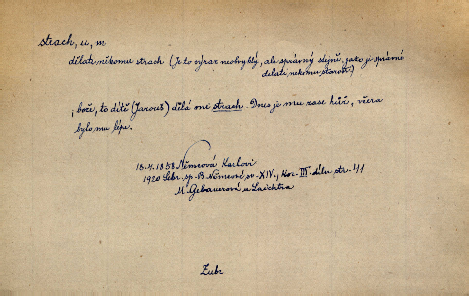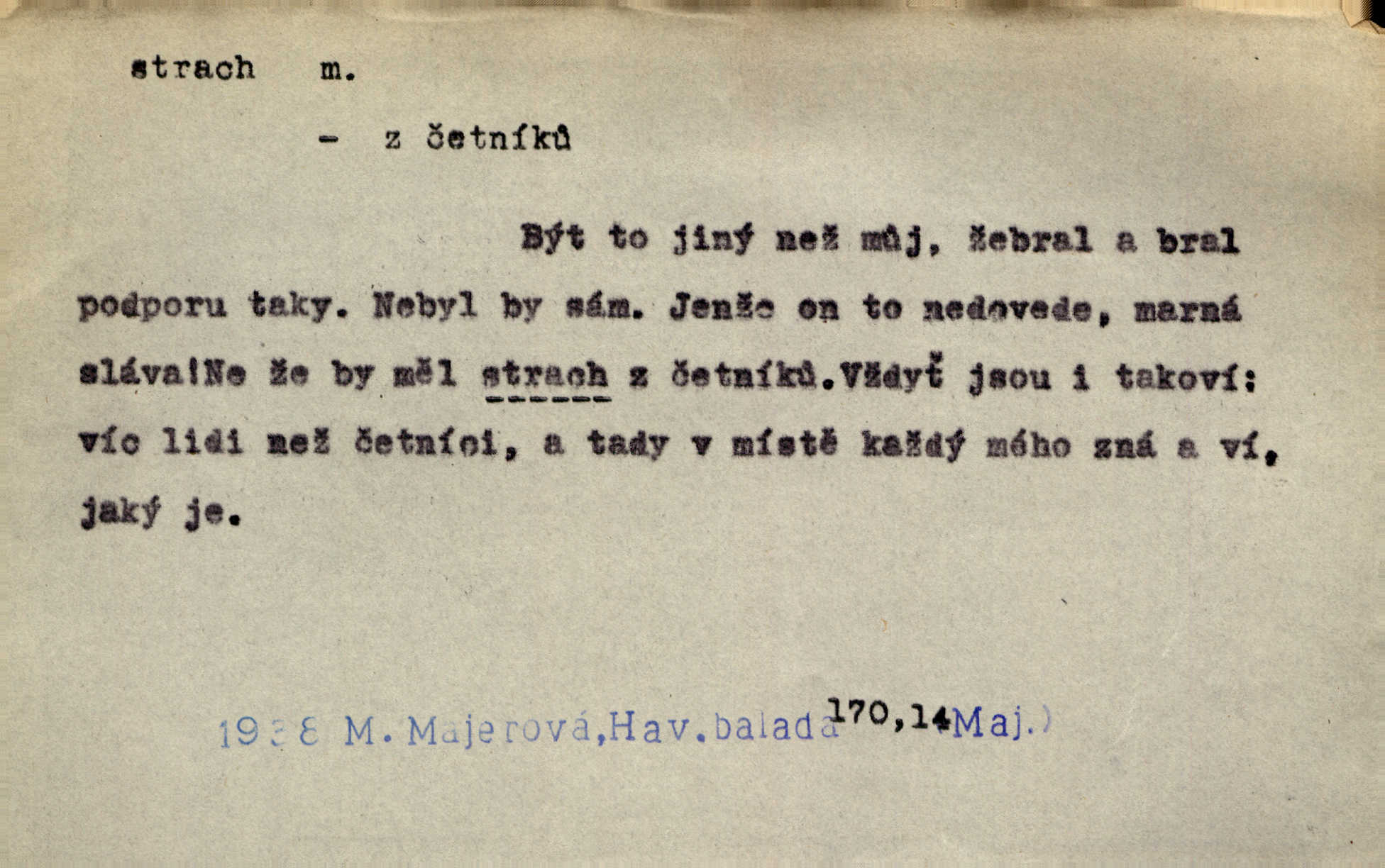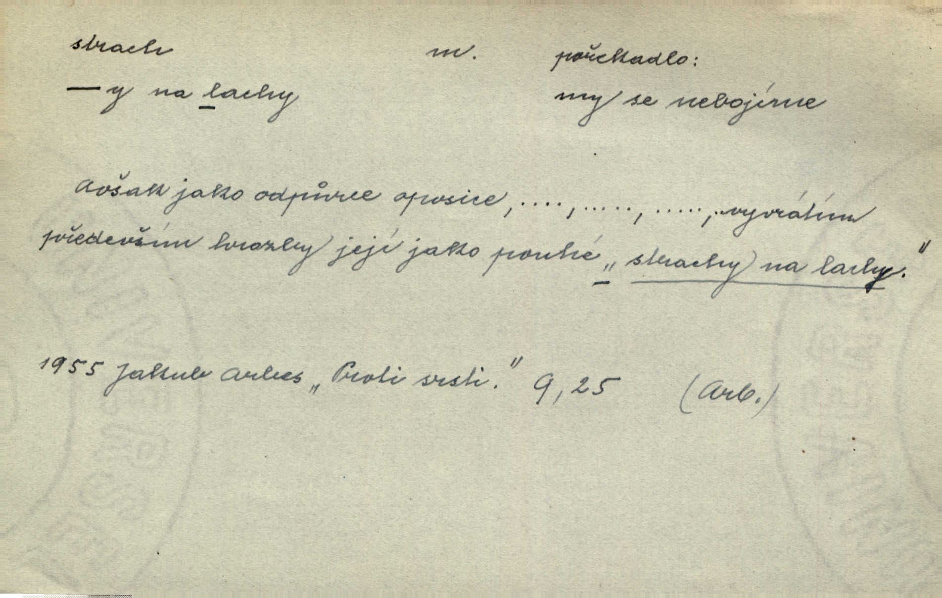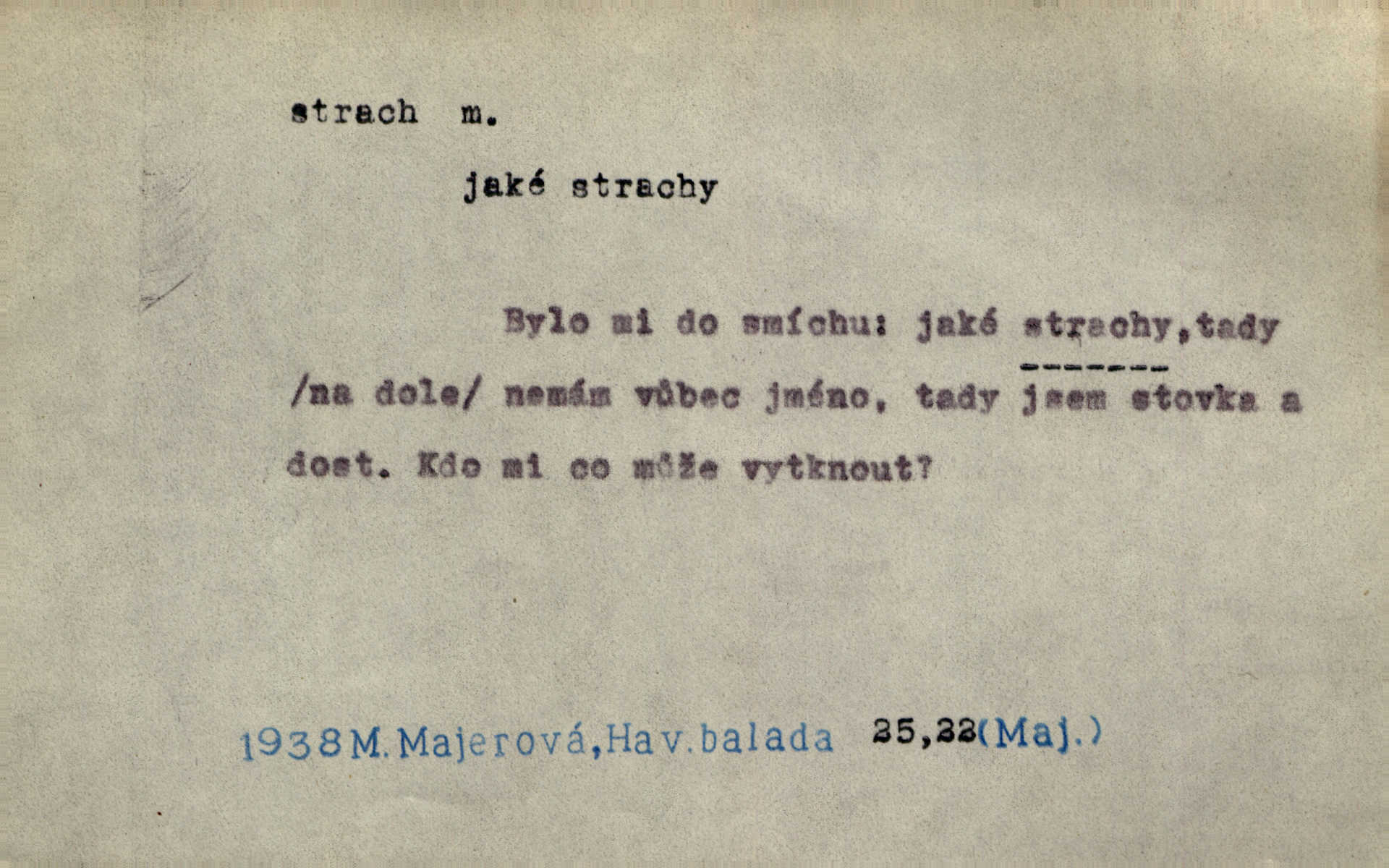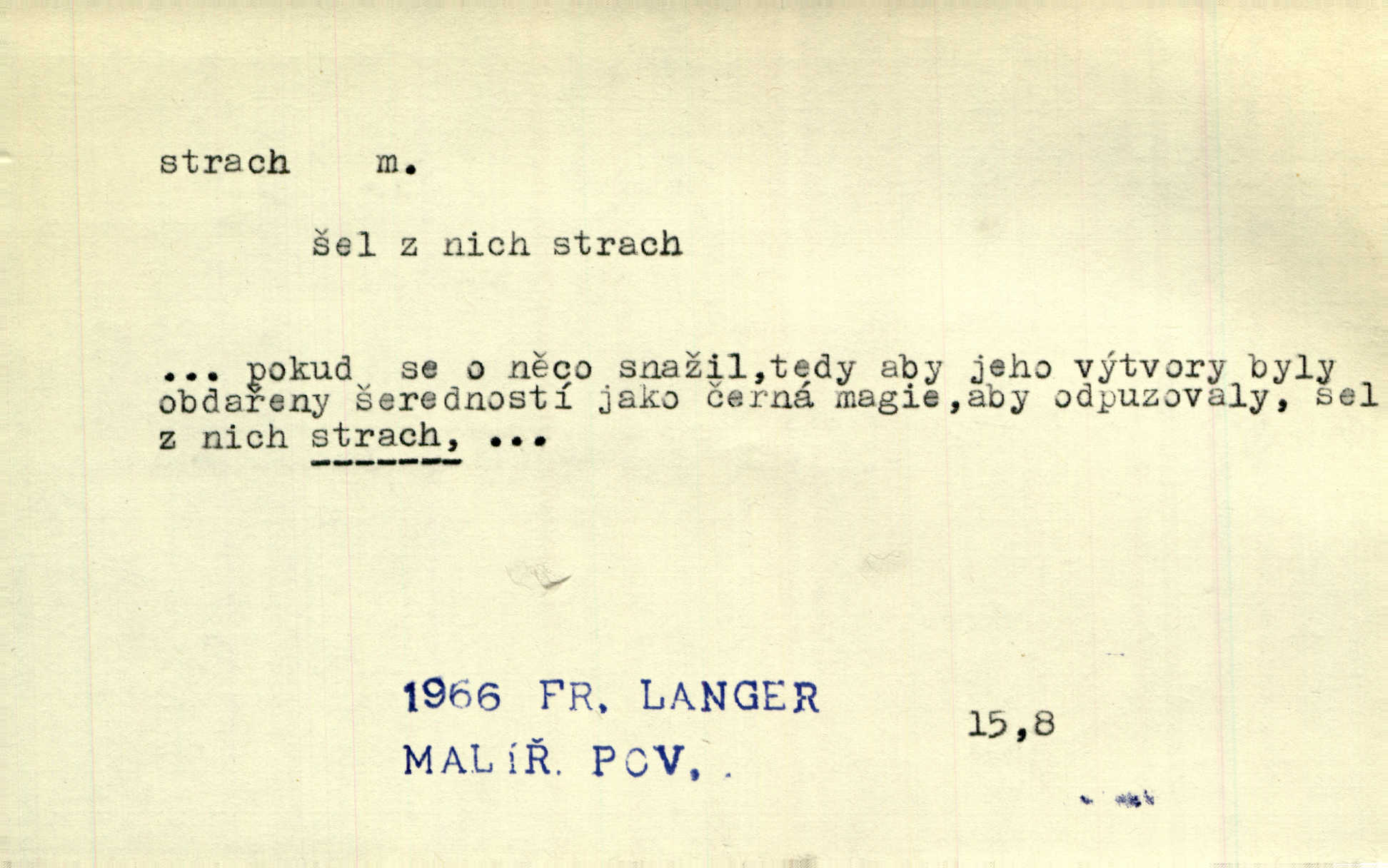 - strach, -u m. silná duševní stísněnost způsobená očekáváním něčeho nebezpečného n. nepříjemného, bázeň, obava. [Postava] náhle v děsnou příšeru se mění; strach nevýslovný z kostela mě pudí. Čech. Hrůza a strach lomcovaly jím jako nejsilnější zimnice. Herb. Dlouho stáli všickni zaraženi, děvečky se strachem třásly. Prav. Mladá dívka takořka strachy umírala. Třeb. Umřel také zcela přiměřeně charakteru svému, strachy celý bez sebe. Havl. Dvakrát přišla smrt — však jaké strachy! rabín zahrál vítězně s ní v šachy. Vrch. Strachem před husity opravovány rychle hradby městské téměř po celé říši německé. Pal. Měl panický strach před každou kritikou. Šmil. Napadá silně na nohu, ten nemusí mít strach z vojny. Jir. Má strach ze stěhování. Jir. Měla strach vytasiti se ihned zpříma s pravdou. Svět. Až strach z vás jde, jak jste se teď zamračil. Dyk. Blázen starý! To jsem mu nahnal strachu. Kam. A pro strach měli na Chodsku odjakživa uděláno, lekajíť se tam až teprve třetí den. Baar. Což já, já mám od strachu uděláno! Herb. Ale strach má velké oči, to jsem jednou zkusil nejlíp sám na sobě přehání, zveličuje skutečnost. Tůma. Po celou dobu se tam dole bál, plné kalhoty strachu měl. K. Čap. Jsou zadluženi až strach velmi. Ner. Nu tak, jaké štráchy a strachy, půjdete k nám do mlýna! Tůma. Žádné strachy na lachy zbytečné obavy! Her. D starost o někoho n. něco spojená se silnou úzkostí, obavou. Strach o budoucnost toho nenarozeného [dítěte] ji štval. Vach. Pantáta má o svého jedináčka strach. Jir. Když ho přepadl tajemný strach, že by přišel o službu, vystoupil mu až pot na čele. Herb. D Zř. kniž. osoba n. věc budící bázeň, postrach. Kníže Michajlovič Požarský, obnovitel své vlasti, strach a hrůza nepřátel Čel. Byltě to junák na slovo vzatý a strach Turkům. Něm.