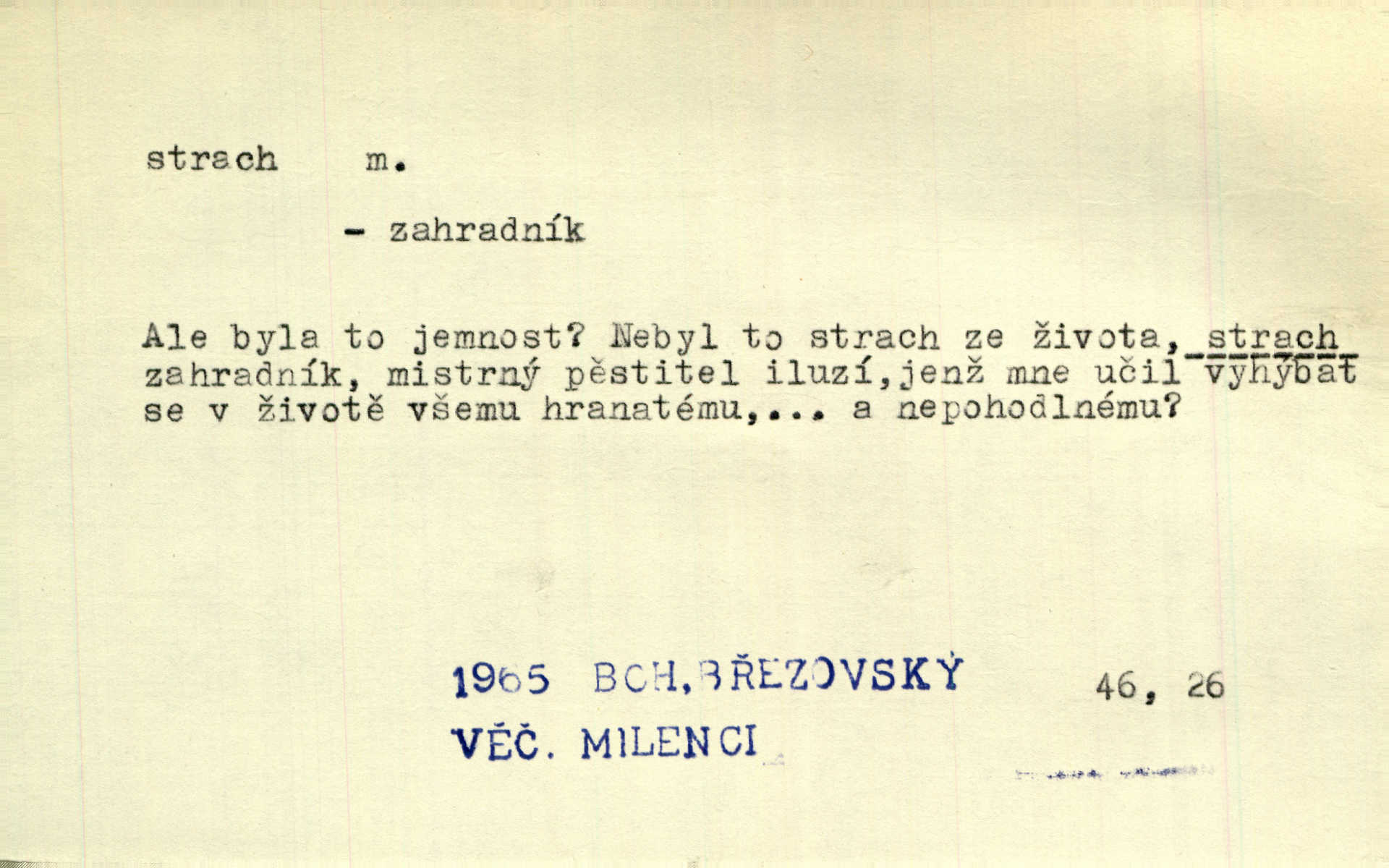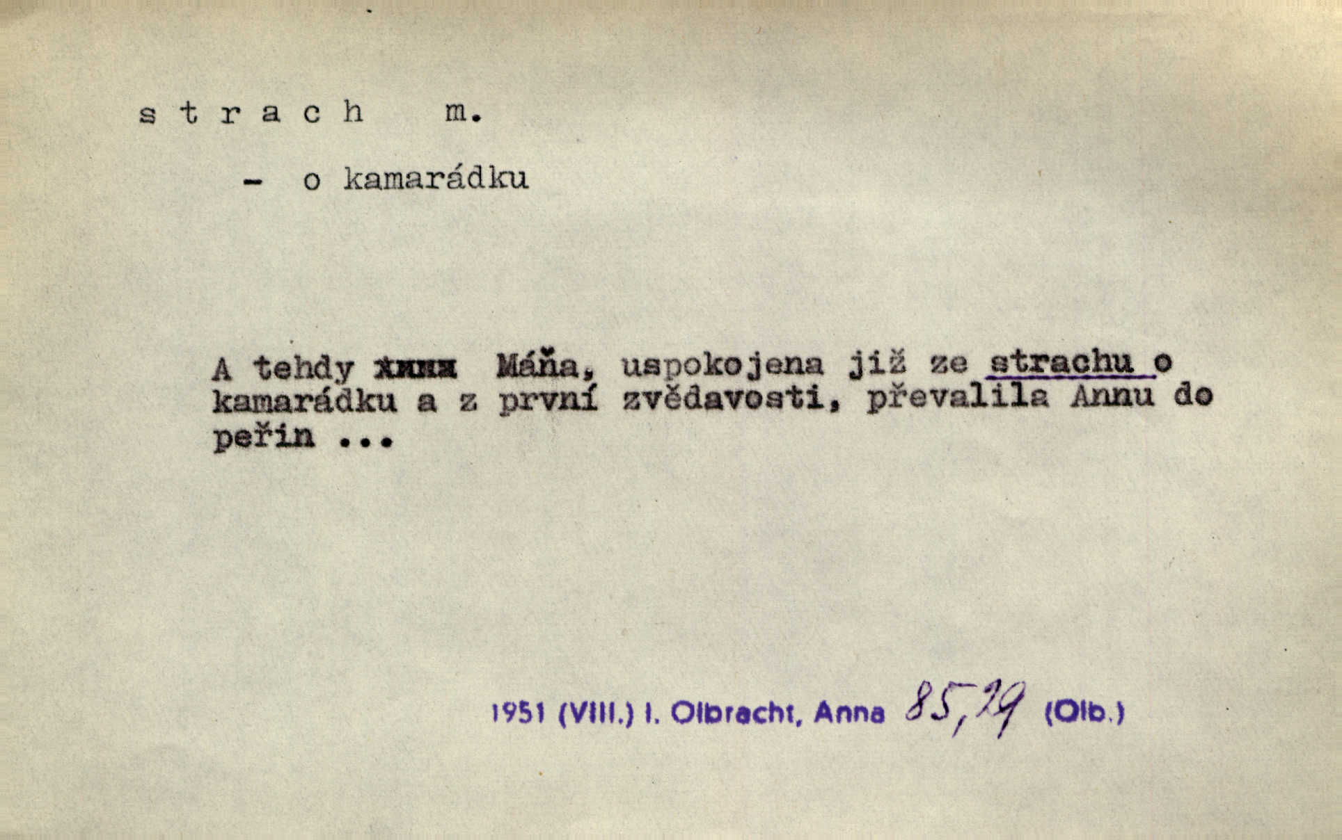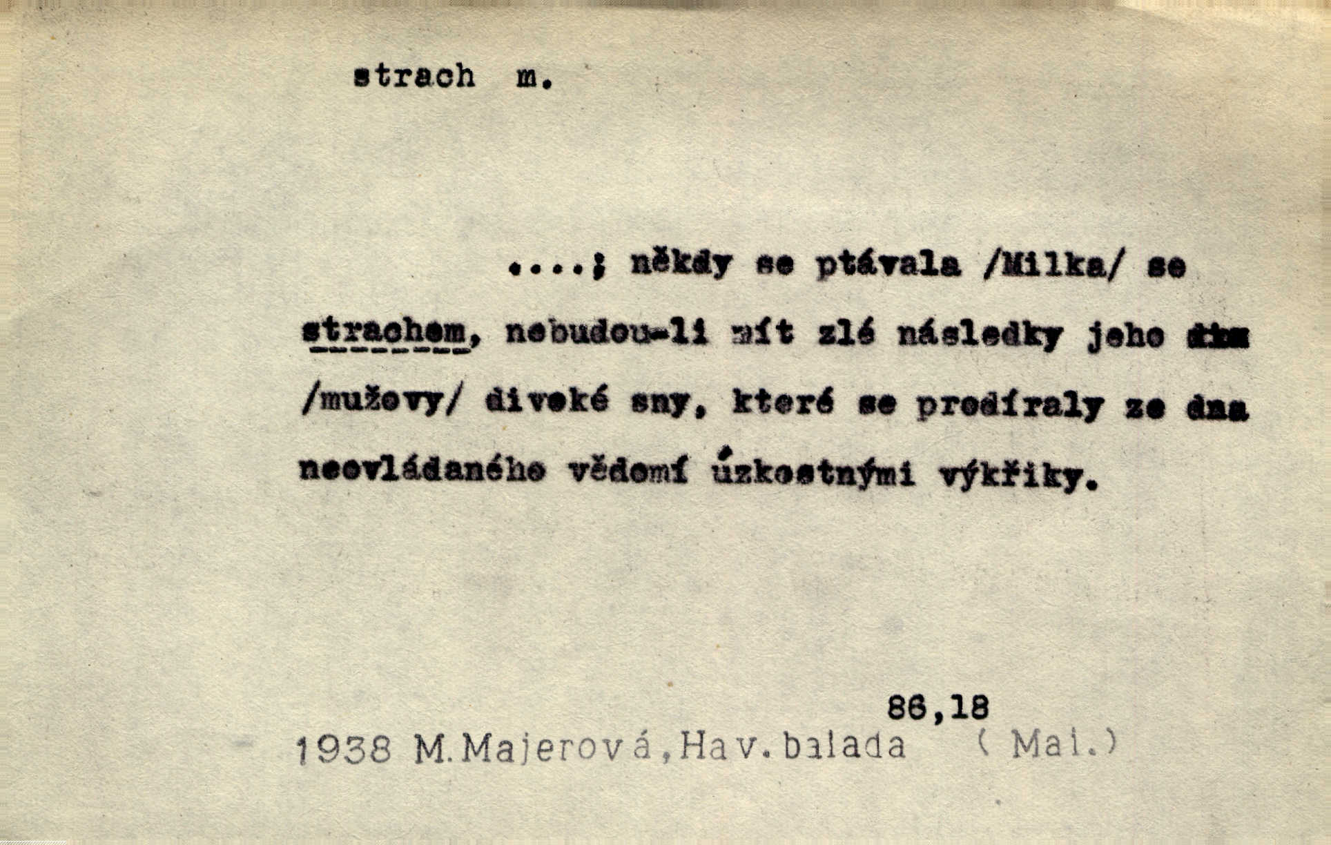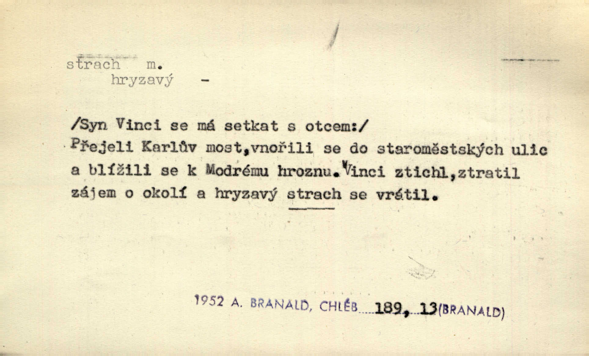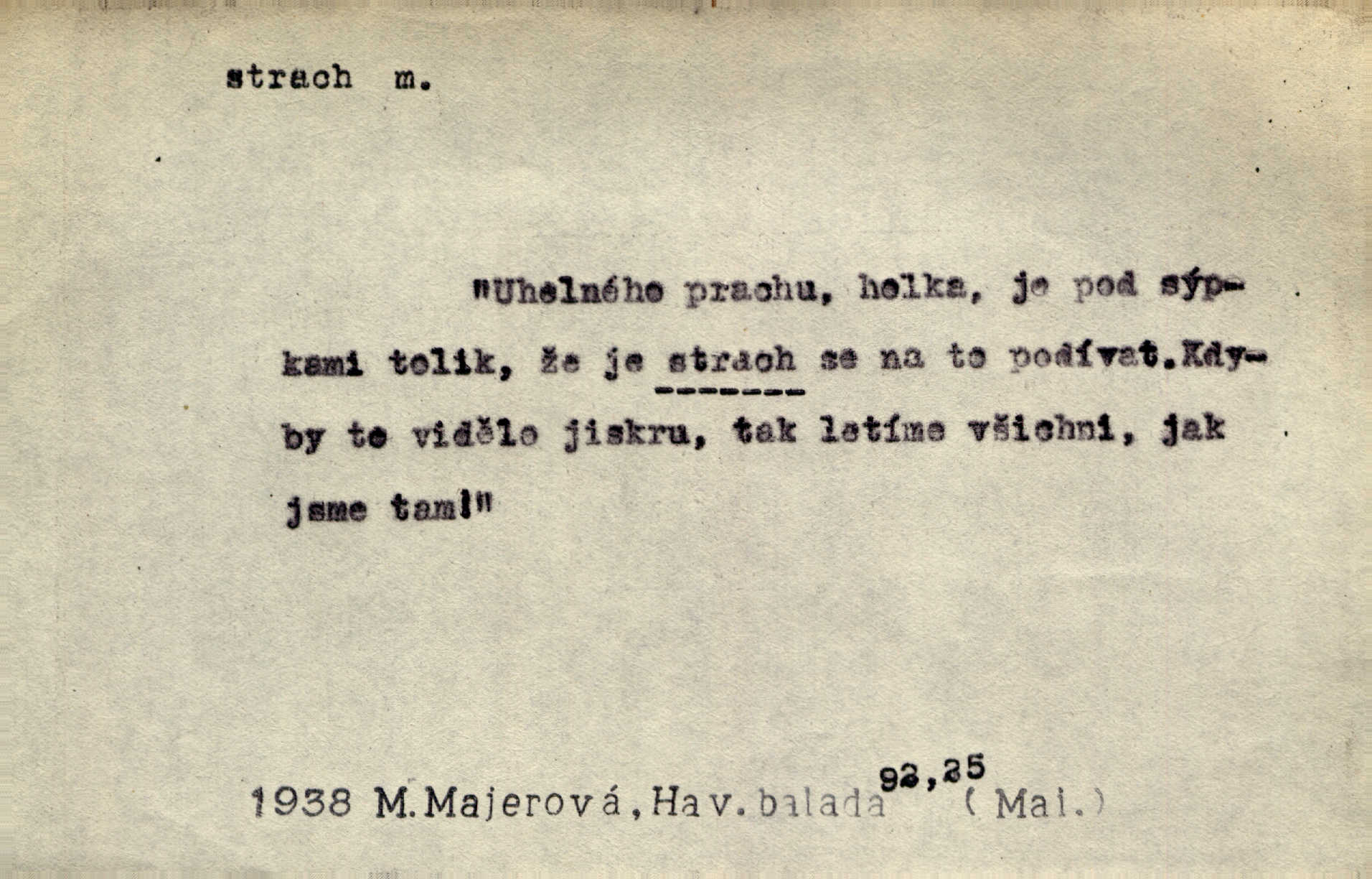 - strach, -u m. silná duševní stísněnost způsobená očekáváním něčeho nebezpečného n. nepříjemného, bázeň, obava. [Postava] náhle v děsnou příšeru se mění; strach nevýslovný z kostela mě pudí. Čech. Hrůza a strach lomcovaly jím jako nejsilnější zimnice. Herb. Dlouho stáli všickni zaraženi, děvečky se strachem třásly. Prav. Mladá dívka takořka strachy umírala. Třeb. Umřel také zcela přiměřeně charakteru svému, strachy celý bez sebe. Havl. Dvakrát přišla smrt — však jaké strachy! rabín zahrál vítězně s ní v šachy. Vrch. Strachem před husity opravovány rychle hradby městské téměř po celé říši německé. Pal. Měl panický strach před každou kritikou. Šmil. Napadá silně na nohu, ten nemusí mít strach z vojny. Jir. Má strach ze stěhování. Jir. Měla strach vytasiti se ihned zpříma s pravdou. Svět. Až strach z vás jde, jak jste se teď zamračil. Dyk. Blázen starý! To jsem mu nahnal strachu. Kam. A pro strach měli na Chodsku odjakživa uděláno, lekajíť se tam až teprve třetí den. Baar. Což já, já mám od strachu uděláno! Herb. Ale strach má velké oči, to jsem jednou zkusil nejlíp sám na sobě přehání, zveličuje skutečnost. Tůma. Po celou dobu se tam dole bál, plné kalhoty strachu měl. K. Čap. Jsou zadluženi až strach velmi. Ner. Nu tak, jaké štráchy a strachy, půjdete k nám do mlýna! Tůma. Žádné strachy na lachy zbytečné obavy! Her. D starost o někoho n. něco spojená se silnou úzkostí, obavou. Strach o budoucnost toho nenarozeného [dítěte] ji štval. Vach. Pantáta má o svého jedináčka strach. Jir. Když ho přepadl tajemný strach, že by přišel o službu, vystoupil mu až pot na čele. Herb. D Zř. kniž. osoba n. věc budící bázeň, postrach. Kníže Michajlovič Požarský, obnovitel své vlasti, strach a hrůza nepřátel Čel. Byltě to junák na slovo vzatý a strach Turkům. Něm.