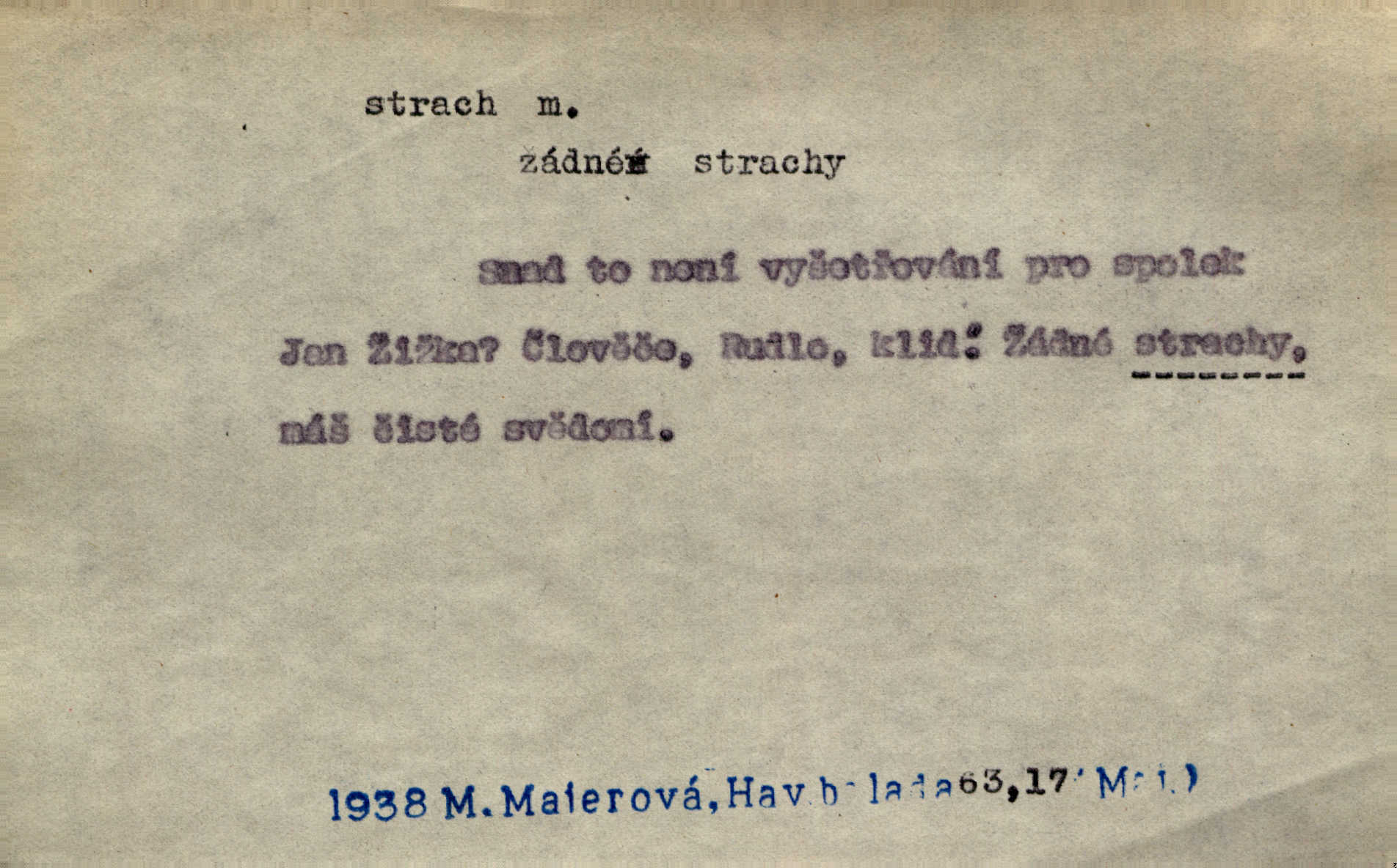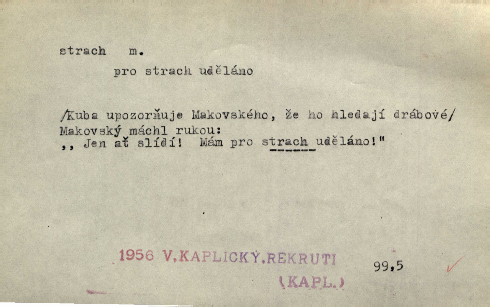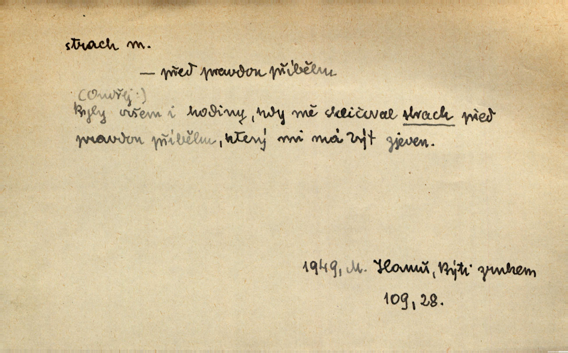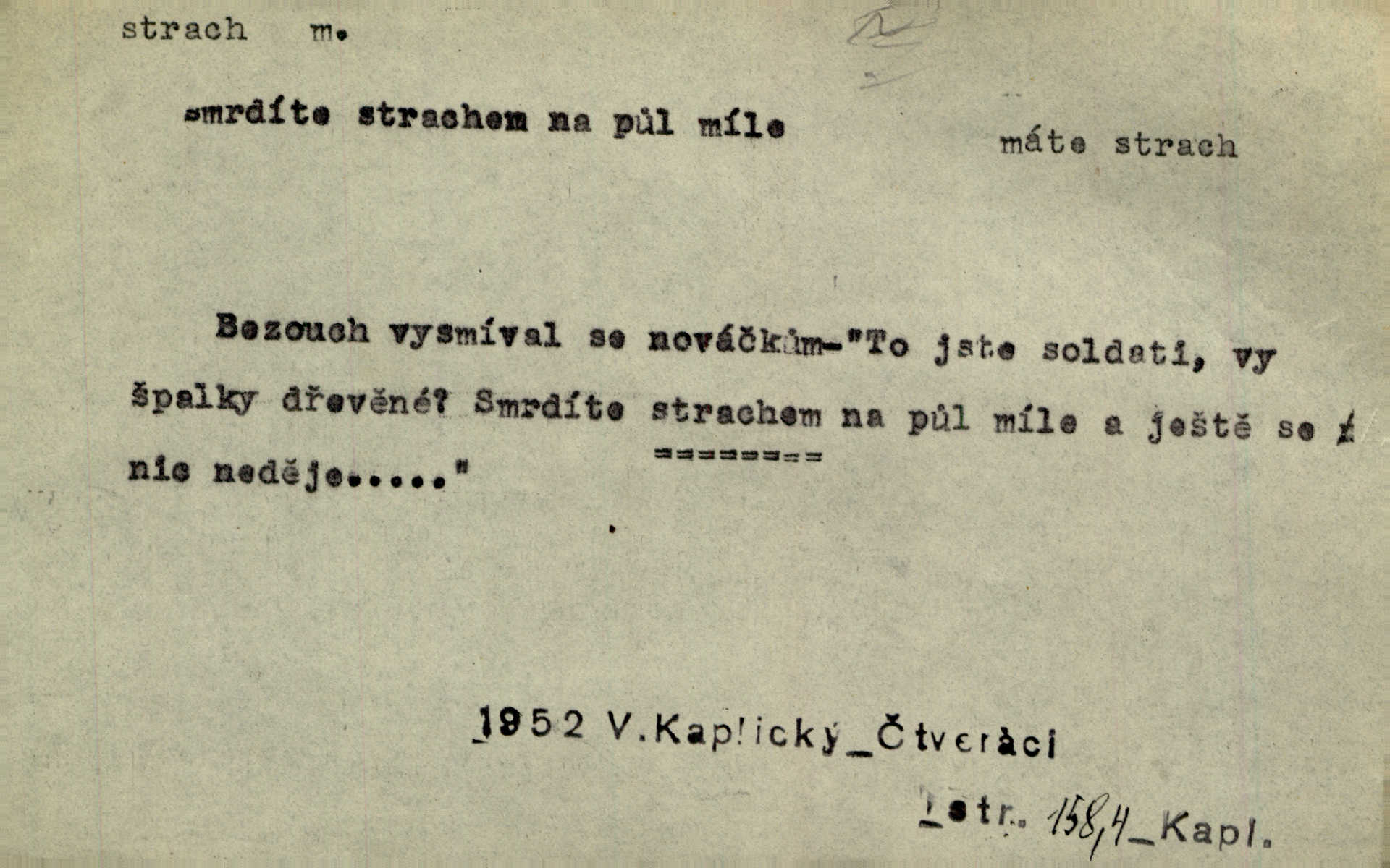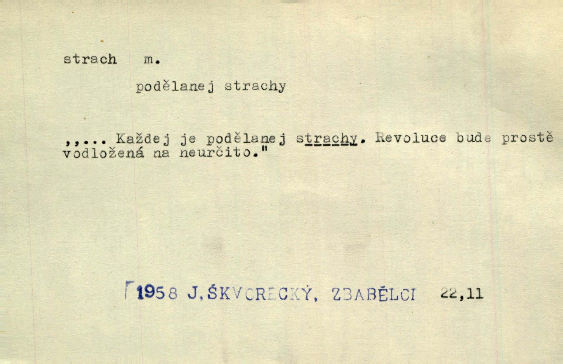 - strach, -u m. silná duševní stísněnost způsobená očekáváním něčeho nebezpečného n. nepříjemného, bázeň, obava. [Postava] náhle v děsnou příšeru se mění; strach nevýslovný z kostela mě pudí. Čech. Hrůza a strach lomcovaly jím jako nejsilnější zimnice. Herb. Dlouho stáli všickni zaraženi, děvečky se strachem třásly. Prav. Mladá dívka takořka strachy umírala. Třeb. Umřel také zcela přiměřeně charakteru svému, strachy celý bez sebe. Havl. Dvakrát přišla smrt — však jaké strachy! rabín zahrál vítězně s ní v šachy. Vrch. Strachem před husity opravovány rychle hradby městské téměř po celé říši německé. Pal. Měl panický strach před každou kritikou. Šmil. Napadá silně na nohu, ten nemusí mít strach z vojny. Jir. Má strach ze stěhování. Jir. Měla strach vytasiti se ihned zpříma s pravdou. Svět. Až strach z vás jde, jak jste se teď zamračil. Dyk. Blázen starý! To jsem mu nahnal strachu. Kam. A pro strach měli na Chodsku odjakživa uděláno, lekajíť se tam až teprve třetí den. Baar. Což já, já mám od strachu uděláno! Herb. Ale strach má velké oči, to jsem jednou zkusil nejlíp sám na sobě přehání, zveličuje skutečnost. Tůma. Po celou dobu se tam dole bál, plné kalhoty strachu měl. K. Čap. Jsou zadluženi až strach velmi. Ner. Nu tak, jaké štráchy a strachy, půjdete k nám do mlýna! Tůma. Žádné strachy na lachy zbytečné obavy! Her. D starost o někoho n. něco spojená se silnou úzkostí, obavou. Strach o budoucnost toho nenarozeného [dítěte] ji štval. Vach. Pantáta má o svého jedináčka strach. Jir. Když ho přepadl tajemný strach, že by přišel o službu, vystoupil mu až pot na čele. Herb. D Zř. kniž. osoba n. věc budící bázeň, postrach. Kníže Michajlovič Požarský, obnovitel své vlasti, strach a hrůza nepřátel Čel. Byltě to junák na slovo vzatý a strach Turkům. Něm.