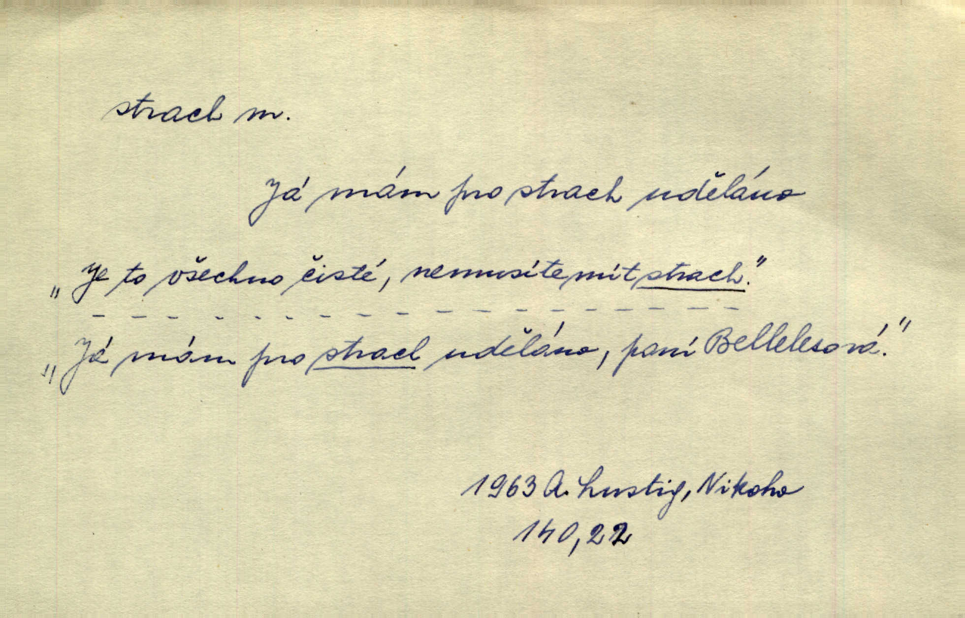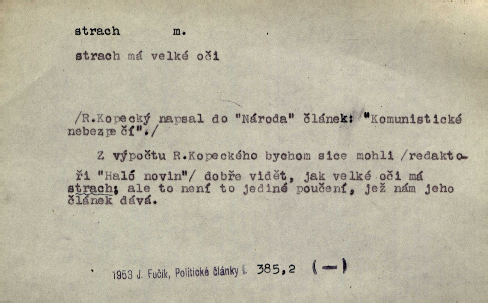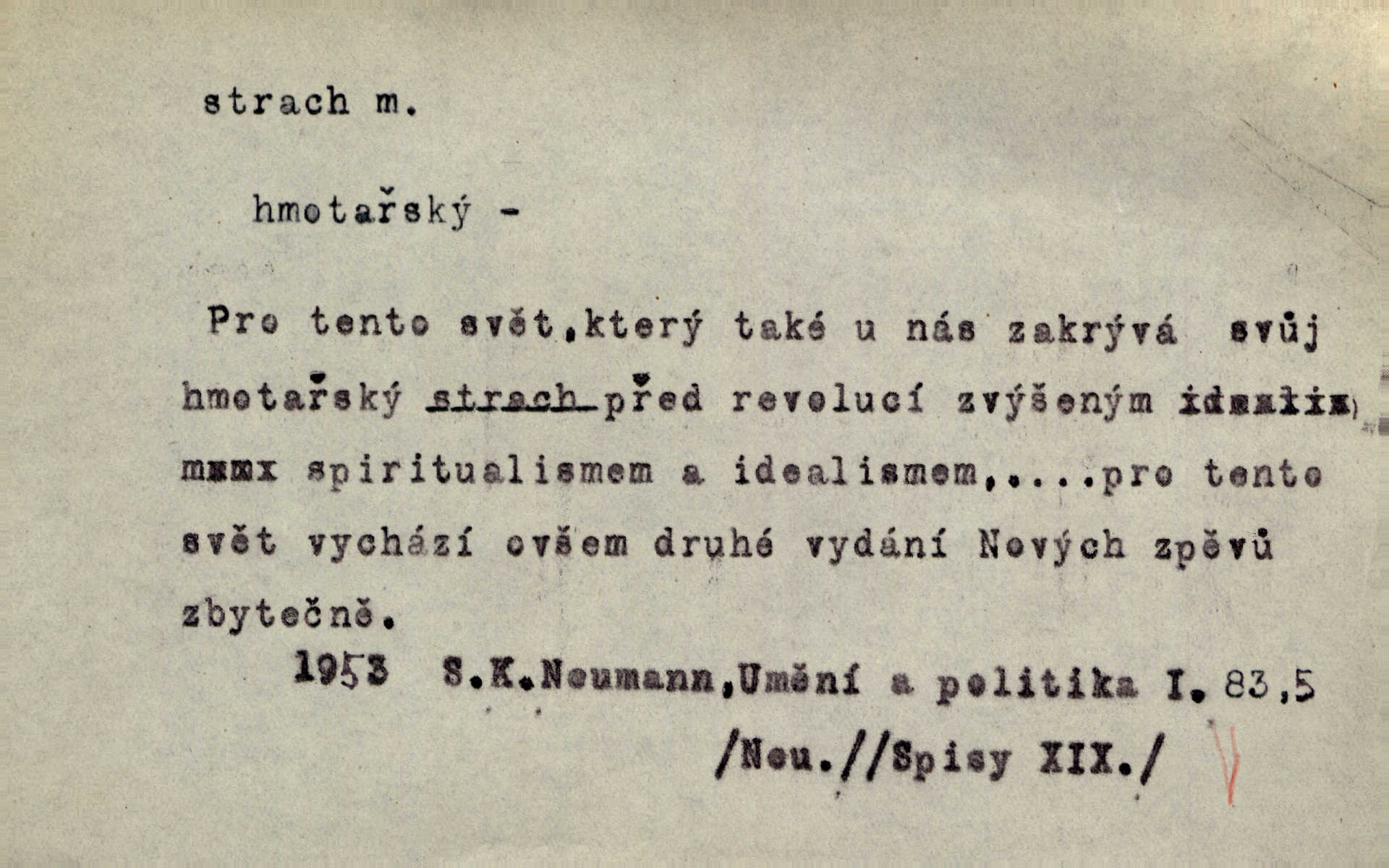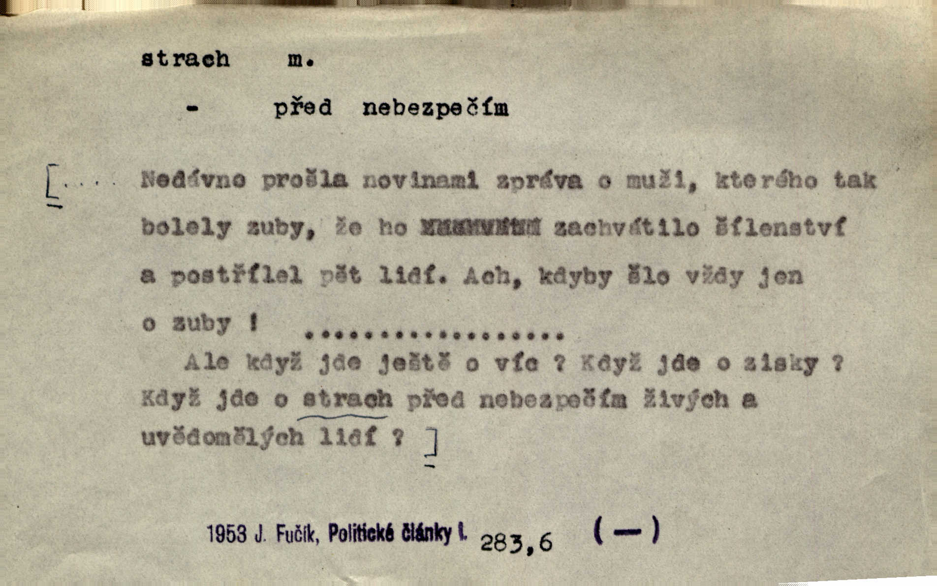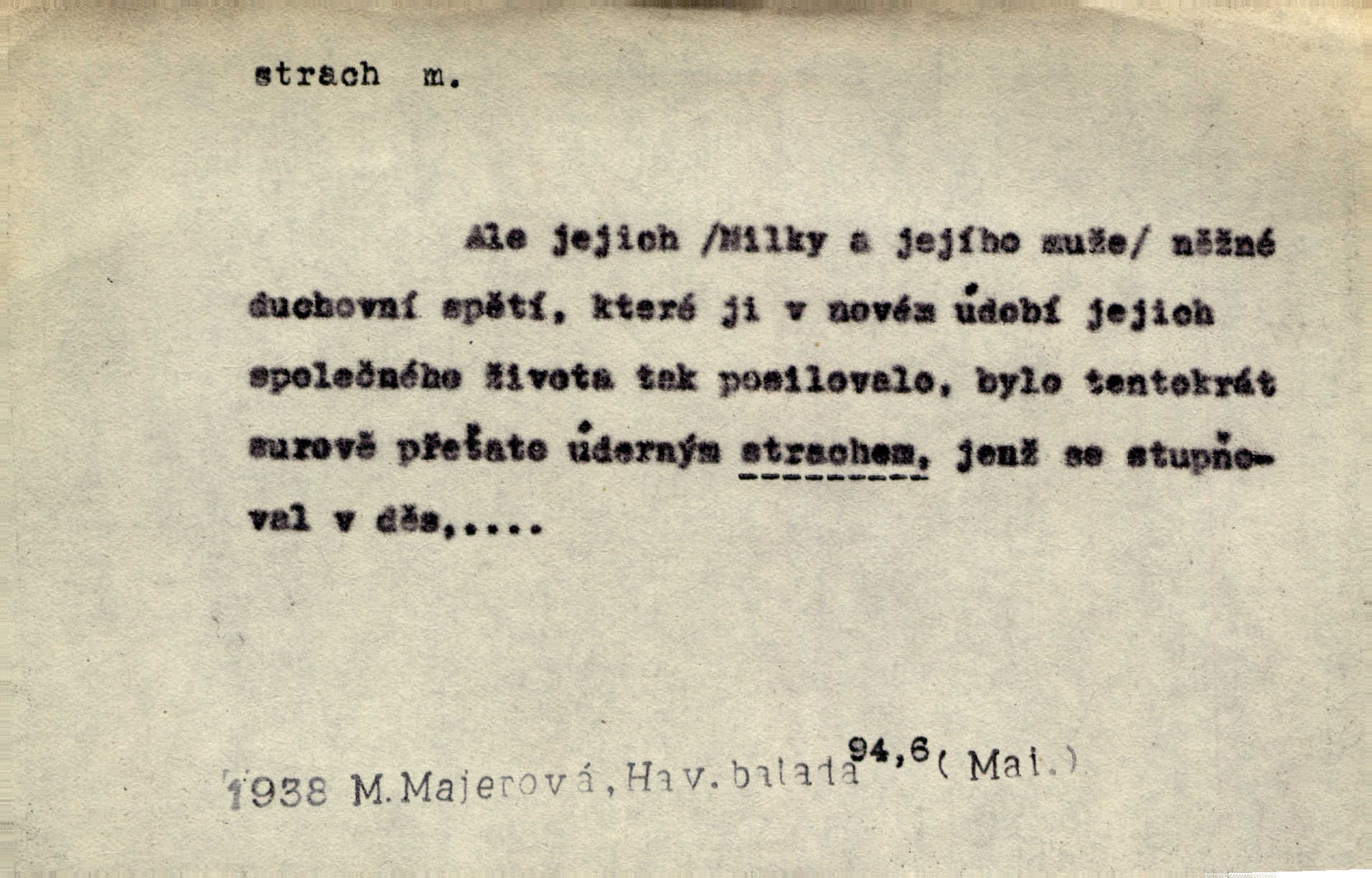 - strach, -u m. silná duševní stísněnost způsobená očekáváním něčeho nebezpečného n. nepříjemného, bázeň, obava. [Postava] náhle v děsnou příšeru se mění; strach nevýslovný z kostela mě pudí. Čech. Hrůza a strach lomcovaly jím jako nejsilnější zimnice. Herb. Dlouho stáli všickni zaraženi, děvečky se strachem třásly. Prav. Mladá dívka takořka strachy umírala. Třeb. Umřel také zcela přiměřeně charakteru svému, strachy celý bez sebe. Havl. Dvakrát přišla smrt — však jaké strachy! rabín zahrál vítězně s ní v šachy. Vrch. Strachem před husity opravovány rychle hradby městské téměř po celé říši německé. Pal. Měl panický strach před každou kritikou. Šmil. Napadá silně na nohu, ten nemusí mít strach z vojny. Jir. Má strach ze stěhování. Jir. Měla strach vytasiti se ihned zpříma s pravdou. Svět. Až strach z vás jde, jak jste se teď zamračil. Dyk. Blázen starý! To jsem mu nahnal strachu. Kam. A pro strach měli na Chodsku odjakživa uděláno, lekajíť se tam až teprve třetí den. Baar. Což já, já mám od strachu uděláno! Herb. Ale strach má velké oči, to jsem jednou zkusil nejlíp sám na sobě přehání, zveličuje skutečnost. Tůma. Po celou dobu se tam dole bál, plné kalhoty strachu měl. K. Čap. Jsou zadluženi až strach velmi. Ner. Nu tak, jaké štráchy a strachy, půjdete k nám do mlýna! Tůma. Žádné strachy na lachy zbytečné obavy! Her. D starost o někoho n. něco spojená se silnou úzkostí, obavou. Strach o budoucnost toho nenarozeného [dítěte] ji štval. Vach. Pantáta má o svého jedináčka strach. Jir. Když ho přepadl tajemný strach, že by přišel o službu, vystoupil mu až pot na čele. Herb. D Zř. kniž. osoba n. věc budící bázeň, postrach. Kníže Michajlovič Požarský, obnovitel své vlasti, strach a hrůza nepřátel Čel. Byltě to junák na slovo vzatý a strach Turkům. Něm.