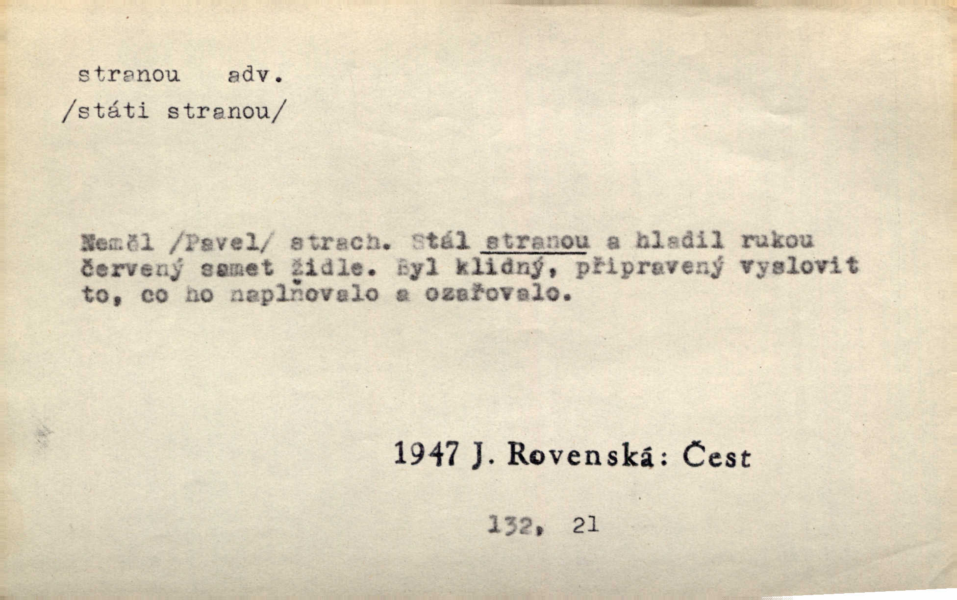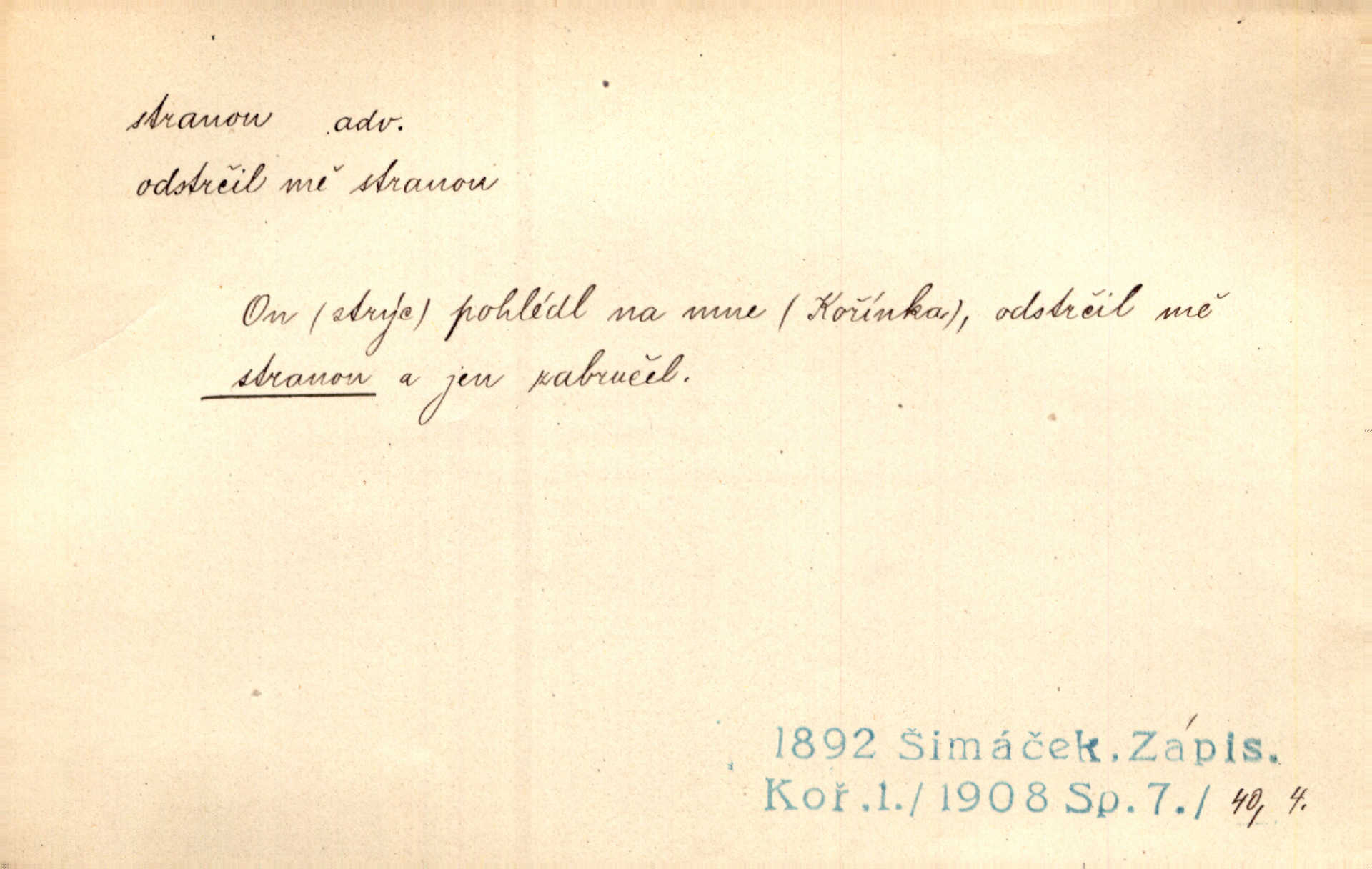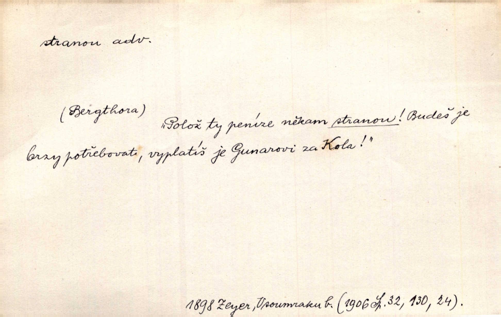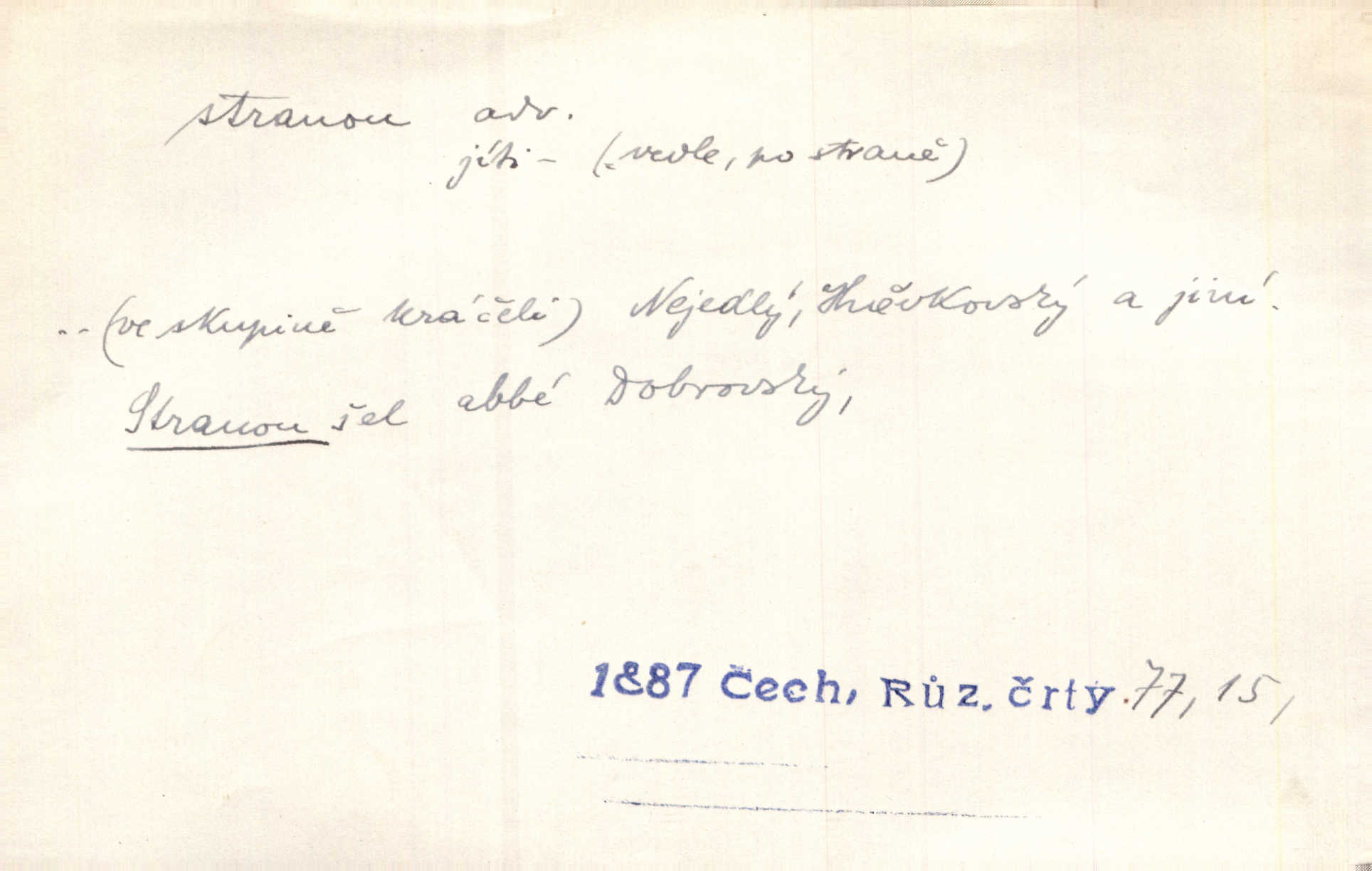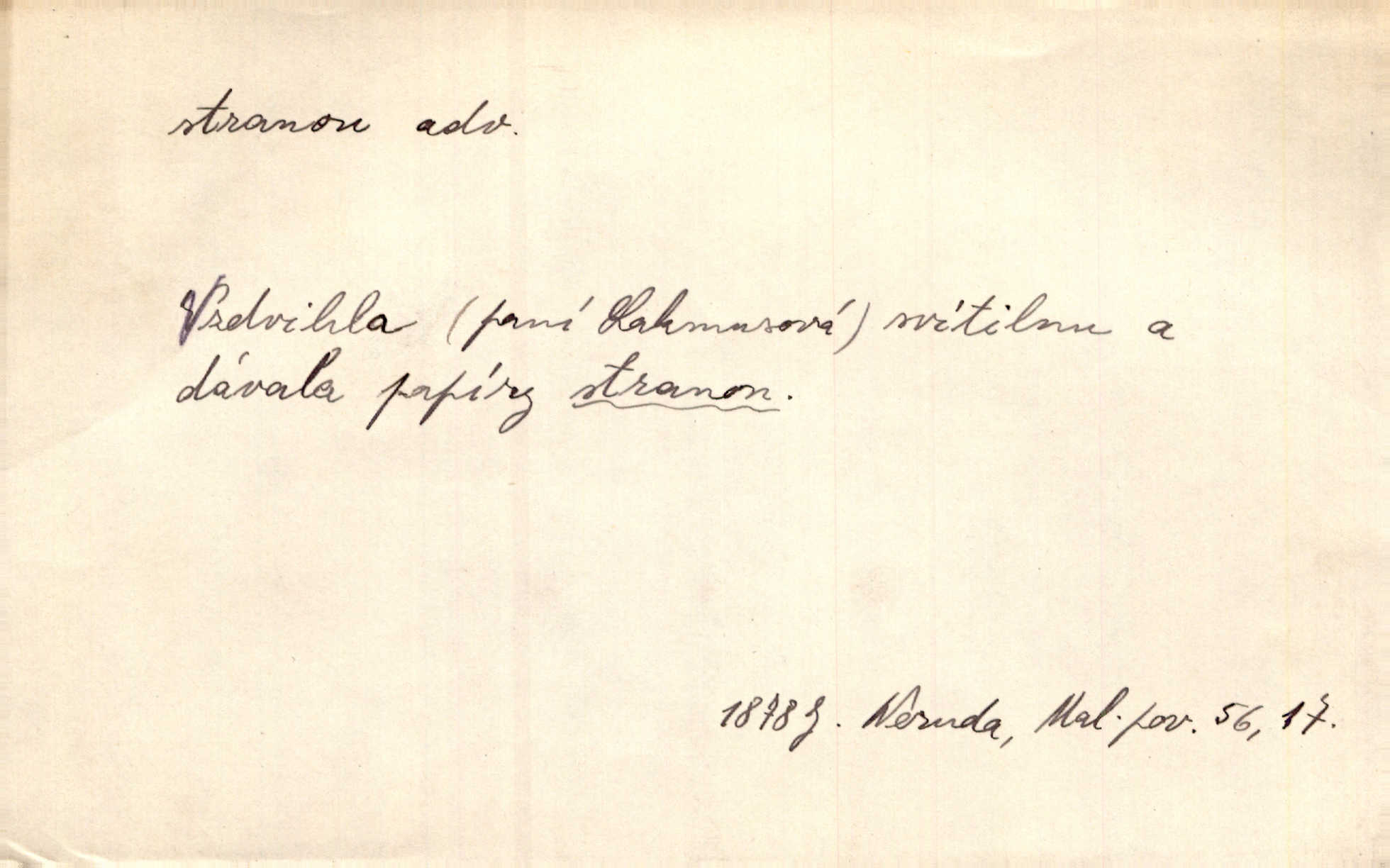 - stranou adv. na jednu stranu, na straně, ke straně. Světlý kulatý klobouk maje stranou na kudrnaté hlavě, široké stuhy, visící se skřipce, hodil za ucho. Rais. Jak tomu mám rozumět? — tázal se Löwenwartl, nakloniv stranou hlavu. J. J. Kol. Každý deštník nakloněný stranou mníš být hlavou houby nadulé. Mach. D pryč s cesty, pryč z prostředí, v ústraní, do ústraní. Vyzdvihla svítilnu a dávala papíry stranou. Ner. [Cumel] ujev dítěti z úst, zapadl stranou, do peřinek. Jir. Odstrčil mě stranou. Šim. Vzal děvče stranou i navedl ji, aby vyslídila, kde má Józa fěrtoch uložený. Svět. Mérimée seděl stranou a kreslil. Vrch. Stranou šel abbé Dobrovský. Čech. Pryč, z cesty, stranou, Ctirad mým je vězněm! Vrch. Musil jsem nechat vše stranou a s tebou promluvit. Svět. Polož ty peníze někam stranou! Budeš je brzy potřebovat ulož. Zey. Může i tak dávati týdně stranou, byť i nevelký obnos. Her. D opodál, poněkud vzdáleně. Ulice Giulia leží stranou od čtvrti. Zey. Skoro uprostřed návrší, od vozové cesty stranou, rozkládal se hřbitov. Hál. Stranou od něho seděl Salem. Hál. Stranou od hlavní brány na náspích na slunci se hřáli. Ehrenb. Stranou se táhl velký les. Svět. D šikmo, kose, úkosem. Pavel díval se stranou. Maj. Přicházelo to stranou od háje. Tyl. Literáci dívali se naň stranou, ale dělal, jako by neviděl. Rais. D v nevýznamnosti, v podřízeném postavení, do podřízeného postavení. Vše ostatní zůstává u nich stranou. Svět. Sousedé se mrzeli, že dědeček je tak stranou. Svět. Vejměnkář je vejměnkář, ten ať jde stranou a nikomu nepřekáží. Rais. Tu přišel mandát a Laudon musil stranou byl odstraněn. Jir. D tajně, potají, skrytě. „Starý kaprál“ přezdíval mu stranou dráb Haťárek. Jir. [Poslanec] jen lysou hlavou rázně kýval, svorně hlasoval a stranou zíval. Čech. Odložíc je [jablko] s povzdechem stranou, rozkrojila druhé pro Barunku. Něm.