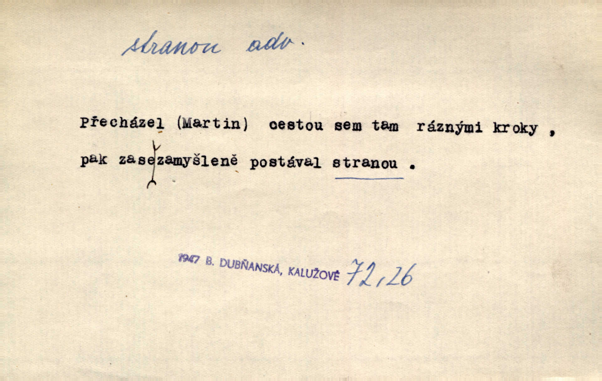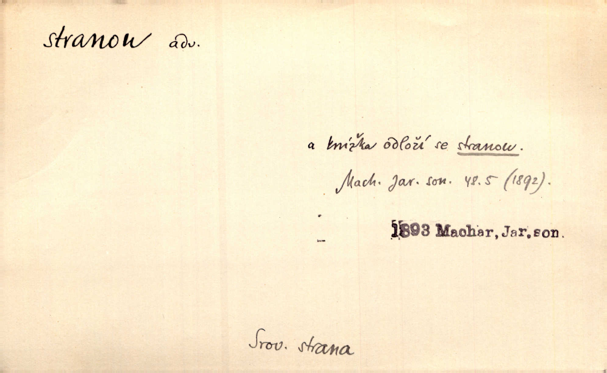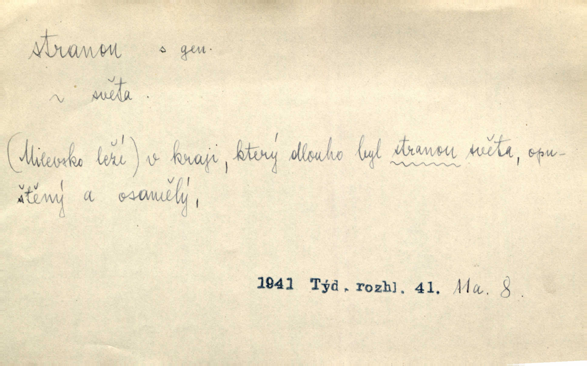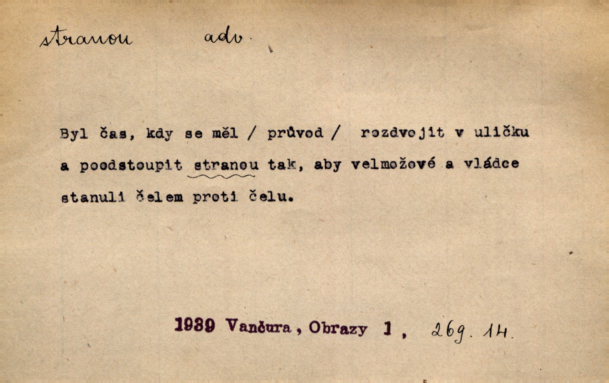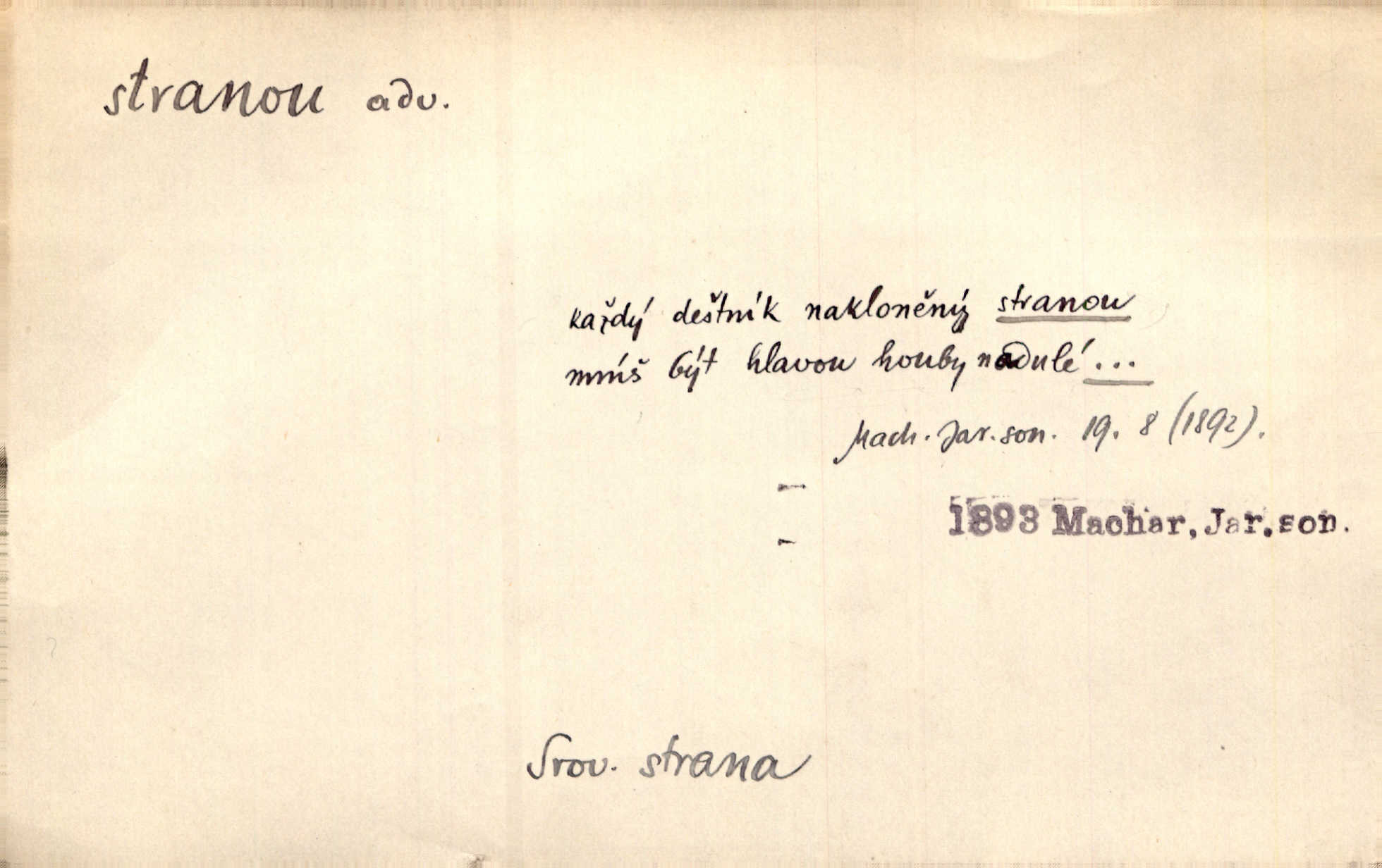 - stranou adv. na jednu stranu, na straně, ke straně. Světlý kulatý klobouk maje stranou na kudrnaté hlavě, široké stuhy, visící se skřipce, hodil za ucho. Rais. Jak tomu mám rozumět? — tázal se Löwenwartl, nakloniv stranou hlavu. J. J. Kol. Každý deštník nakloněný stranou mníš být hlavou houby nadulé. Mach. D pryč s cesty, pryč z prostředí, v ústraní, do ústraní. Vyzdvihla svítilnu a dávala papíry stranou. Ner. [Cumel] ujev dítěti z úst, zapadl stranou, do peřinek. Jir. Odstrčil mě stranou. Šim. Vzal děvče stranou i navedl ji, aby vyslídila, kde má Józa fěrtoch uložený. Svět. Mérimée seděl stranou a kreslil. Vrch. Stranou šel abbé Dobrovský. Čech. Pryč, z cesty, stranou, Ctirad mým je vězněm! Vrch. Musil jsem nechat vše stranou a s tebou promluvit. Svět. Polož ty peníze někam stranou! Budeš je brzy potřebovat ulož. Zey. Může i tak dávati týdně stranou, byť i nevelký obnos. Her. D opodál, poněkud vzdáleně. Ulice Giulia leží stranou od čtvrti. Zey. Skoro uprostřed návrší, od vozové cesty stranou, rozkládal se hřbitov. Hál. Stranou od něho seděl Salem. Hál. Stranou od hlavní brány na náspích na slunci se hřáli. Ehrenb. Stranou se táhl velký les. Svět. D šikmo, kose, úkosem. Pavel díval se stranou. Maj. Přicházelo to stranou od háje. Tyl. Literáci dívali se naň stranou, ale dělal, jako by neviděl. Rais. D v nevýznamnosti, v podřízeném postavení, do podřízeného postavení. Vše ostatní zůstává u nich stranou. Svět. Sousedé se mrzeli, že dědeček je tak stranou. Svět. Vejměnkář je vejměnkář, ten ať jde stranou a nikomu nepřekáží. Rais. Tu přišel mandát a Laudon musil stranou byl odstraněn. Jir. D tajně, potají, skrytě. „Starý kaprál“ přezdíval mu stranou dráb Haťárek. Jir. [Poslanec] jen lysou hlavou rázně kýval, svorně hlasoval a stranou zíval. Čech. Odložíc je [jablko] s povzdechem stranou, rozkrojila druhé pro Barunku. Něm.