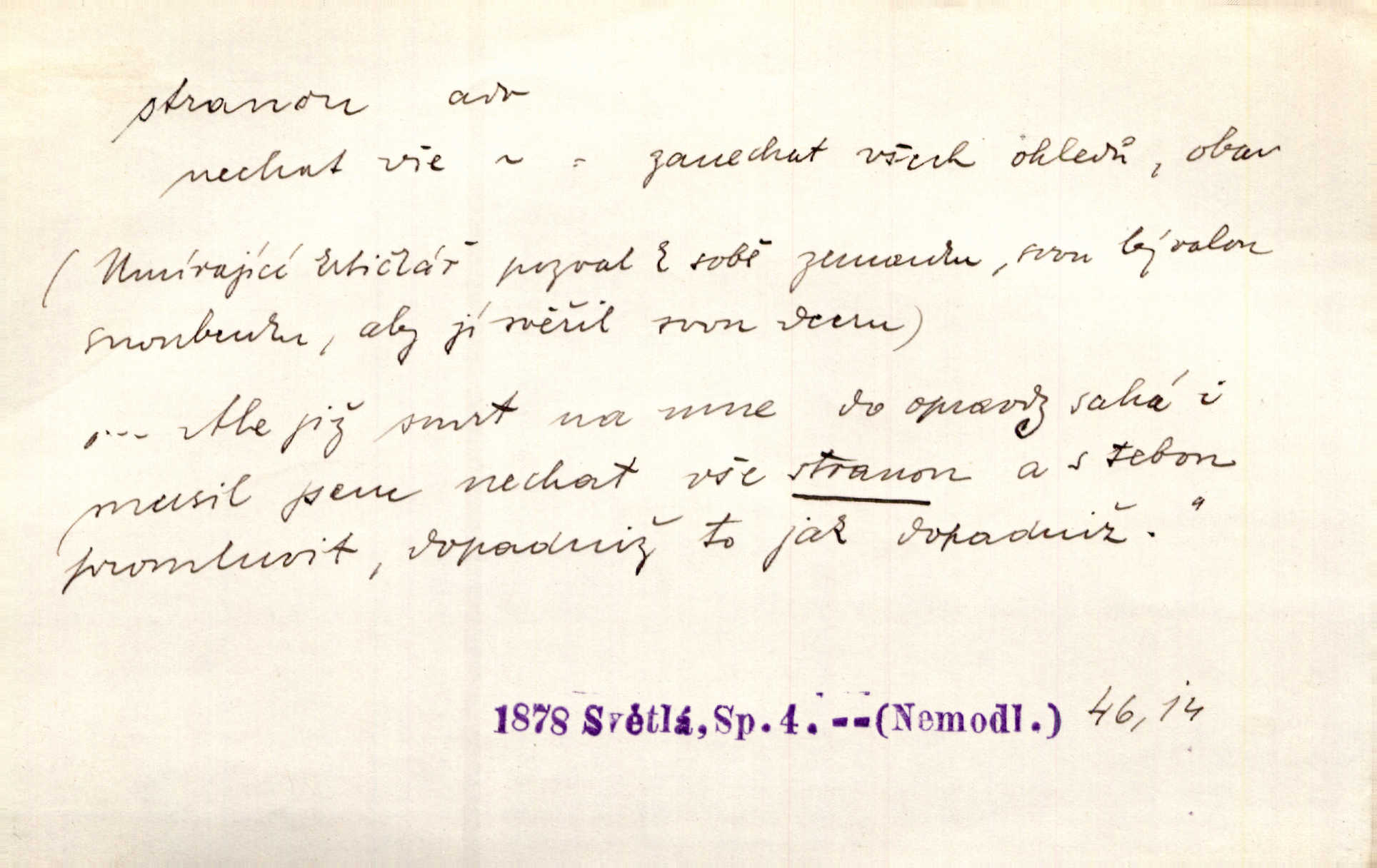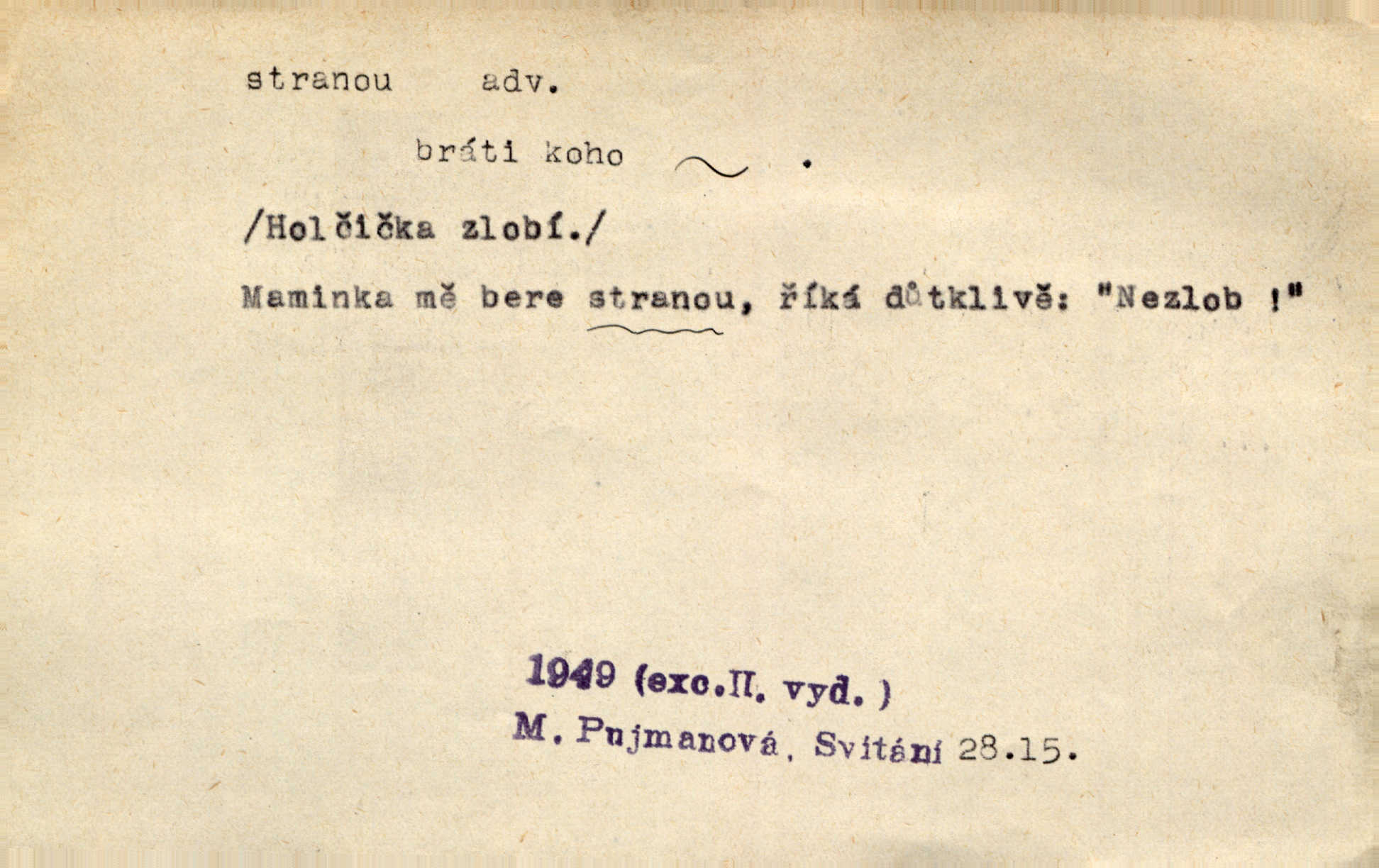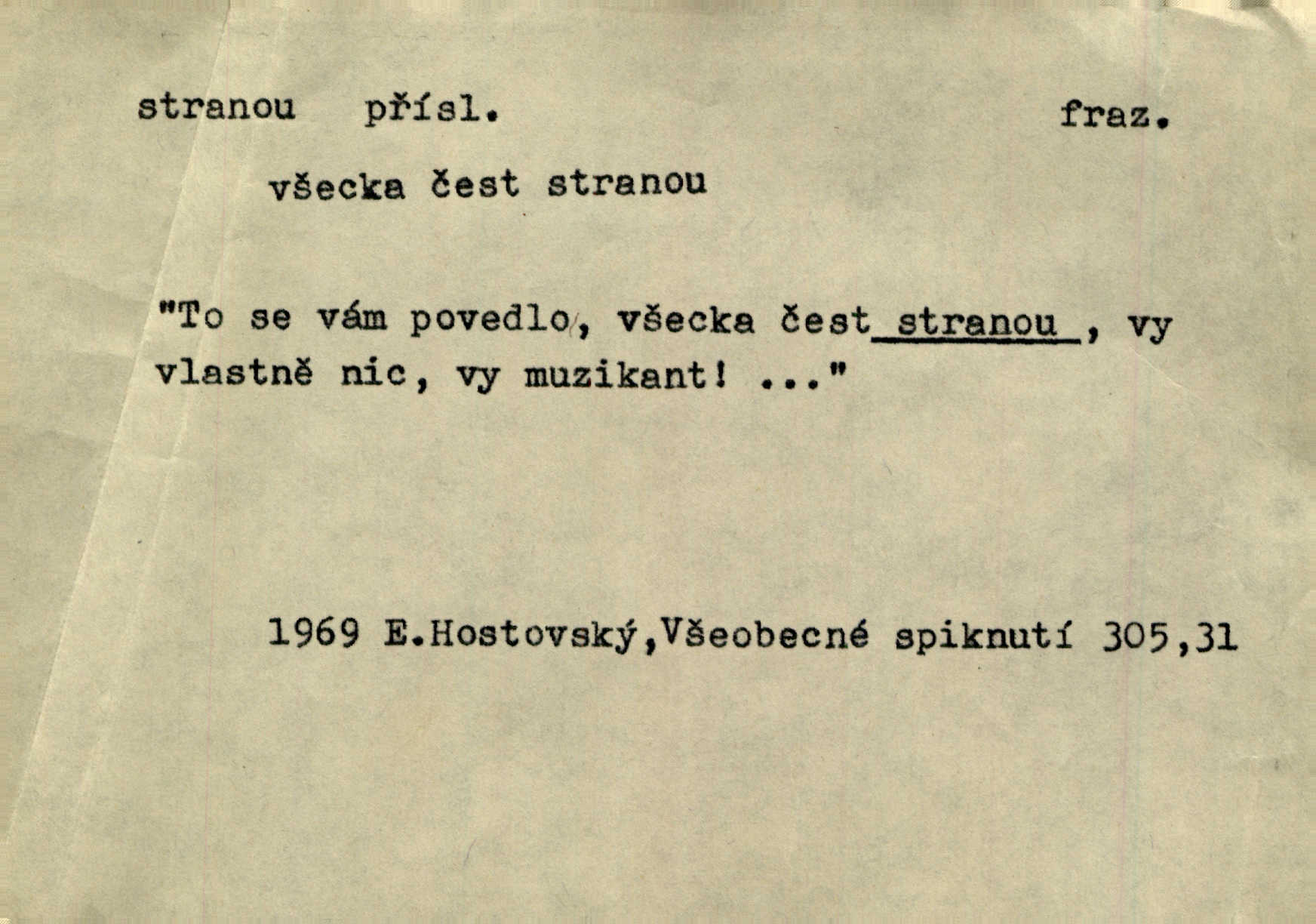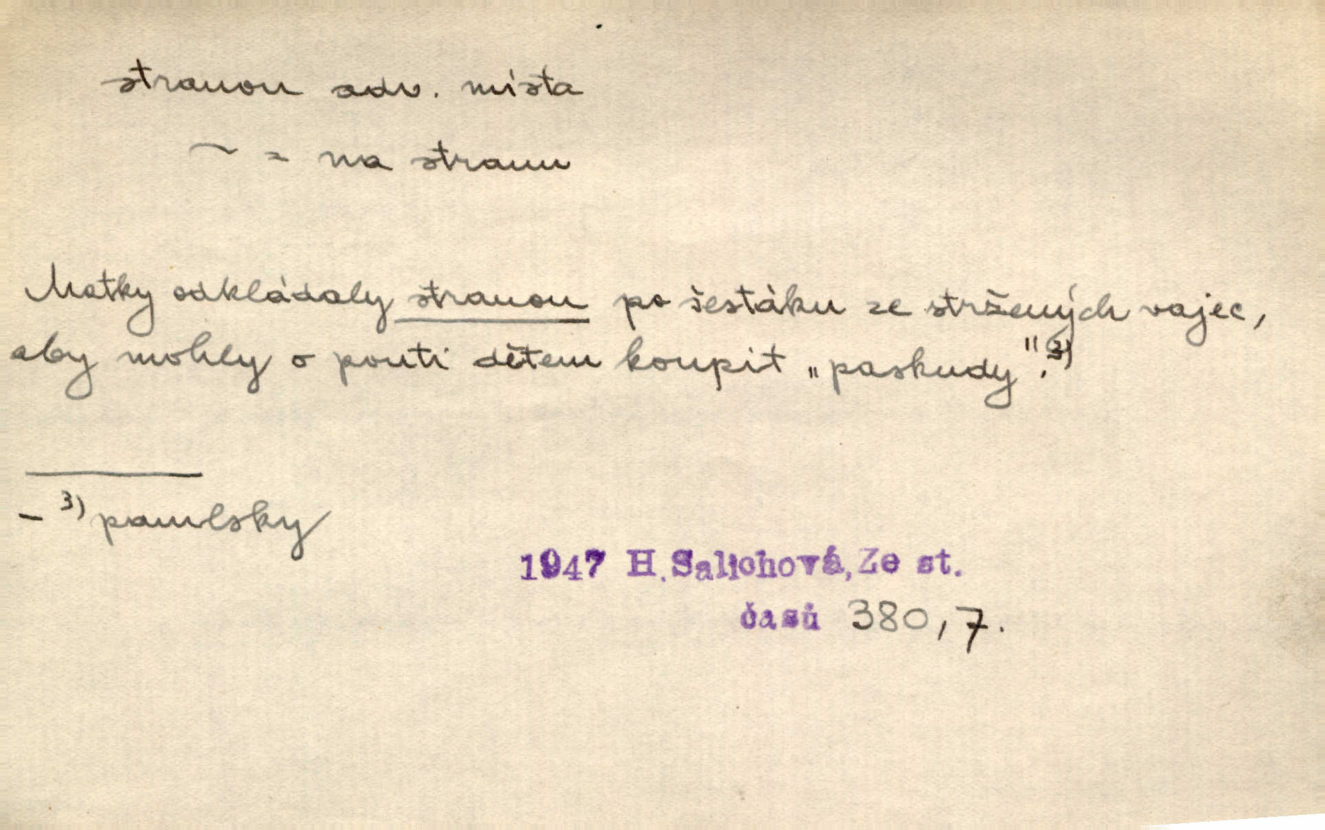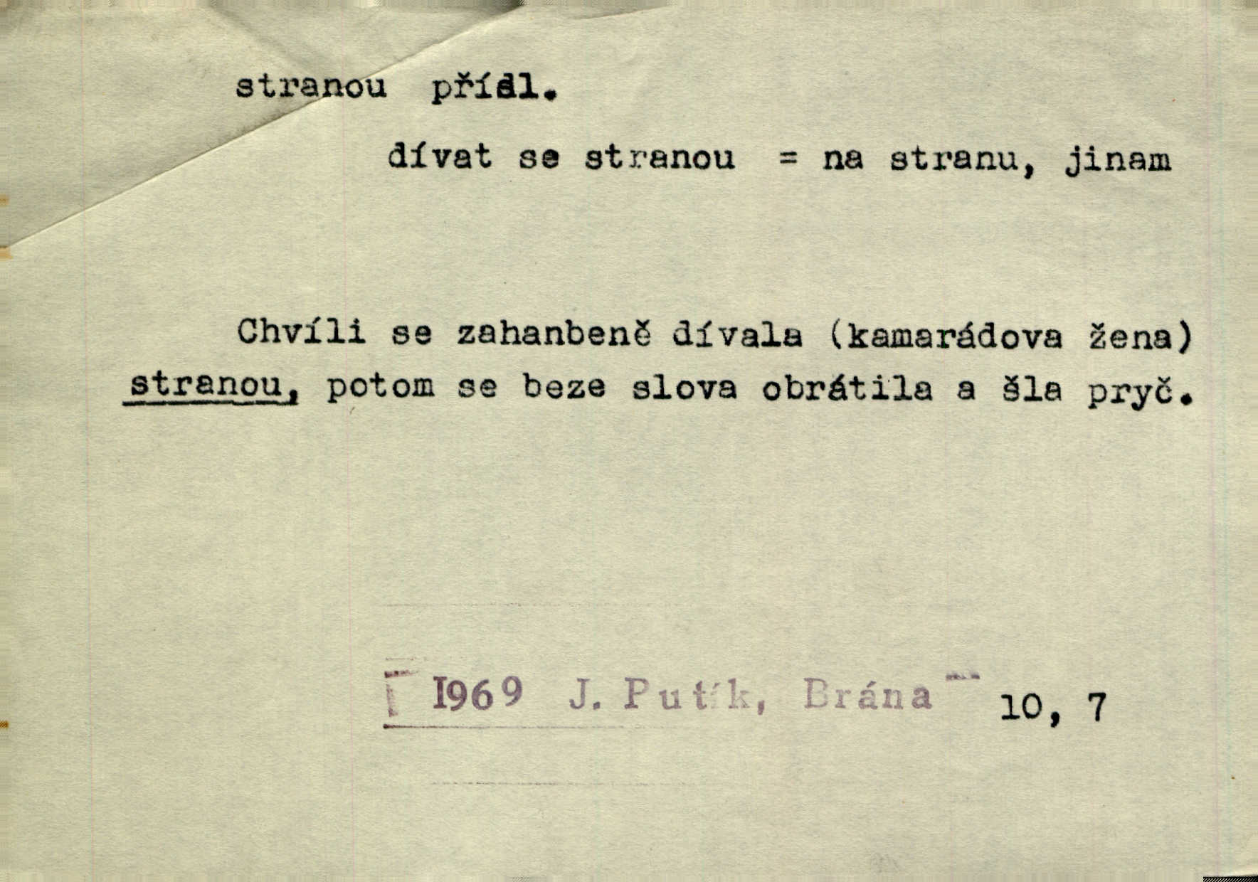 - stranou adv. na jednu stranu, na straně, ke straně. Světlý kulatý klobouk maje stranou na kudrnaté hlavě, široké stuhy, visící se skřipce, hodil za ucho. Rais. Jak tomu mám rozumět? — tázal se Löwenwartl, nakloniv stranou hlavu. J. J. Kol. Každý deštník nakloněný stranou mníš být hlavou houby nadulé. Mach. D pryč s cesty, pryč z prostředí, v ústraní, do ústraní. Vyzdvihla svítilnu a dávala papíry stranou. Ner. [Cumel] ujev dítěti z úst, zapadl stranou, do peřinek. Jir. Odstrčil mě stranou. Šim. Vzal děvče stranou i navedl ji, aby vyslídila, kde má Józa fěrtoch uložený. Svět. Mérimée seděl stranou a kreslil. Vrch. Stranou šel abbé Dobrovský. Čech. Pryč, z cesty, stranou, Ctirad mým je vězněm! Vrch. Musil jsem nechat vše stranou a s tebou promluvit. Svět. Polož ty peníze někam stranou! Budeš je brzy potřebovat ulož. Zey. Může i tak dávati týdně stranou, byť i nevelký obnos. Her. D opodál, poněkud vzdáleně. Ulice Giulia leží stranou od čtvrti. Zey. Skoro uprostřed návrší, od vozové cesty stranou, rozkládal se hřbitov. Hál. Stranou od něho seděl Salem. Hál. Stranou od hlavní brány na náspích na slunci se hřáli. Ehrenb. Stranou se táhl velký les. Svět. D šikmo, kose, úkosem. Pavel díval se stranou. Maj. Přicházelo to stranou od háje. Tyl. Literáci dívali se naň stranou, ale dělal, jako by neviděl. Rais. D v nevýznamnosti, v podřízeném postavení, do podřízeného postavení. Vše ostatní zůstává u nich stranou. Svět. Sousedé se mrzeli, že dědeček je tak stranou. Svět. Vejměnkář je vejměnkář, ten ať jde stranou a nikomu nepřekáží. Rais. Tu přišel mandát a Laudon musil stranou byl odstraněn. Jir. D tajně, potají, skrytě. „Starý kaprál“ přezdíval mu stranou dráb Haťárek. Jir. [Poslanec] jen lysou hlavou rázně kýval, svorně hlasoval a stranou zíval. Čech. Odložíc je [jablko] s povzdechem stranou, rozkrojila druhé pro Barunku. Něm.