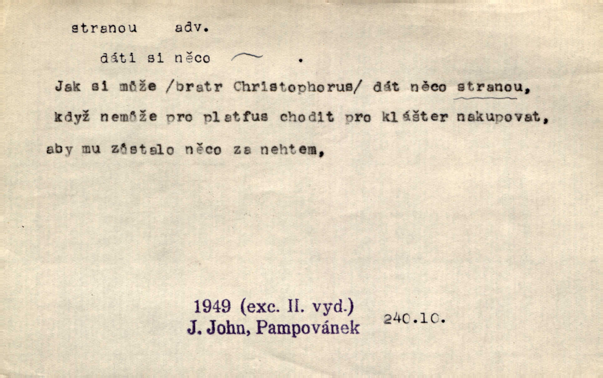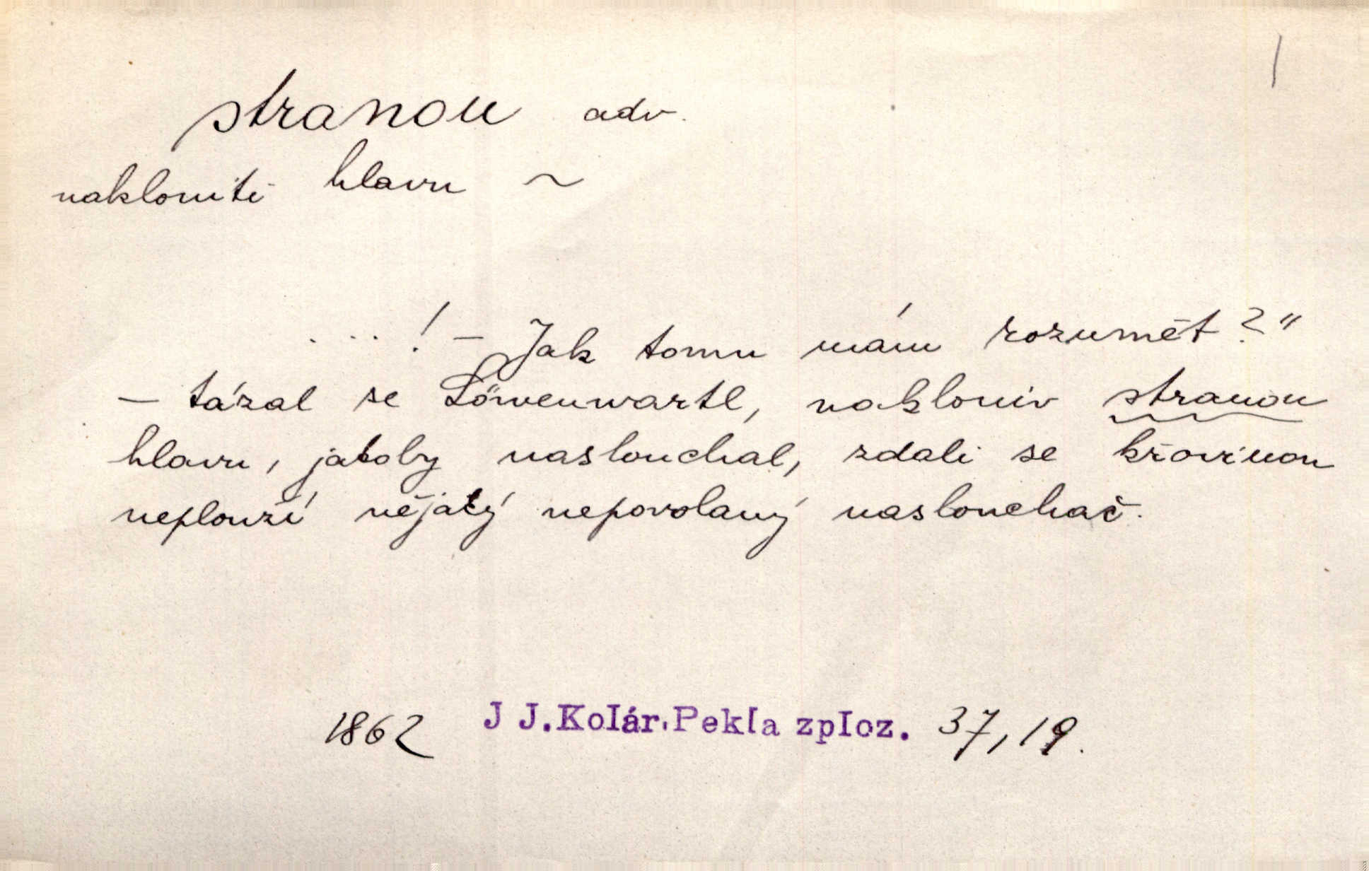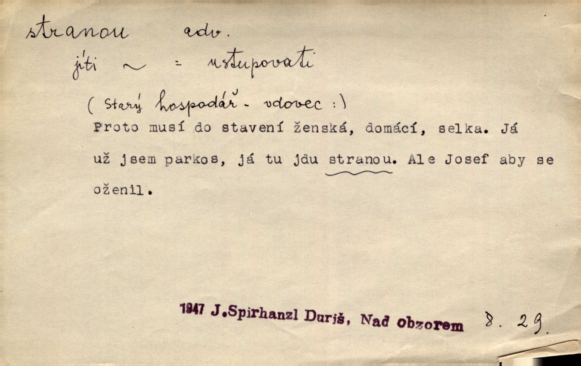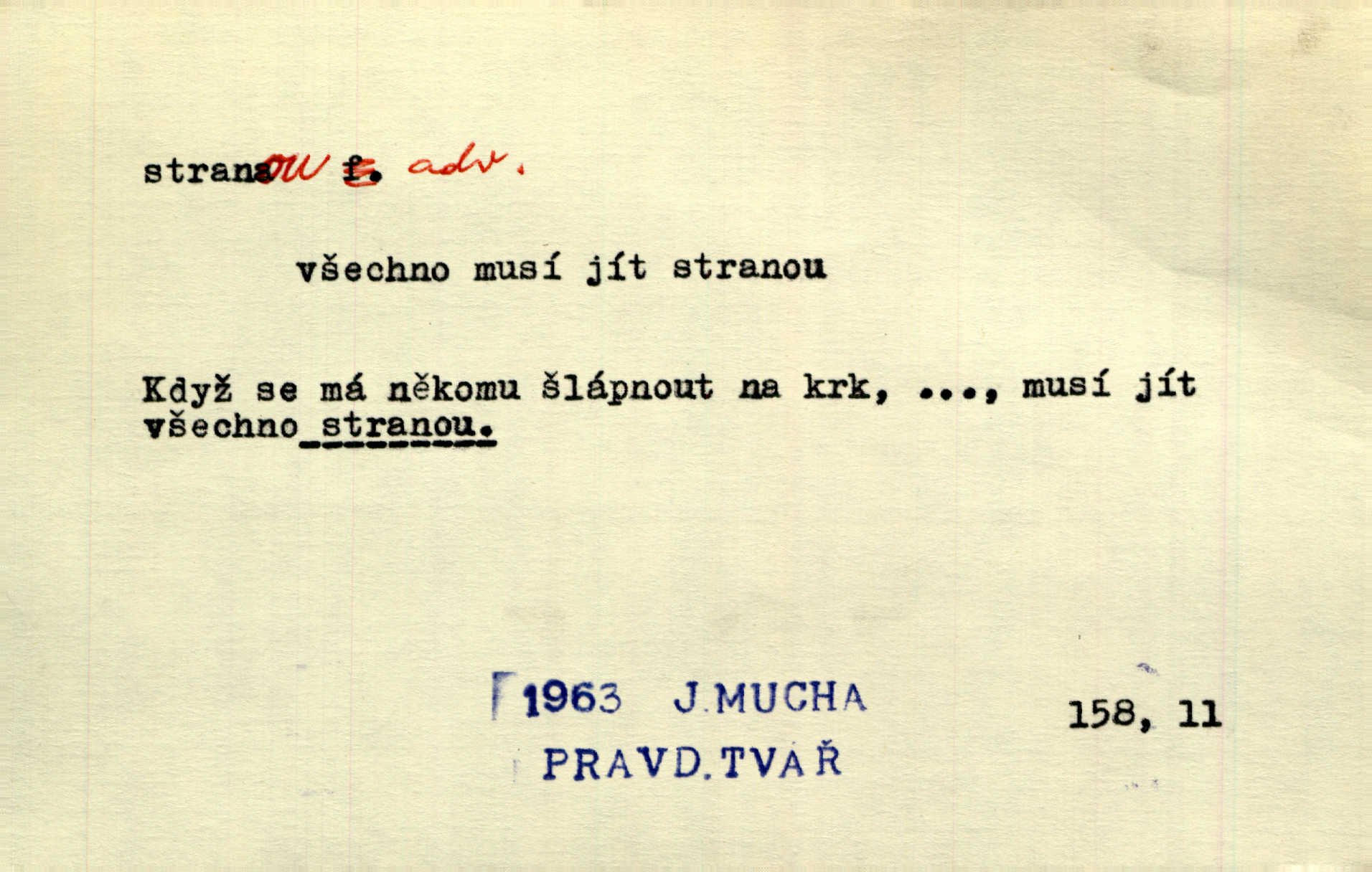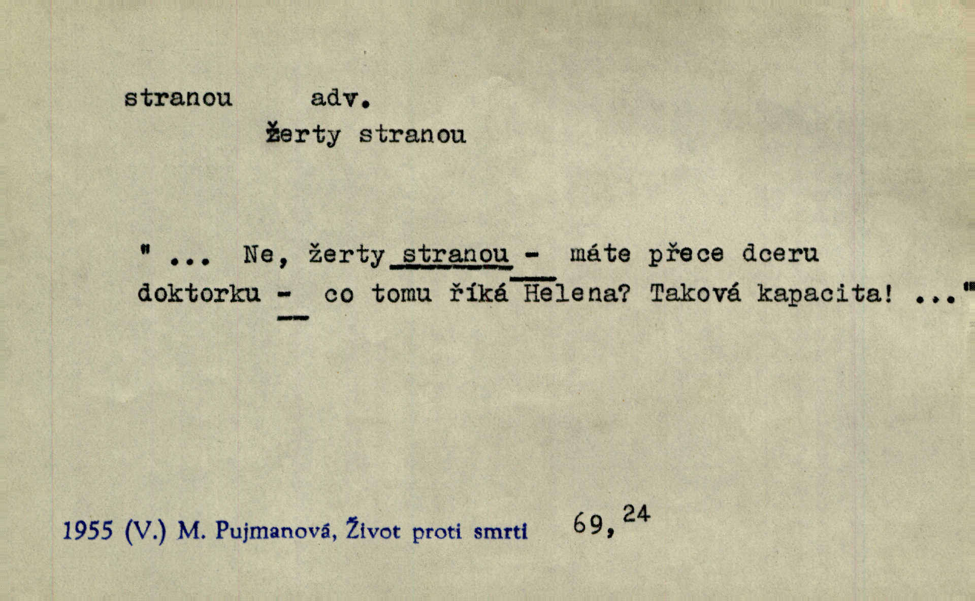 - stranou adv. na jednu stranu, na straně, ke straně. Světlý kulatý klobouk maje stranou na kudrnaté hlavě, široké stuhy, visící se skřipce, hodil za ucho. Rais. Jak tomu mám rozumět? — tázal se Löwenwartl, nakloniv stranou hlavu. J. J. Kol. Každý deštník nakloněný stranou mníš být hlavou houby nadulé. Mach. D pryč s cesty, pryč z prostředí, v ústraní, do ústraní. Vyzdvihla svítilnu a dávala papíry stranou. Ner. [Cumel] ujev dítěti z úst, zapadl stranou, do peřinek. Jir. Odstrčil mě stranou. Šim. Vzal děvče stranou i navedl ji, aby vyslídila, kde má Józa fěrtoch uložený. Svět. Mérimée seděl stranou a kreslil. Vrch. Stranou šel abbé Dobrovský. Čech. Pryč, z cesty, stranou, Ctirad mým je vězněm! Vrch. Musil jsem nechat vše stranou a s tebou promluvit. Svět. Polož ty peníze někam stranou! Budeš je brzy potřebovat ulož. Zey. Může i tak dávati týdně stranou, byť i nevelký obnos. Her. D opodál, poněkud vzdáleně. Ulice Giulia leží stranou od čtvrti. Zey. Skoro uprostřed návrší, od vozové cesty stranou, rozkládal se hřbitov. Hál. Stranou od něho seděl Salem. Hál. Stranou od hlavní brány na náspích na slunci se hřáli. Ehrenb. Stranou se táhl velký les. Svět. D šikmo, kose, úkosem. Pavel díval se stranou. Maj. Přicházelo to stranou od háje. Tyl. Literáci dívali se naň stranou, ale dělal, jako by neviděl. Rais. D v nevýznamnosti, v podřízeném postavení, do podřízeného postavení. Vše ostatní zůstává u nich stranou. Svět. Sousedé se mrzeli, že dědeček je tak stranou. Svět. Vejměnkář je vejměnkář, ten ať jde stranou a nikomu nepřekáží. Rais. Tu přišel mandát a Laudon musil stranou byl odstraněn. Jir. D tajně, potají, skrytě. „Starý kaprál“ přezdíval mu stranou dráb Haťárek. Jir. [Poslanec] jen lysou hlavou rázně kýval, svorně hlasoval a stranou zíval. Čech. Odložíc je [jablko] s povzdechem stranou, rozkrojila druhé pro Barunku. Něm.