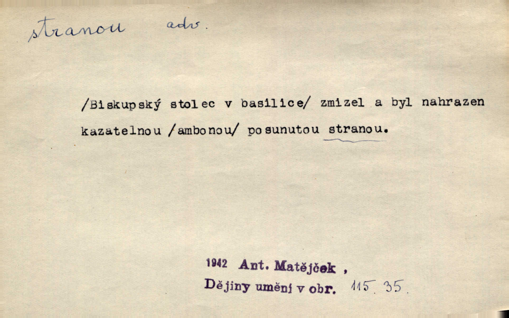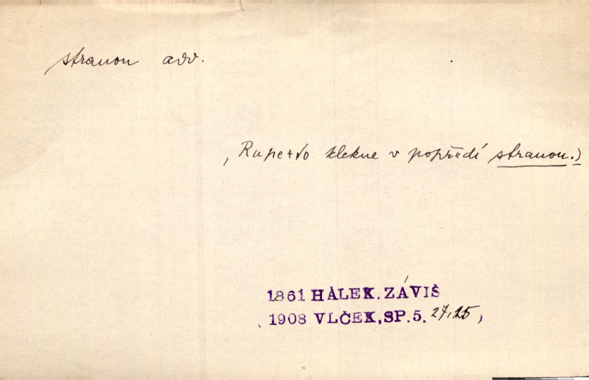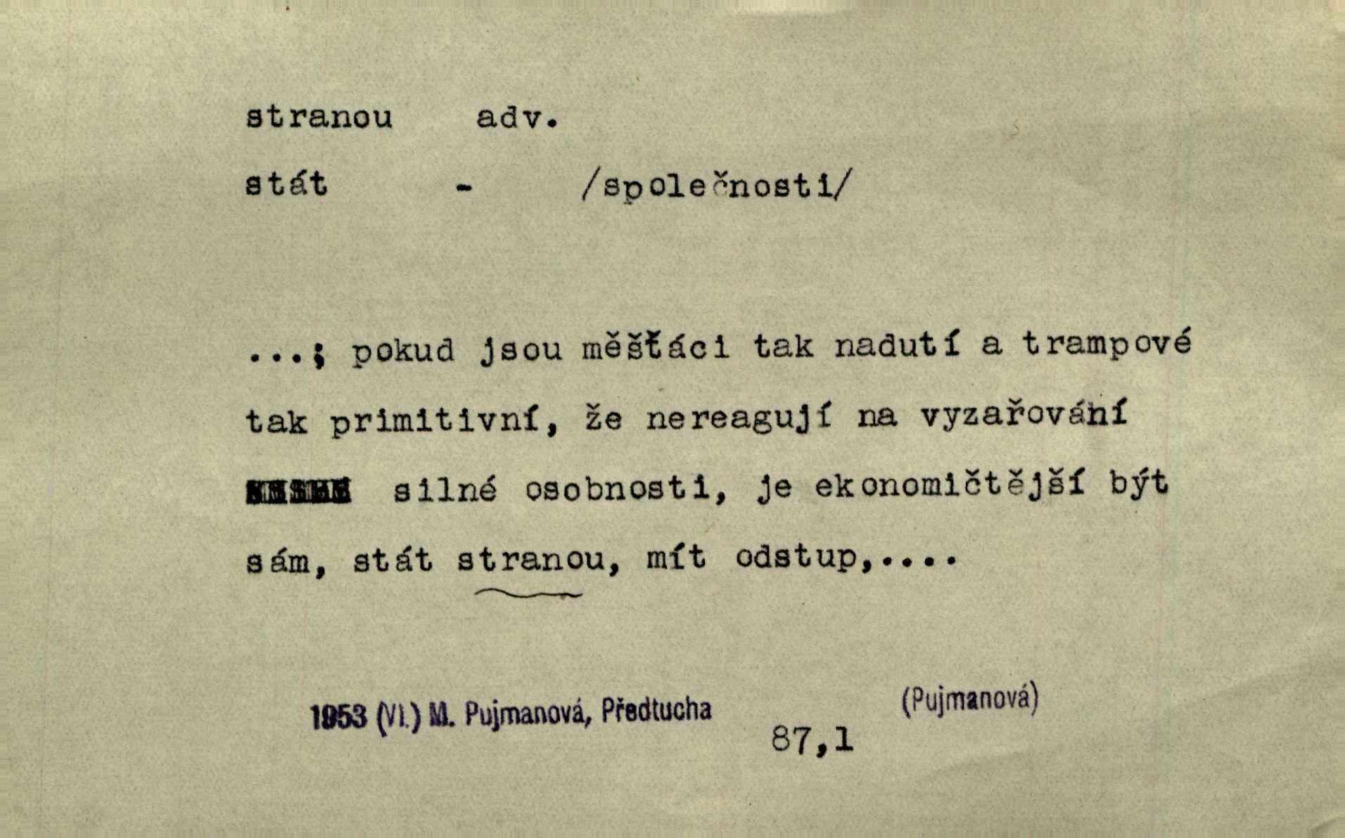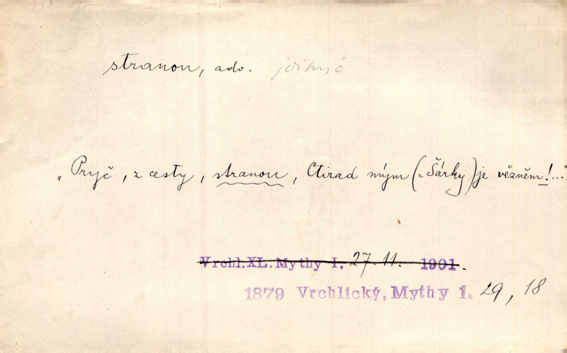 - stranou adv. na jednu stranu, na straně, ke straně. Světlý kulatý klobouk maje stranou na kudrnaté hlavě, široké stuhy, visící se skřipce, hodil za ucho. Rais. Jak tomu mám rozumět? — tázal se Löwenwartl, nakloniv stranou hlavu. J. J. Kol. Každý deštník nakloněný stranou mníš být hlavou houby nadulé. Mach. D pryč s cesty, pryč z prostředí, v ústraní, do ústraní. Vyzdvihla svítilnu a dávala papíry stranou. Ner. [Cumel] ujev dítěti z úst, zapadl stranou, do peřinek. Jir. Odstrčil mě stranou. Šim. Vzal děvče stranou i navedl ji, aby vyslídila, kde má Józa fěrtoch uložený. Svět. Mérimée seděl stranou a kreslil. Vrch. Stranou šel abbé Dobrovský. Čech. Pryč, z cesty, stranou, Ctirad mým je vězněm! Vrch. Musil jsem nechat vše stranou a s tebou promluvit. Svět. Polož ty peníze někam stranou! Budeš je brzy potřebovat ulož. Zey. Může i tak dávati týdně stranou, byť i nevelký obnos. Her. D opodál, poněkud vzdáleně. Ulice Giulia leží stranou od čtvrti. Zey. Skoro uprostřed návrší, od vozové cesty stranou, rozkládal se hřbitov. Hál. Stranou od něho seděl Salem. Hál. Stranou od hlavní brány na náspích na slunci se hřáli. Ehrenb. Stranou se táhl velký les. Svět. D šikmo, kose, úkosem. Pavel díval se stranou. Maj. Přicházelo to stranou od háje. Tyl. Literáci dívali se naň stranou, ale dělal, jako by neviděl. Rais. D v nevýznamnosti, v podřízeném postavení, do podřízeného postavení. Vše ostatní zůstává u nich stranou. Svět. Sousedé se mrzeli, že dědeček je tak stranou. Svět. Vejměnkář je vejměnkář, ten ať jde stranou a nikomu nepřekáží. Rais. Tu přišel mandát a Laudon musil stranou byl odstraněn. Jir. D tajně, potají, skrytě. „Starý kaprál“ přezdíval mu stranou dráb Haťárek. Jir. [Poslanec] jen lysou hlavou rázně kýval, svorně hlasoval a stranou zíval. Čech. Odložíc je [jablko] s povzdechem stranou, rozkrojila druhé pro Barunku. Něm.