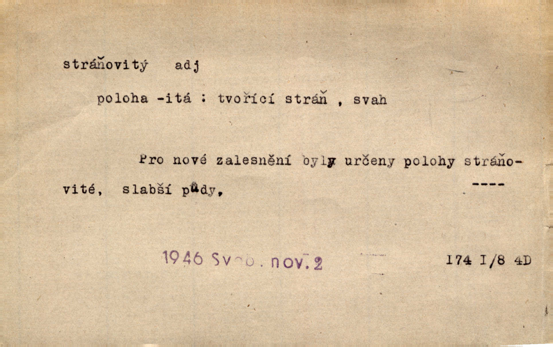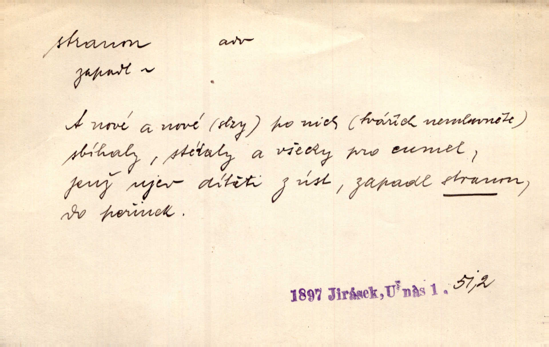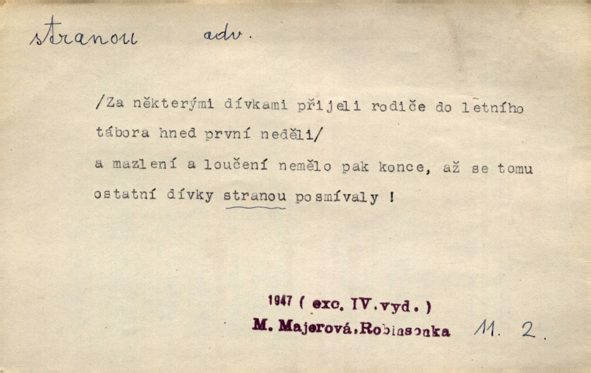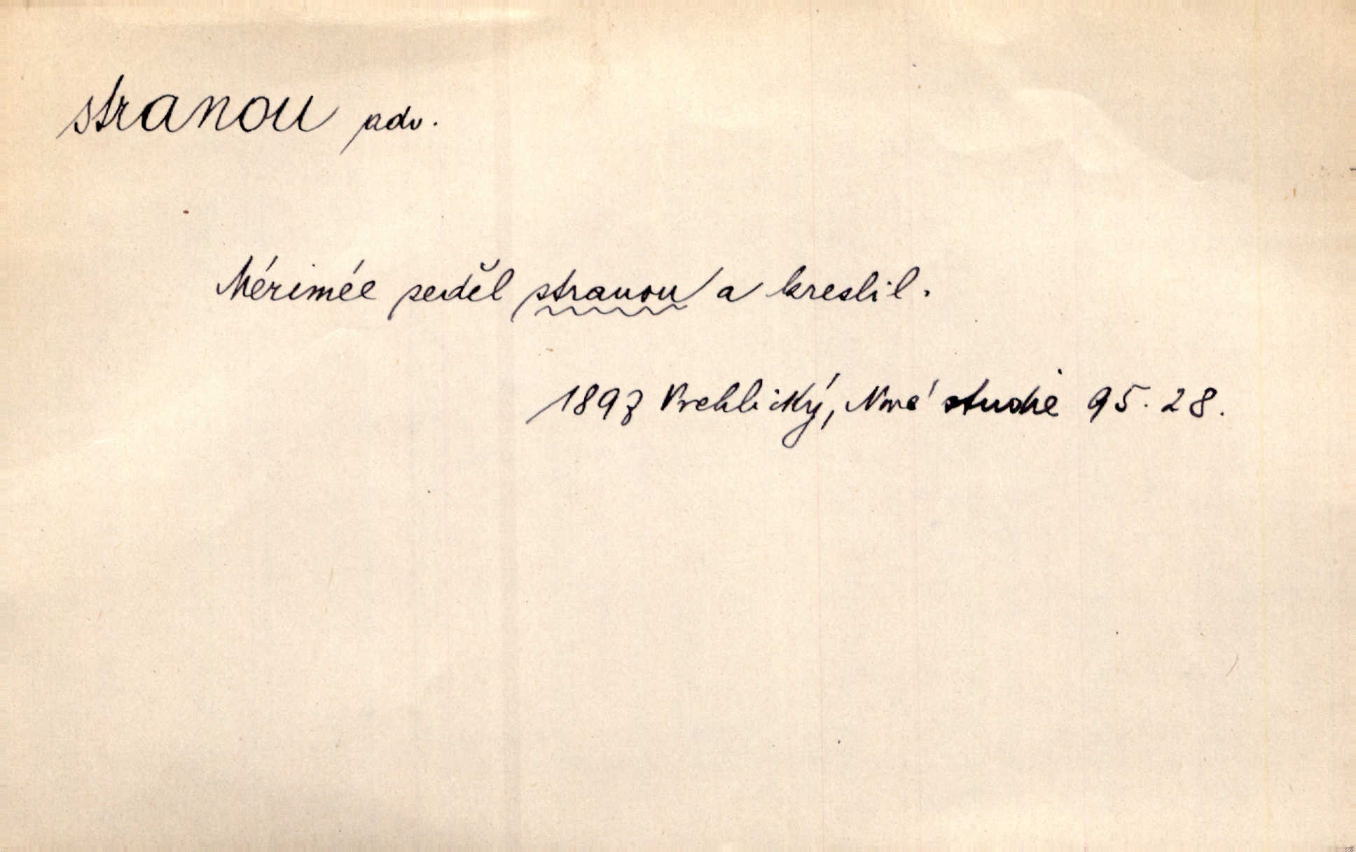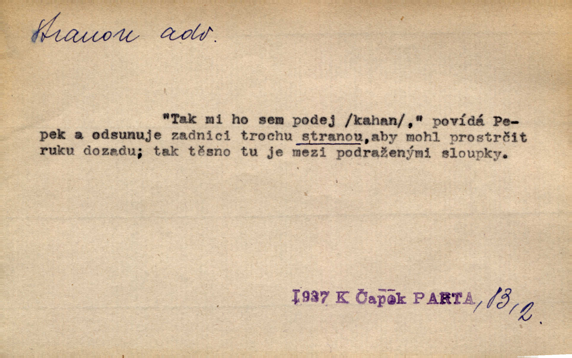 - stranou adv. na jednu stranu, na straně, ke straně. Světlý kulatý klobouk maje stranou na kudrnaté hlavě, široké stuhy, visící se skřipce, hodil za ucho. Rais. Jak tomu mám rozumět? — tázal se Löwenwartl, nakloniv stranou hlavu. J. J. Kol. Každý deštník nakloněný stranou mníš být hlavou houby nadulé. Mach. D pryč s cesty, pryč z prostředí, v ústraní, do ústraní. Vyzdvihla svítilnu a dávala papíry stranou. Ner. [Cumel] ujev dítěti z úst, zapadl stranou, do peřinek. Jir. Odstrčil mě stranou. Šim. Vzal děvče stranou i navedl ji, aby vyslídila, kde má Józa fěrtoch uložený. Svět. Mérimée seděl stranou a kreslil. Vrch. Stranou šel abbé Dobrovský. Čech. Pryč, z cesty, stranou, Ctirad mým je vězněm! Vrch. Musil jsem nechat vše stranou a s tebou promluvit. Svět. Polož ty peníze někam stranou! Budeš je brzy potřebovat ulož. Zey. Může i tak dávati týdně stranou, byť i nevelký obnos. Her. D opodál, poněkud vzdáleně. Ulice Giulia leží stranou od čtvrti. Zey. Skoro uprostřed návrší, od vozové cesty stranou, rozkládal se hřbitov. Hál. Stranou od něho seděl Salem. Hál. Stranou od hlavní brány na náspích na slunci se hřáli. Ehrenb. Stranou se táhl velký les. Svět. D šikmo, kose, úkosem. Pavel díval se stranou. Maj. Přicházelo to stranou od háje. Tyl. Literáci dívali se naň stranou, ale dělal, jako by neviděl. Rais. D v nevýznamnosti, v podřízeném postavení, do podřízeného postavení. Vše ostatní zůstává u nich stranou. Svět. Sousedé se mrzeli, že dědeček je tak stranou. Svět. Vejměnkář je vejměnkář, ten ať jde stranou a nikomu nepřekáží. Rais. Tu přišel mandát a Laudon musil stranou byl odstraněn. Jir. D tajně, potají, skrytě. „Starý kaprál“ přezdíval mu stranou dráb Haťárek. Jir. [Poslanec] jen lysou hlavou rázně kýval, svorně hlasoval a stranou zíval. Čech. Odložíc je [jablko] s povzdechem stranou, rozkrojila druhé pro Barunku. Něm.
