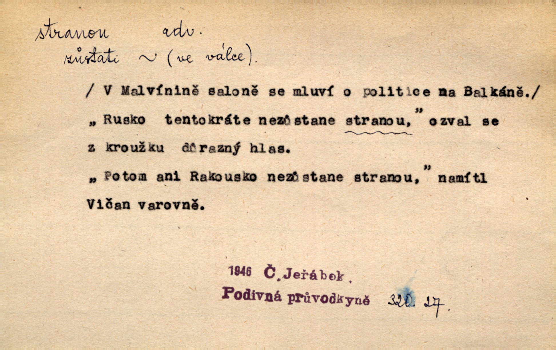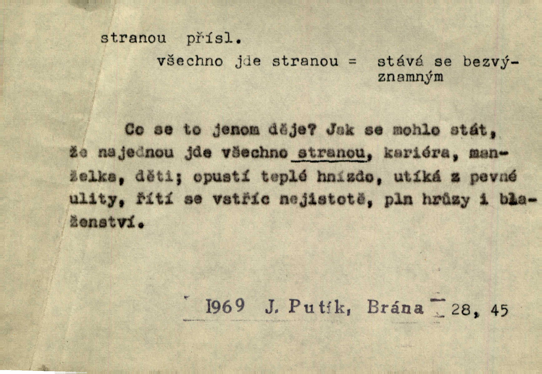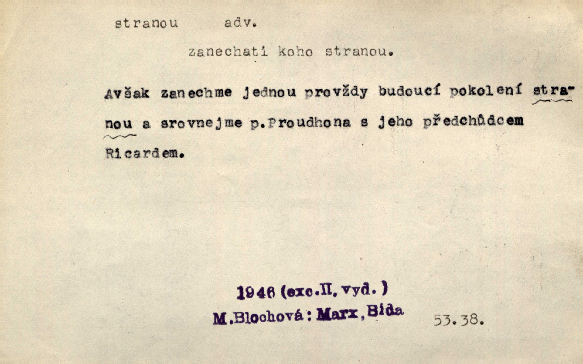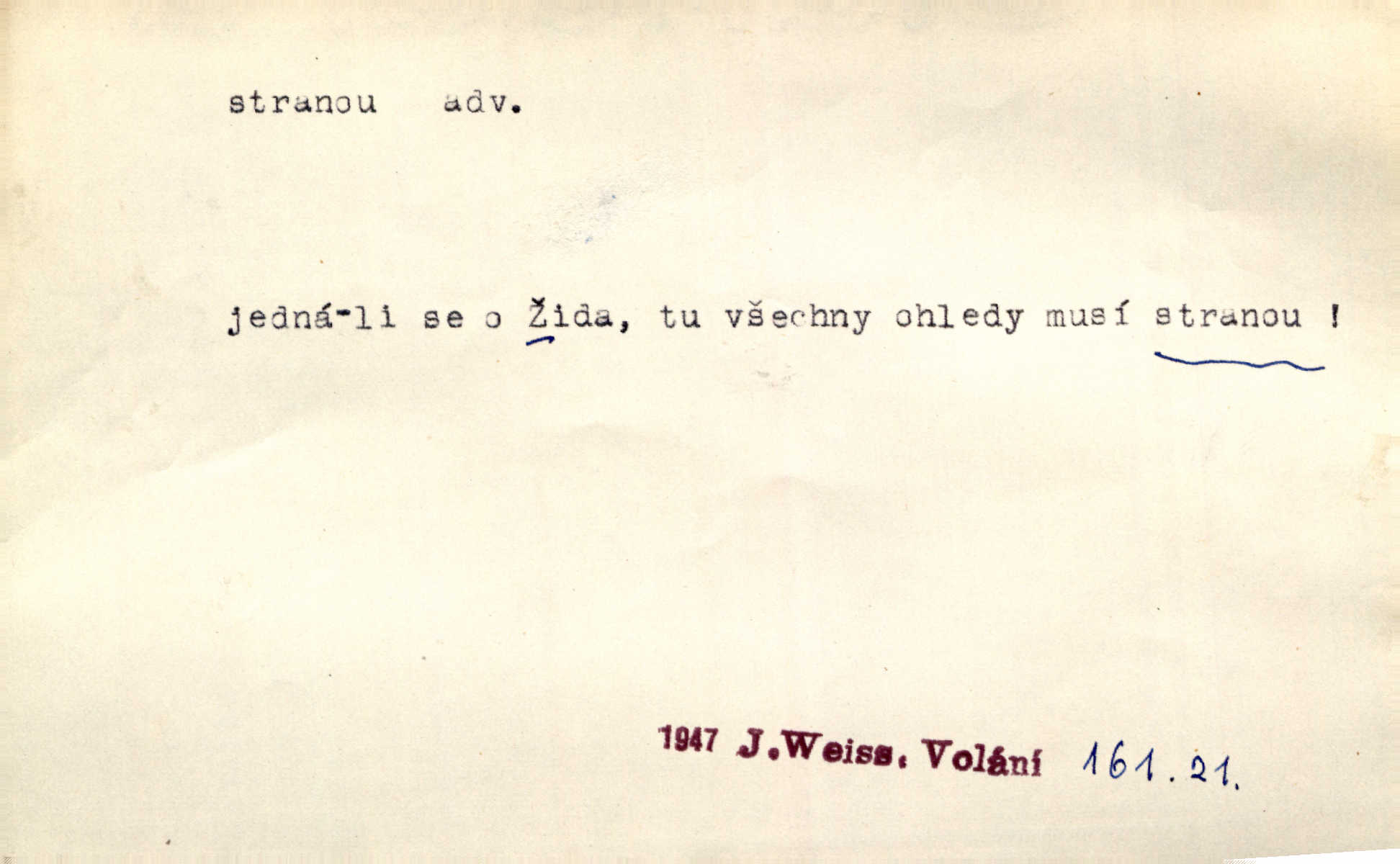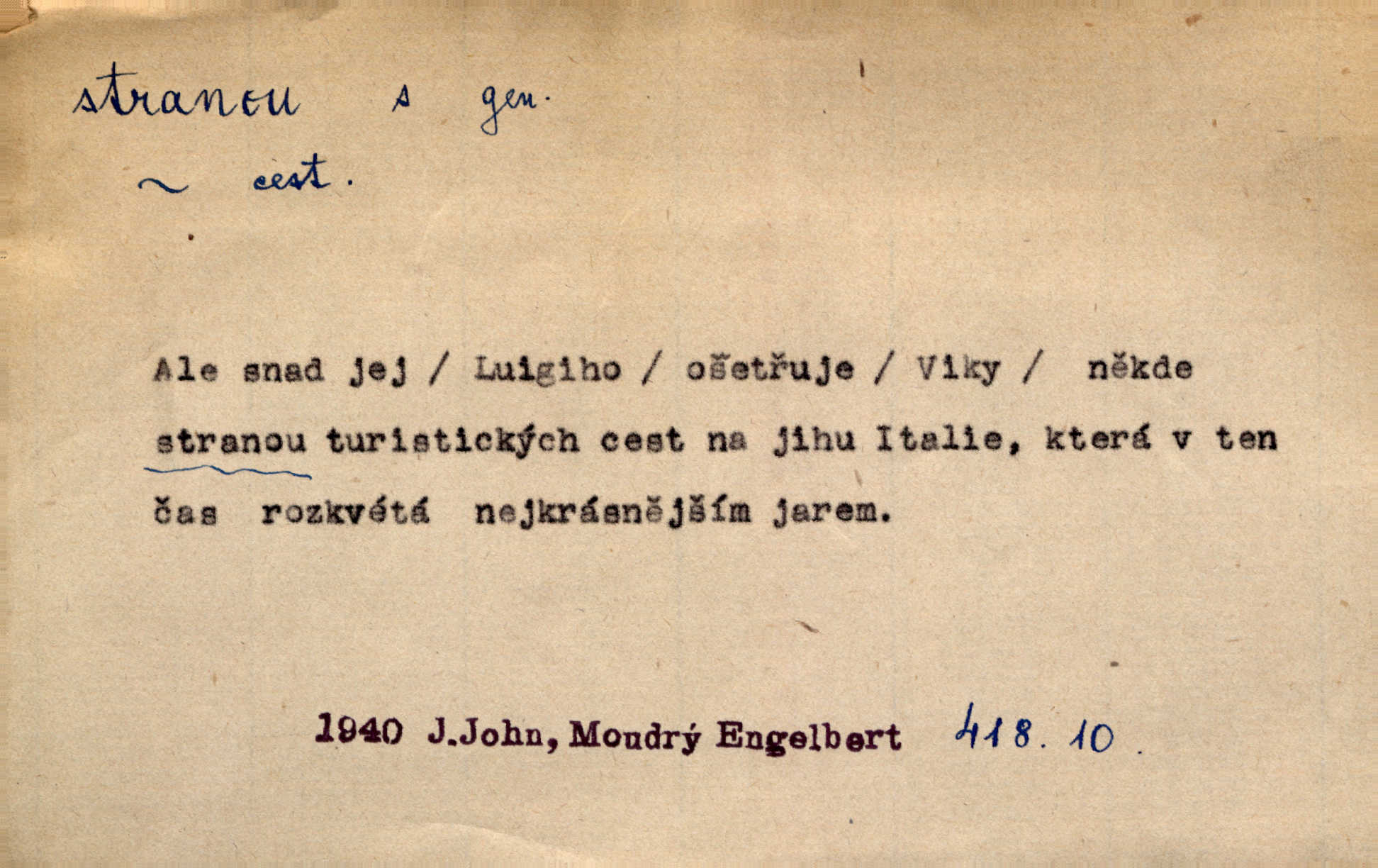 - stranou adv. na jednu stranu, na straně, ke straně. Světlý kulatý klobouk maje stranou na kudrnaté hlavě, široké stuhy, visící se skřipce, hodil za ucho. Rais. Jak tomu mám rozumět? — tázal se Löwenwartl, nakloniv stranou hlavu. J. J. Kol. Každý deštník nakloněný stranou mníš být hlavou houby nadulé. Mach. D pryč s cesty, pryč z prostředí, v ústraní, do ústraní. Vyzdvihla svítilnu a dávala papíry stranou. Ner. [Cumel] ujev dítěti z úst, zapadl stranou, do peřinek. Jir. Odstrčil mě stranou. Šim. Vzal děvče stranou i navedl ji, aby vyslídila, kde má Józa fěrtoch uložený. Svět. Mérimée seděl stranou a kreslil. Vrch. Stranou šel abbé Dobrovský. Čech. Pryč, z cesty, stranou, Ctirad mým je vězněm! Vrch. Musil jsem nechat vše stranou a s tebou promluvit. Svět. Polož ty peníze někam stranou! Budeš je brzy potřebovat ulož. Zey. Může i tak dávati týdně stranou, byť i nevelký obnos. Her. D opodál, poněkud vzdáleně. Ulice Giulia leží stranou od čtvrti. Zey. Skoro uprostřed návrší, od vozové cesty stranou, rozkládal se hřbitov. Hál. Stranou od něho seděl Salem. Hál. Stranou od hlavní brány na náspích na slunci se hřáli. Ehrenb. Stranou se táhl velký les. Svět. D šikmo, kose, úkosem. Pavel díval se stranou. Maj. Přicházelo to stranou od háje. Tyl. Literáci dívali se naň stranou, ale dělal, jako by neviděl. Rais. D v nevýznamnosti, v podřízeném postavení, do podřízeného postavení. Vše ostatní zůstává u nich stranou. Svět. Sousedé se mrzeli, že dědeček je tak stranou. Svět. Vejměnkář je vejměnkář, ten ať jde stranou a nikomu nepřekáží. Rais. Tu přišel mandát a Laudon musil stranou byl odstraněn. Jir. D tajně, potají, skrytě. „Starý kaprál“ přezdíval mu stranou dráb Haťárek. Jir. [Poslanec] jen lysou hlavou rázně kýval, svorně hlasoval a stranou zíval. Čech. Odložíc je [jablko] s povzdechem stranou, rozkrojila druhé pro Barunku. Něm.