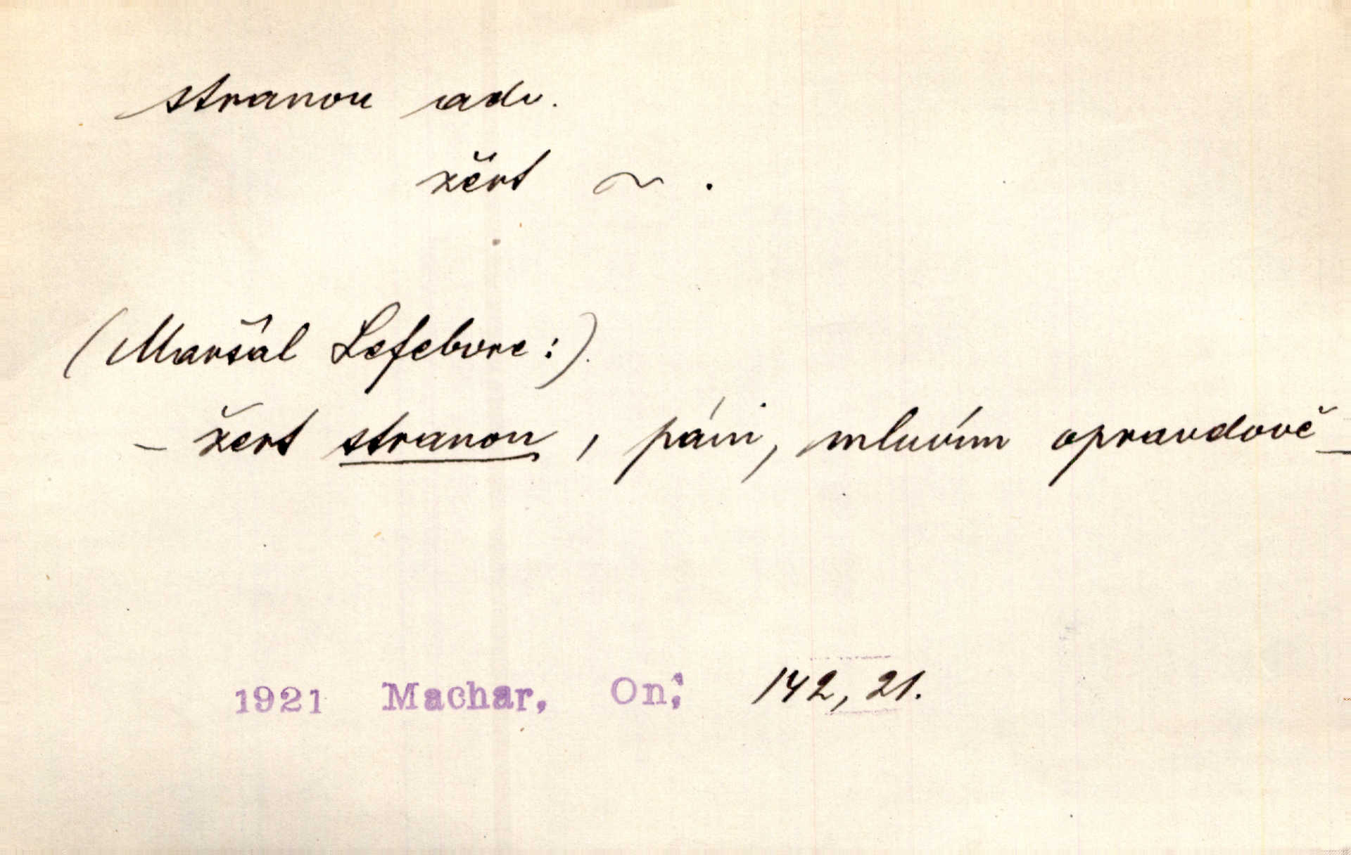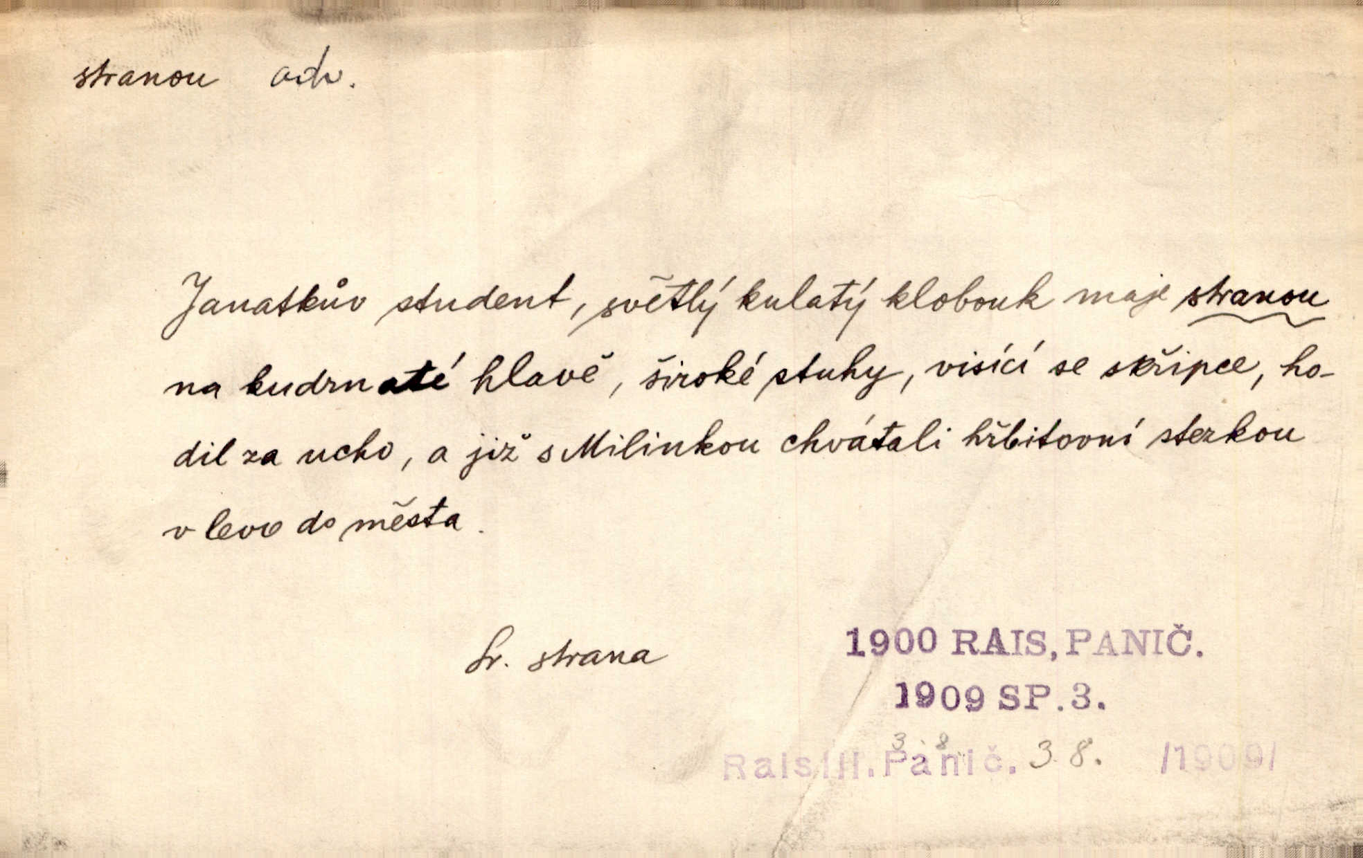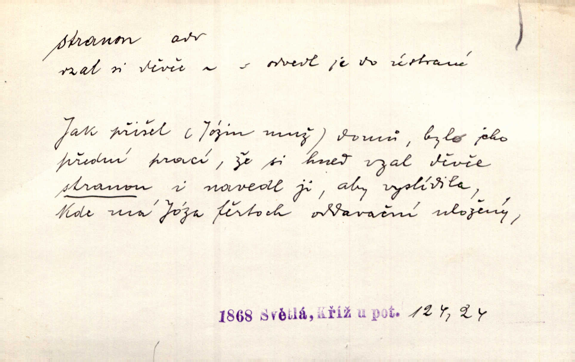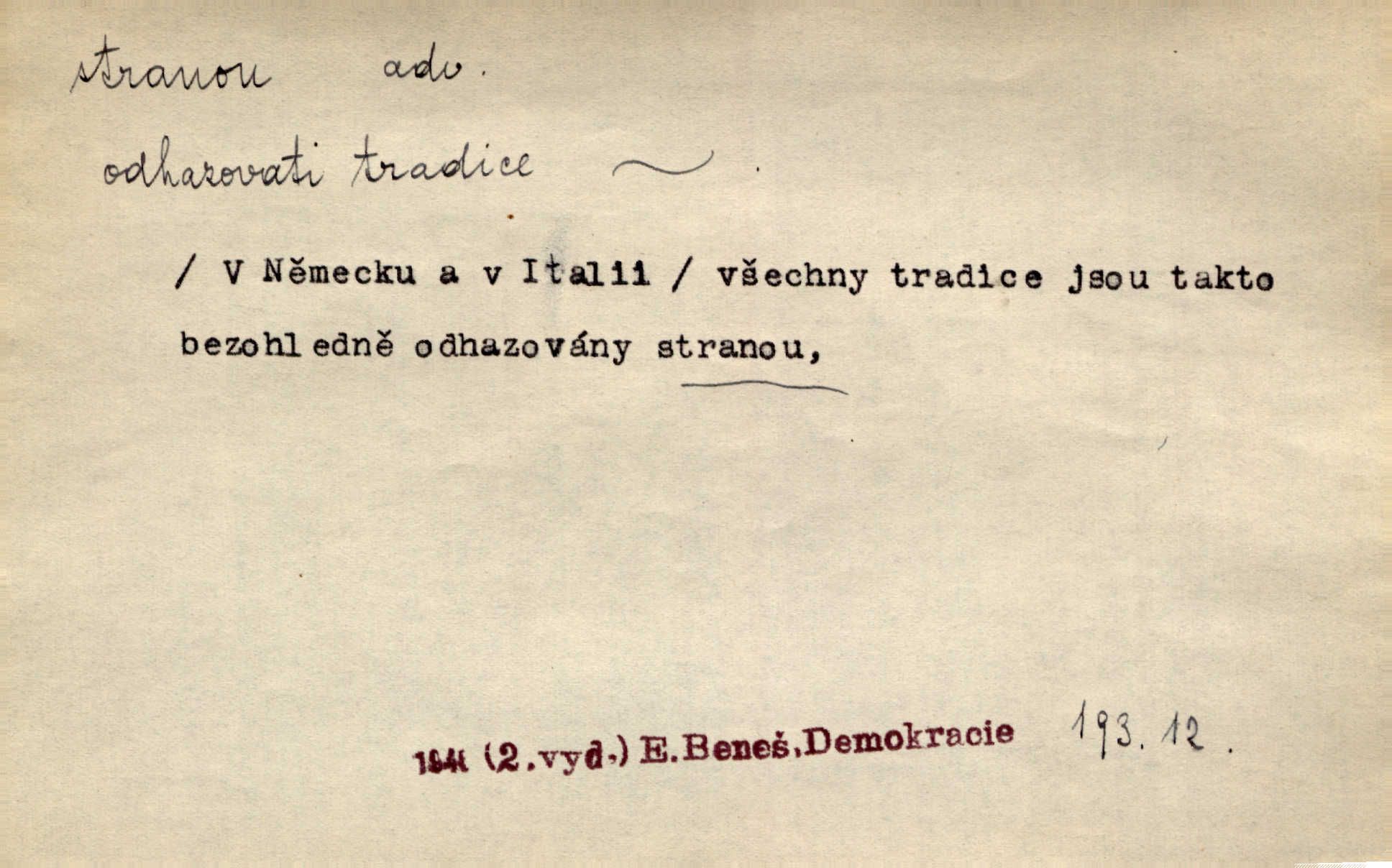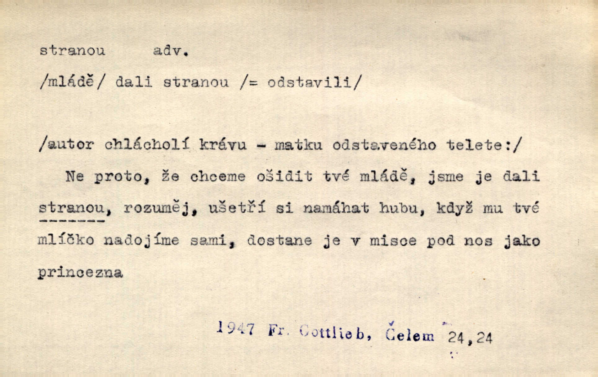 - stranou adv. na jednu stranu, na straně, ke straně. Světlý kulatý klobouk maje stranou na kudrnaté hlavě, široké stuhy, visící se skřipce, hodil za ucho. Rais. Jak tomu mám rozumět? — tázal se Löwenwartl, nakloniv stranou hlavu. J. J. Kol. Každý deštník nakloněný stranou mníš být hlavou houby nadulé. Mach. D pryč s cesty, pryč z prostředí, v ústraní, do ústraní. Vyzdvihla svítilnu a dávala papíry stranou. Ner. [Cumel] ujev dítěti z úst, zapadl stranou, do peřinek. Jir. Odstrčil mě stranou. Šim. Vzal děvče stranou i navedl ji, aby vyslídila, kde má Józa fěrtoch uložený. Svět. Mérimée seděl stranou a kreslil. Vrch. Stranou šel abbé Dobrovský. Čech. Pryč, z cesty, stranou, Ctirad mým je vězněm! Vrch. Musil jsem nechat vše stranou a s tebou promluvit. Svět. Polož ty peníze někam stranou! Budeš je brzy potřebovat ulož. Zey. Může i tak dávati týdně stranou, byť i nevelký obnos. Her. D opodál, poněkud vzdáleně. Ulice Giulia leží stranou od čtvrti. Zey. Skoro uprostřed návrší, od vozové cesty stranou, rozkládal se hřbitov. Hál. Stranou od něho seděl Salem. Hál. Stranou od hlavní brány na náspích na slunci se hřáli. Ehrenb. Stranou se táhl velký les. Svět. D šikmo, kose, úkosem. Pavel díval se stranou. Maj. Přicházelo to stranou od háje. Tyl. Literáci dívali se naň stranou, ale dělal, jako by neviděl. Rais. D v nevýznamnosti, v podřízeném postavení, do podřízeného postavení. Vše ostatní zůstává u nich stranou. Svět. Sousedé se mrzeli, že dědeček je tak stranou. Svět. Vejměnkář je vejměnkář, ten ať jde stranou a nikomu nepřekáží. Rais. Tu přišel mandát a Laudon musil stranou byl odstraněn. Jir. D tajně, potají, skrytě. „Starý kaprál“ přezdíval mu stranou dráb Haťárek. Jir. [Poslanec] jen lysou hlavou rázně kýval, svorně hlasoval a stranou zíval. Čech. Odložíc je [jablko] s povzdechem stranou, rozkrojila druhé pro Barunku. Něm.