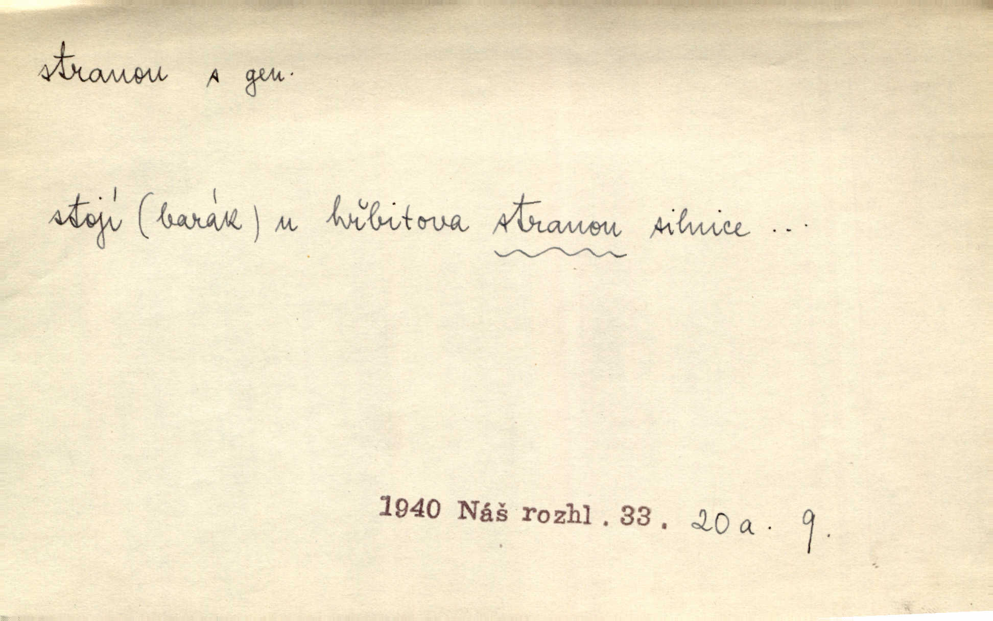 - stranou předl. s gen. poněk. zast. vyjadřuje umístění po straně, nedaleko něčeho, v malé vzdálenosti n. odlehle od něčeho. Stranou města na vysočině stojí pevná šibenice. Něm. Tam na hoře stranou těch věží je Strahovská brána. V. Mrš. V pravo, stranou řeky, probělával se za stromy panský dvůr. Jir. [Barák] stojí u hřbitova stranou silnice. Rozhlas. [Milevsko leží] v kraji, který dlouho byl stranou světa, opuštěný a osamělý. Týd. rozhl. Stranou všeho zápolení stál Neruda. Mach. — V. t. stran.