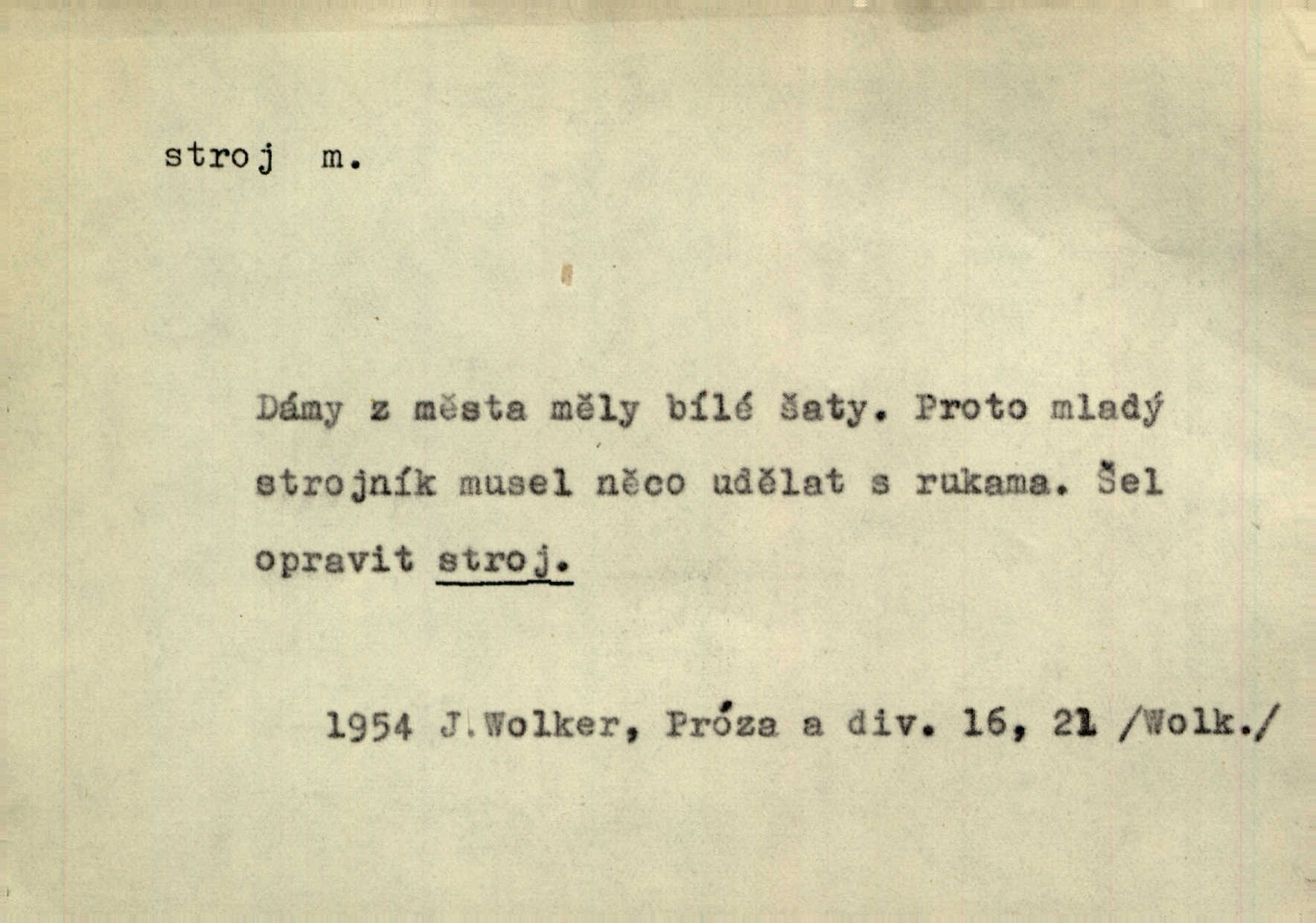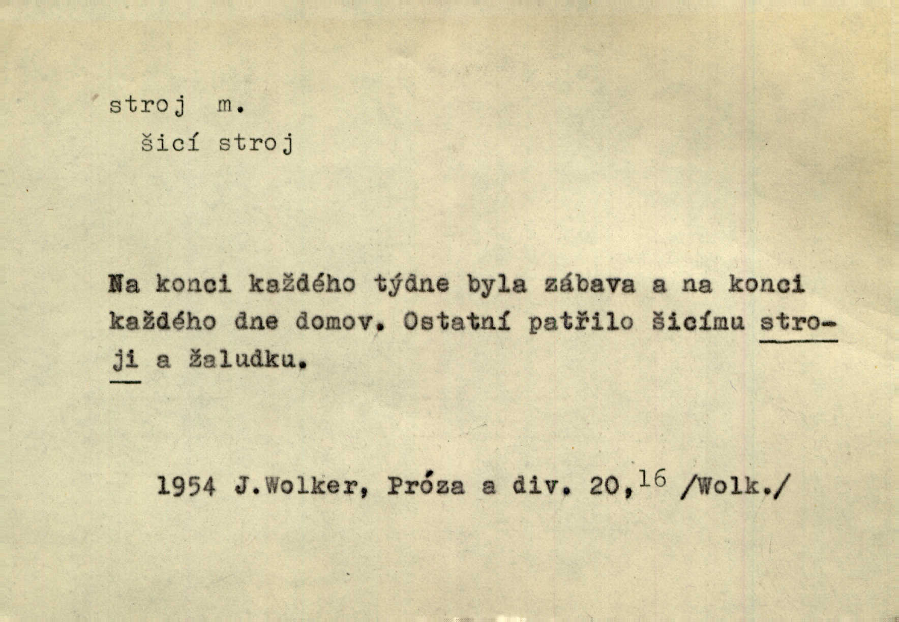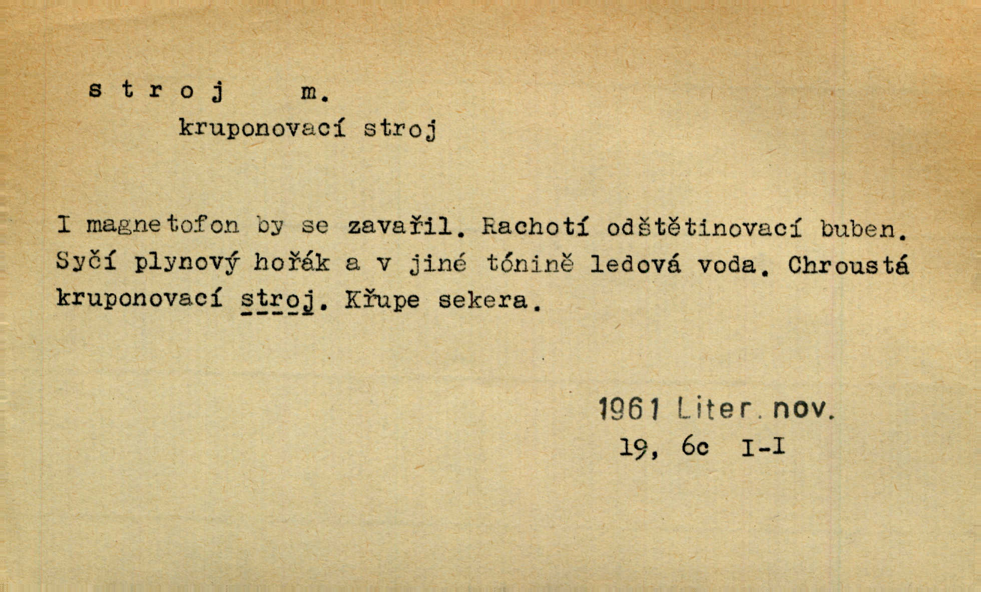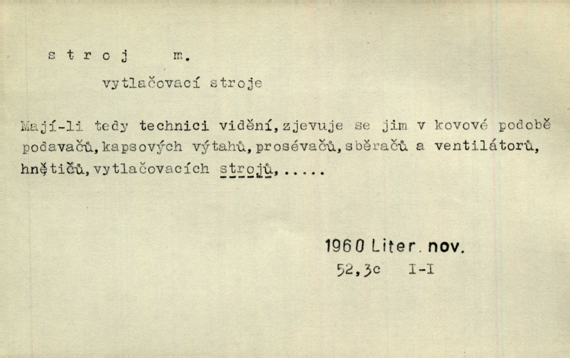 - stroj, -e m. složité zařízení na mechanické vykonávání práce; řidč. přístroj. Třetího [dělníka] zachytil stroj za ruku a rozdrtil mu ji. Herb. Když je secí stroj, je setí hračkou. Směja. Naproti drnčel šicí stroj. Mach. Sotva znatelné P stkvělo se na konci těchto pěti slov, do stroje diktovaných psacího. Čap. Ch. A za houfem jely dva vozy, na nichž jsou jistě naloženy nějaké obléhací stroje. Jir. Dost mám strojů v mučírně. Heyd. Konečně připadli lidé na hodiny se stroji, kolečky, pery, kyvadly atd. Ner. Ztratili v devíti dnech téměř tři sta strojů letadel. Týd. rozhl. Vtáhla celý stroj [jízdní kolo] do kuchyně. Maj. Ve velkých strojích se ukáže její hvězdná krása překvapujícím způsobem dalekohledech. Slouka. Svoje povinnosti vykonával jako stroj. Herb. Abrámek nedá se snížiti za pouhý stroj, na pouhého služebníka. Šmil. Hnal se jako stroj, jenž má uvnitř plno plamenů. Rais. Fys. každé zařízení k přenášení mechanické síly. Stroj parní, hnací a j. Stroj mláticí, šicí a j. Stroje kancelářské technická zařízení usnadňující kancelářské práce. Stroje psací, počítací, adresovací, rozmnožovací a j. Tech. pekelný stroj D Zast. nástroj, zvl. hudební. Kdo dosud byl řemeslníkem a oráčem, nechal všelikých strojův a chápal se zbraně. Jir. V tom rozkázal Šternberk muzikářům, aby začali v stroje své hráti muziky veselé. Win. Chápe poutník stroj; jme se děvě hrát. Kalina. Dovedla všecko zahrát a na jakýkoli stroj. Podl. Otevřel stroj [piano], přišoupl slečně sedadlo. Svět. D stroj, -e m. i f. zast. a kniž. způsob oblékání, ústroj, oděv, šat. Mladá malířka se ovšem nevyrovnala žádné z přítomných nádherou strojů. Jir. I počala se zámožnost jeviti i ve stroji. Nov. Bručel třetí [muž], dle kroje a stroje panský dráb. Šmil. Měnila nevědomky i svou podobu i svůj hlas a stroj. V. Mrš. Oblékne se pokaždé potápěč v celou svou stroj Světozor. V ženský stroj se přetvořují [muži]. Puchm. D Zř. postroj. Ještě jednou zableskl se skvělý stroj koní v jasném paprsku tam proniknuvším. Jir. Slavný kůň byl v zlaté stroji u starého chána. Vym. D stroj, -e m. řidč. organisace, organismus, stavba, struktura. Duše jeho [českého lidu], jeho myšlenkový i citový stroj hrubě se neproměnily. Hol. Ovládala dobře a vypočítavě složitý stroj svých citů. Hlad. O mně jakožto historiku mnozí lidé ani dovtípiti se neuměli, kterak já mohl přimlouvati se za stroj patrně revoluční, jakový bylo roztřídění říše Rakouské dle národností. Pal. S nastávajícím jarem rozjel se Hitlerův válečný stroj a udeřil na Dánsko a Norsko. J. Hron. Vedení boje proti nepřátelskému válečnému stroji. Gottw. D Zř. strojenost. Jsi dítě milé, prosté, beze stroje — snad nedovedeš změřit city moje. Hál. D Zř. chod při jídle. Měli jsme strojů na kolikero, ale od žádného mnoho. Něm. D Zool. bobří stroj zvláštní orgán na zadní části bobřího těla; tekutina jím vylučovaná. — V. t. strůj.