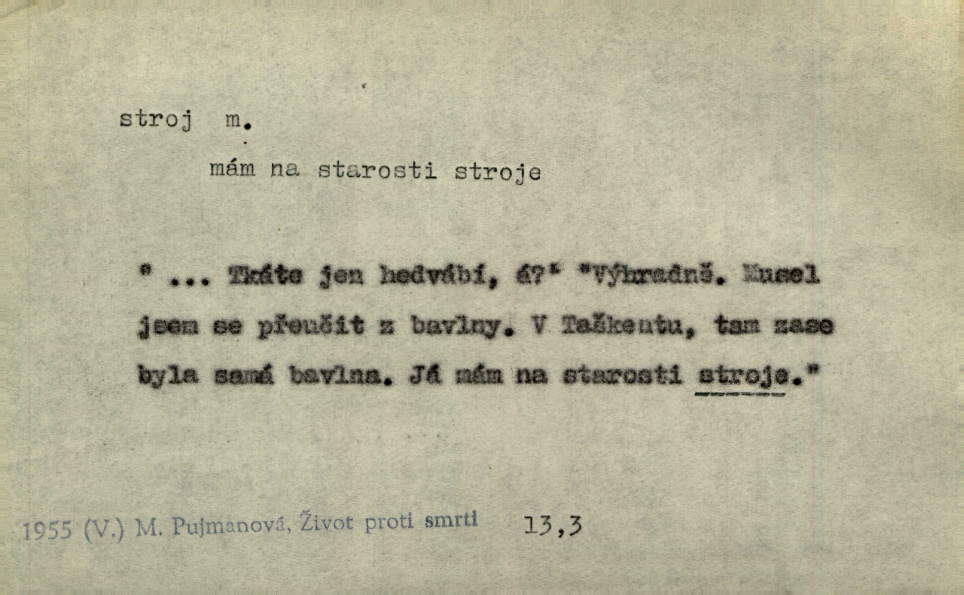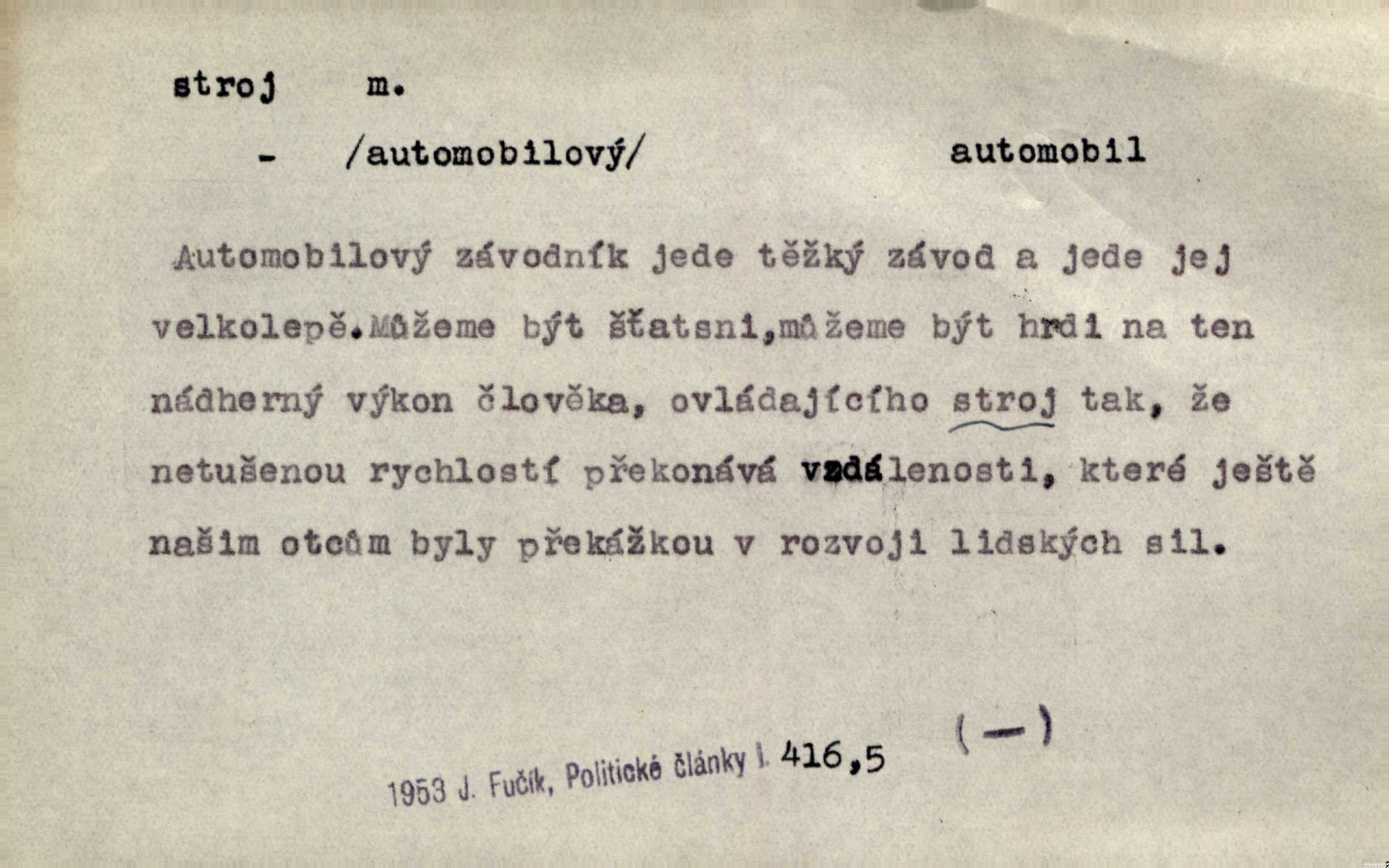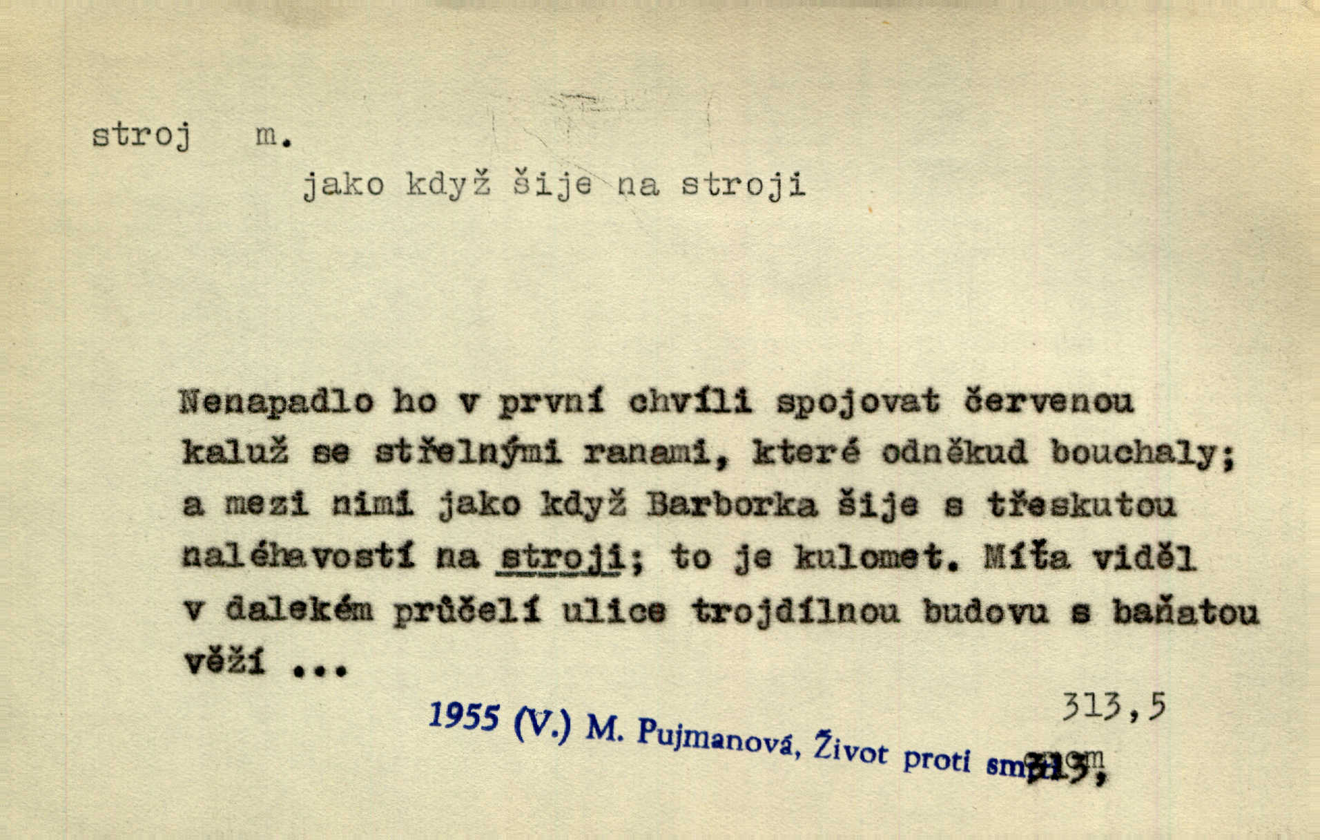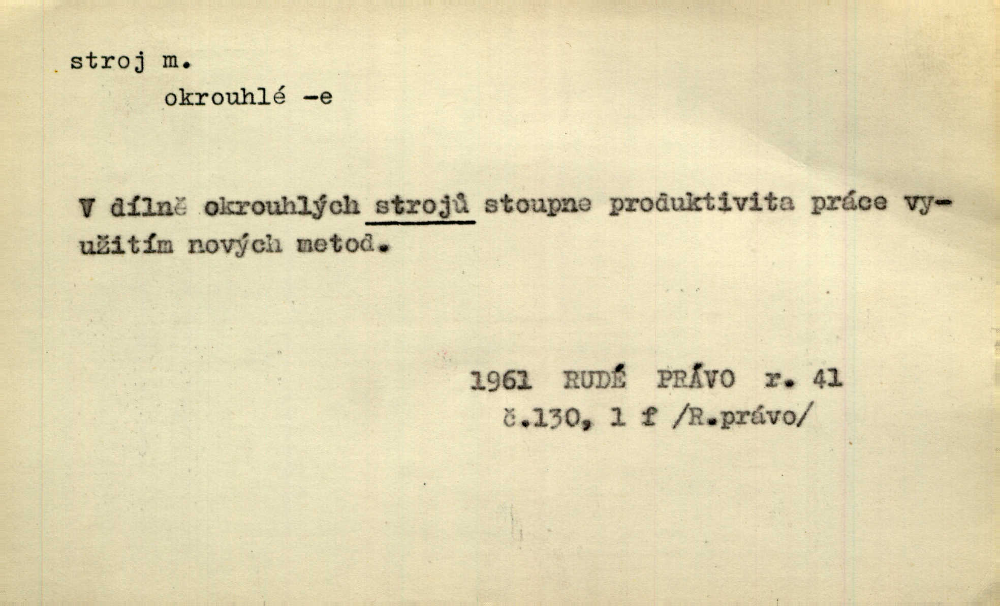 - stroj, -e m. složité zařízení na mechanické vykonávání práce; řidč. přístroj. Třetího [dělníka] zachytil stroj za ruku a rozdrtil mu ji. Herb. Když je secí stroj, je setí hračkou. Směja. Naproti drnčel šicí stroj. Mach. Sotva znatelné P stkvělo se na konci těchto pěti slov, do stroje diktovaných psacího. Čap. Ch. A za houfem jely dva vozy, na nichž jsou jistě naloženy nějaké obléhací stroje. Jir. Dost mám strojů v mučírně. Heyd. Konečně připadli lidé na hodiny se stroji, kolečky, pery, kyvadly atd. Ner. Ztratili v devíti dnech téměř tři sta strojů letadel. Týd. rozhl. Vtáhla celý stroj [jízdní kolo] do kuchyně. Maj. Ve velkých strojích se ukáže její hvězdná krása překvapujícím způsobem dalekohledech. Slouka. Svoje povinnosti vykonával jako stroj. Herb. Abrámek nedá se snížiti za pouhý stroj, na pouhého služebníka. Šmil. Hnal se jako stroj, jenž má uvnitř plno plamenů. Rais. Fys. každé zařízení k přenášení mechanické síly. Stroj parní, hnací a j. Stroj mláticí, šicí a j. Stroje kancelářské technická zařízení usnadňující kancelářské práce. Stroje psací, počítací, adresovací, rozmnožovací a j. Tech. pekelný stroj D Zast. nástroj, zvl. hudební. Kdo dosud byl řemeslníkem a oráčem, nechal všelikých strojův a chápal se zbraně. Jir. V tom rozkázal Šternberk muzikářům, aby začali v stroje své hráti muziky veselé. Win. Chápe poutník stroj; jme se děvě hrát. Kalina. Dovedla všecko zahrát a na jakýkoli stroj. Podl. Otevřel stroj [piano], přišoupl slečně sedadlo. Svět. D stroj, -e m. i f. zast. a kniž. způsob oblékání, ústroj, oděv, šat. Mladá malířka se ovšem nevyrovnala žádné z přítomných nádherou strojů. Jir. I počala se zámožnost jeviti i ve stroji. Nov. Bručel třetí [muž], dle kroje a stroje panský dráb. Šmil. Měnila nevědomky i svou podobu i svůj hlas a stroj. V. Mrš. Oblékne se pokaždé potápěč v celou svou stroj Světozor. V ženský stroj se přetvořují [muži]. Puchm. D Zř. postroj. Ještě jednou zableskl se skvělý stroj koní v jasném paprsku tam proniknuvším. Jir. Slavný kůň byl v zlaté stroji u starého chána. Vym. D stroj, -e m. řidč. organisace, organismus, stavba, struktura. Duše jeho [českého lidu], jeho myšlenkový i citový stroj hrubě se neproměnily. Hol. Ovládala dobře a vypočítavě složitý stroj svých citů. Hlad. O mně jakožto historiku mnozí lidé ani dovtípiti se neuměli, kterak já mohl přimlouvati se za stroj patrně revoluční, jakový bylo roztřídění říše Rakouské dle národností. Pal. S nastávajícím jarem rozjel se Hitlerův válečný stroj a udeřil na Dánsko a Norsko. J. Hron. Vedení boje proti nepřátelskému válečnému stroji. Gottw. D Zř. strojenost. Jsi dítě milé, prosté, beze stroje — snad nedovedeš změřit city moje. Hál. D Zř. chod při jídle. Měli jsme strojů na kolikero, ale od žádného mnoho. Něm. D Zool. bobří stroj zvláštní orgán na zadní části bobřího těla; tekutina jím vylučovaná. — V. t. strůj.