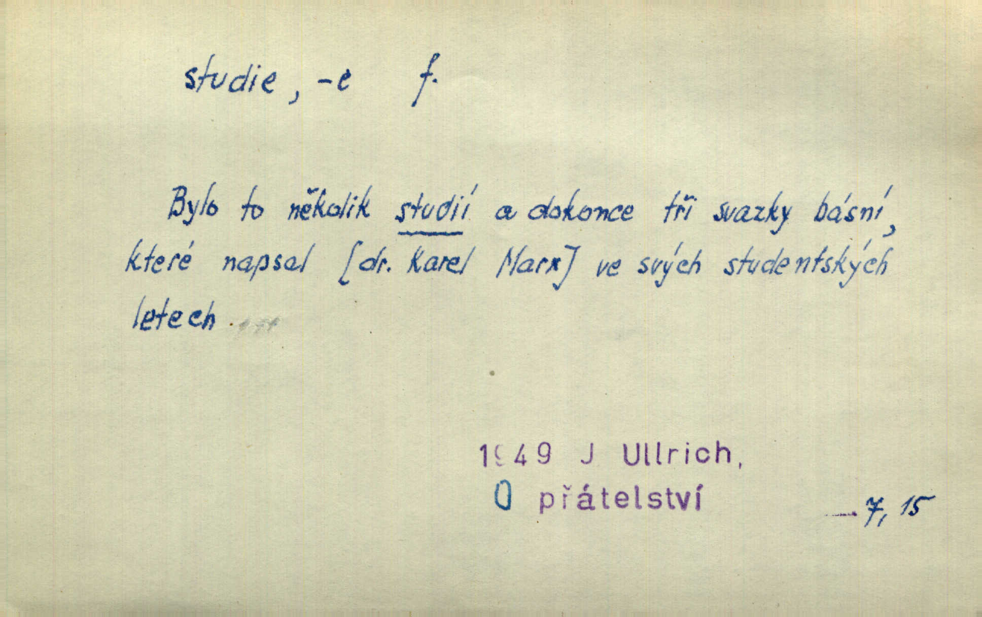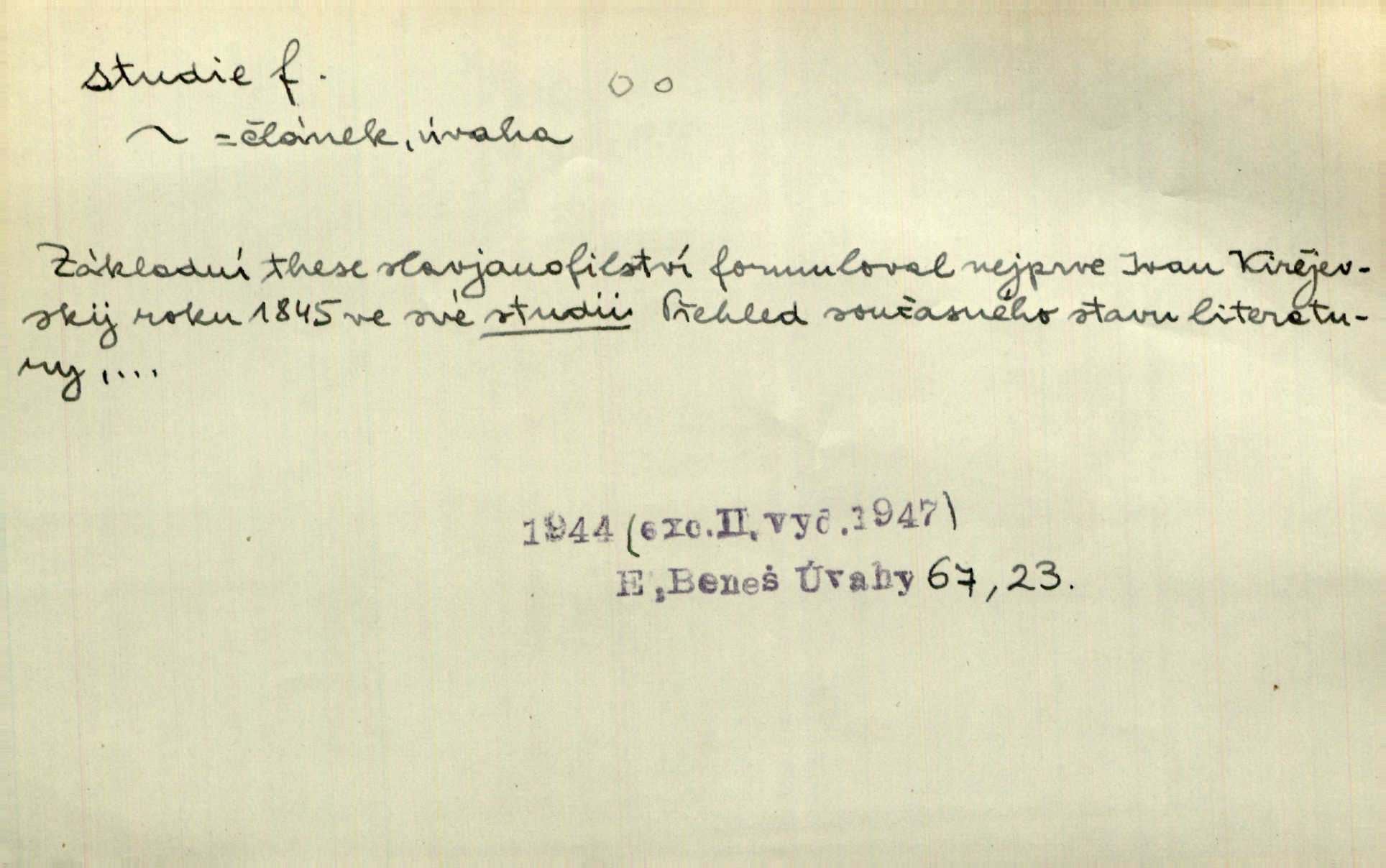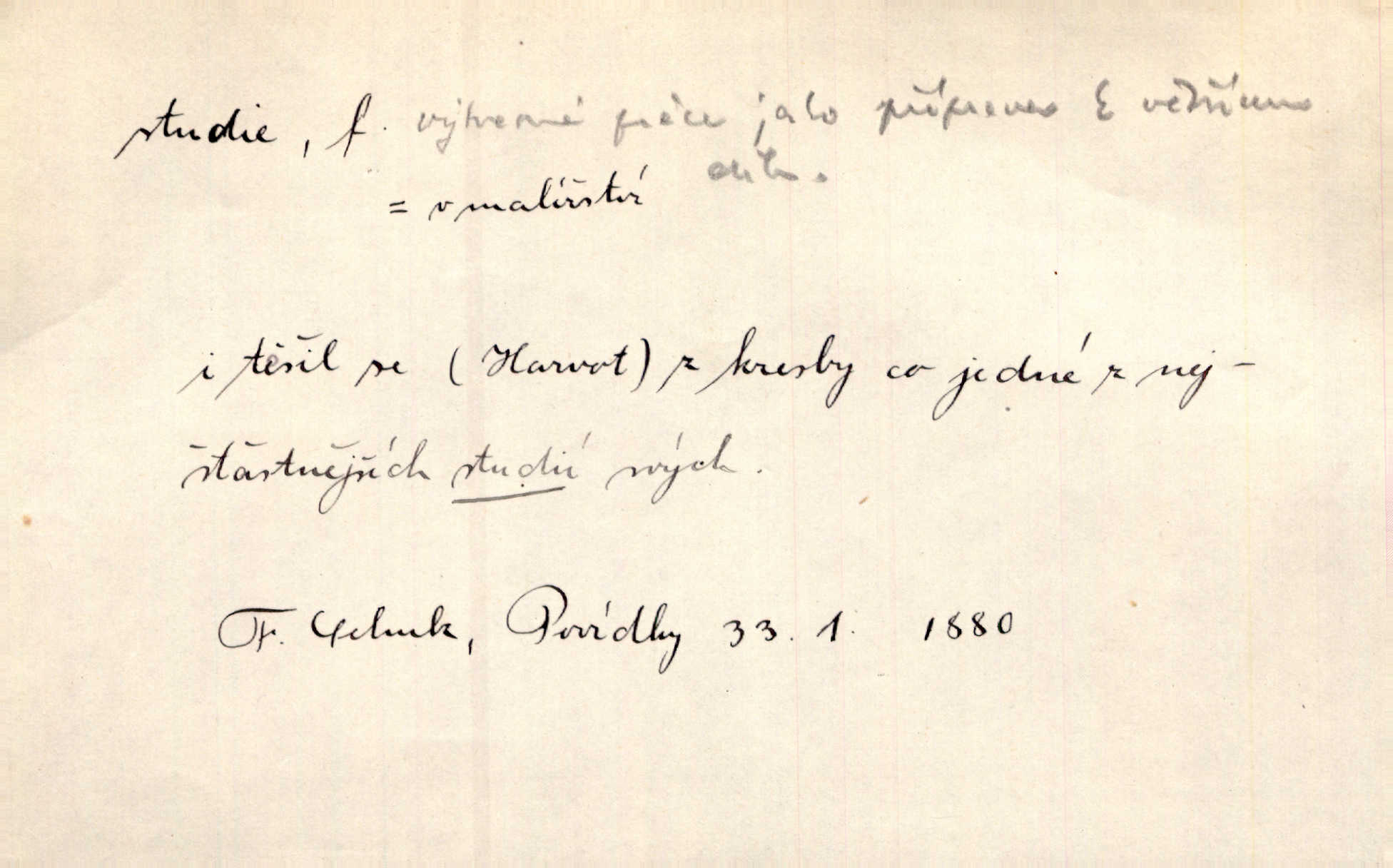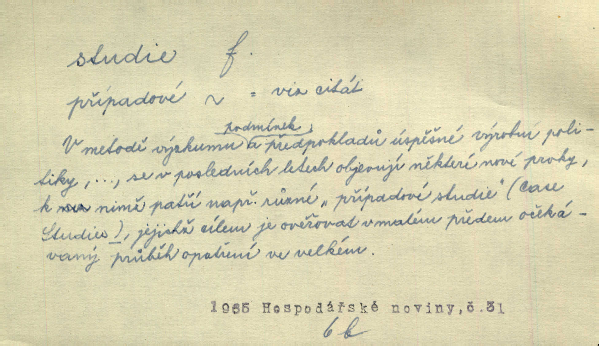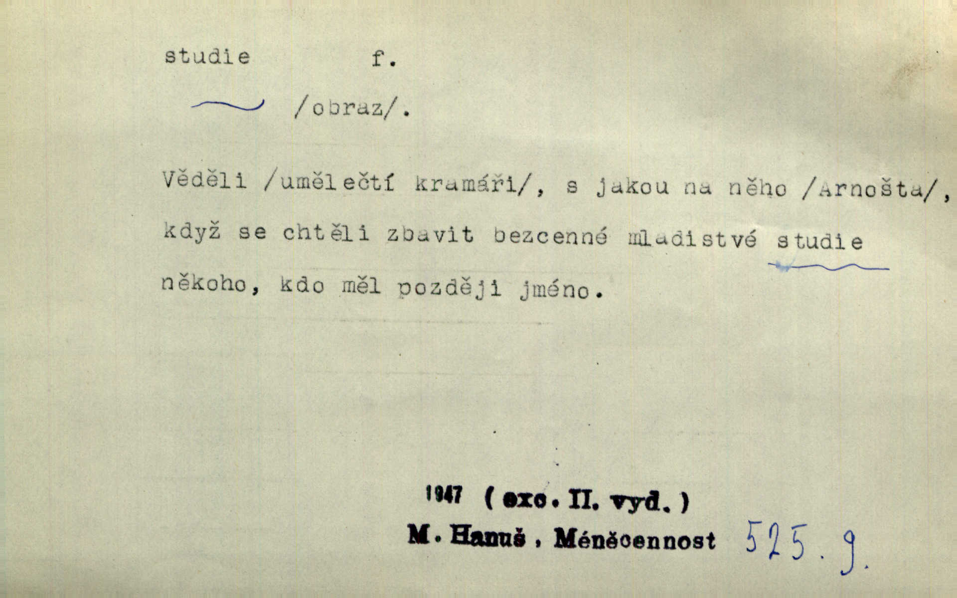 - studie (vysl. stúdyje), -e f. menší literární odborná práce, vědecký článek. Počal psáti studii „Vliv kouření“. Vach. Vyšly od něho spisy o umění a literatuře, z nichž studie o ďáblu v Božské komedii je pozoruhodná. Vrch. [B. Němcová] uveřejnila zajímavé a cenné studie lidopisné. Jir. D výtvarná práce jako příprava k většímu dílu. Těšil se z kresby co jedné z nejšťastnějších studií svých. Schulz. [Holbein, Dürer] udělali si ke každému portrétu několik skvěle a věrně prokreslených studií. Fr. Petr. — Sr. t. studium.