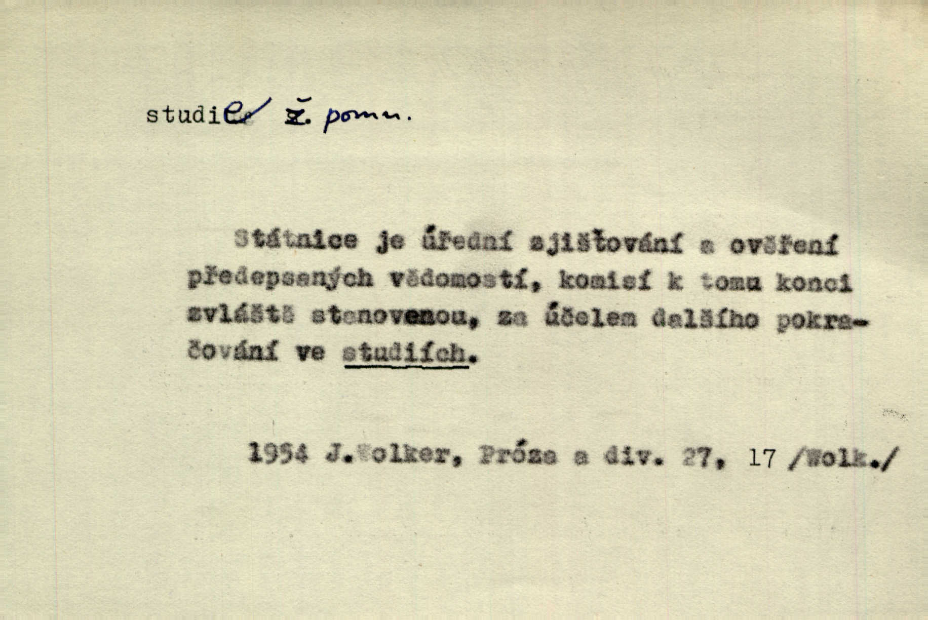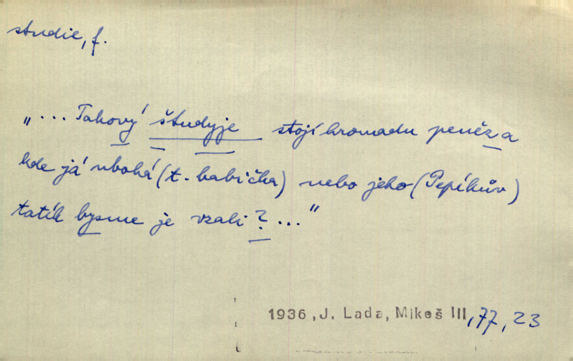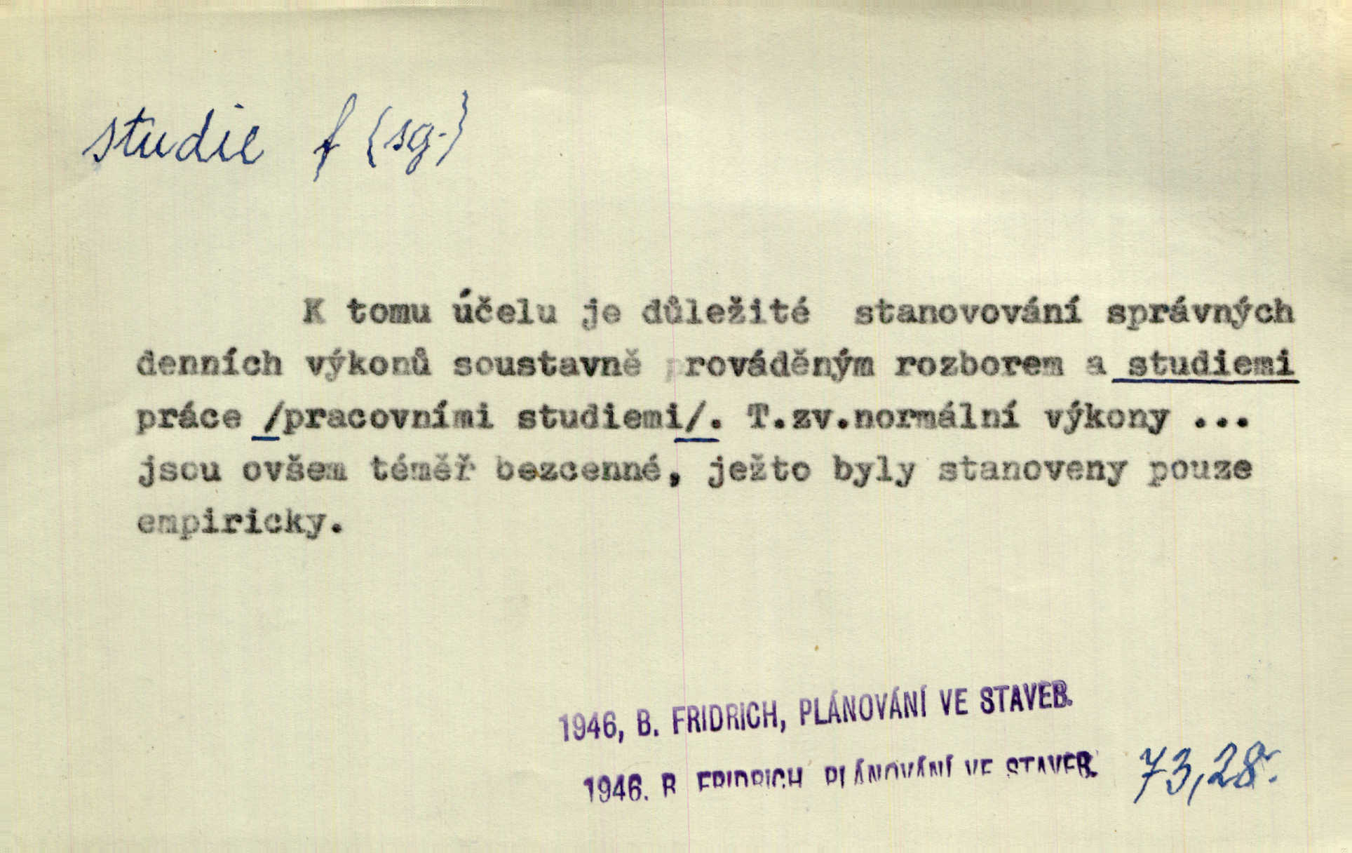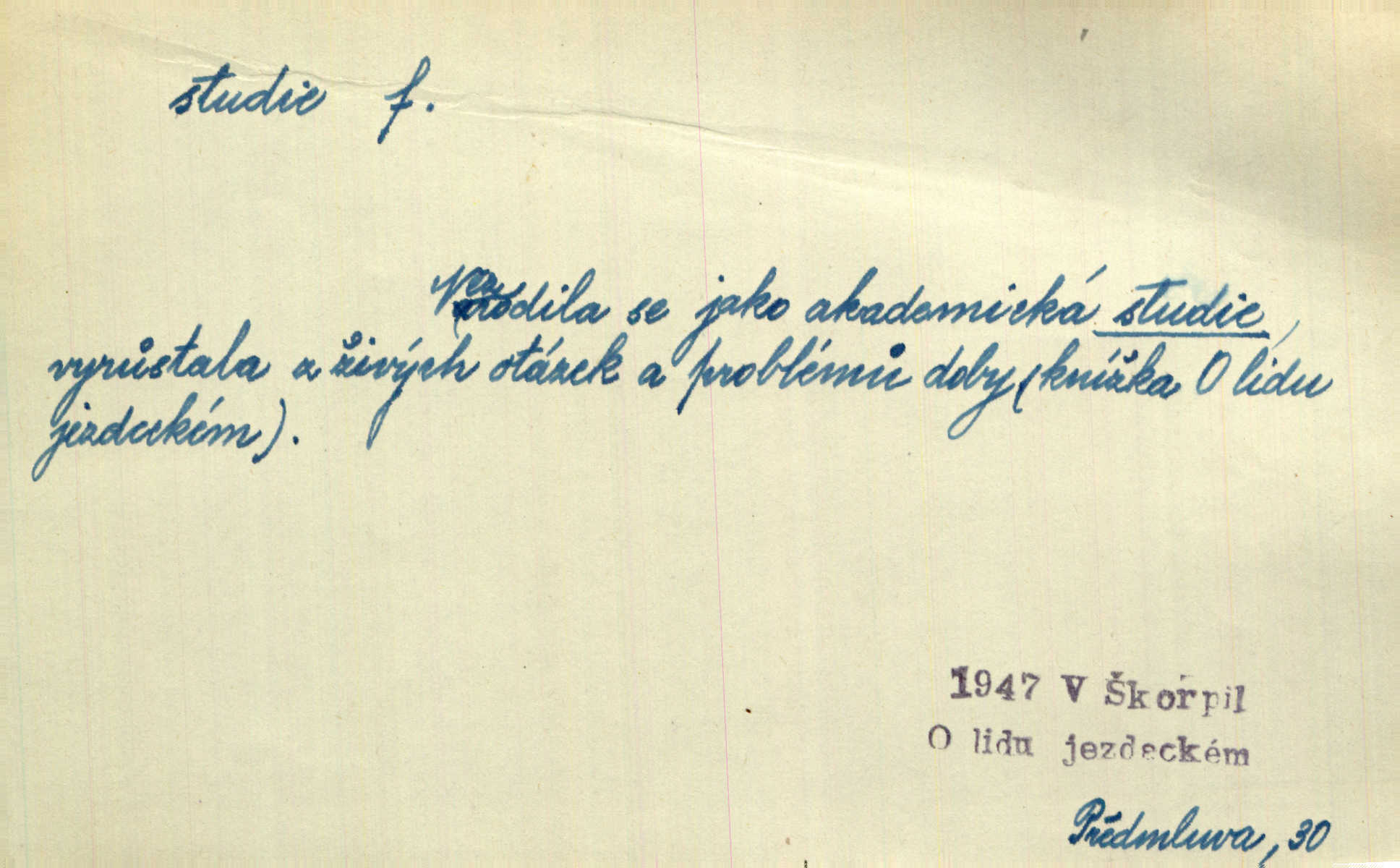 - studie (vysl. stúdyje), -e f. menší literární odborná práce, vědecký článek. Počal psáti studii „Vliv kouření“. Vach. Vyšly od něho spisy o umění a literatuře, z nichž studie o ďáblu v Božské komedii je pozoruhodná. Vrch. [B. Němcová] uveřejnila zajímavé a cenné studie lidopisné. Jir. D výtvarná práce jako příprava k většímu dílu. Těšil se z kresby co jedné z nejšťastnějších studií svých. Schulz. [Holbein, Dürer] udělali si ke každému portrétu několik skvěle a věrně prokreslených studií. Fr. Petr. — Sr. t. studium.
