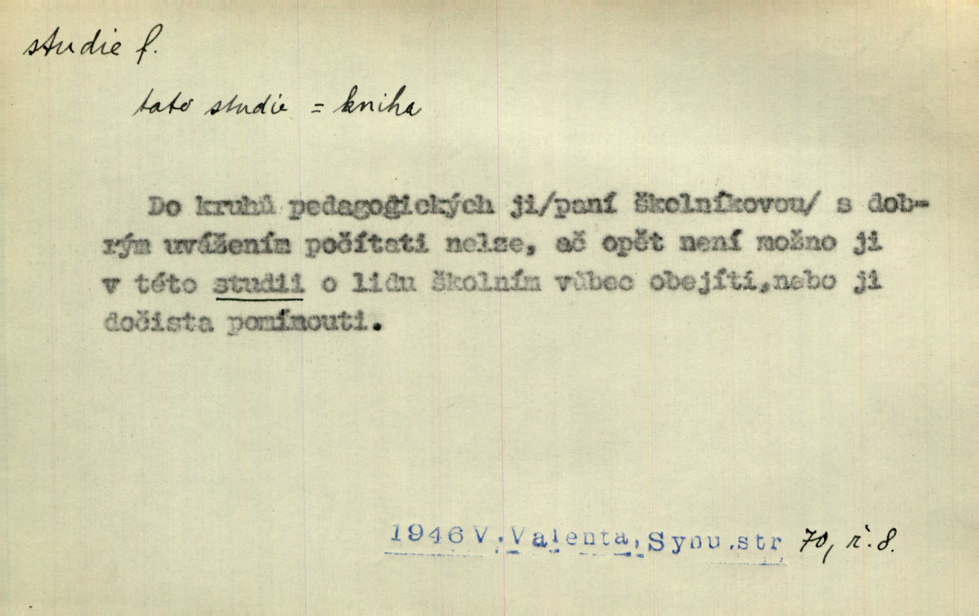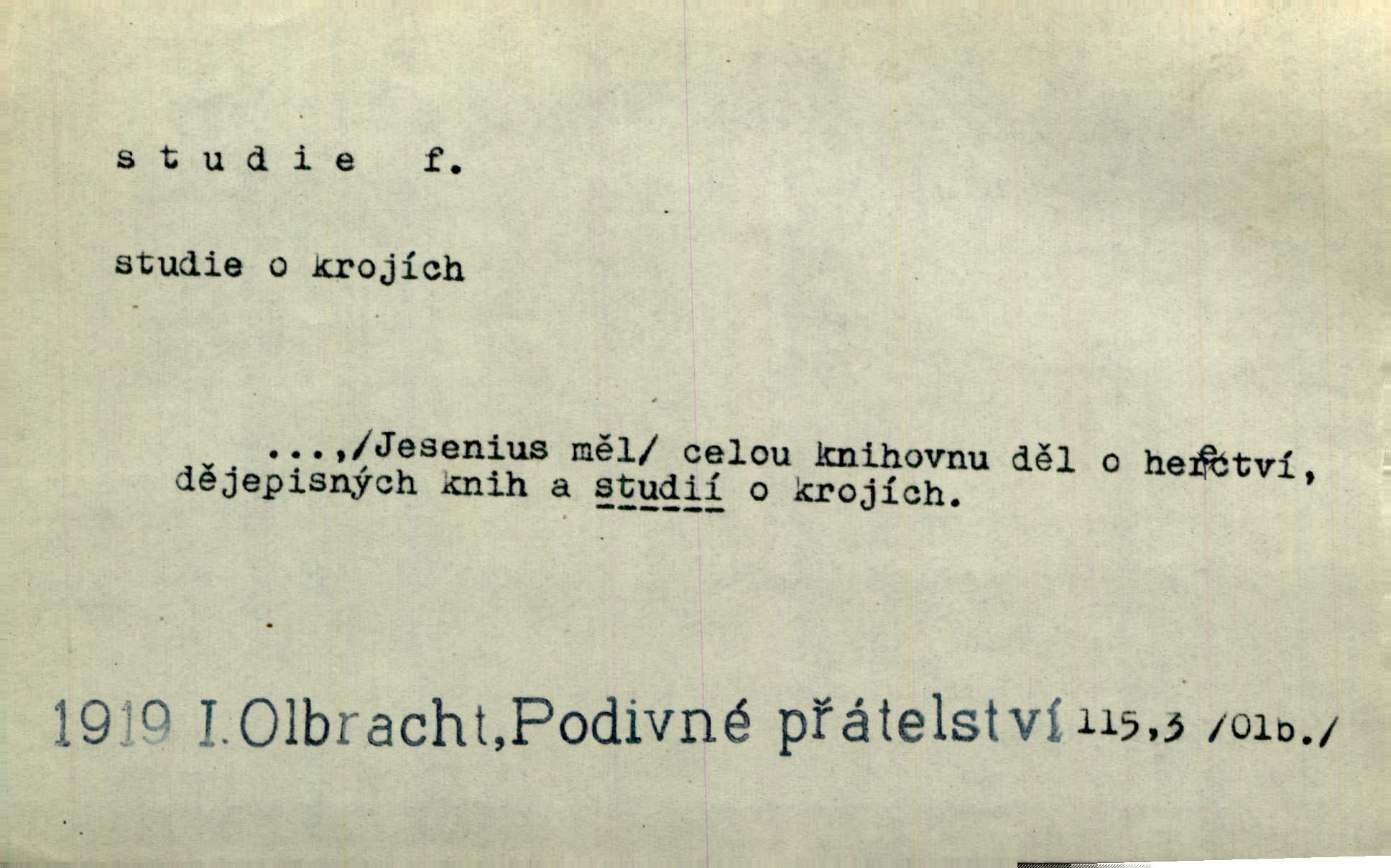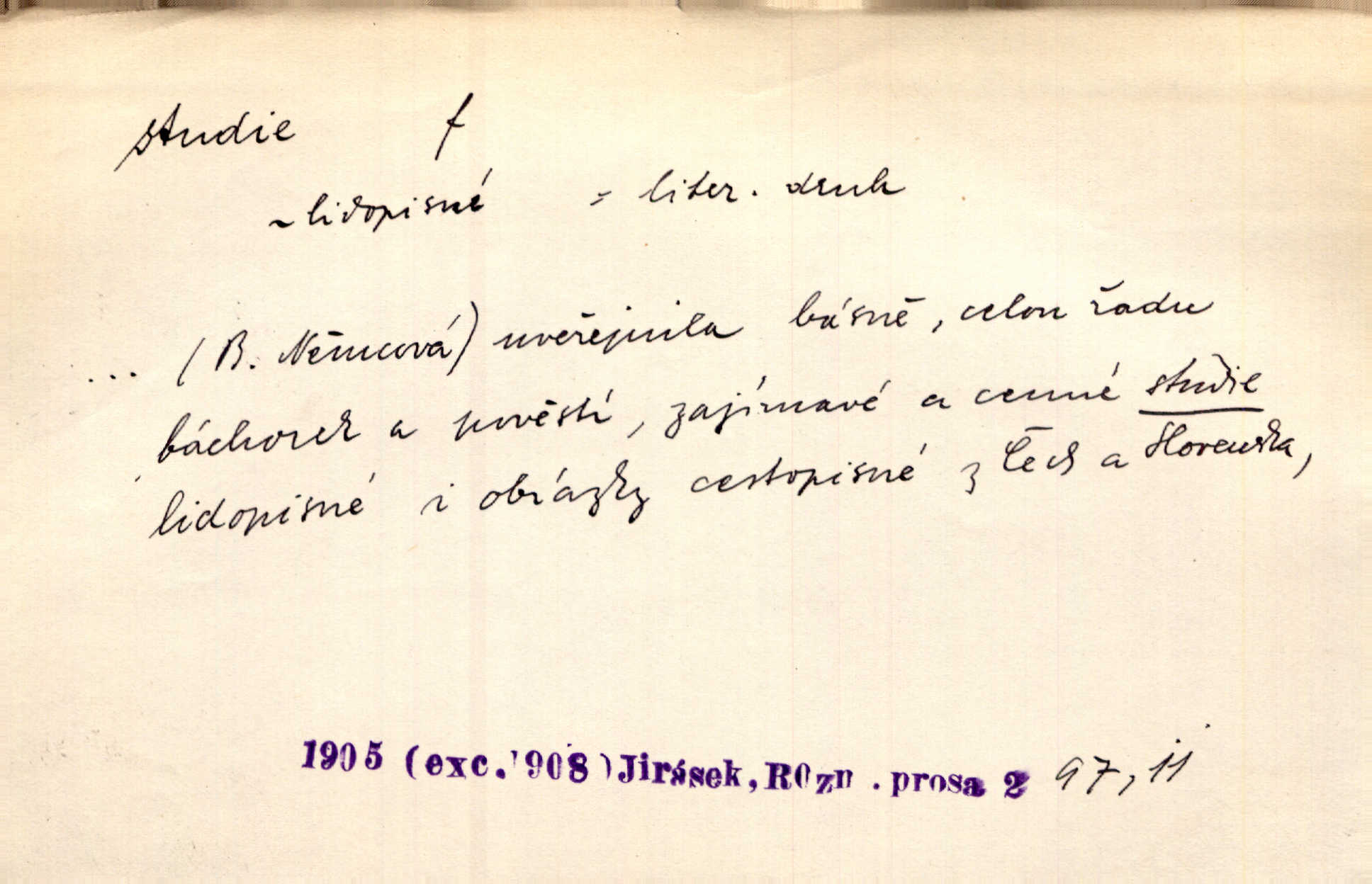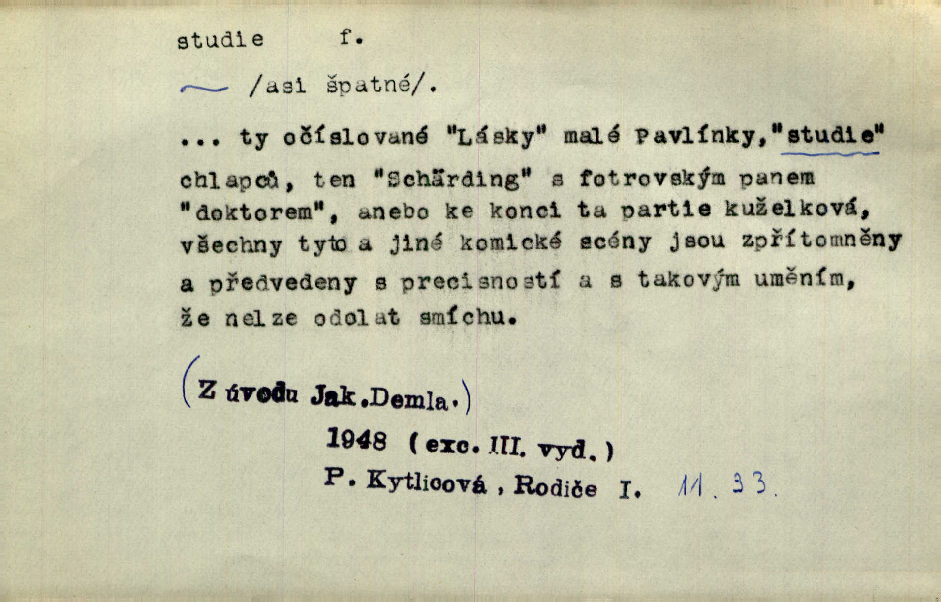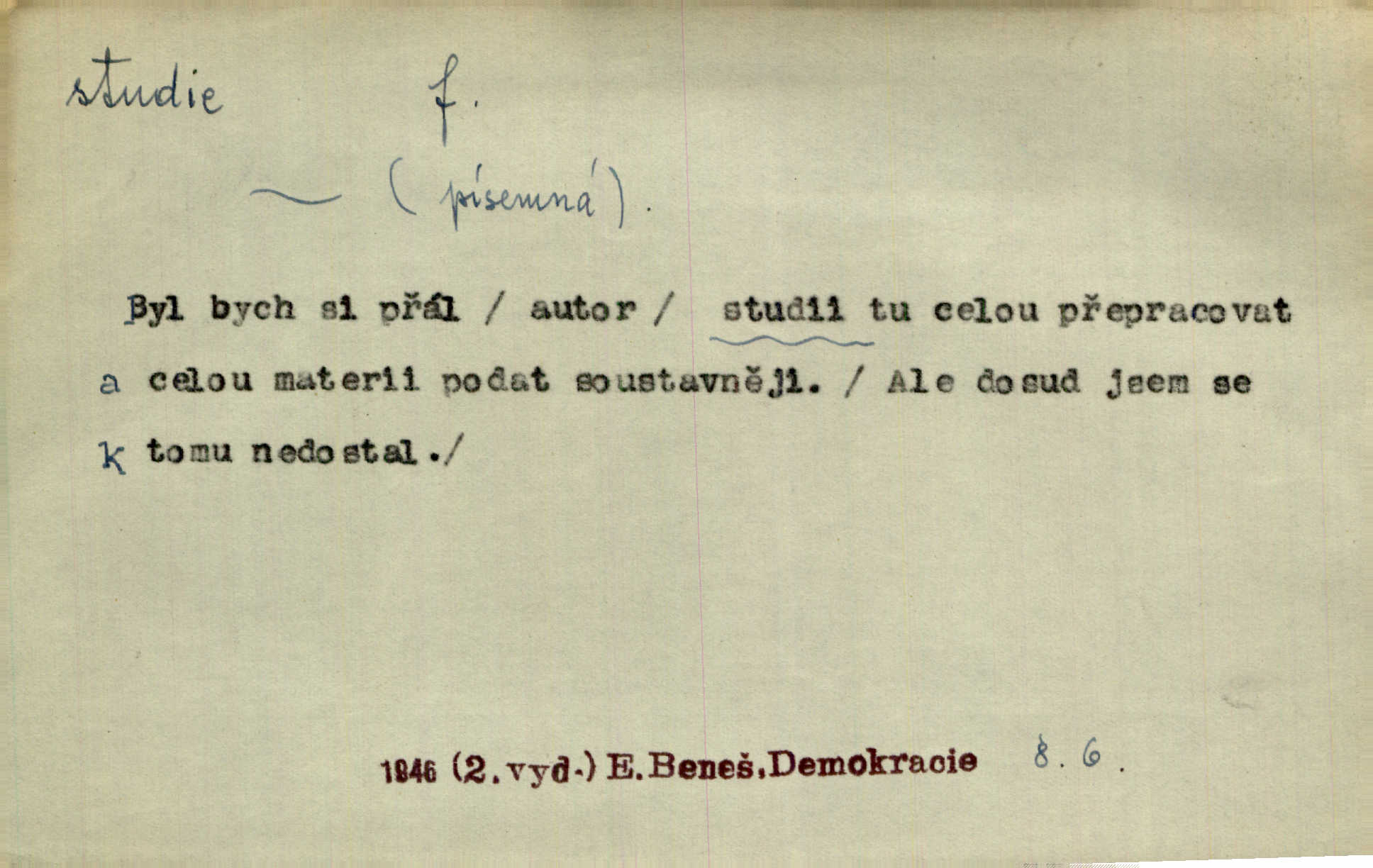 - studie (vysl. stúdyje), -e f. menší literární odborná práce, vědecký článek. Počal psáti studii „Vliv kouření“. Vach. Vyšly od něho spisy o umění a literatuře, z nichž studie o ďáblu v Božské komedii je pozoruhodná. Vrch. [B. Němcová] uveřejnila zajímavé a cenné studie lidopisné. Jir. D výtvarná práce jako příprava k většímu dílu. Těšil se z kresby co jedné z nejšťastnějších studií svých. Schulz. [Holbein, Dürer] udělali si ke každému portrétu několik skvěle a věrně prokreslených studií. Fr. Petr. — Sr. t. studium.