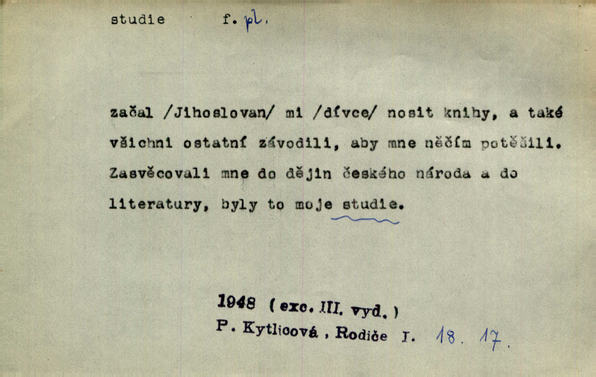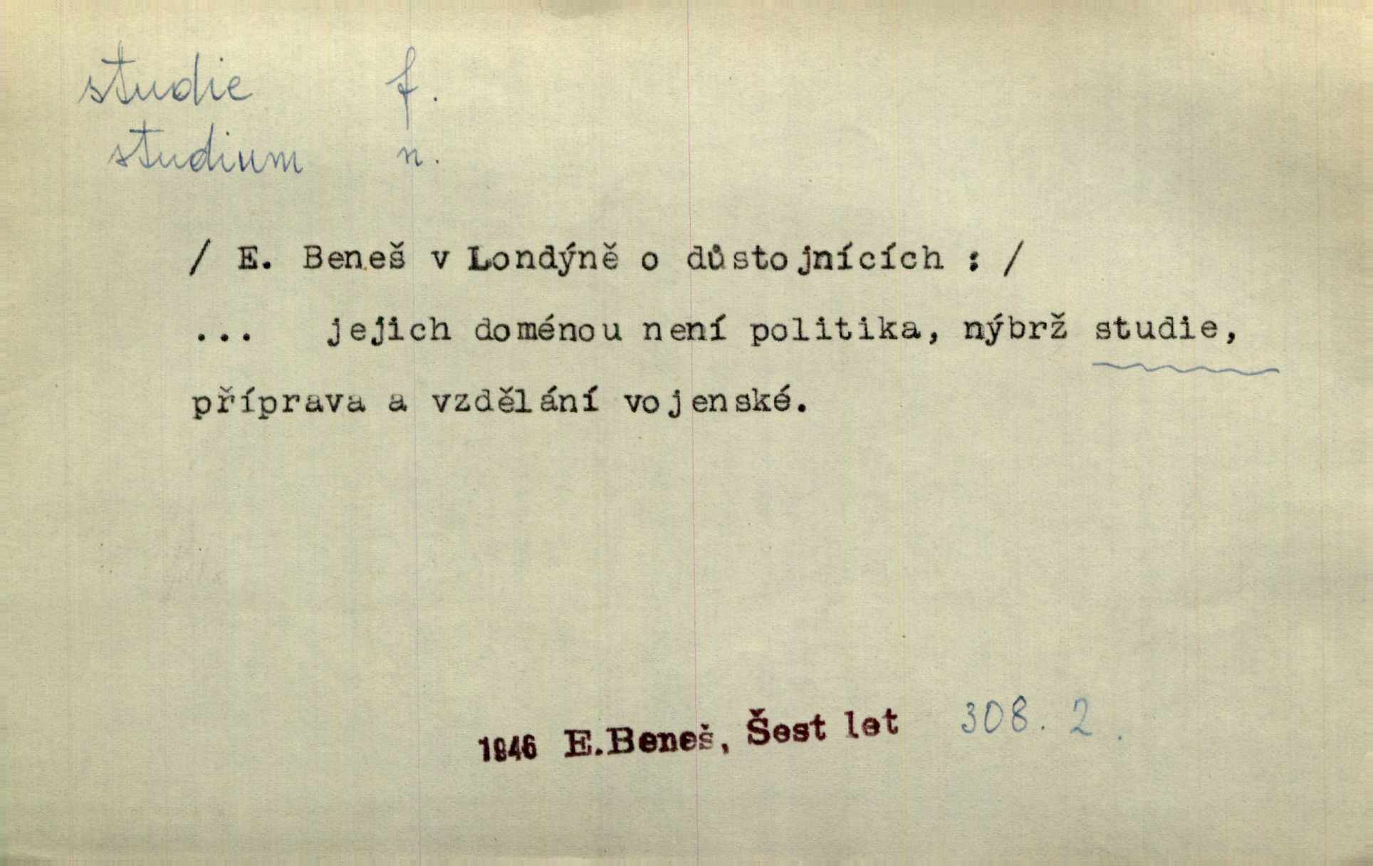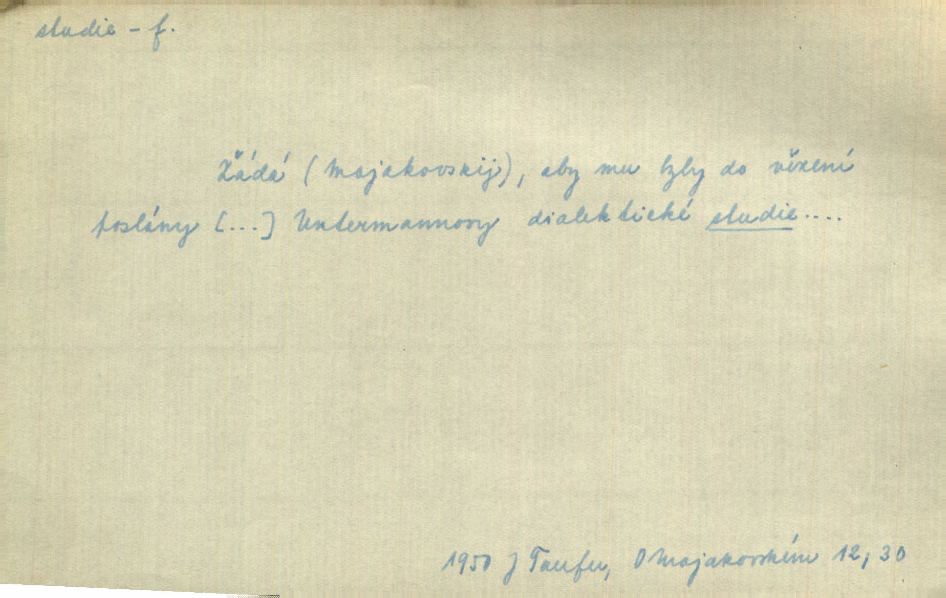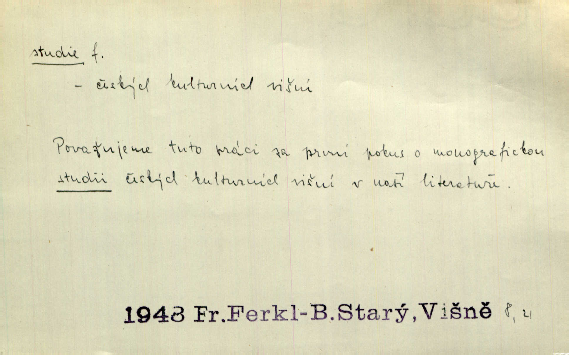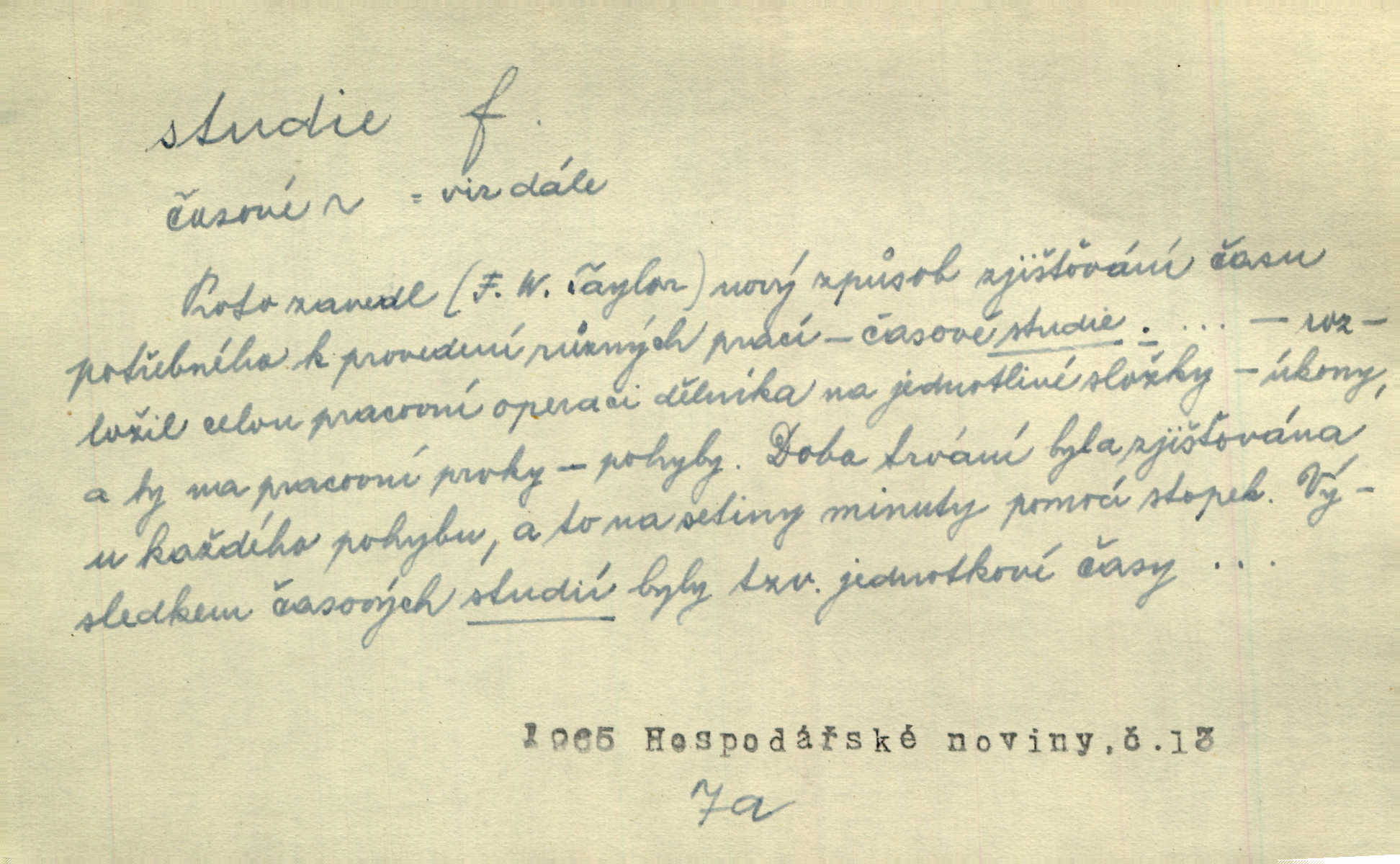 - studie (vysl. stúdyje), -e f. menší literární odborná práce, vědecký článek. Počal psáti studii „Vliv kouření“. Vach. Vyšly od něho spisy o umění a literatuře, z nichž studie o ďáblu v Božské komedii je pozoruhodná. Vrch. [B. Němcová] uveřejnila zajímavé a cenné studie lidopisné. Jir. D výtvarná práce jako příprava k většímu dílu. Těšil se z kresby co jedné z nejšťastnějších studií svých. Schulz. [Holbein, Dürer] udělali si ke každému portrétu několik skvěle a věrně prokreslených studií. Fr. Petr. — Sr. t. studium.