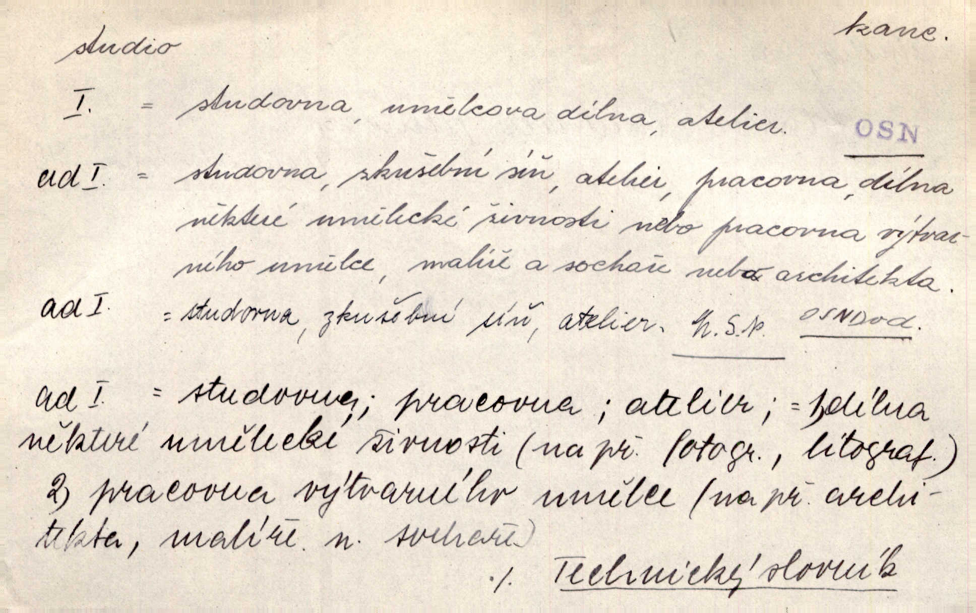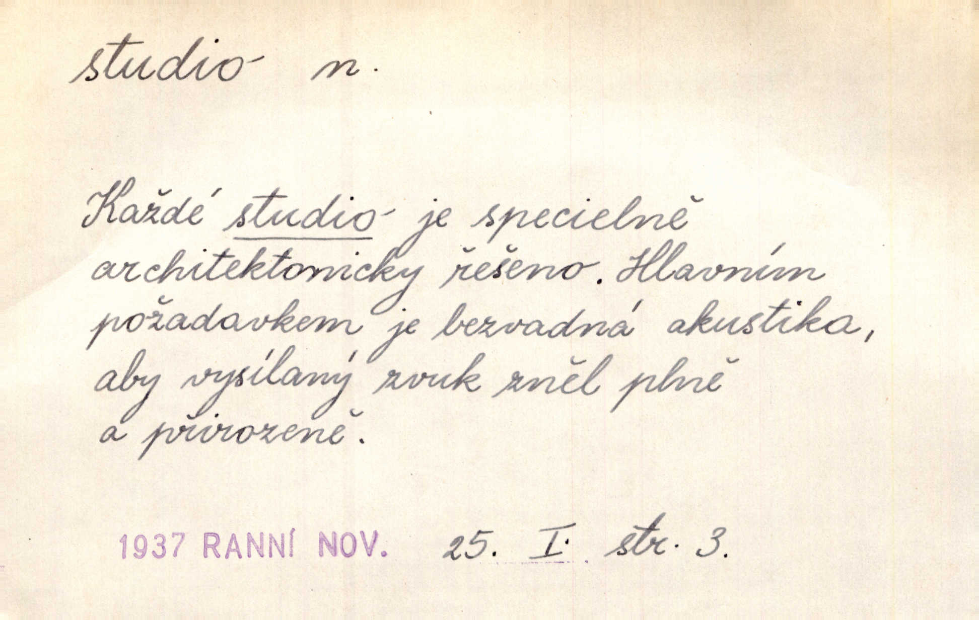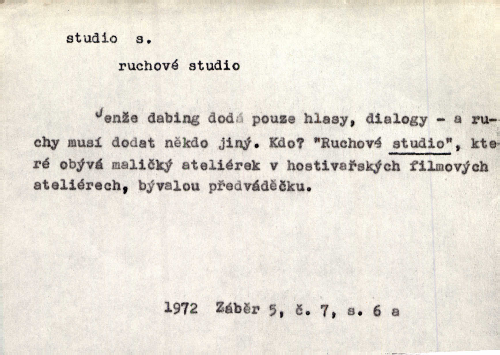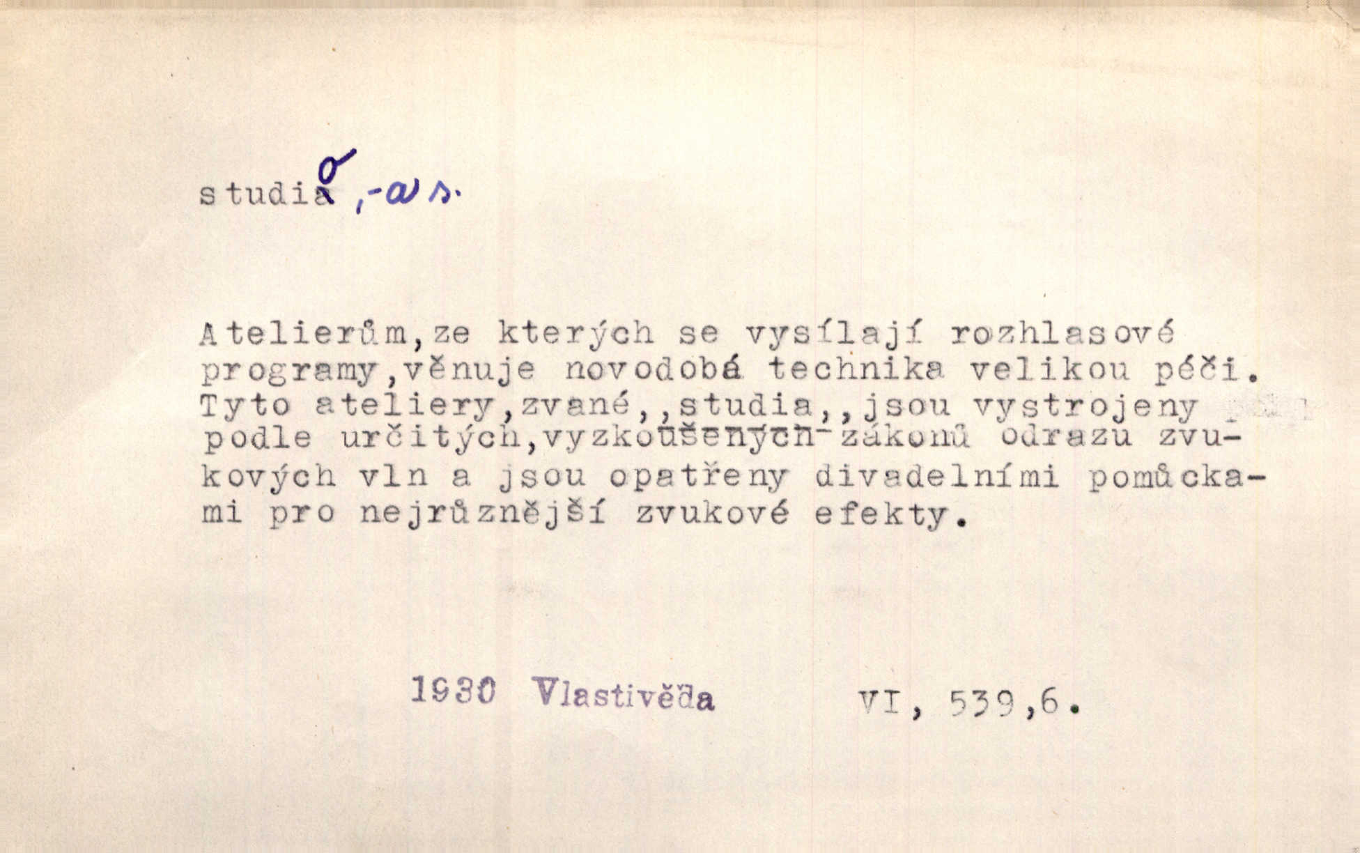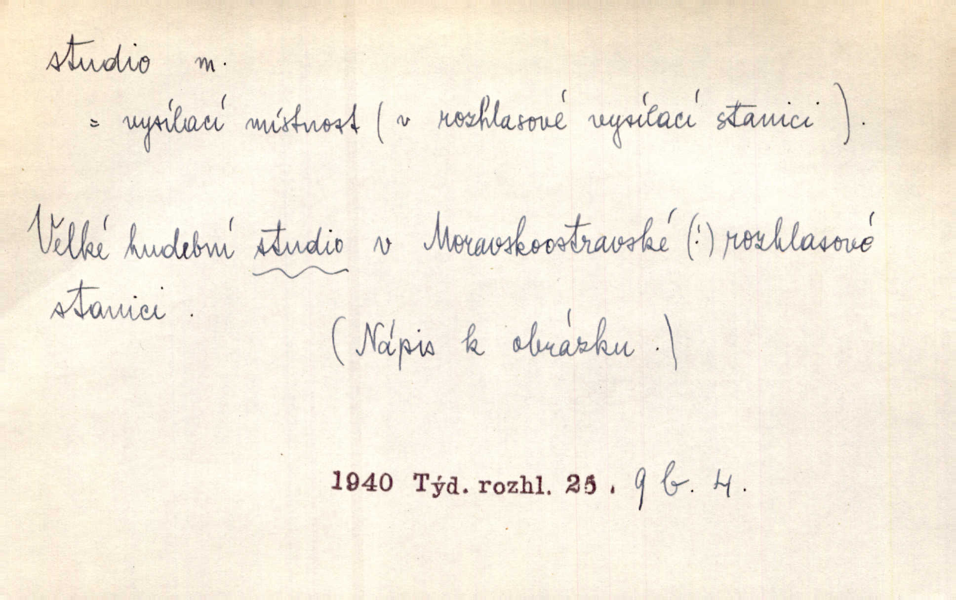 - studio (vysl. stúdyjo), -a n. místnost, kde se provádí dramatické n. hudební dílo, obyč. pro účely filmové, rozhlasové a pod. Rámec, do něhož ji [historii] autor zasadil — továrna na auta, vysílací stanice radiožurnálu a kinematografické studio, činí z této pohádky jedno z nejroztomilejších děl. H. Jel. Dřívější technická primitivnost je překonána dokonalým vybavením rozhlasových studií. Več. Čes. sl.