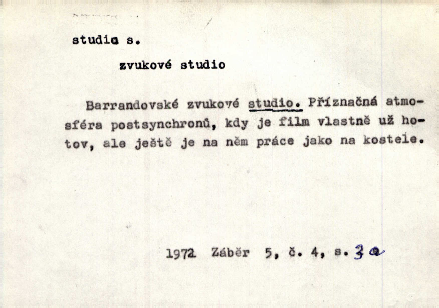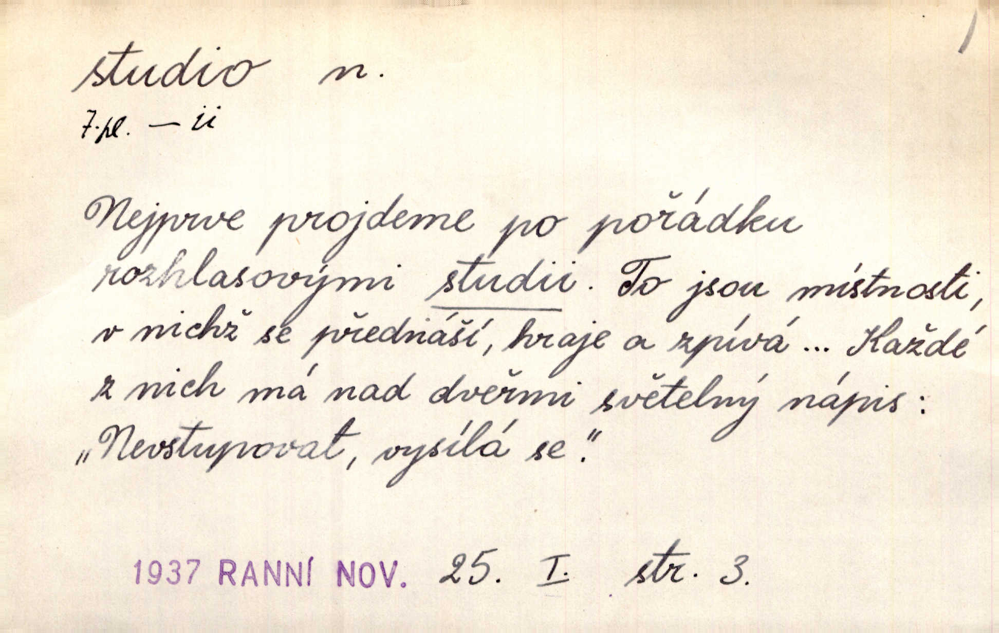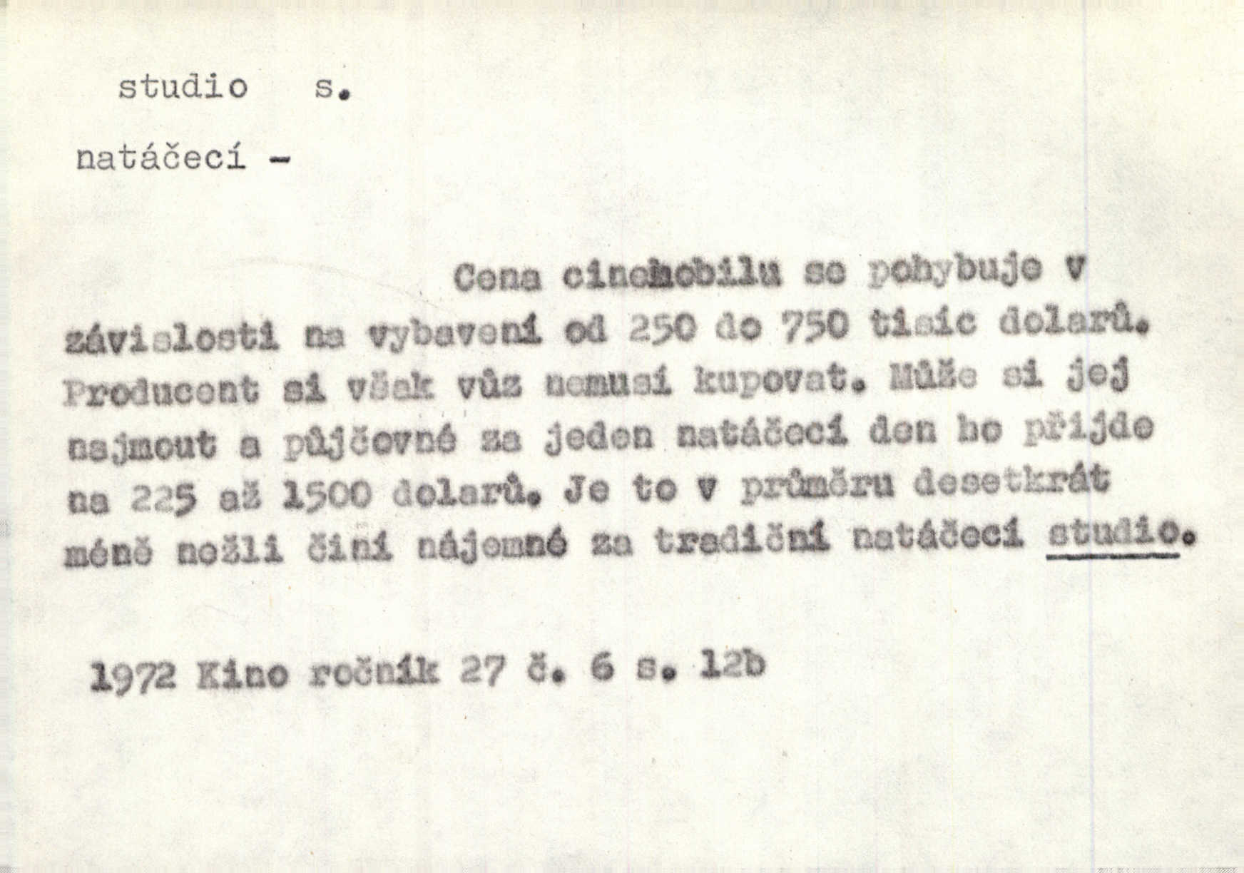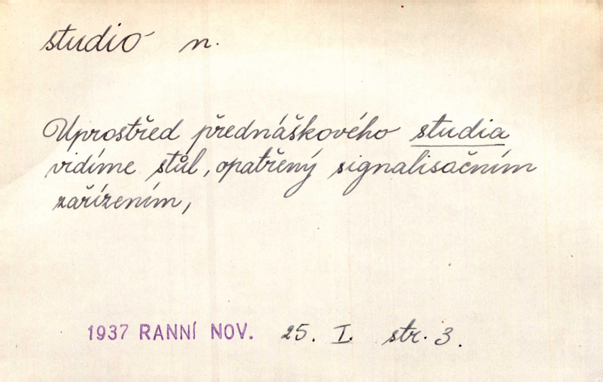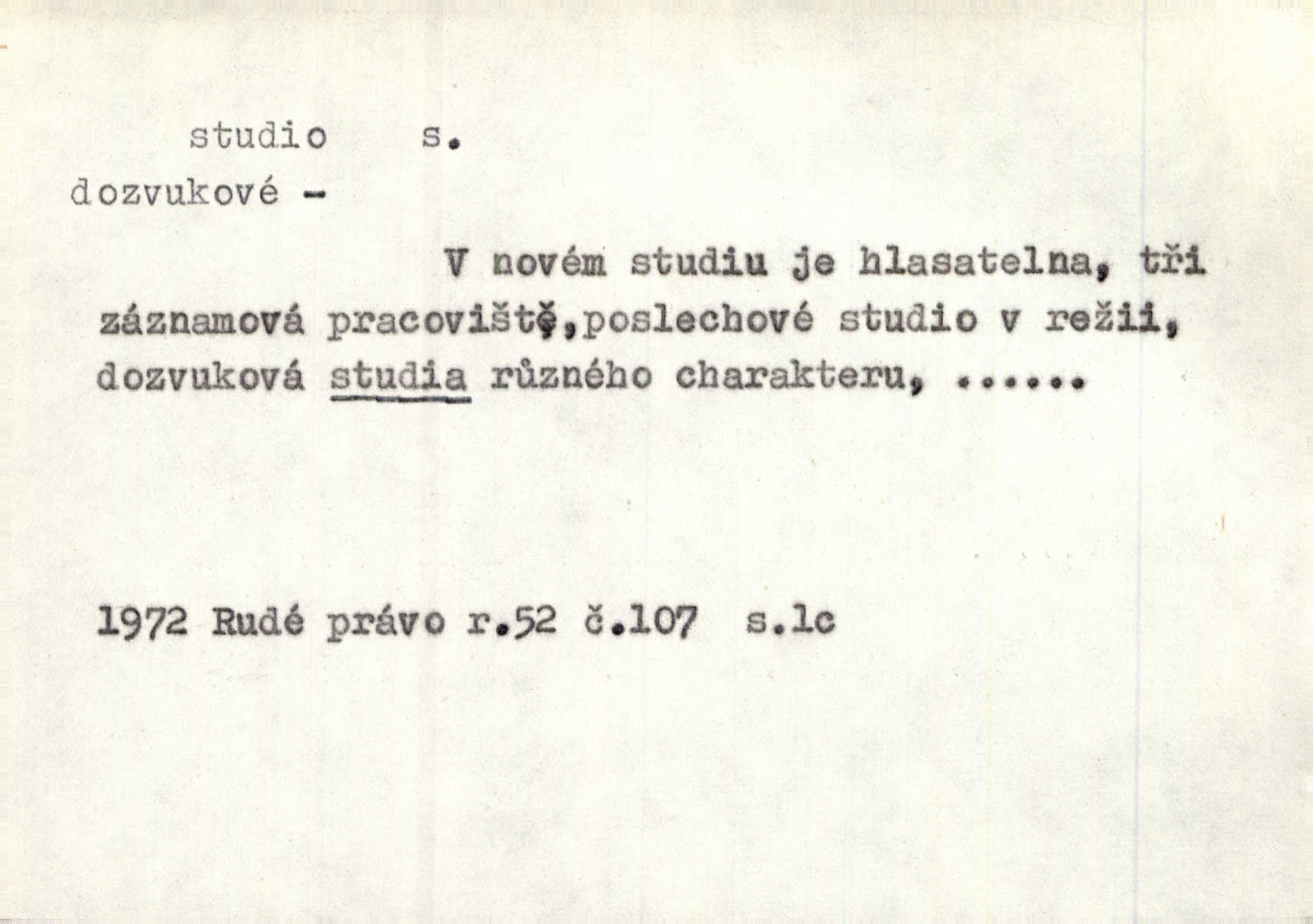 - studio (vysl. stúdyjo), -a n. místnost, kde se provádí dramatické n. hudební dílo, obyč. pro účely filmové, rozhlasové a pod. Rámec, do něhož ji [historii] autor zasadil — továrna na auta, vysílací stanice radiožurnálu a kinematografické studio, činí z této pohádky jedno z nejroztomilejších děl. H. Jel. Dřívější technická primitivnost je překonána dokonalým vybavením rozhlasových studií. Več. Čes. sl.