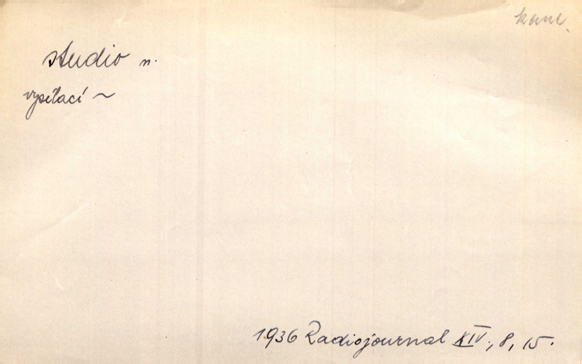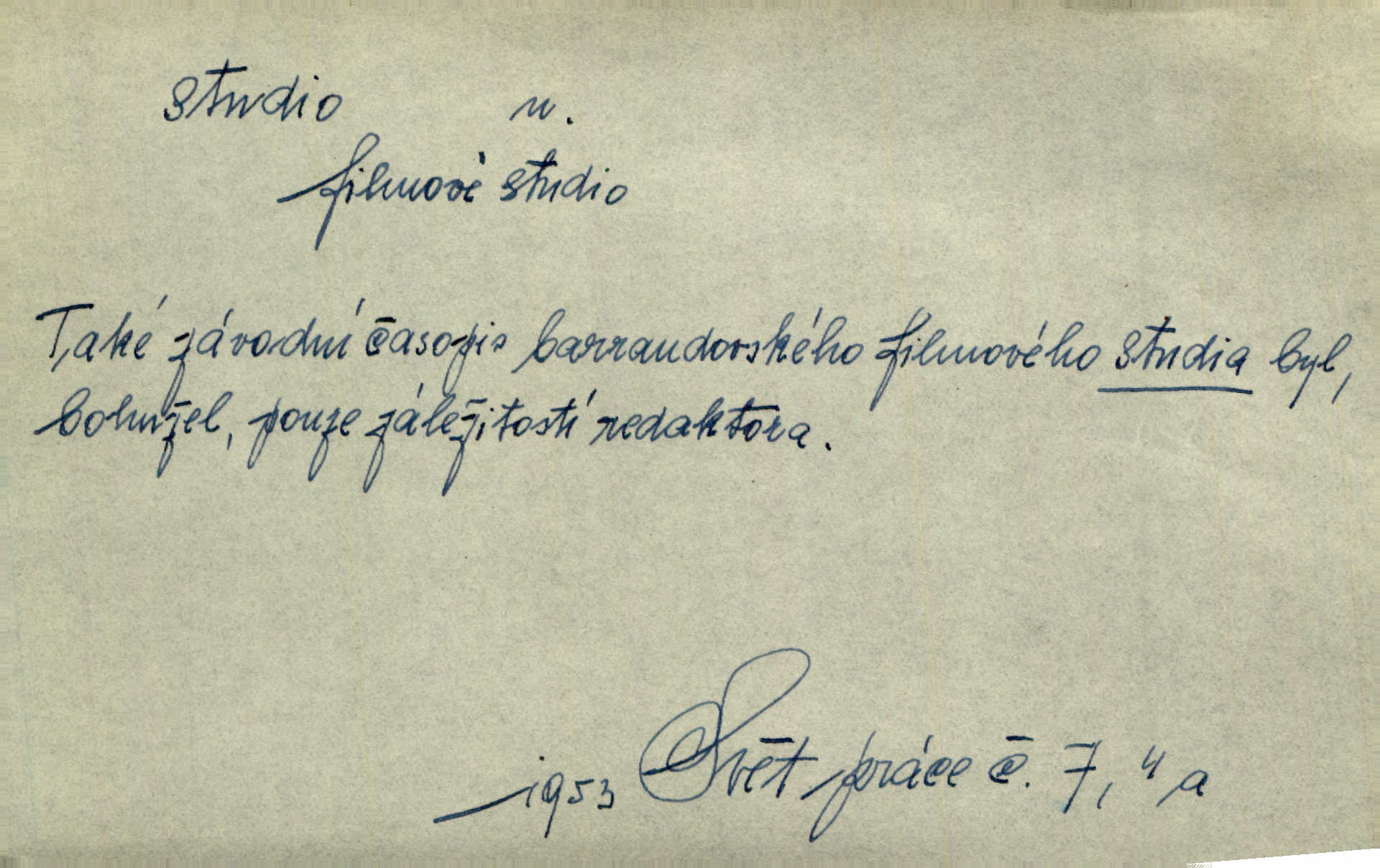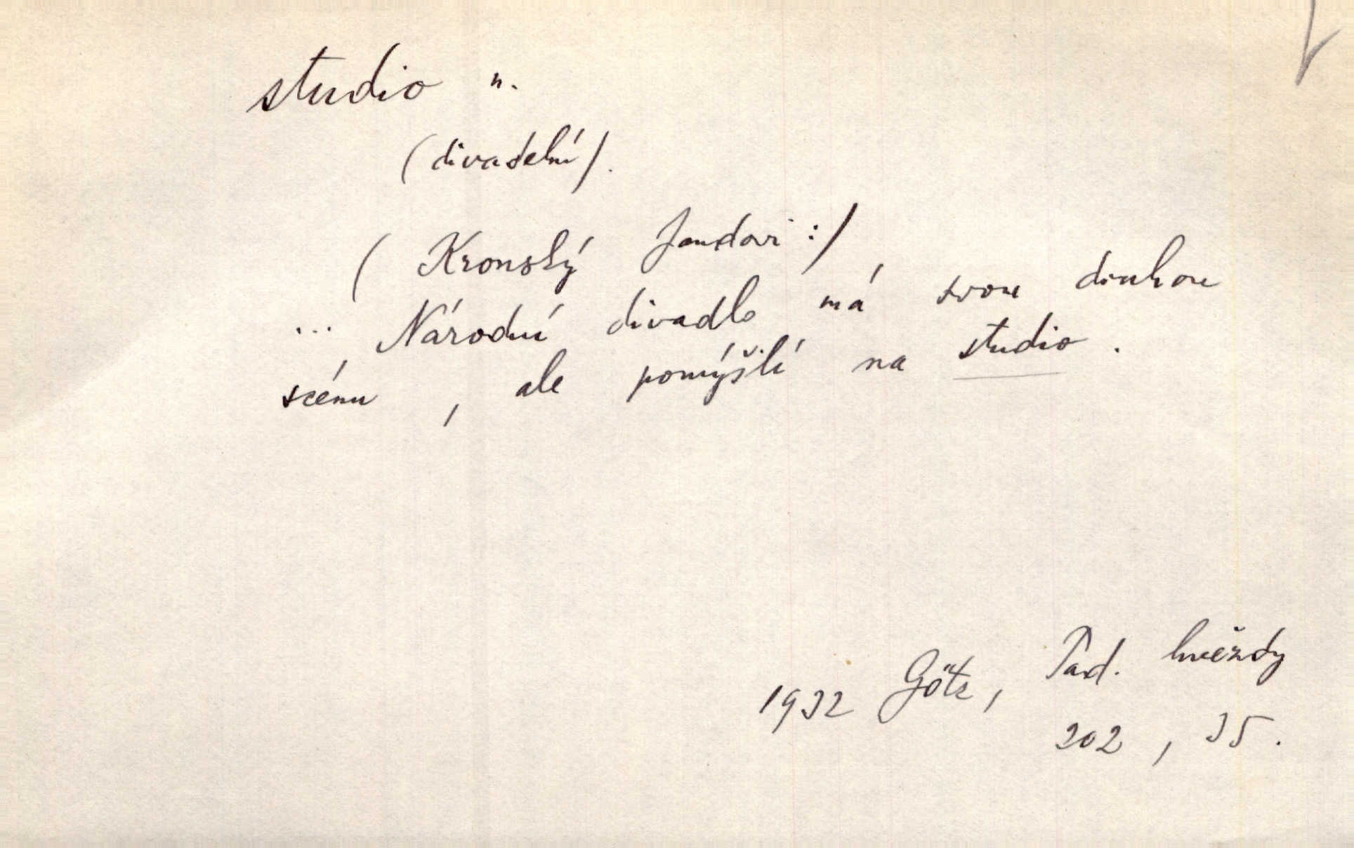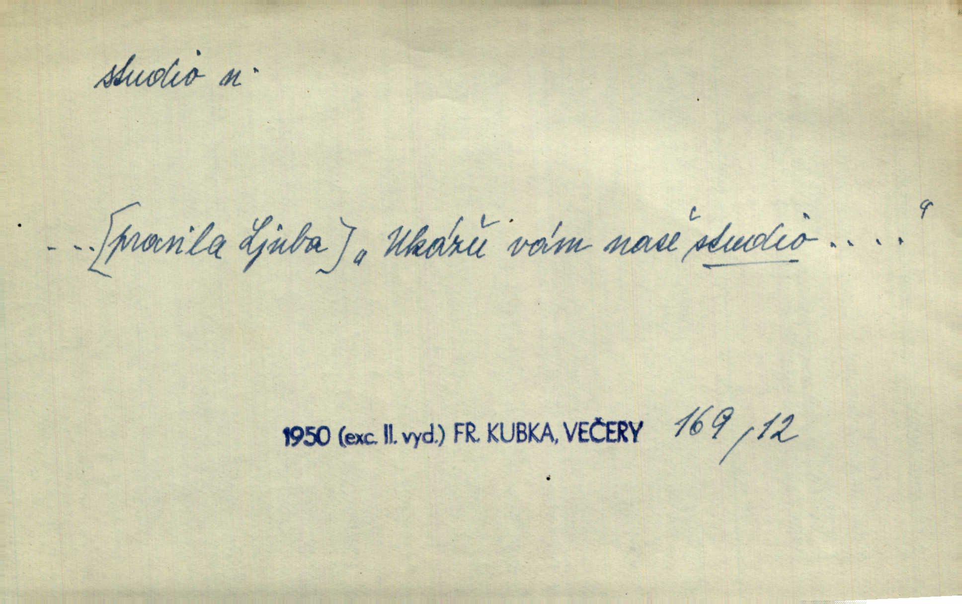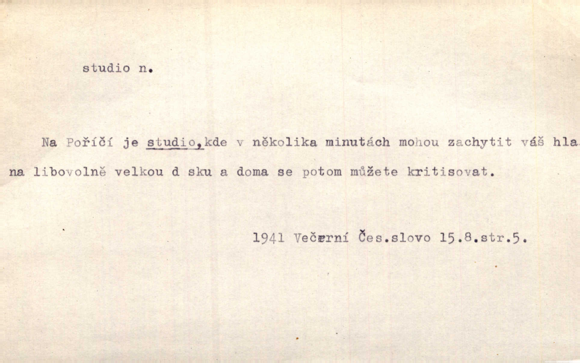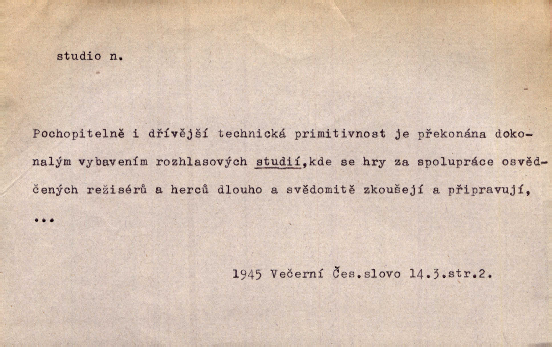 - studio (vysl. stúdyjo), -a n. místnost, kde se provádí dramatické n. hudební dílo, obyč. pro účely filmové, rozhlasové a pod. Rámec, do něhož ji [historii] autor zasadil — továrna na auta, vysílací stanice radiožurnálu a kinematografické studio, činí z této pohádky jedno z nejroztomilejších děl. H. Jel. Dřívější technická primitivnost je překonána dokonalým vybavením rozhlasových studií. Več. Čes. sl.