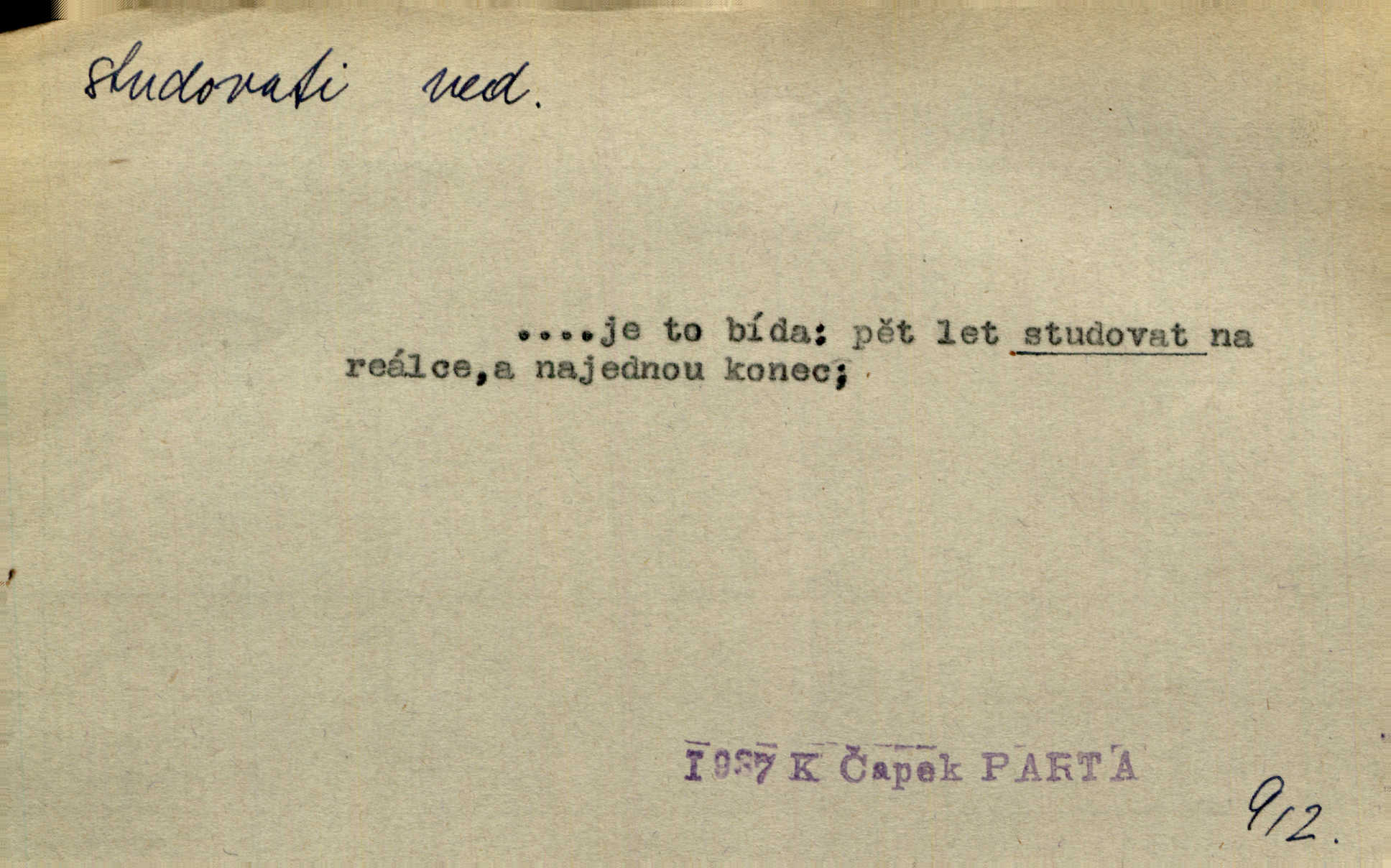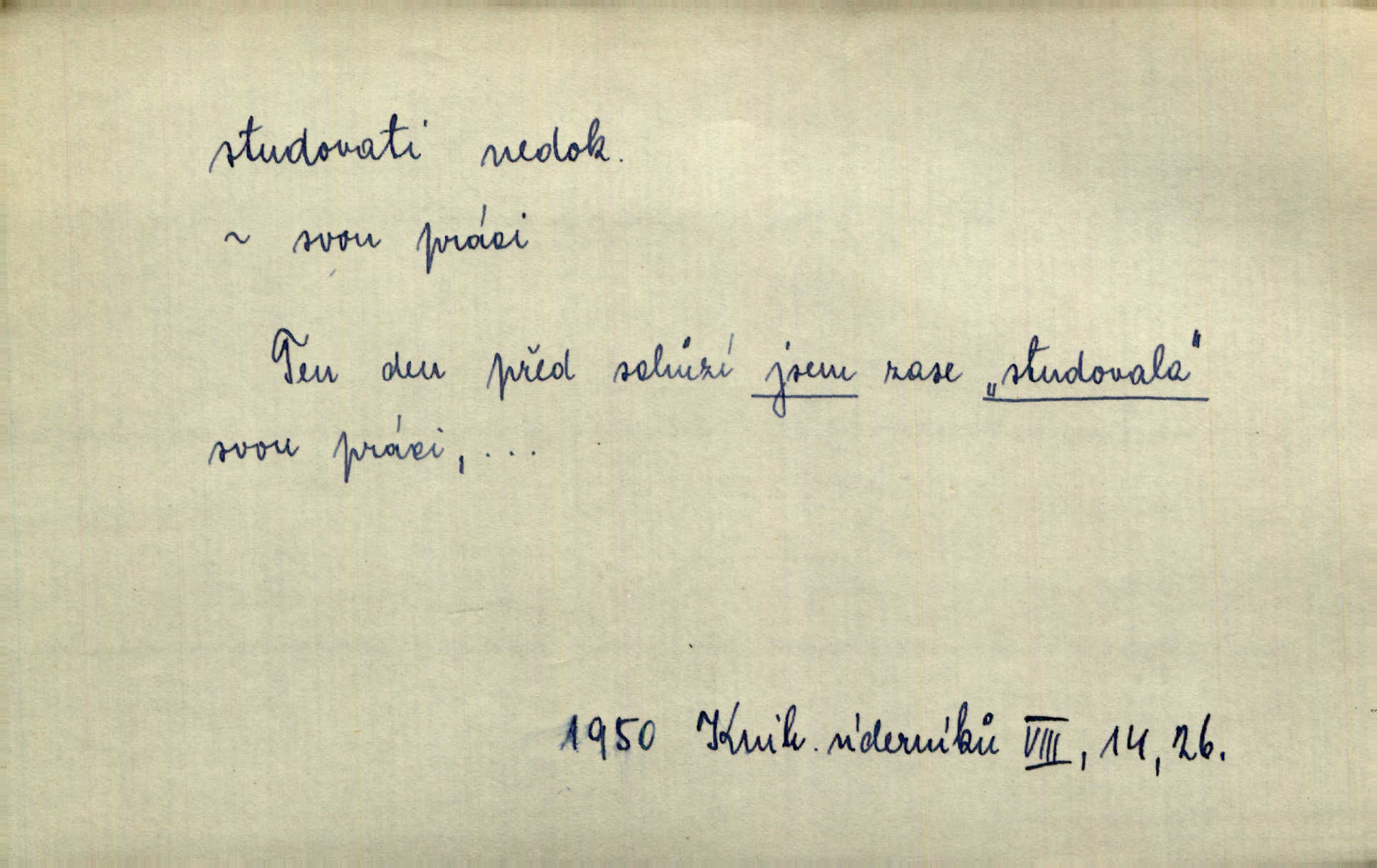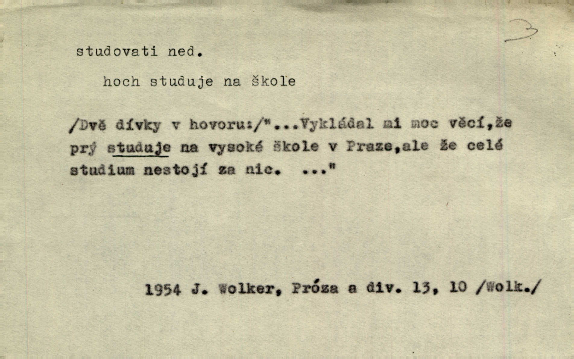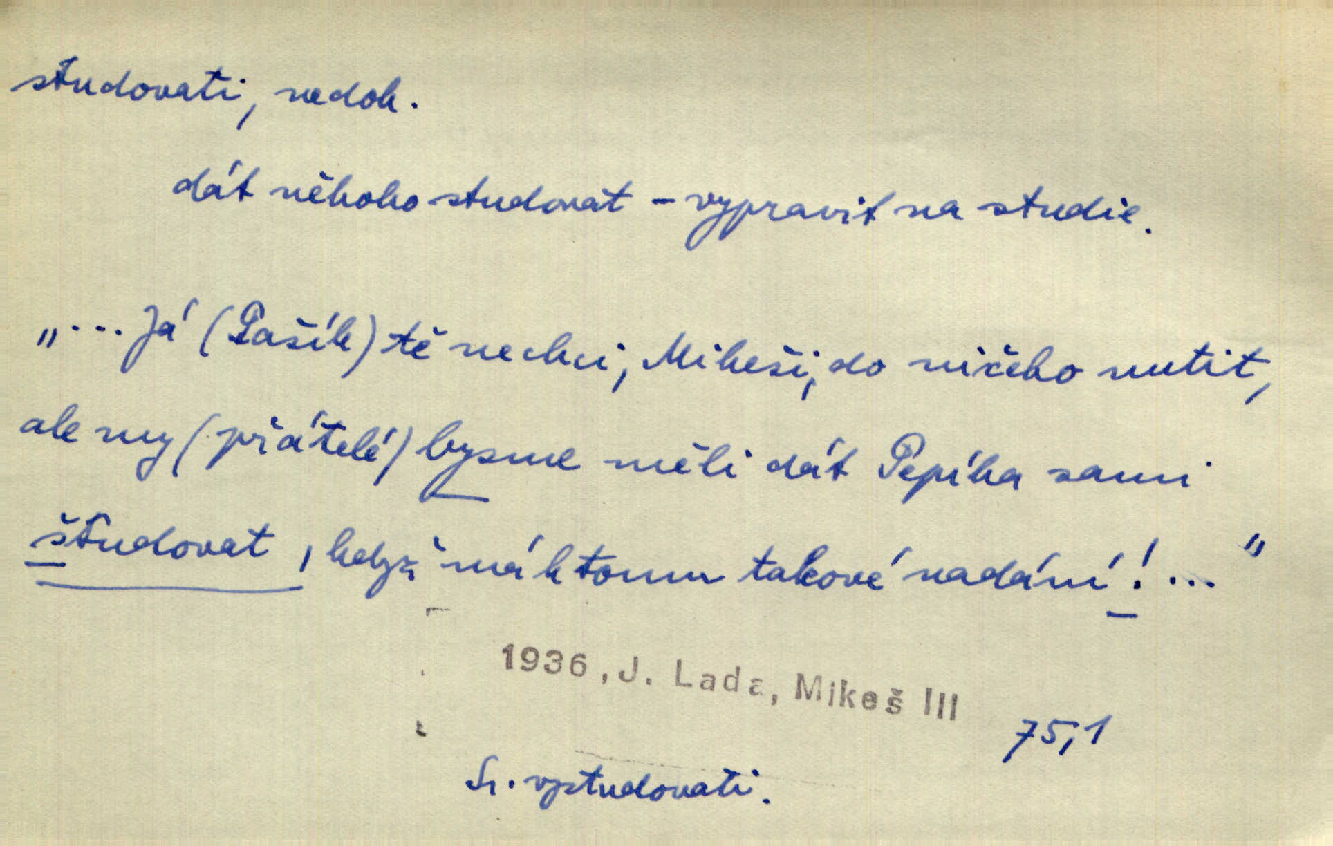 - studovati (ob. a zast. študovati) ned. navštěvovati vyšší, zejm. vysokou školu. Havlena studoval kdysi reálku, ale nedostudoval. Mah. Studoval universitu. Kun. Studoval na evangelickém lyceu. Kal. Tys ovšem nestudoval ve školách. Svět. Borejs študoval na doktora. Jah. D (co) učiti se něčemu na vysoké škole. Studoval na universitě práva. Vach. Snad mne bude přemlouvat, abych také studoval mathematiku. Šim. Zavedla řeč na mne, co míním studovat. Šim. D (o studentu) učiti se vůbec. Studoval [student] celý den, dlouho do noci. Kun. Mladý Bavor vždy na střeše studoval. Ner. Začal se vyhýbati lidem, zvážněl a studoval. Lit. noviny. Študoval raději k maturitě. Paleč. D (co) vědecky zkoumati, snažiti se vědecky, rozumově ovládati něco. [Lékaři] studovali bacilly. Čech. Miloš Hlávka studuje pražské drama v paradoxním poměru k venkovskému. Lit. noviny. V potu tváří sbírat musí [básník] květy slov, studovati steré Brusy. Čech. Banville studoval techniku jeho verše. Lum. Vy všichni, kdož studujete prostonárodní sloh, prchejte od strýce Jordáňka. Herb. D bedlivě pozorovati, prohlížeti. Koncipista pátravě studoval rysy jeho tváře. Vach. Nepozoroval ani, že vstoupila paní Marjánka a že jej v pravém slova smyslu studuje. Šmil. Namáčí si pán do černé kávy housku a studuje ranní kursy. Ner. Studoval tento pozvolný rozklad své bytosti. Čech. Chvilku tak tu mapu študuji. Stroup. Studoval v mysli, jak bude asi mluviti. Svob. D cvičiti, nacvičovati, připravovati. Upravila si pocuchané vlasy a studovala svůj nejněžnější pohled. Šmil. Odpočívala v poloze tak půvabné a elegantní, jakoby ji byla schválně studovala. Kun. Náš kapelník ochuravěl právě, když jsme novou operu študovali. Zey. Začne [běžec] „studovat“ jednotlivé posice. Vojta. — V. t. studovaný, studující.