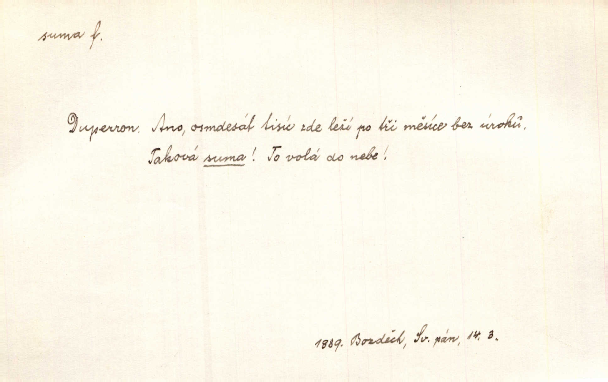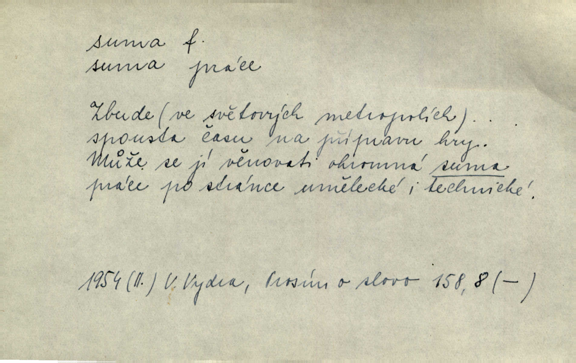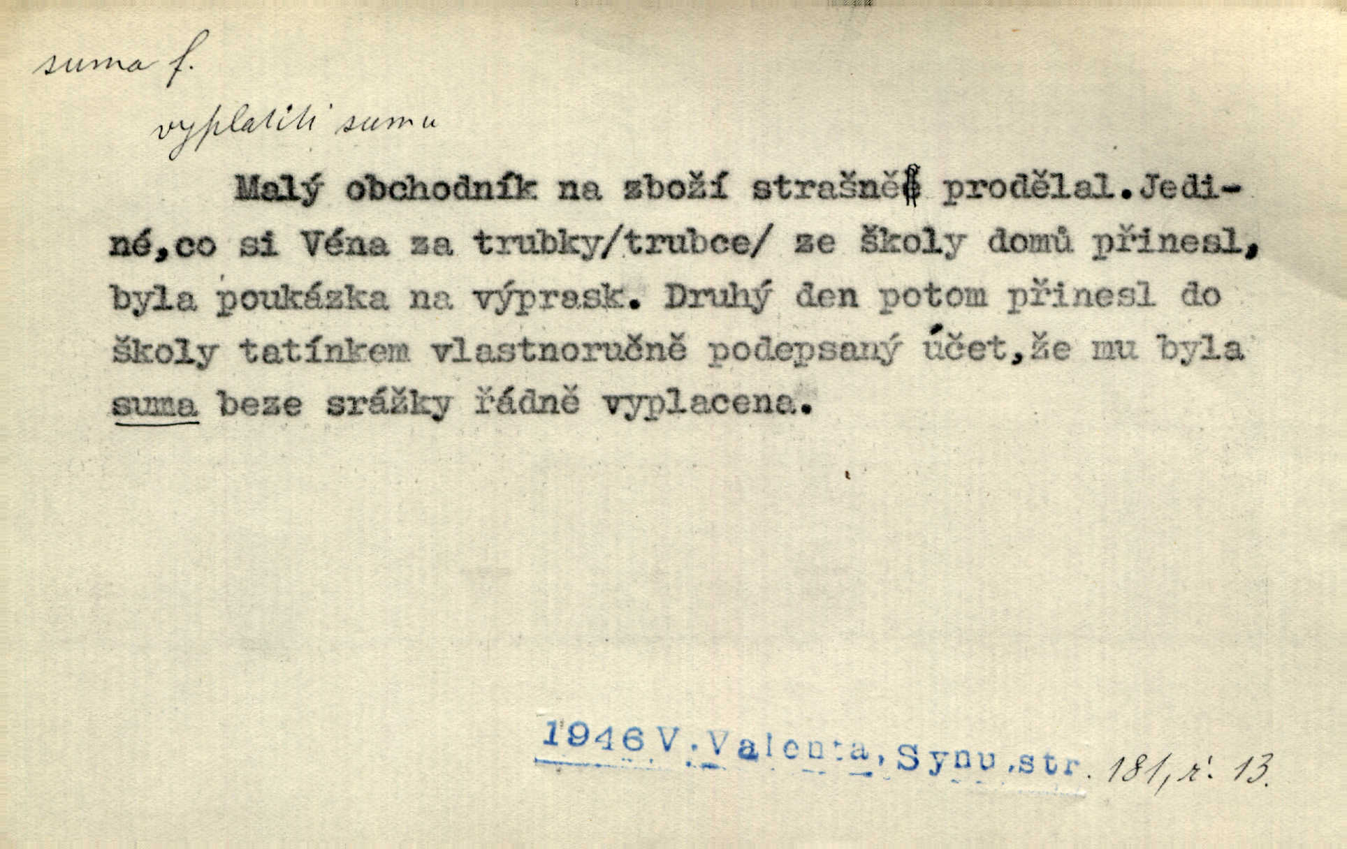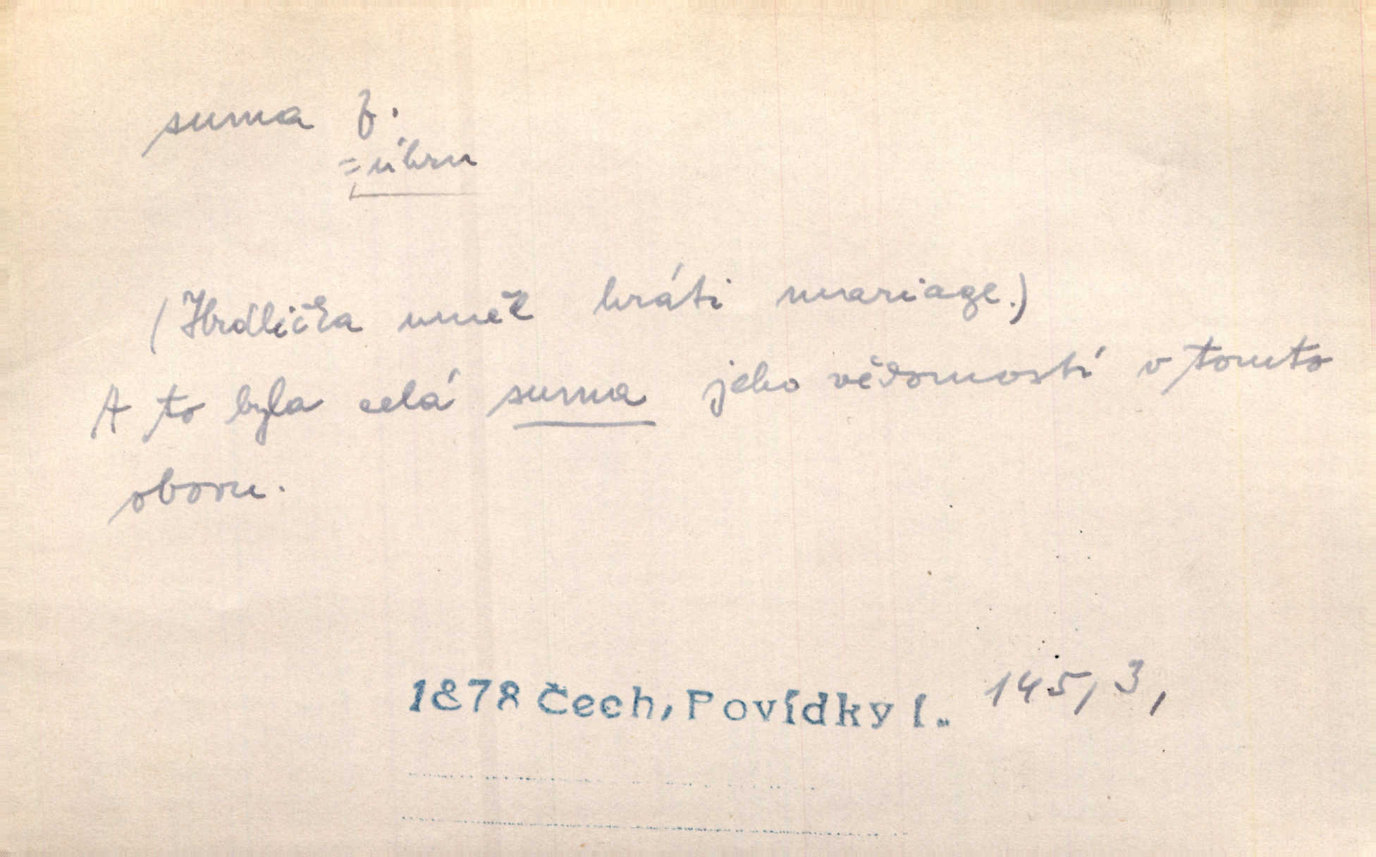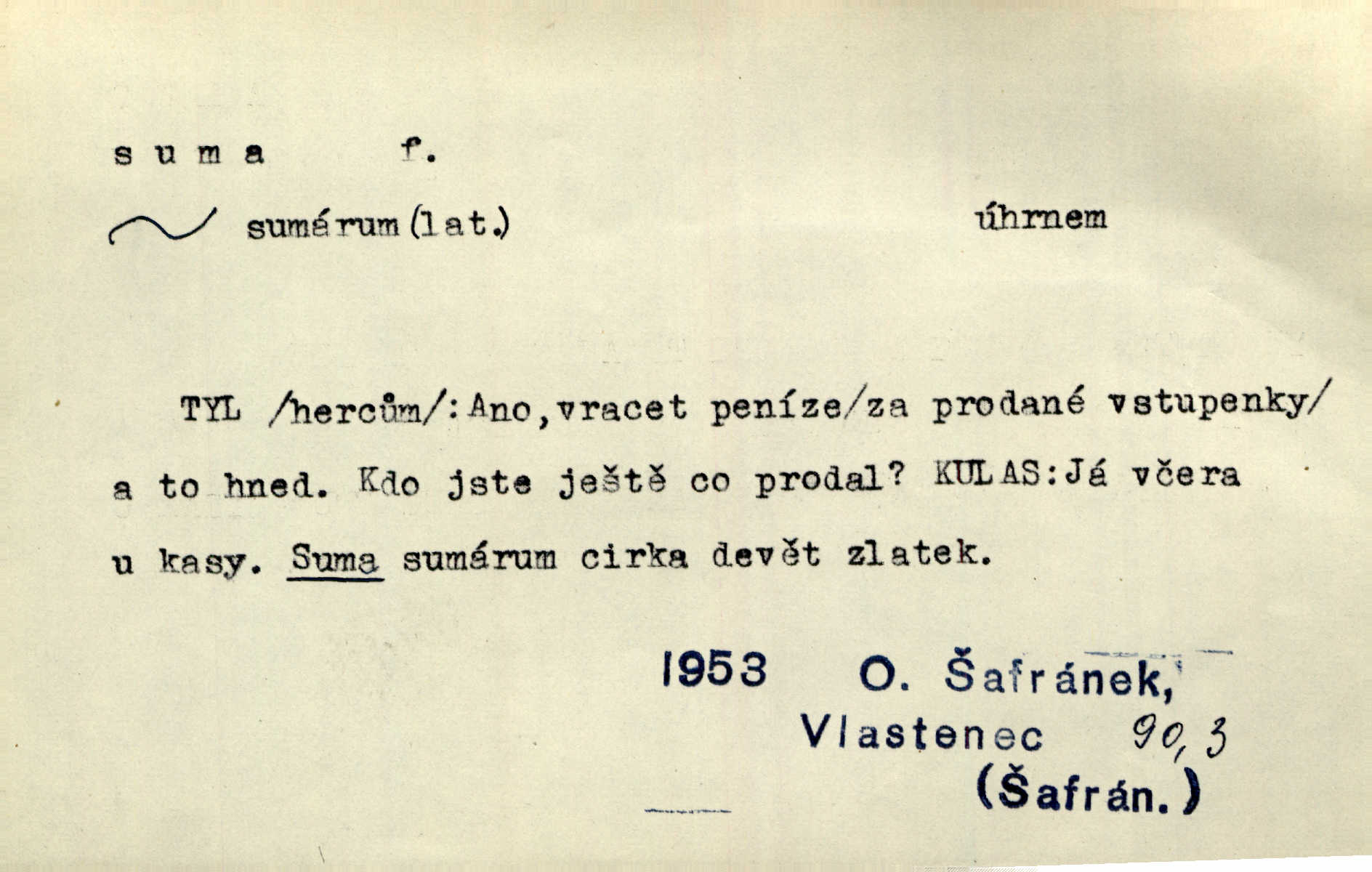 - suma, -y f. (větší) množství peněz, částka. Policie pátrala po členech tajného spolku, vypisovala ohromné sumy na jejich hlavy. Zey. Obec Náchodská měla dluhů 24 000 zl., na ten čas sumu to velikou. Jir. Vyléval v nich [básních] mnoho bolu a shrábnul za ně značnou sumu. Sob. Jaké úžasné sumy peněz vyhazují se za věci, které jen zdánlivě sloužiti mají k ozdobě. V. Mrš. Osmdesát tisíc zde leží po tři měsíce bez úroků. Taková suma! Bozd. D Řidč. (větší) množství něčeho vůbec. Již pouhý výčet vám naznačí tu sumu materiálu, již kniha zpracovává. Čteme. Mdloba a rozčarování splývalo v jedinou ohromnou sumu lásky. Sez. Summa vědomostí nepovznáší lid, aniž ho vzdělává; lid jako národ vzdělává se pouze summou své historie. Staš. D Poněk. zast. celkový počet, souhrn, úhrn. Summa všech domácích obyvatelů království [je]: 3,686.363. Pal. Cesta do Prahy byla nepochybně summou vší vévodovy ochoty. Pek. Suma vášně deseti nejohnivějších Evropanek nevyrovná se její lásce. Lier. D Zast. jádro, souhrn nejpodstatnějších částí nějakého celku. Náboženství podle Bonusa, abych podal nejstručnější summu z něho, jest pro člověka, ne člověk pro náboženství. Šal. Ukojení [vášní] považuji za cíl a summu svého života. Hol. Pryč od lidí, to suma moudrosti. Jir. Suma návrhu Hlasivcova byla, aby obtížná robota [byla] zrušena. Jir. D suma sumárum zast. hovor. celkem, úhrnem. A suma sumárum — starý macek si mě oblíbil. Herrm. — V. t. sumou.